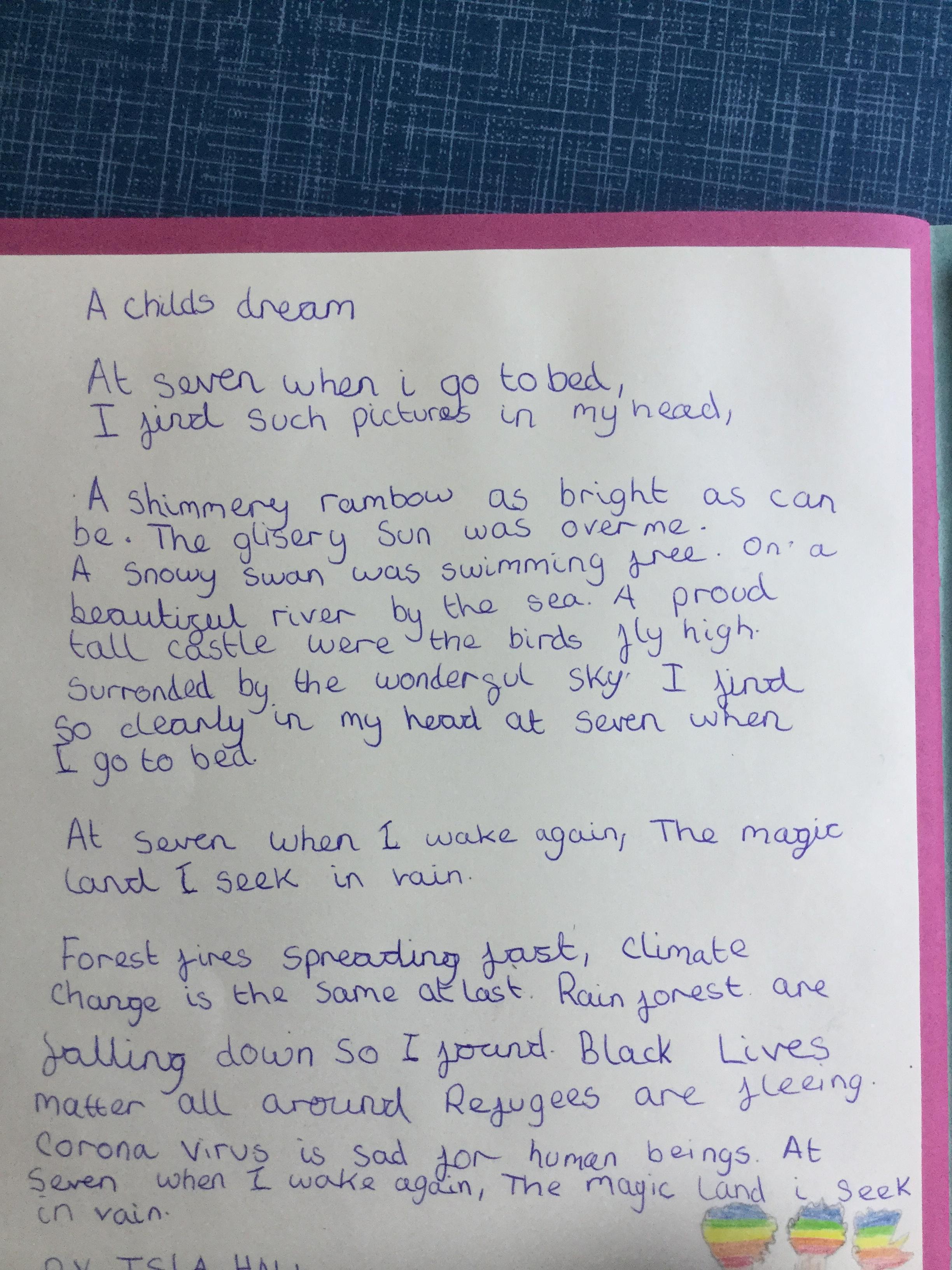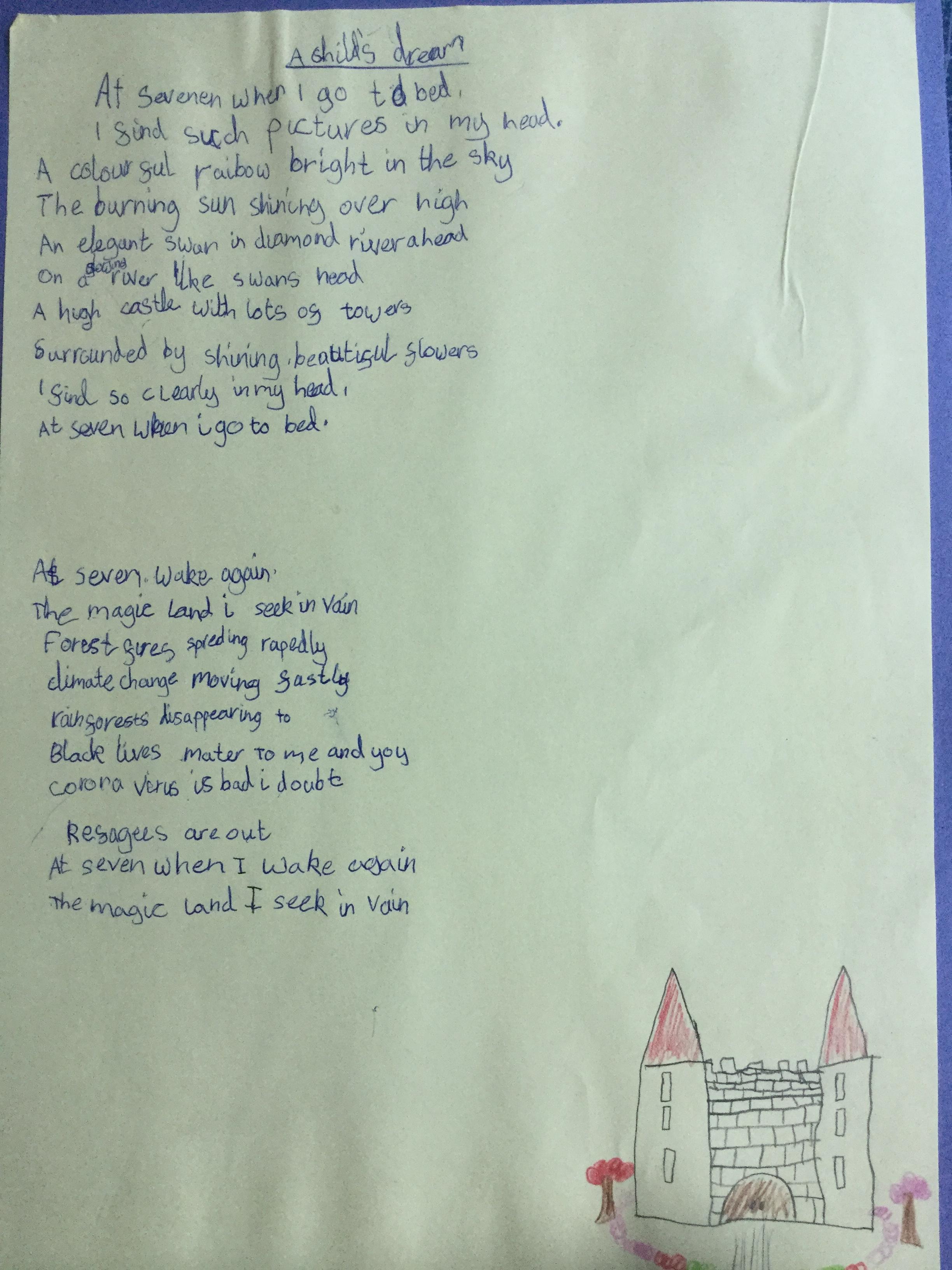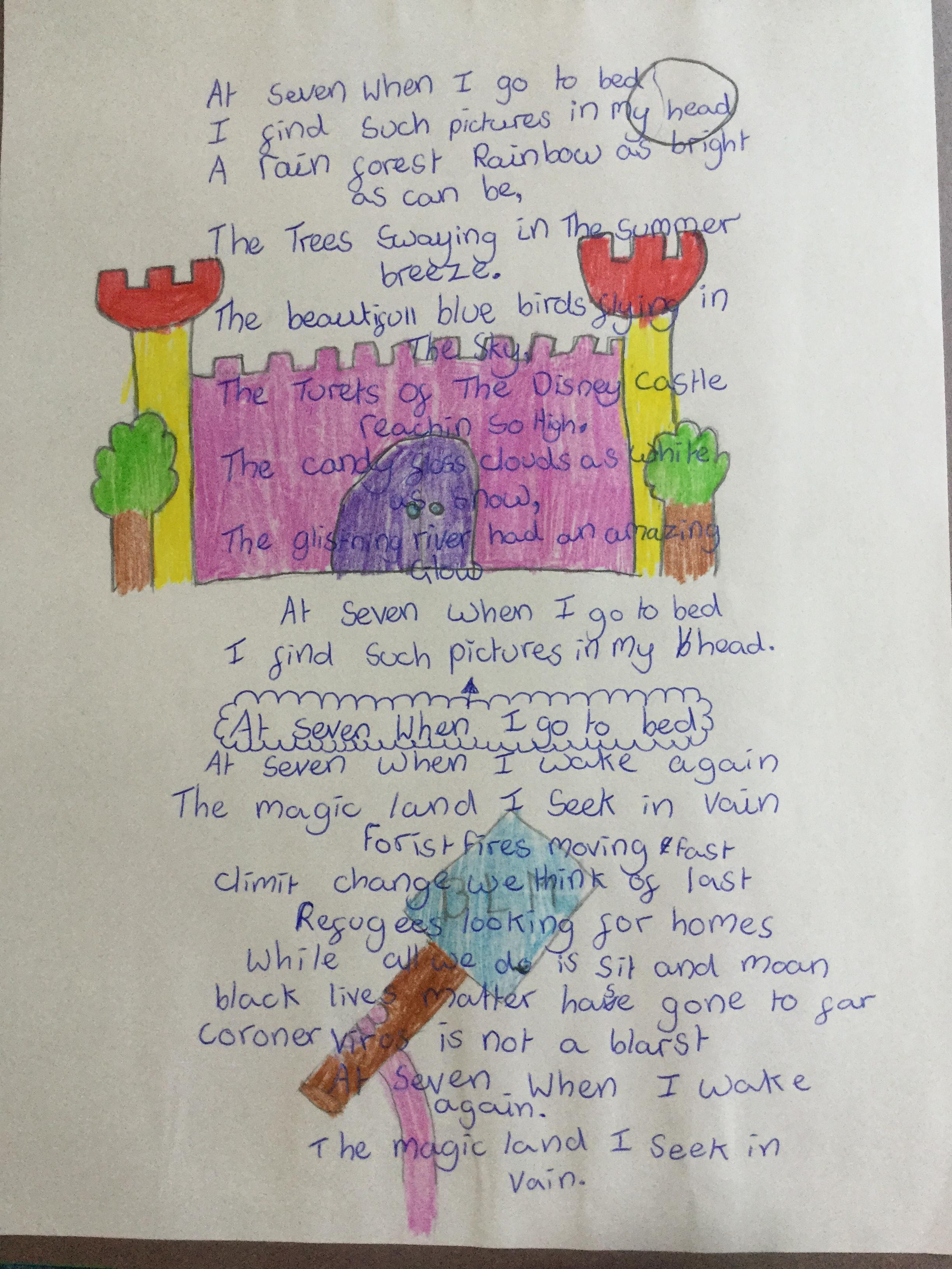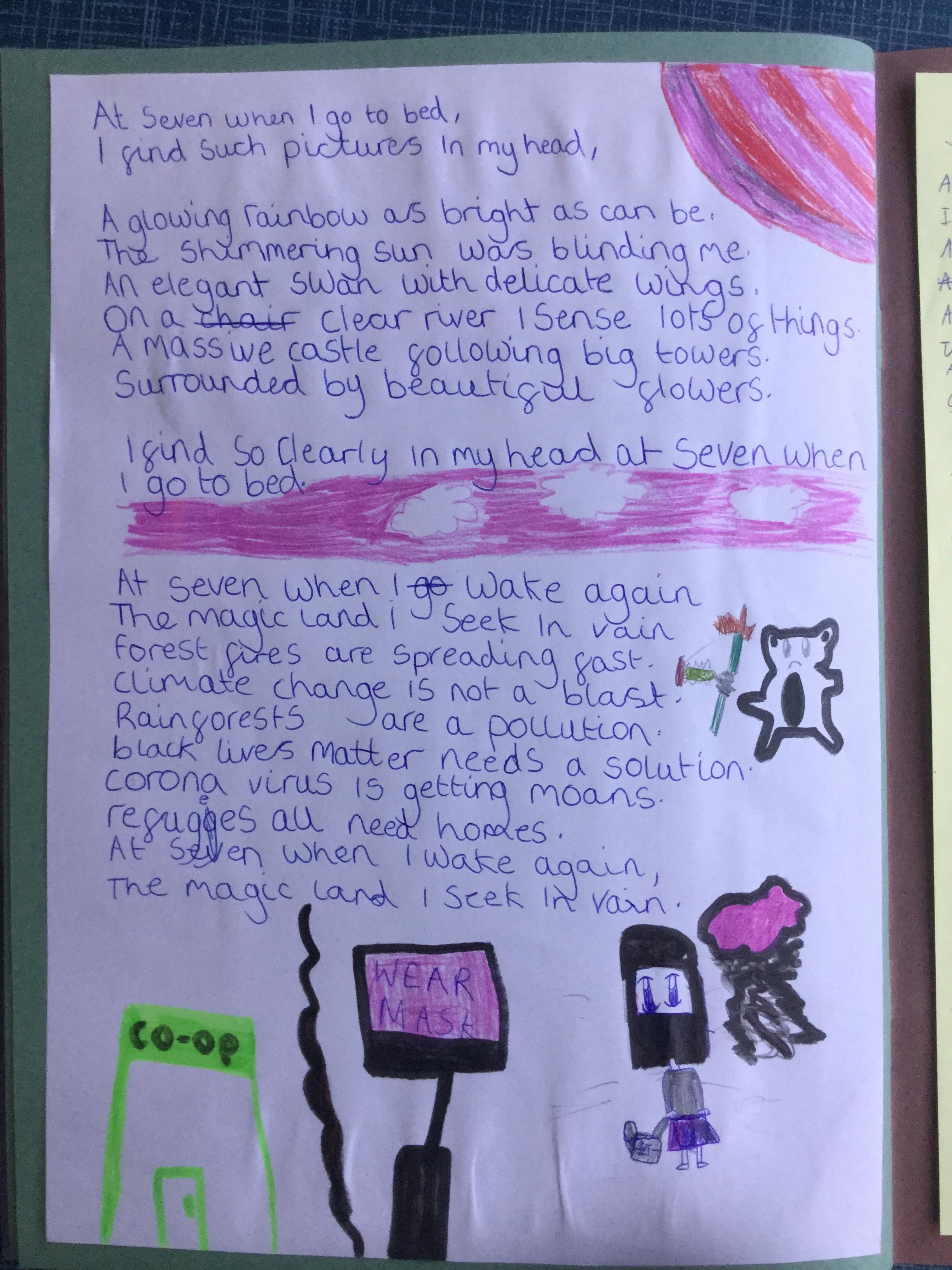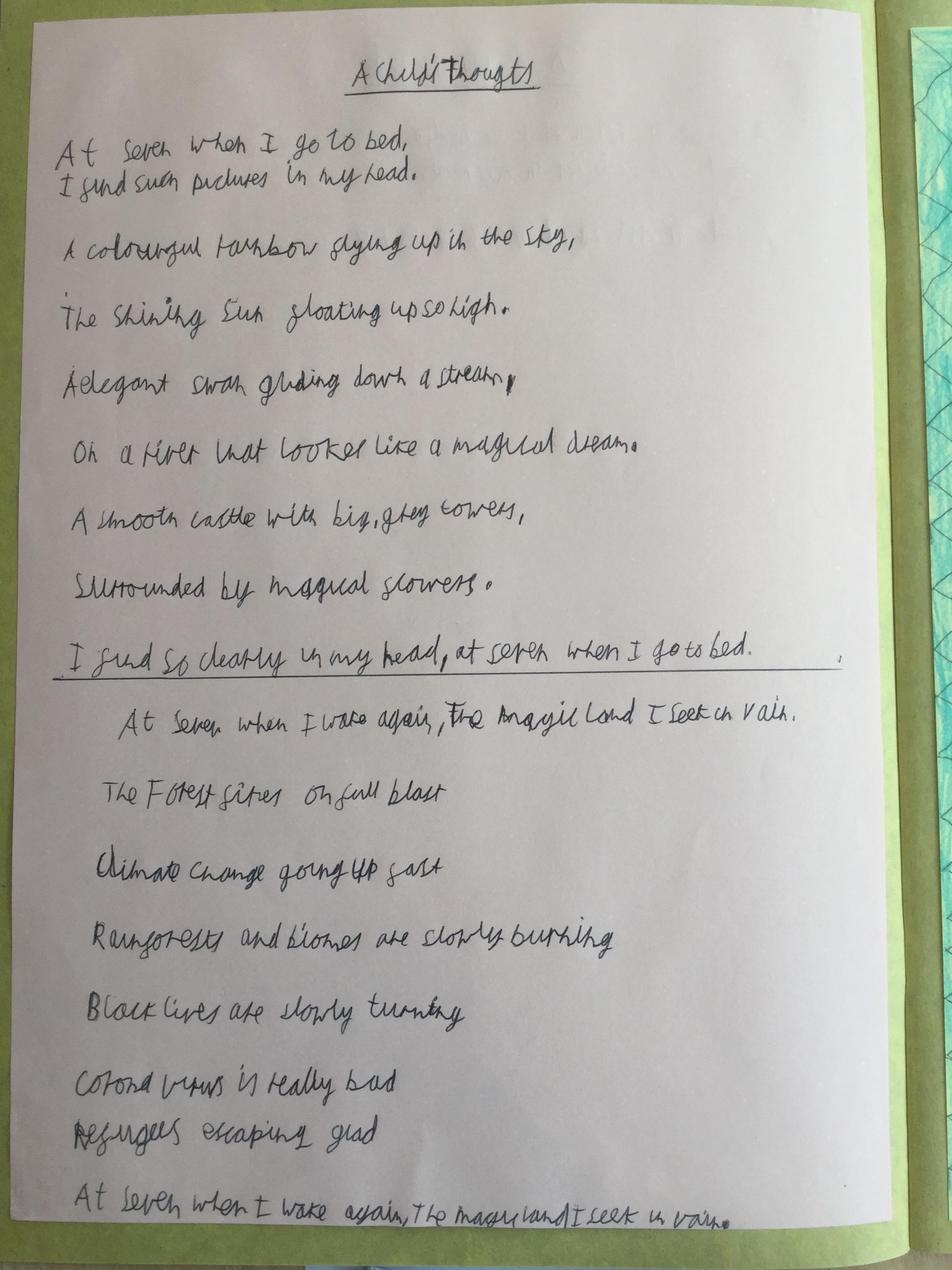 This week the children have been studying and imitating the work of Robert Lewis Stevenson about a child’s thought. This poem is about a dreamland vs reality of life. Across the week we have widened our vocabulary thinking about: verbs, nouns, adverbs, adjectives, thoughts, feelings and 5 senses to create poems with imagery and meaning. To start with we imitated the poet using the image given and then created our own based on a new dreamworld and the reality of life that is happening in the world around us such as: lockdown, coronavirus, black lives matter, deforestation, politics, technology, climate change, protests, war, fires amongst others. All ideas were from the children. It was a great week of creativity and poetry from Year 5!