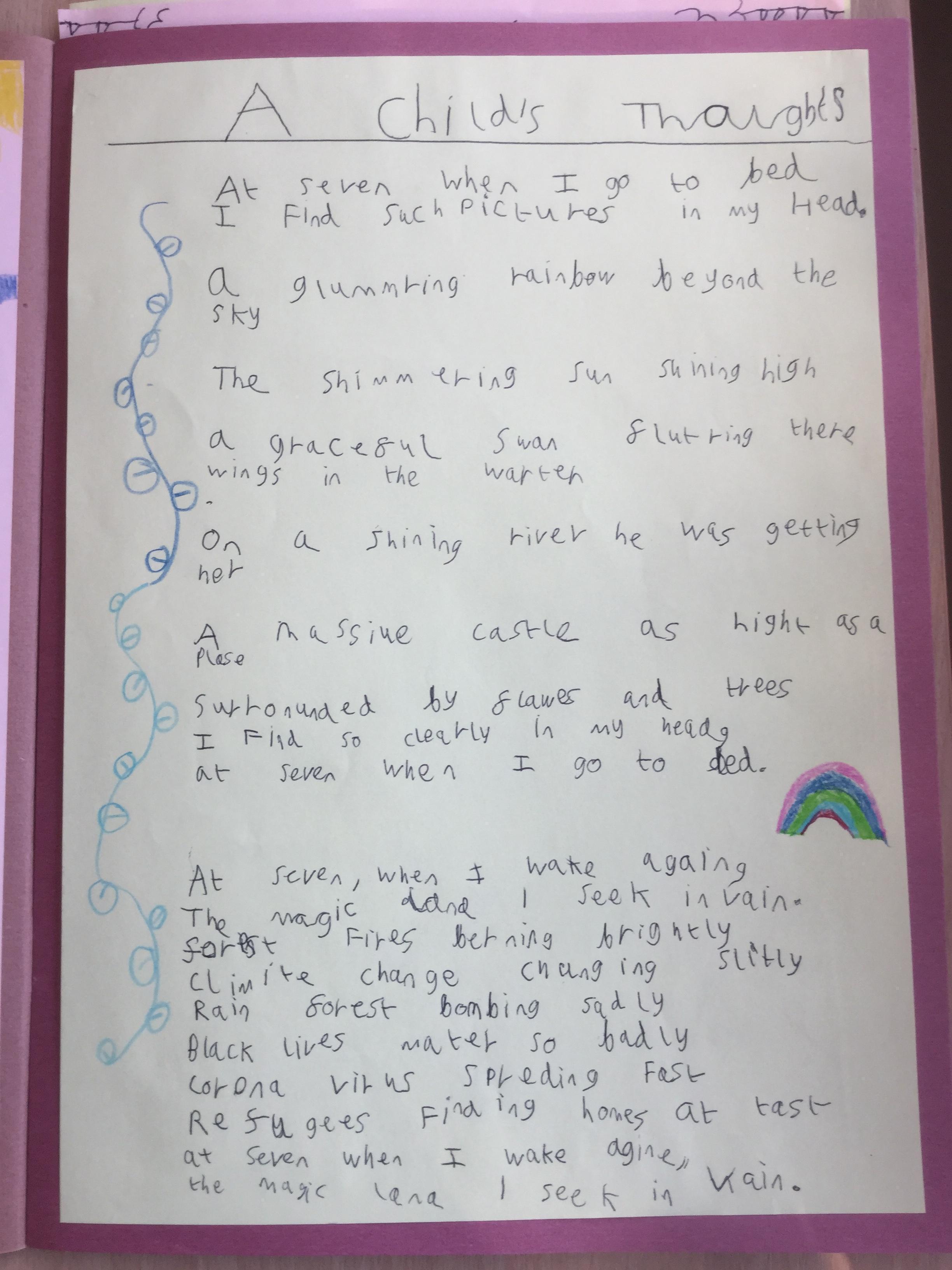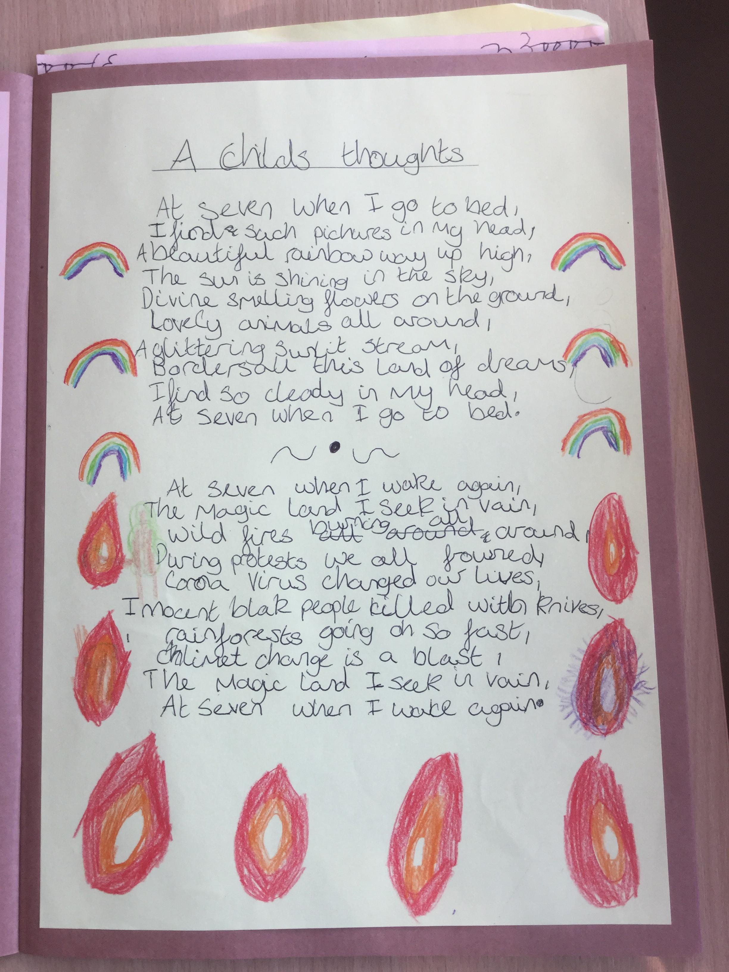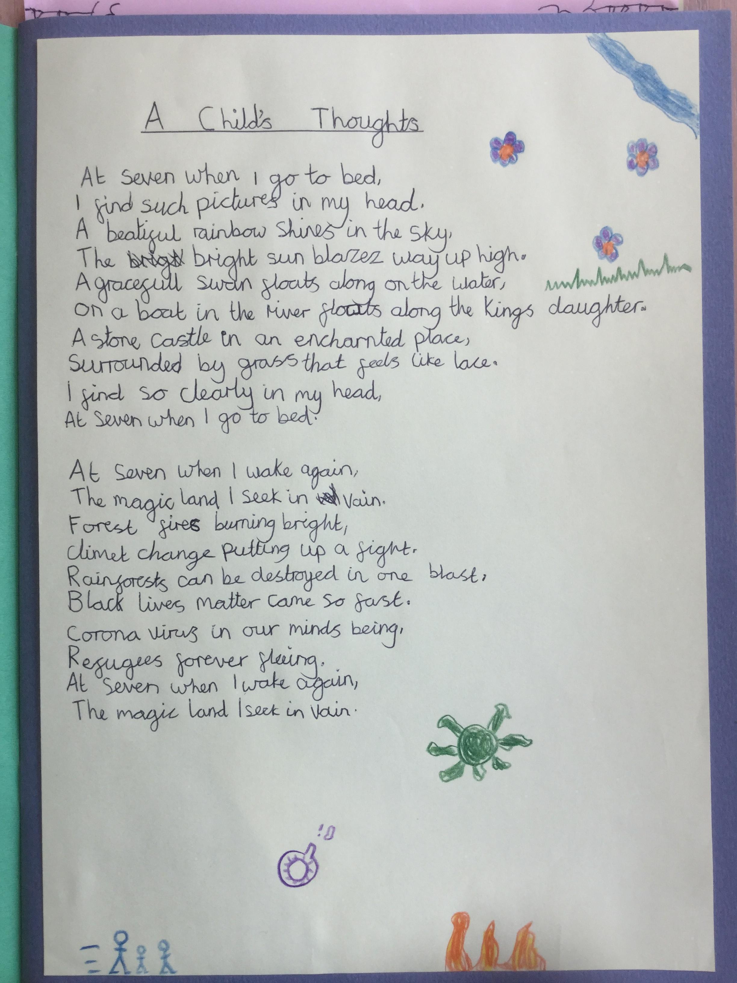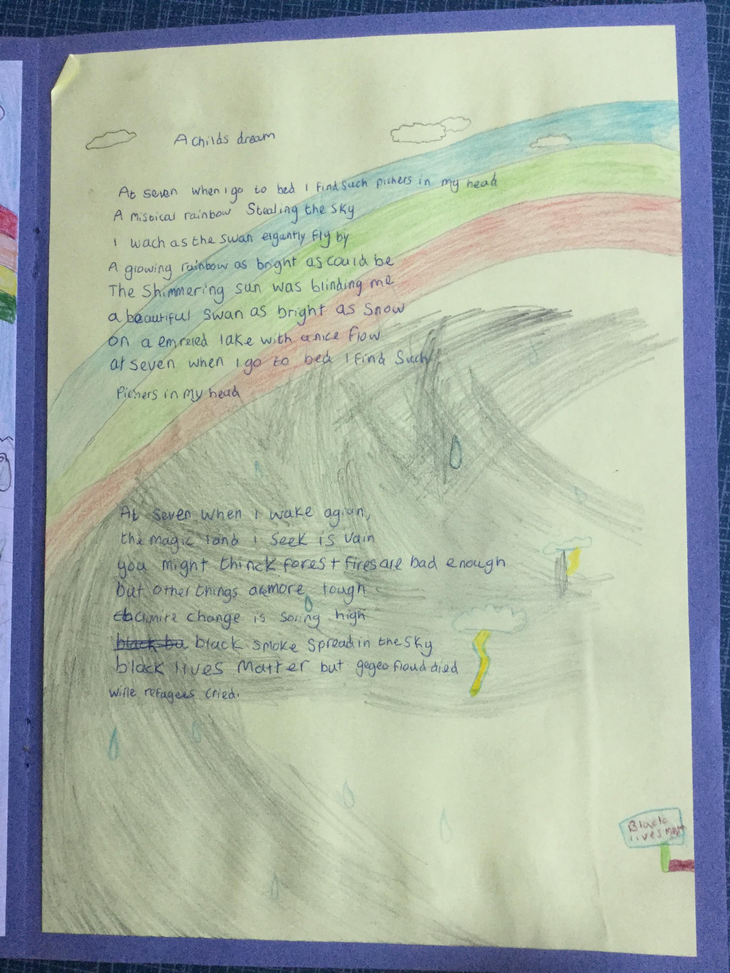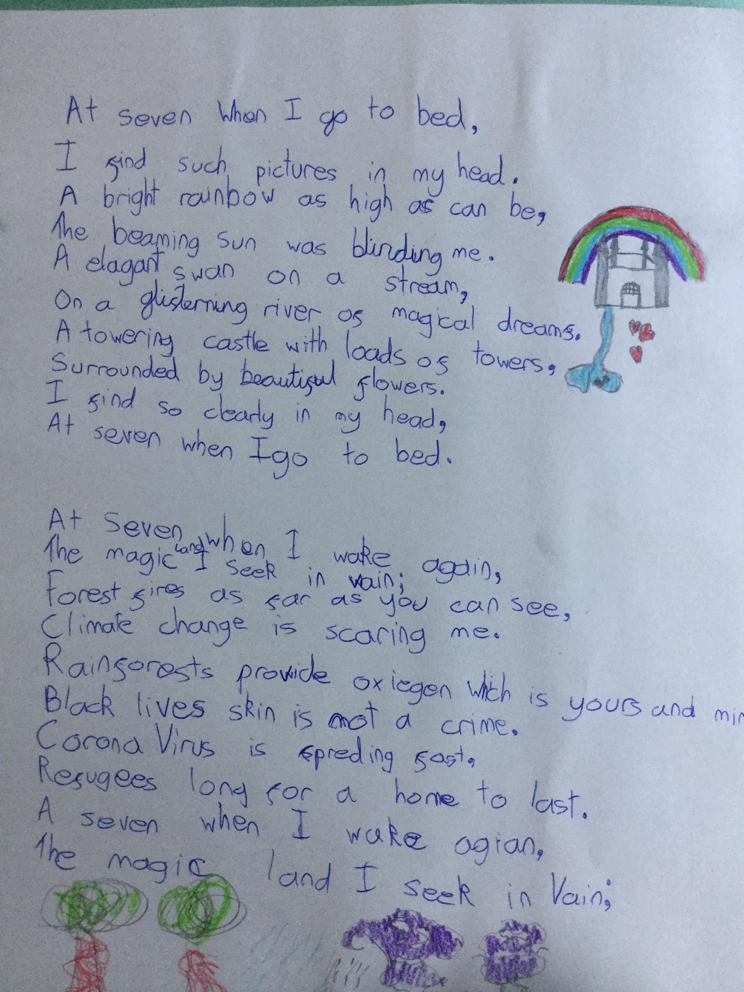 This week the children have been studying and imitating the work of Robert Lewis Stevenson about a child’s thought. This poem is about a dreamland vs reality of life. Across the week we have widened our vocabulary thinking about: verbs, nouns, adverbs, adjectives, thoughts, feelings and 5 senses to create poems with imagery and meaning. To start with we imitated the poet using the image given and then created our own based on a new dreamworld and the reality of life that is happening in the world around us such as: lockdown, coronavirus, black lives matter, deforestation, politics, technology, climate change, protests, war, fires amongst others. All ideas were from the children. It was a great week of creativity and poetry from Year 5!