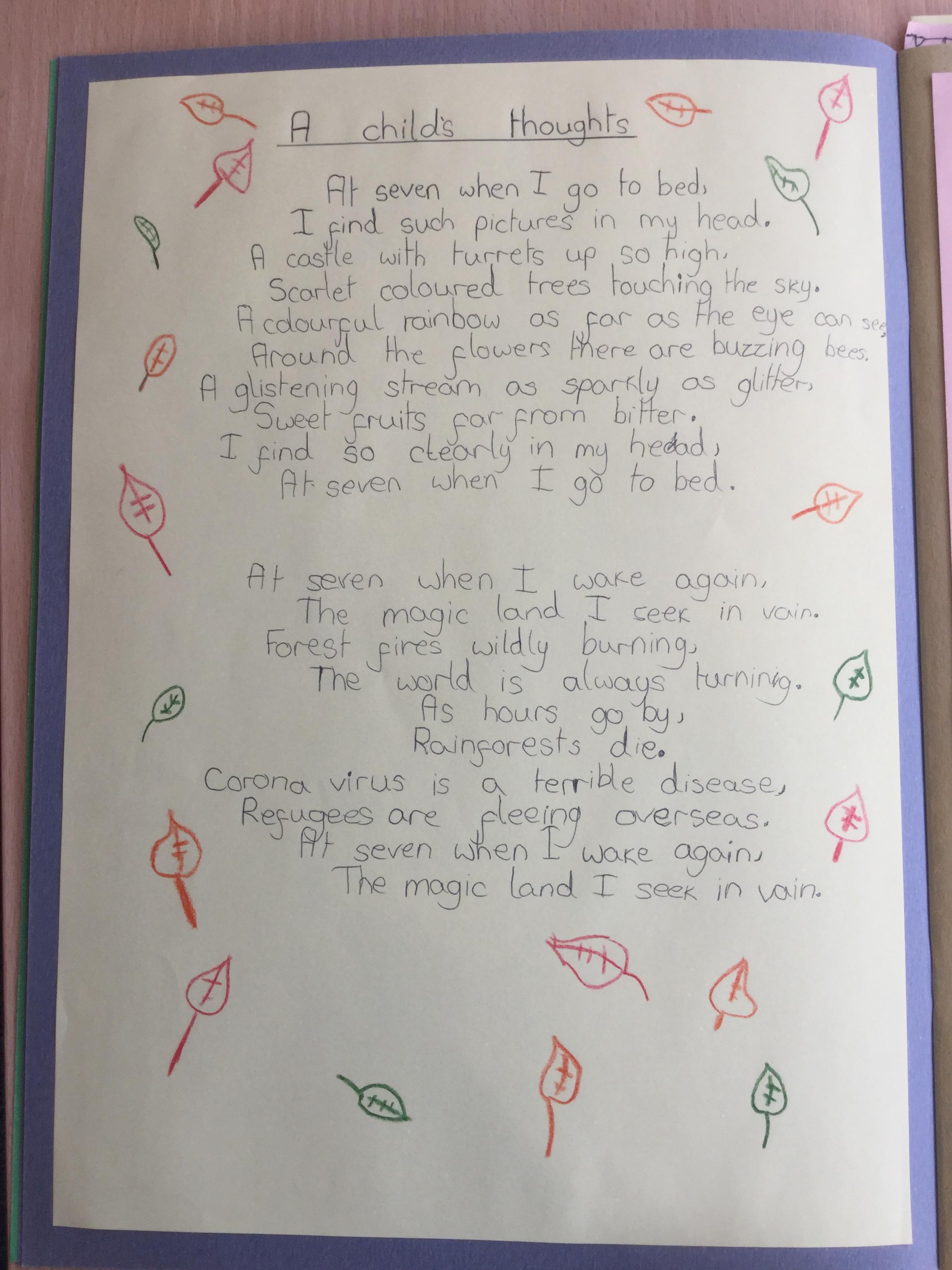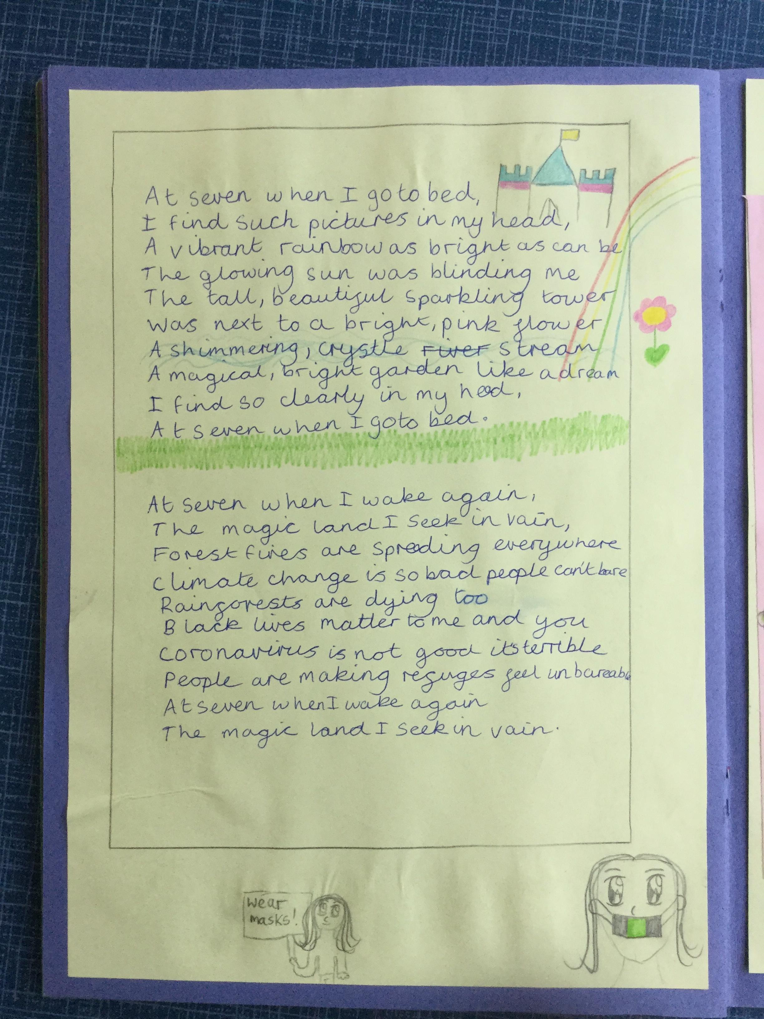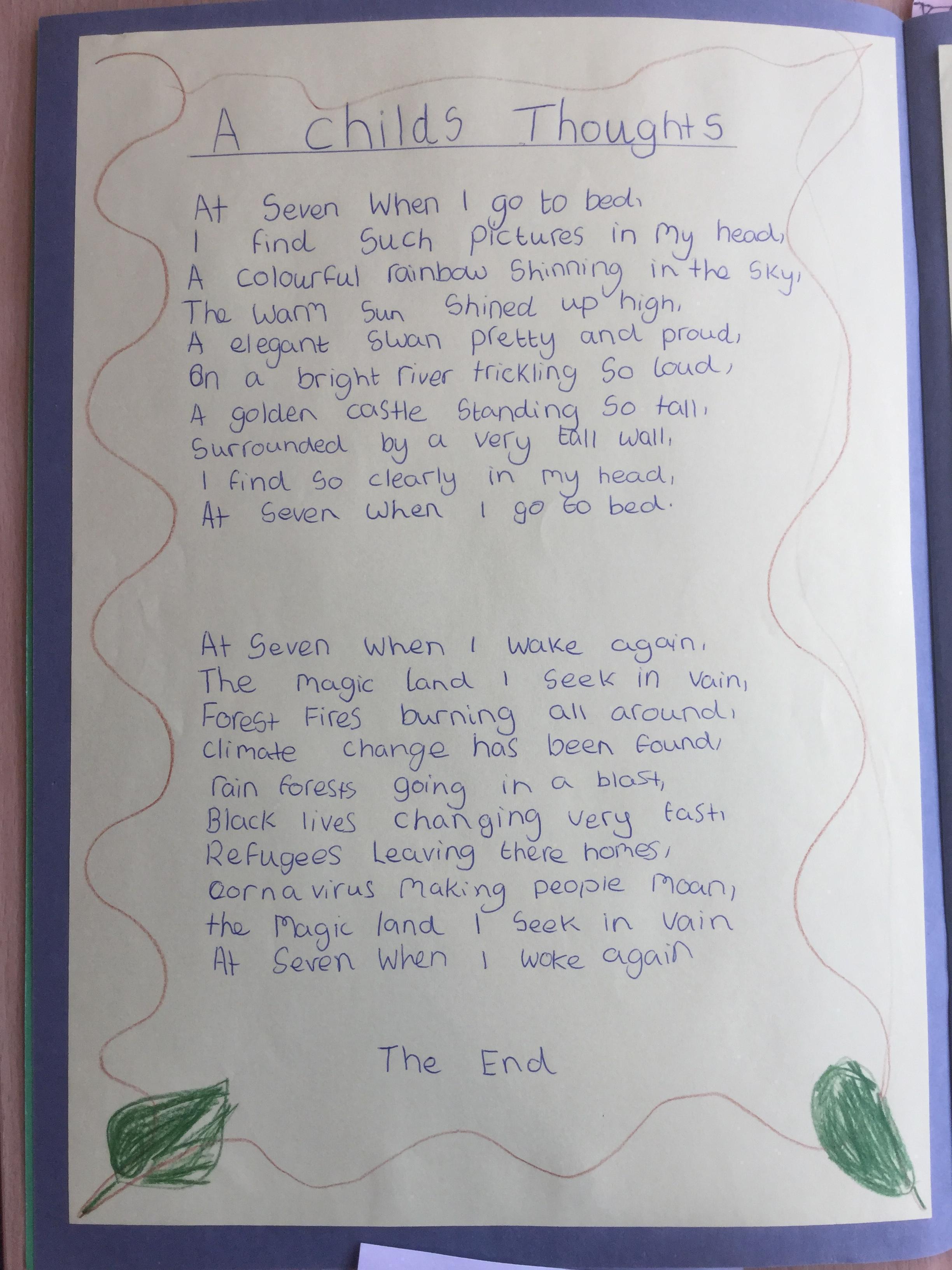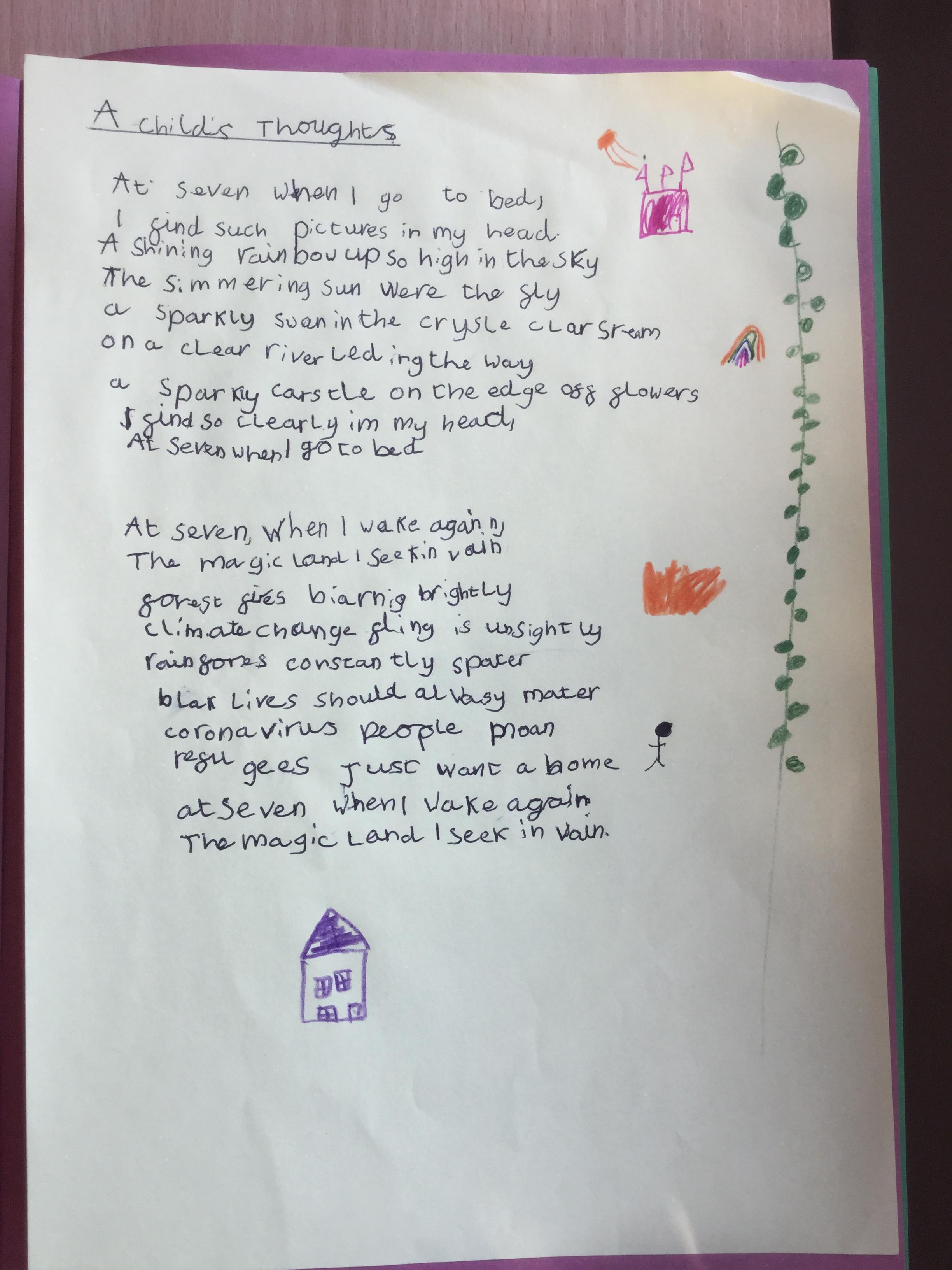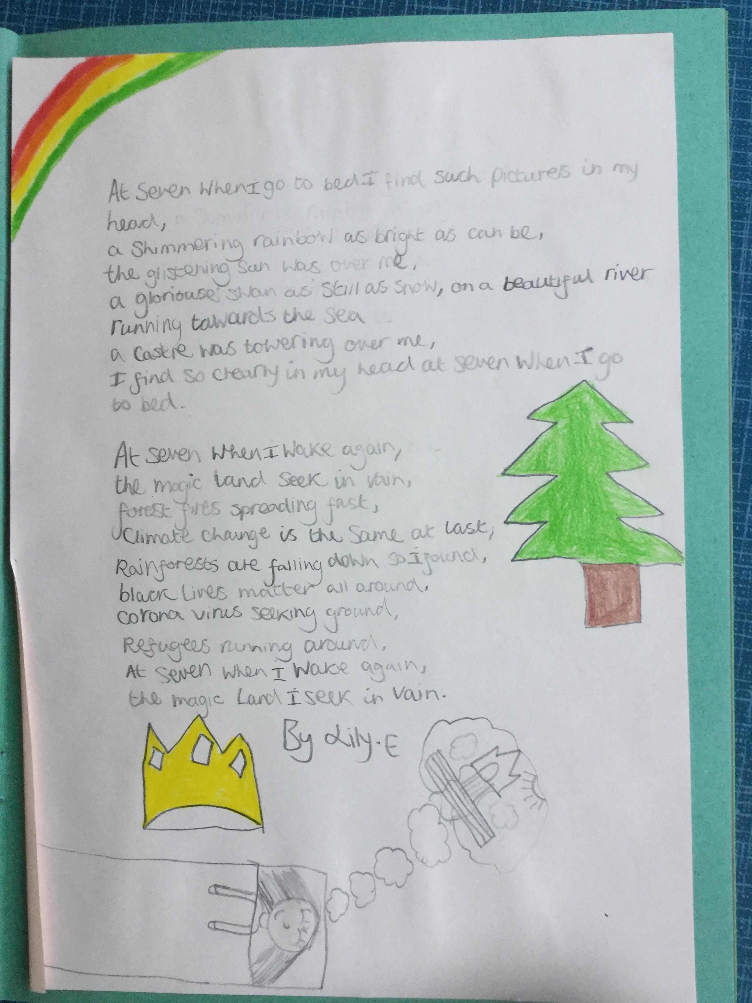 This week the children have been studying and imitating the work of Robert Lewis Stevenson about a child’s thought. This poem is about a dreamland vs reality of life. Across the week we have widened our vocabulary thinking about: verbs, nouns, adverbs, adjectives, thoughts, feelings and 5 senses to create poems with imagery and meaning. To start with we imitated the poet using the image given and then created our own based on a new dreamworld and the reality of life that is happening in the world around us such as: lockdown, coronavirus, black lives matter, deforestation, politics, technology, climate change, protests, war, fires amongst others. All ideas were from the children. It was a great week of creativity and poetry from Year 5!