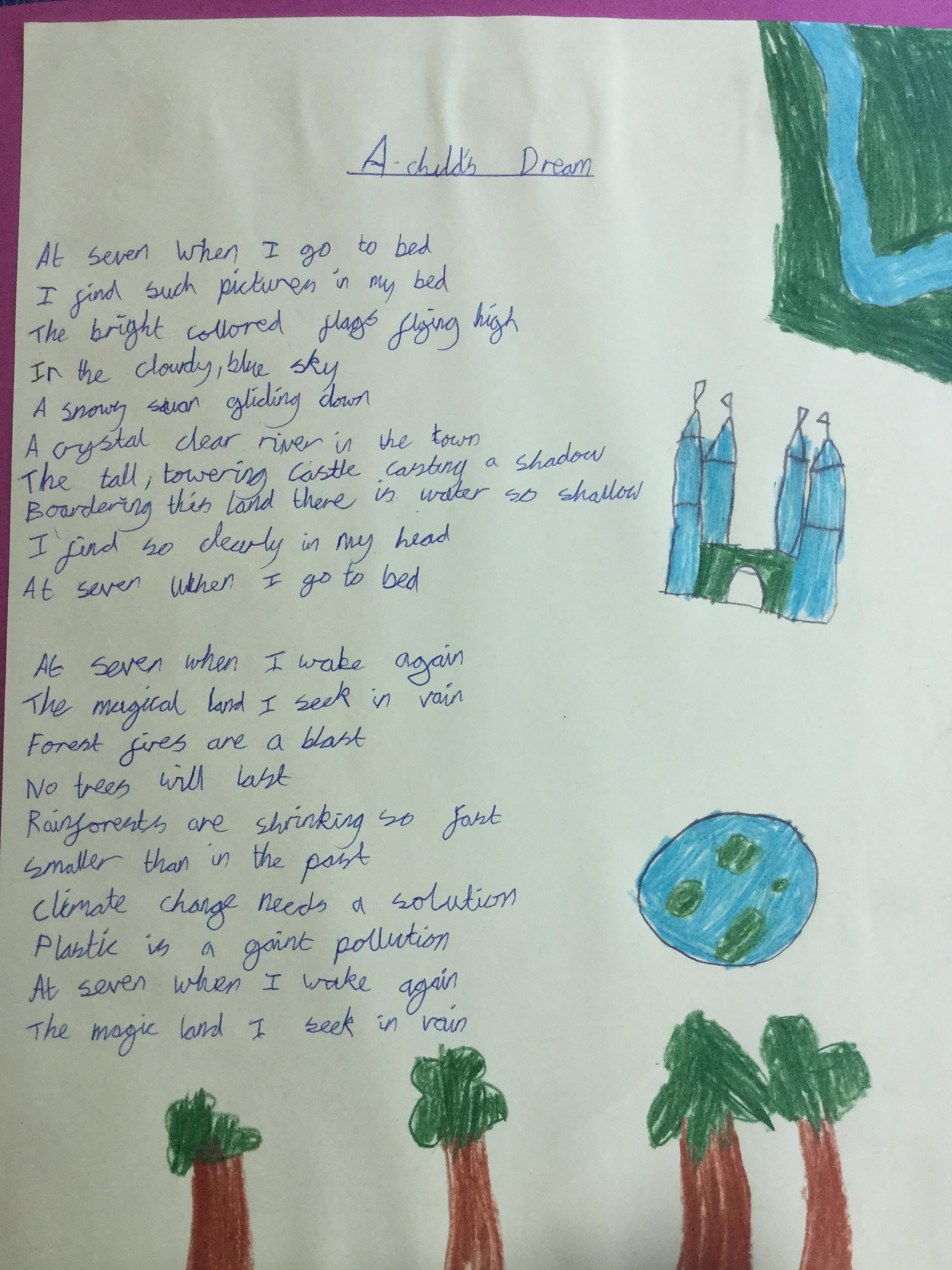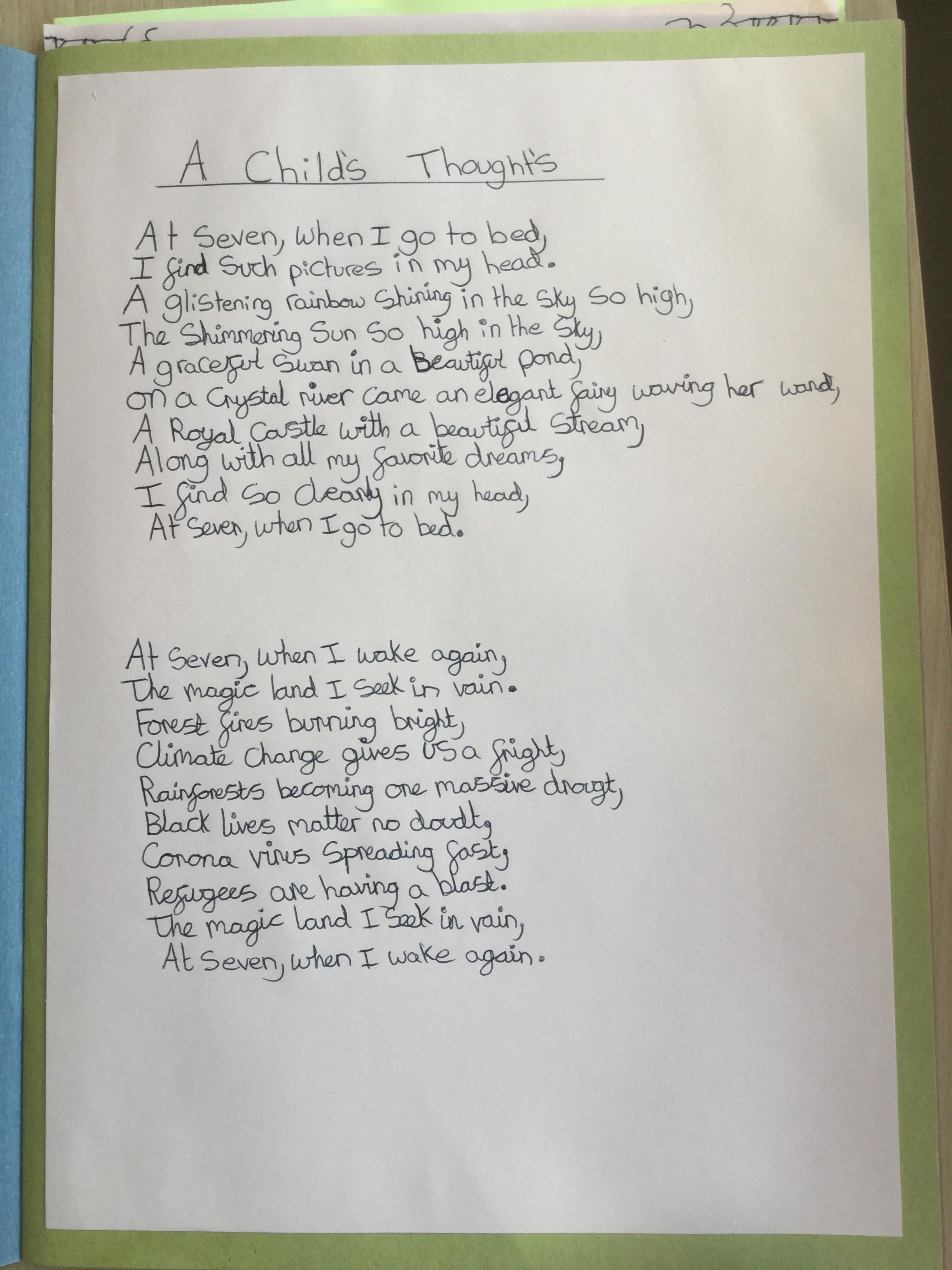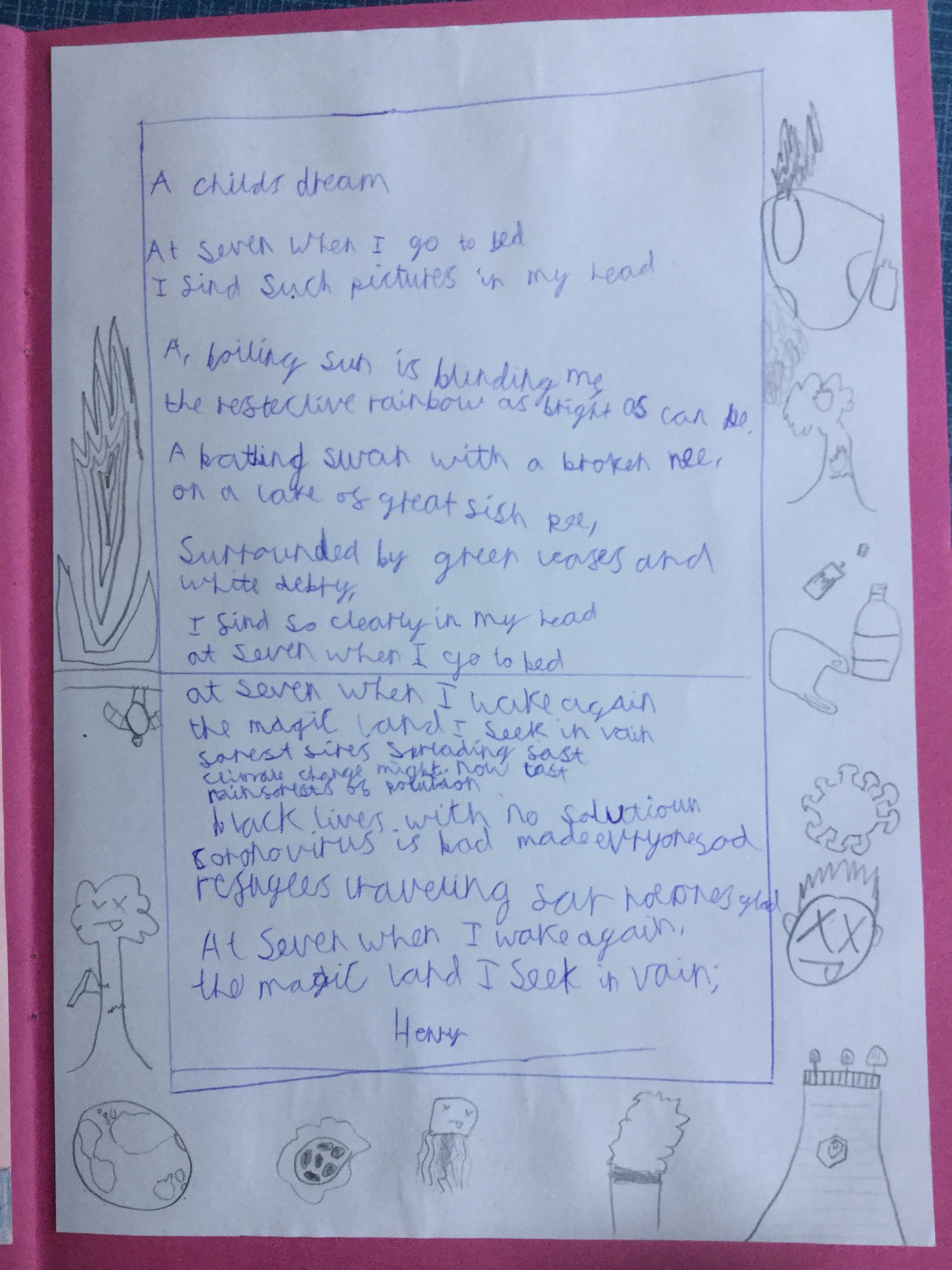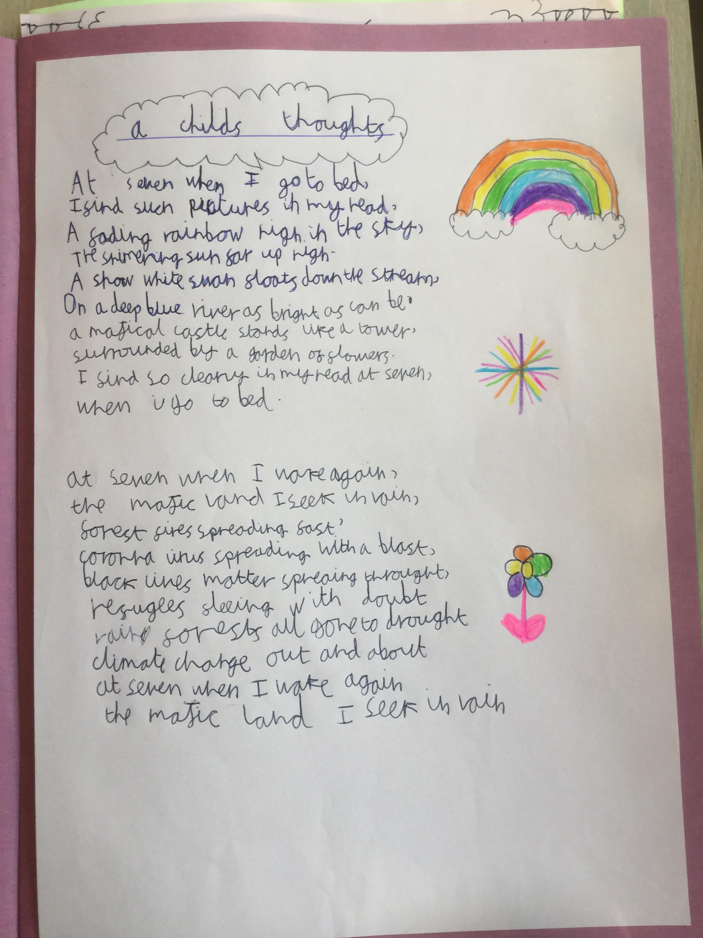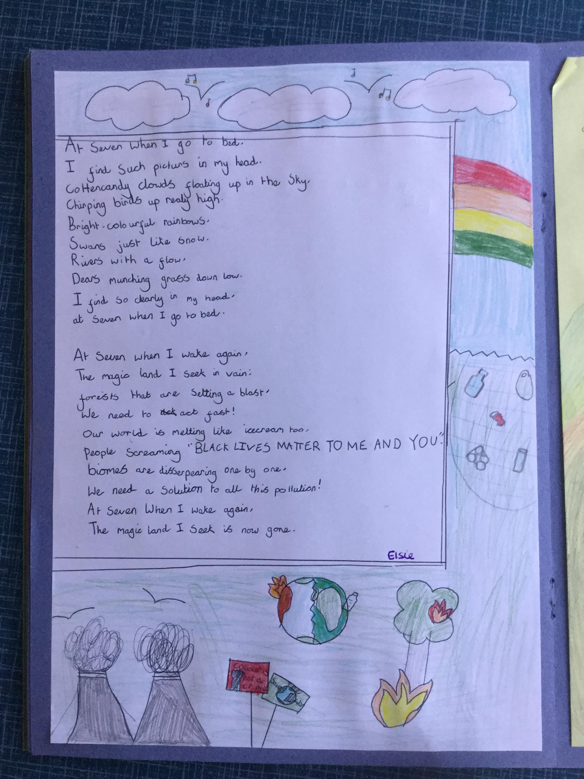 This week the children have been studying and imitating the work of Robert Lewis Stevenson about a child’s thought. This poem is about a dreamland vs reality of life. Across the week we have widened our vocabulary thinking about: verbs, nouns, adverbs, adjectives, thoughts, feelings and 5 senses to create poems with imagery and meaning. To start with we imitated the poet using the image given and then created our own based on a new dreamworld and the reality of life that is happening in the world around us such as: lockdown, coronavirus, black lives matter, deforestation, politics, technology, climate change, protests, war, fires amongst others. All ideas were from the children. It was a great week of creativity and poetry from Year 5!