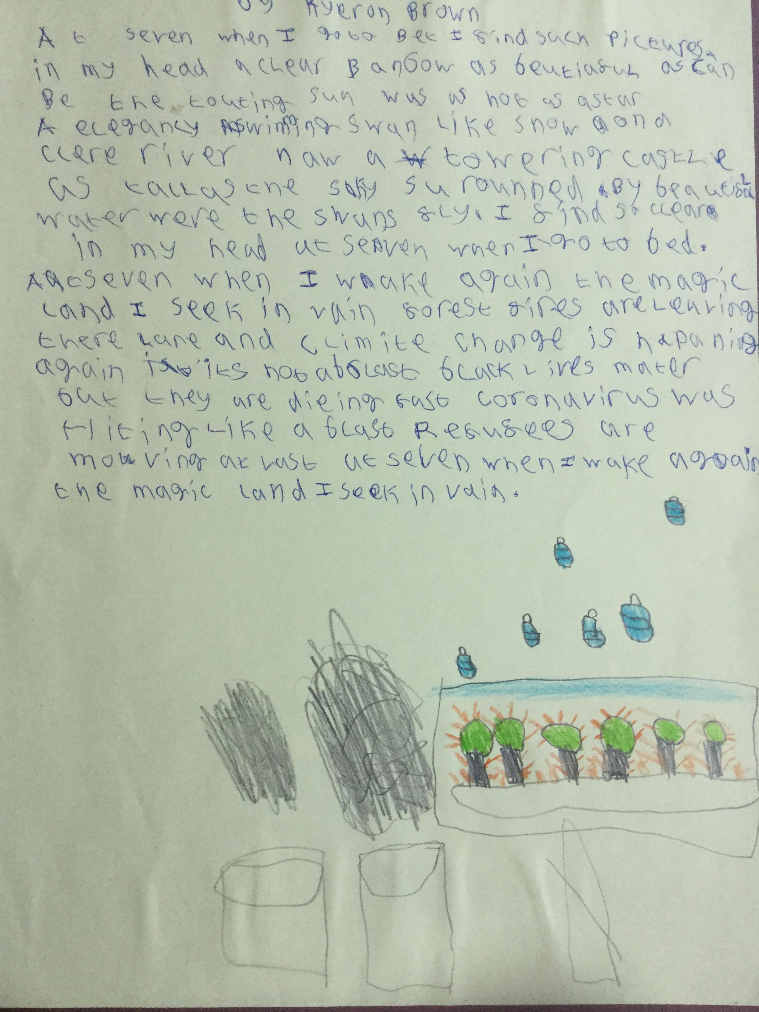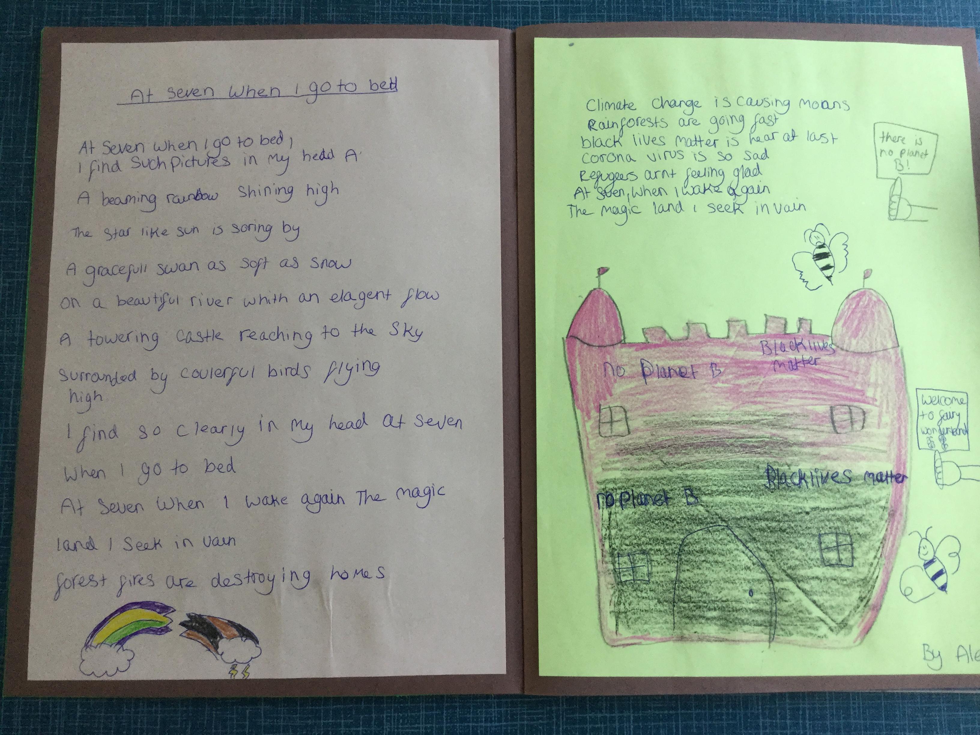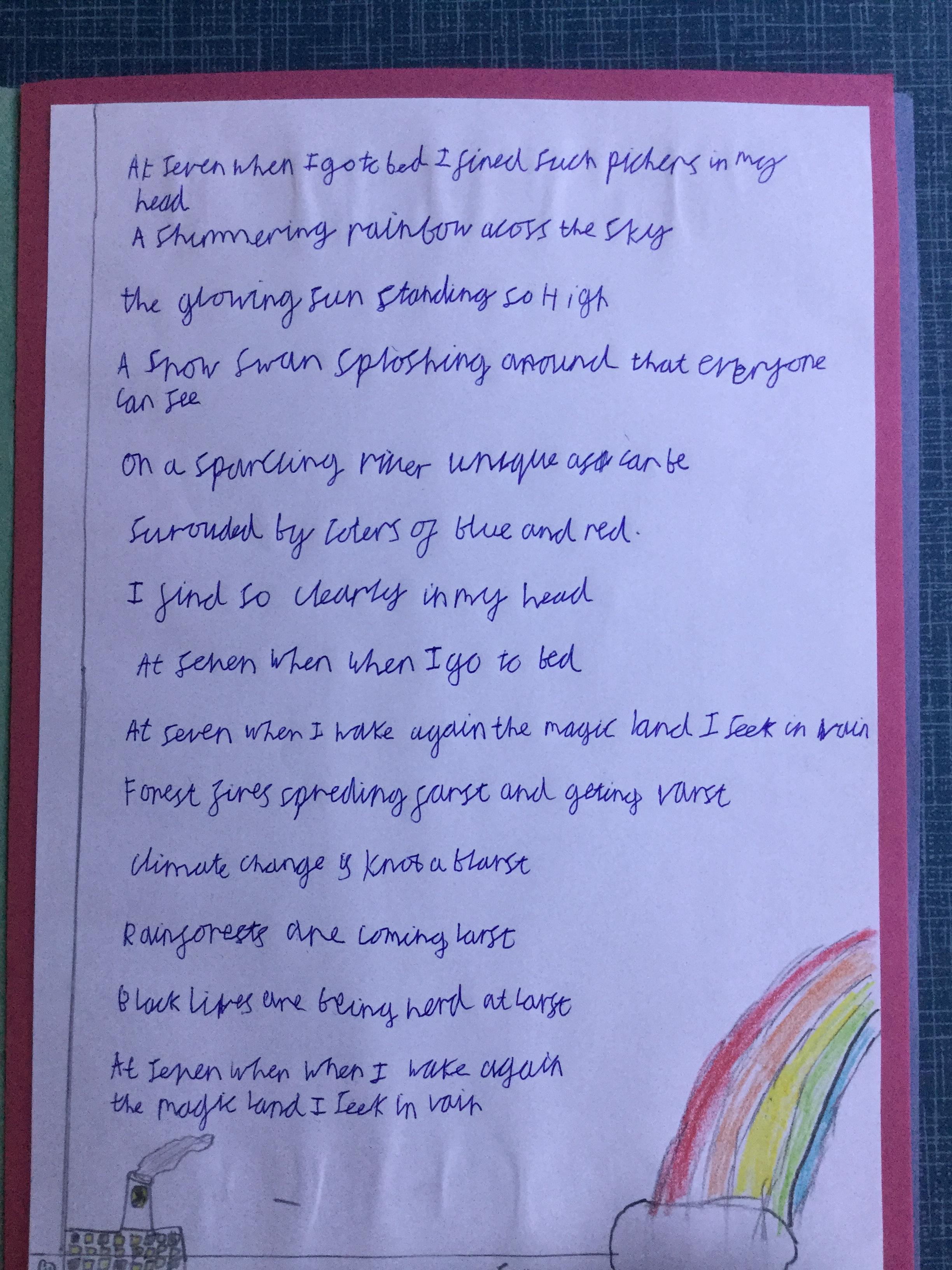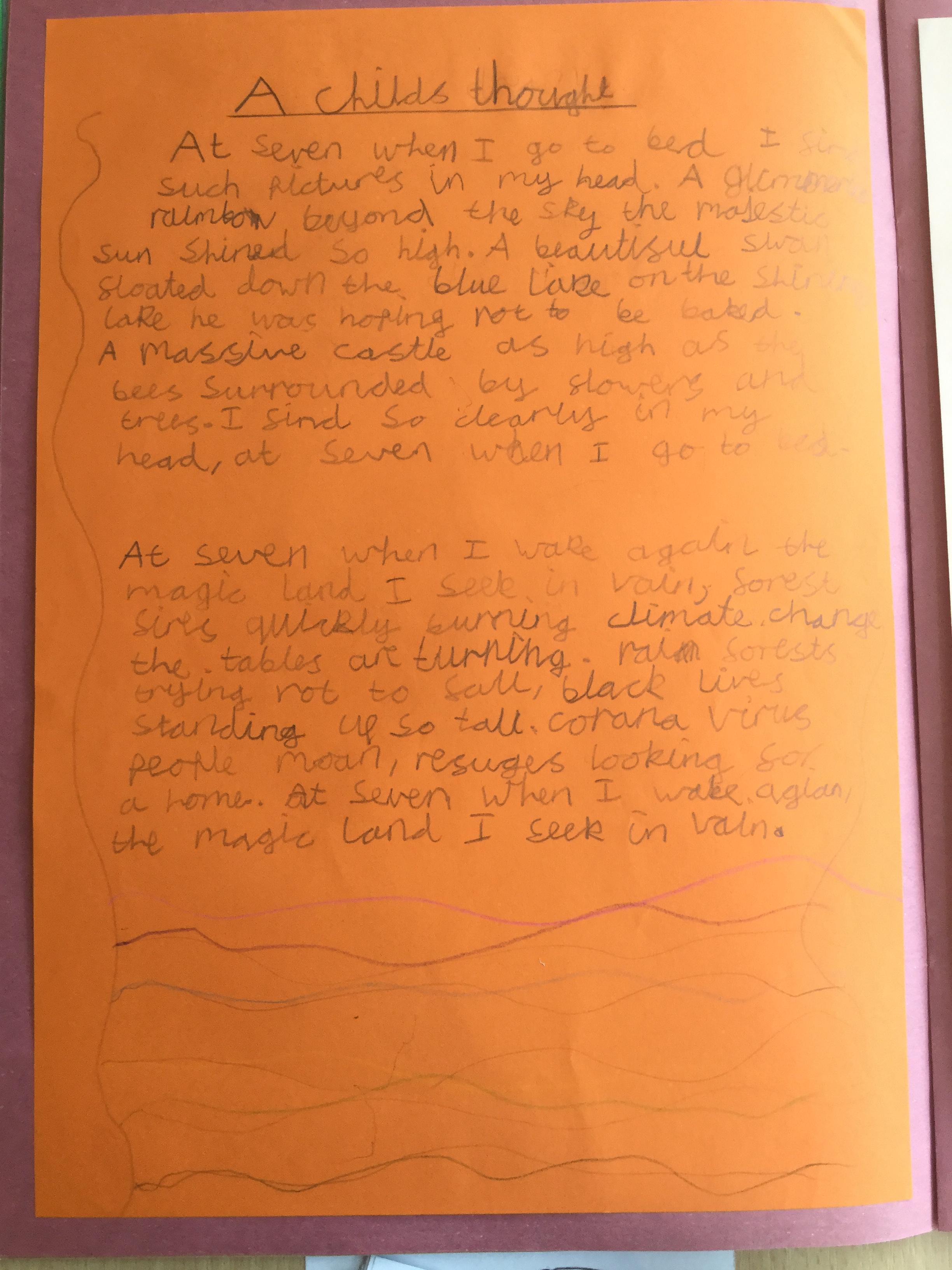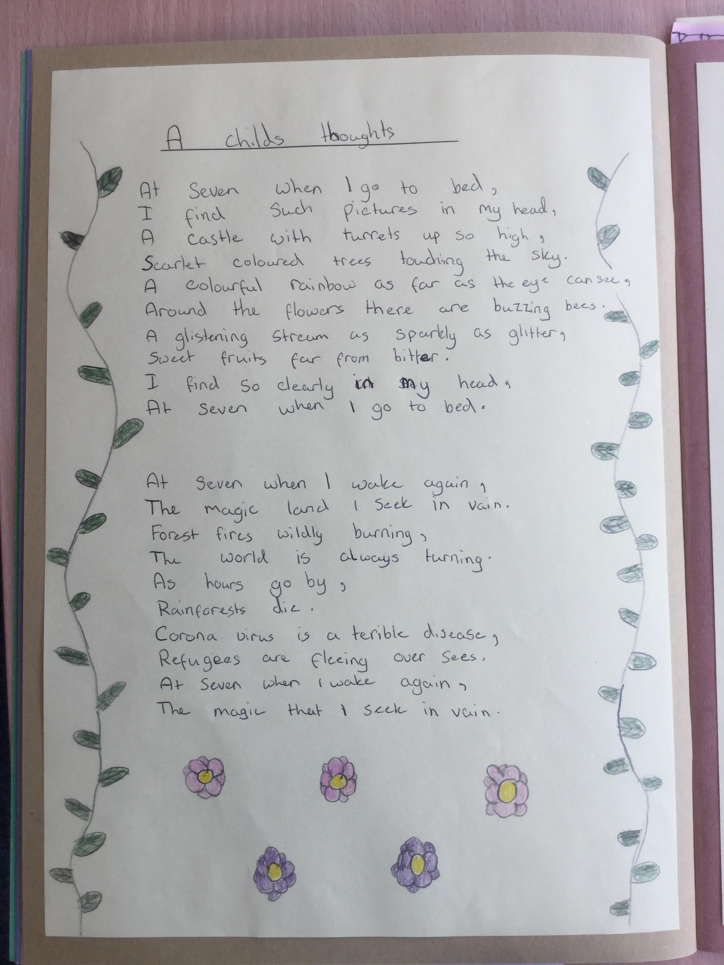 This week the children have been studying and imitating the work of Robert Lewis Stevenson about a child’s thought. This poem is about a dreamland vs reality of life. Across the week we have widened our vocabulary thinking about: verbs, nouns, adverbs, adjectives, thoughts, feelings and 5 senses to create poems with imagery and meaning. To start with we imitated the poet using the image given and then created our own based on a new dreamworld and the reality of life that is happening in the world around us such as: lockdown, coronavirus, black lives matter, deforestation, politics, technology, climate change, protests, war, fires amongst others. All ideas were from the children. It was a great week of creativity and poetry from Year 5!