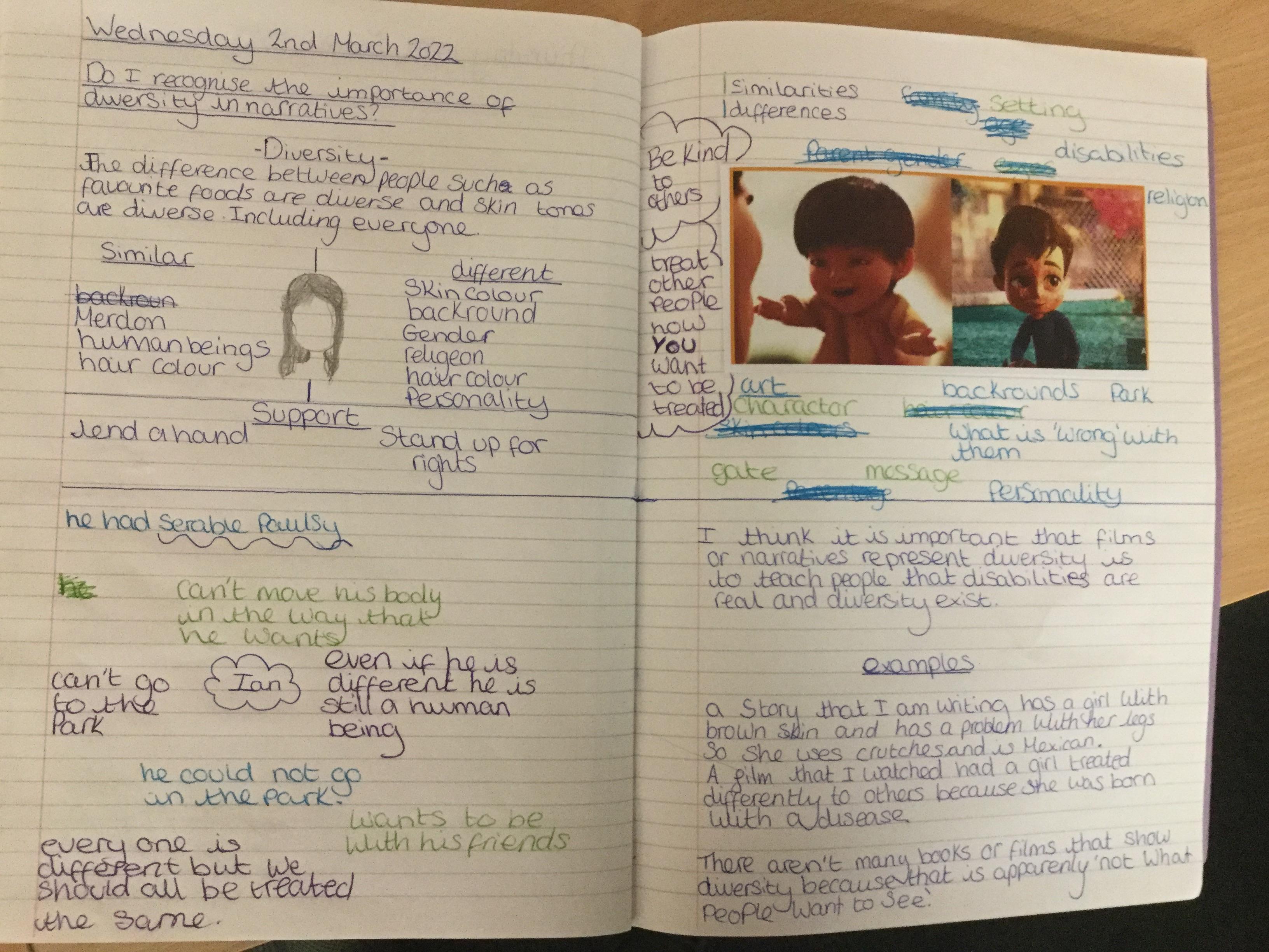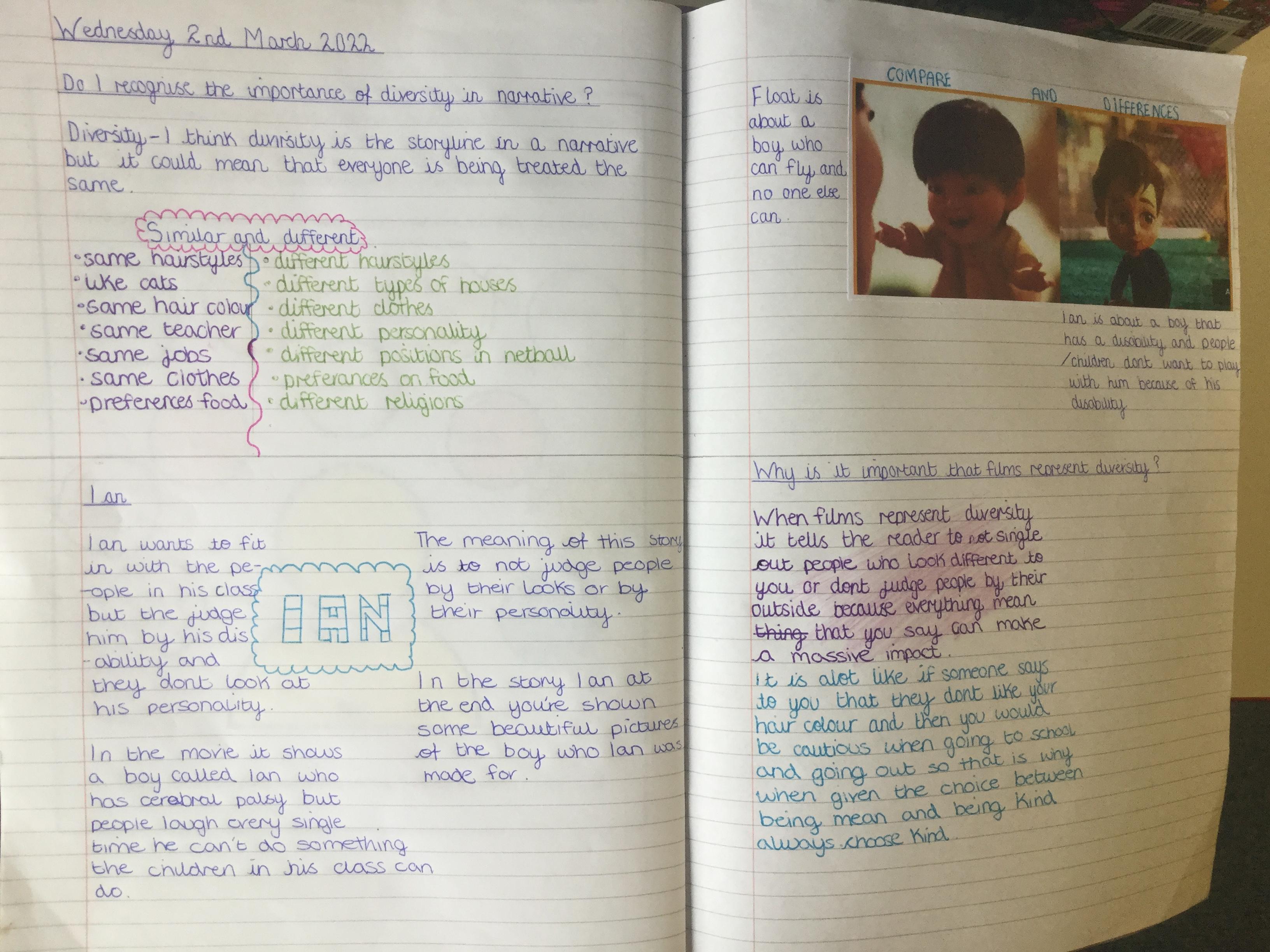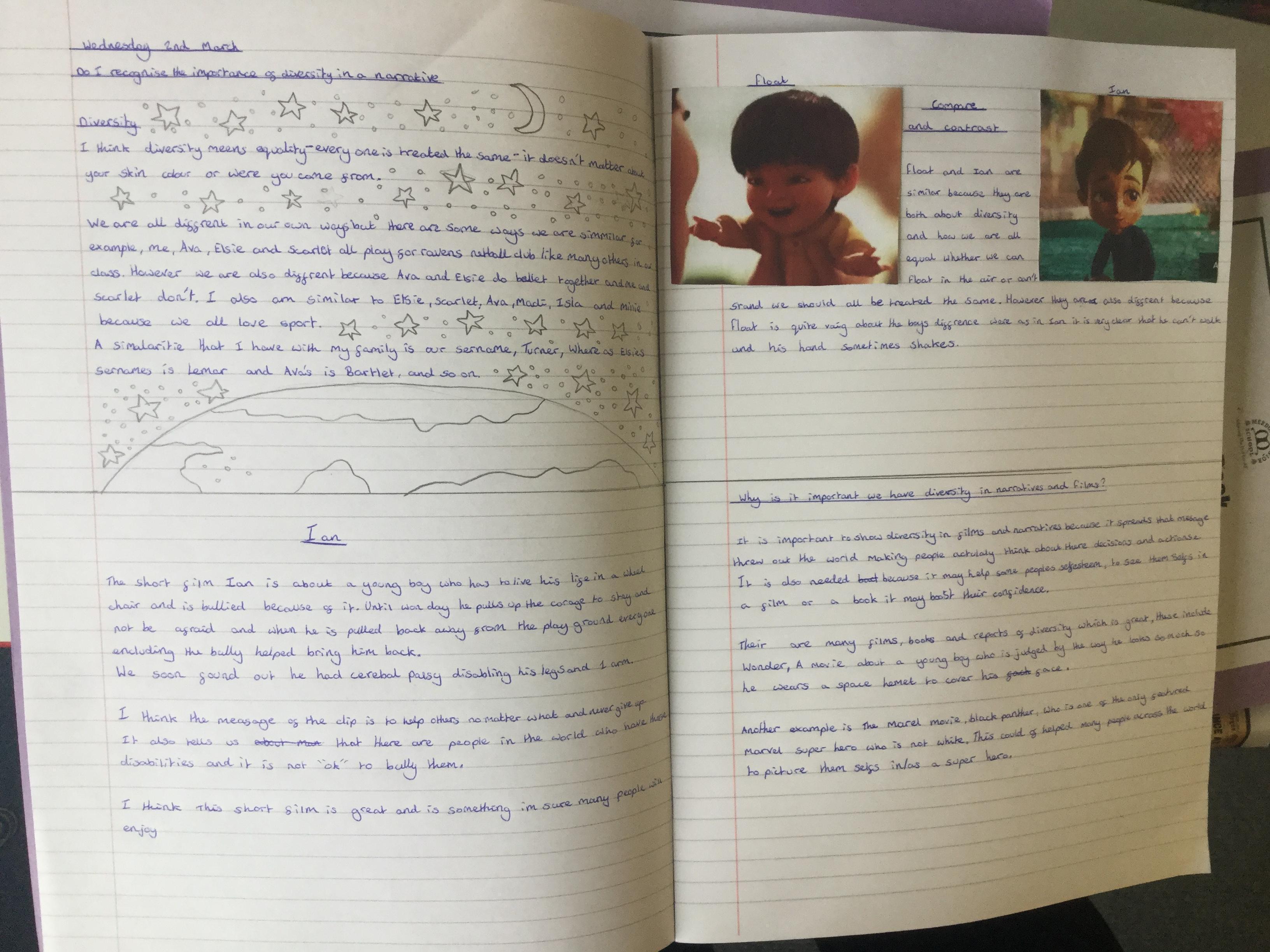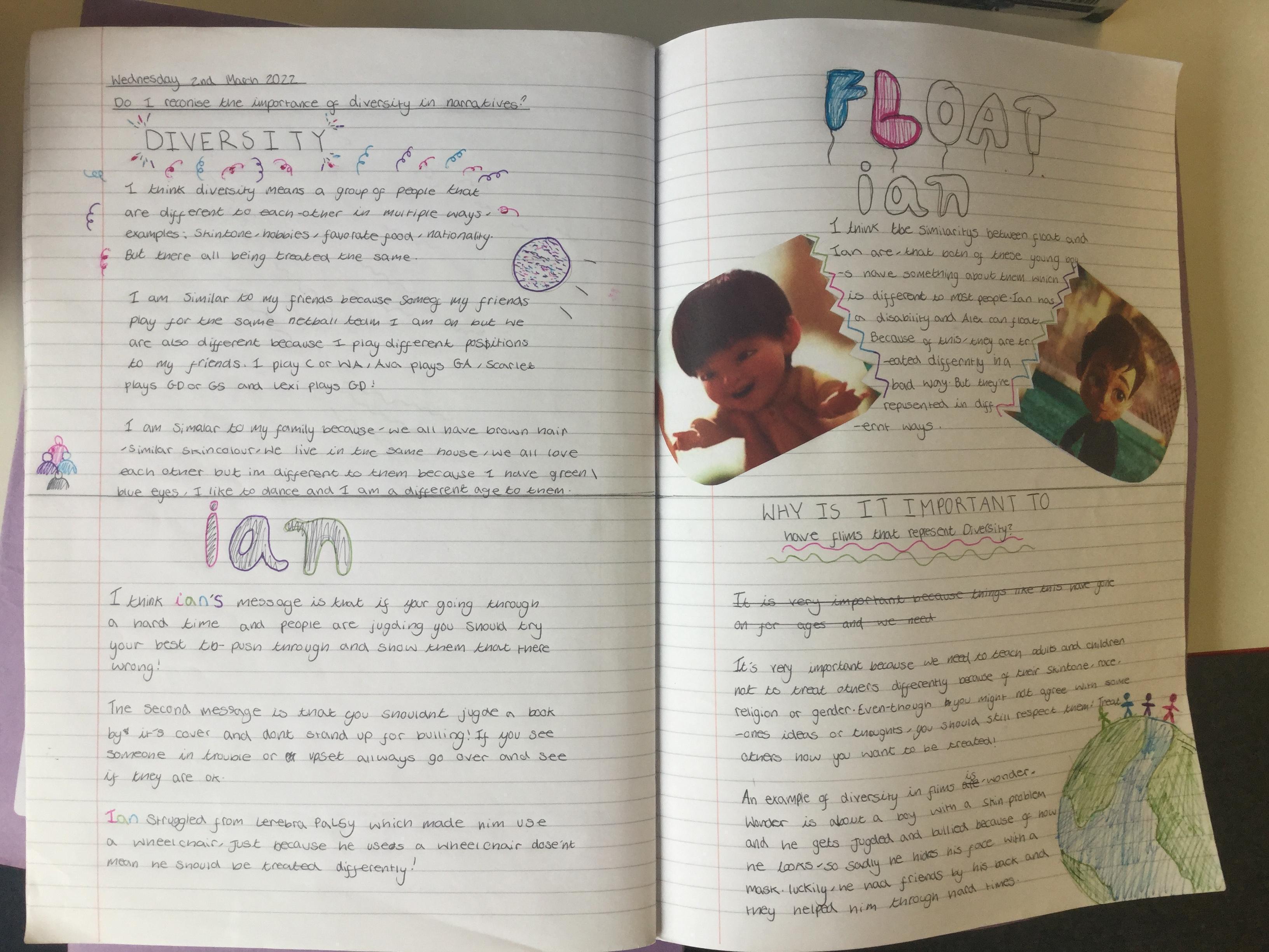 During a Let’s Think in English lesson the children watched, analysed and discussed the emotive short film ‘Ian’. They then watched another short film ‘Float’. We thought about what diversity means and how we are similar and different to others around them before unpicking the messages within the films and why diversity and representation is important within narratives.