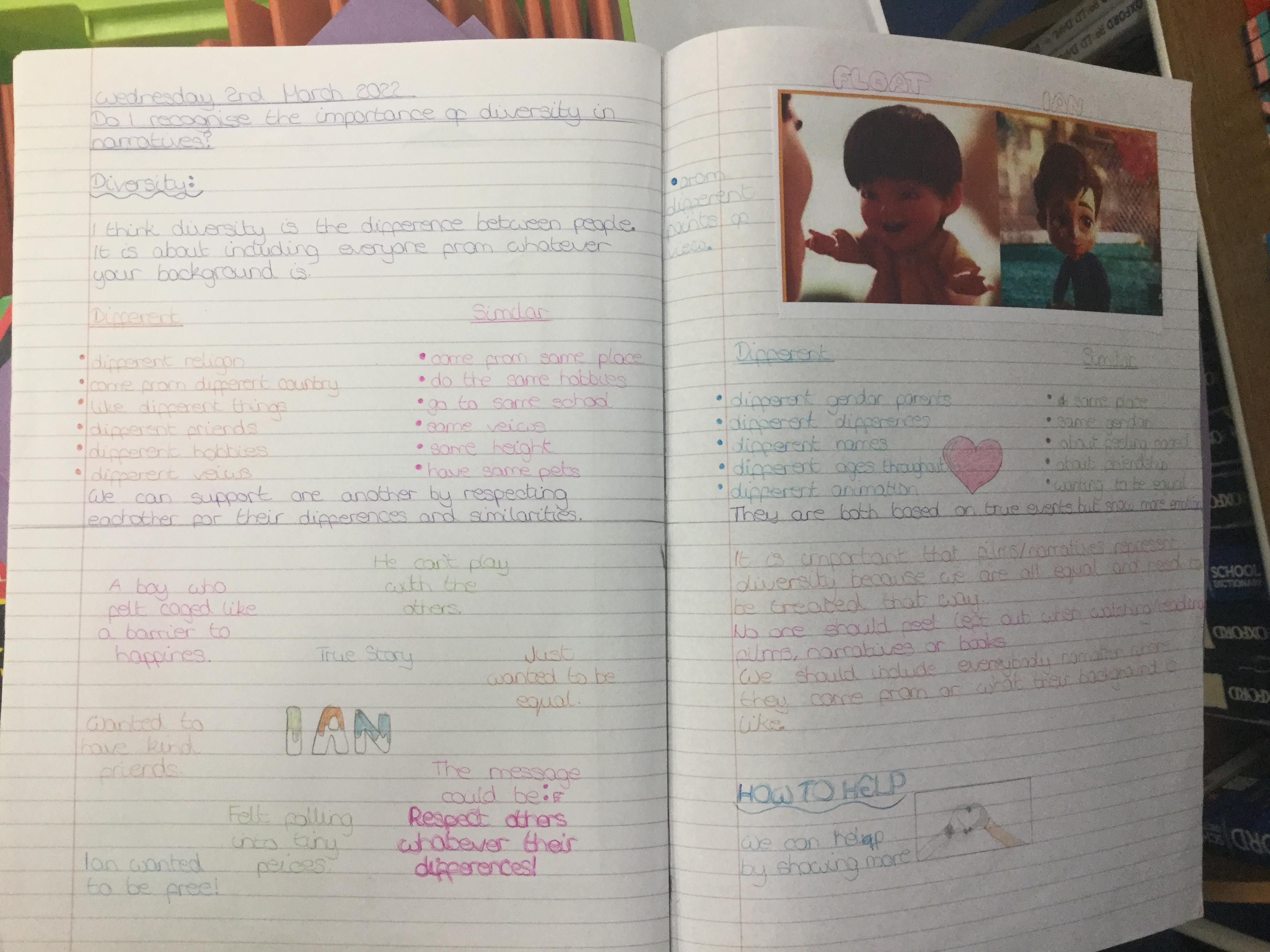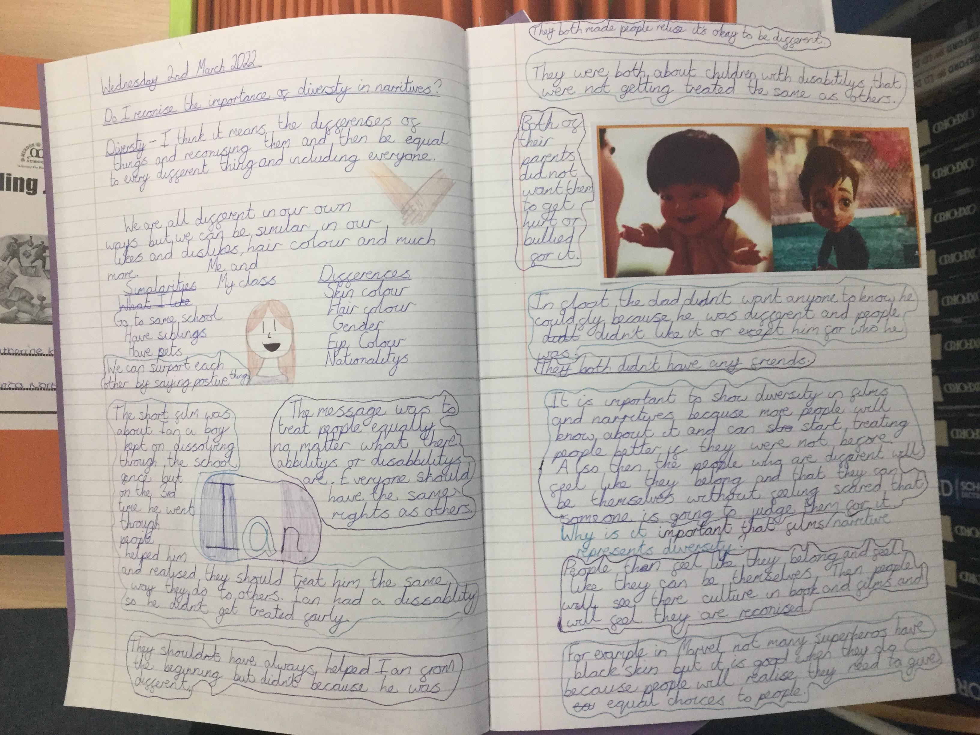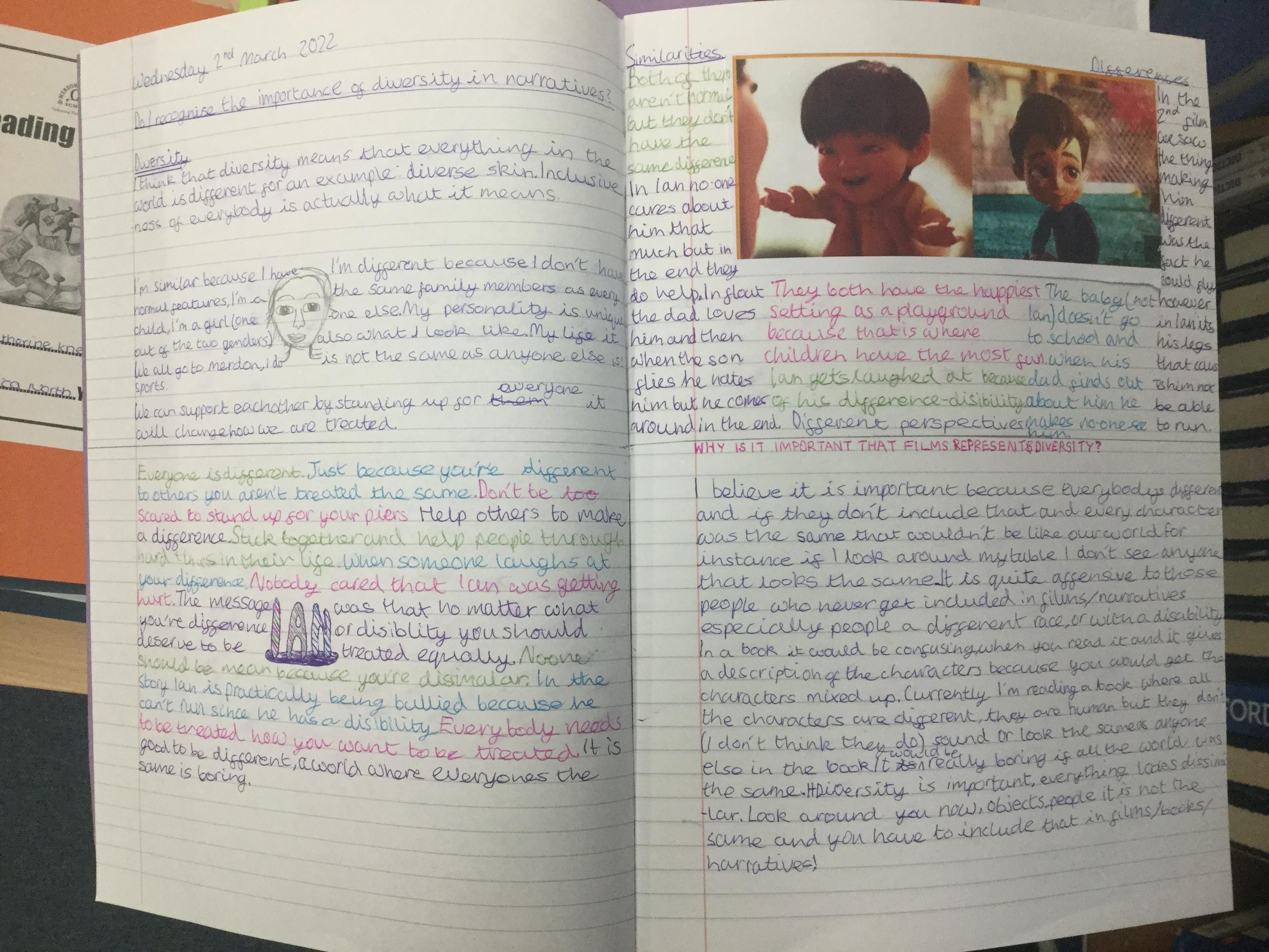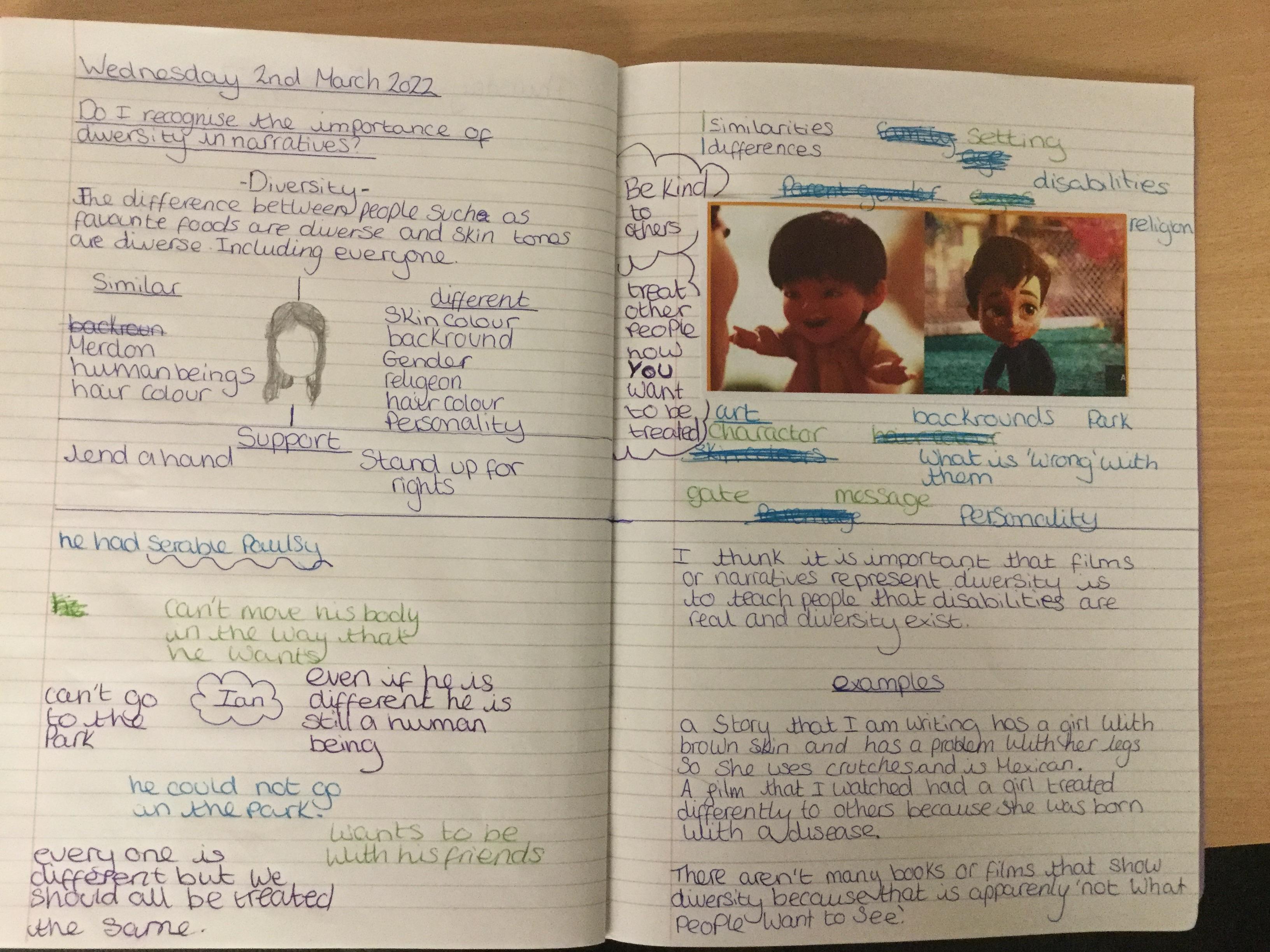During a Let’s Think in English lesson the children watched, analysed and discussed the emotive short film ‘Ian’. They then watched another short film ‘Float’. We thought about what diversity means and how we are similar and different to others around them before unpicking the messages within the films and why diversity and representation is important within narratives.