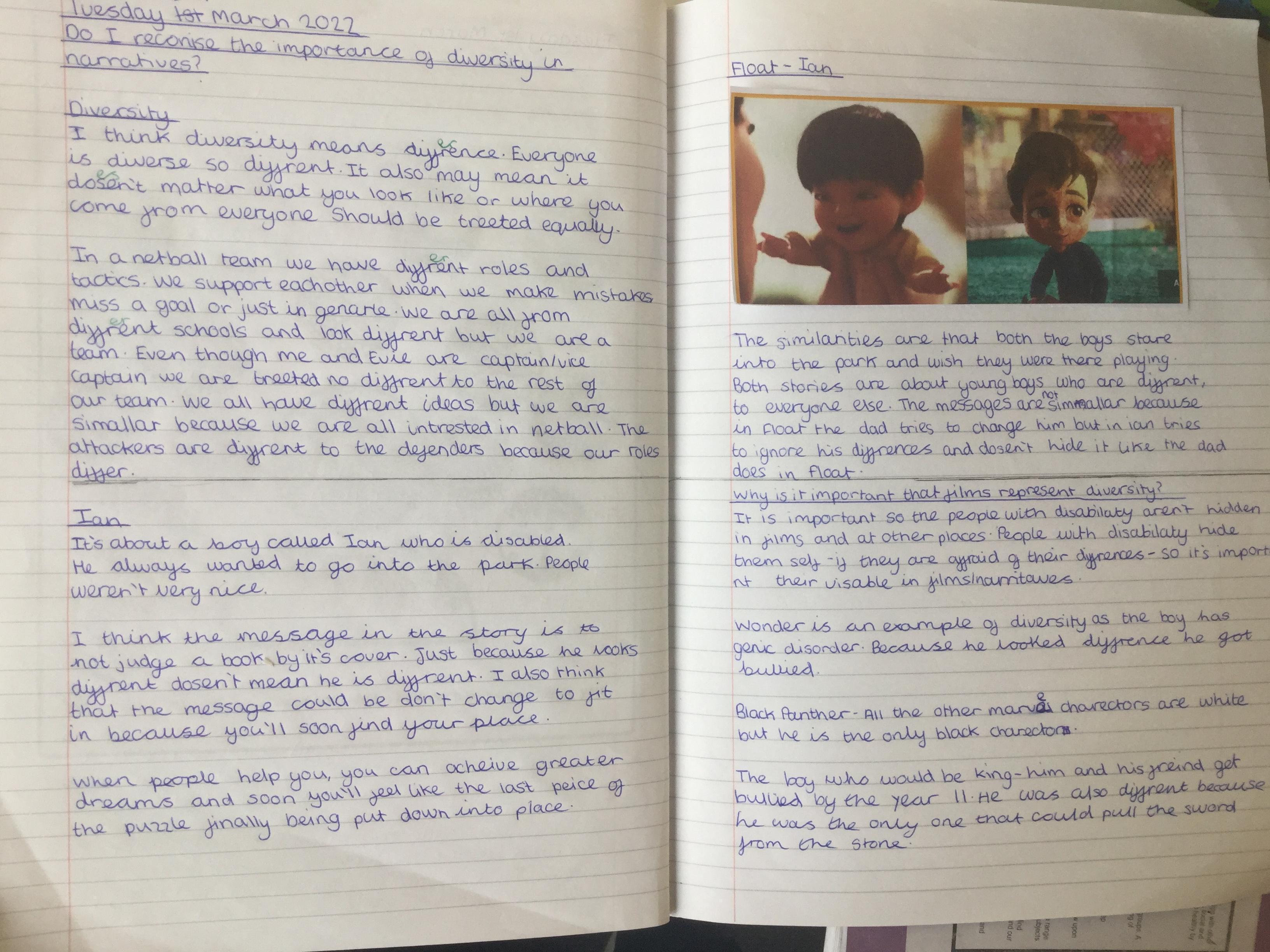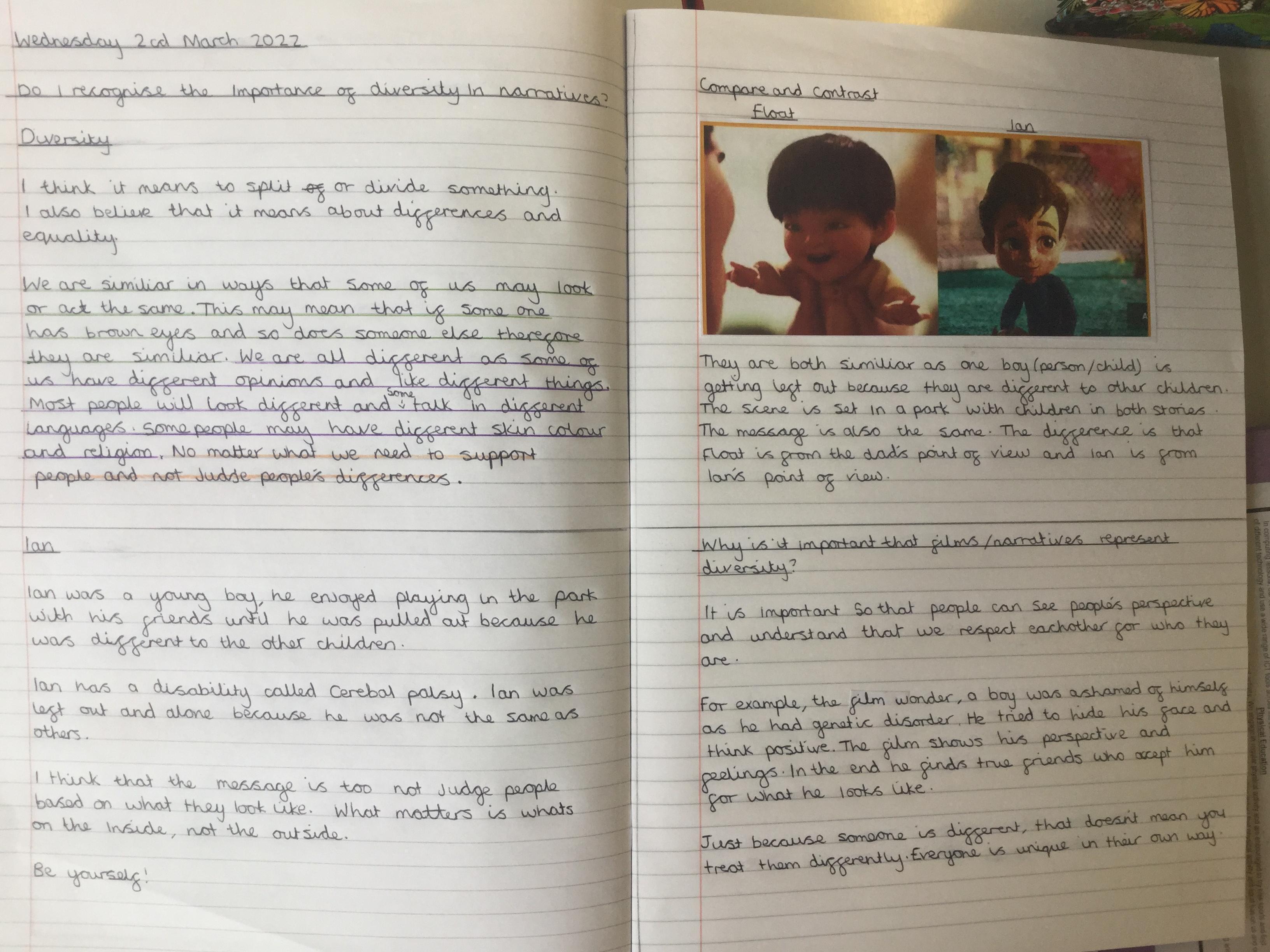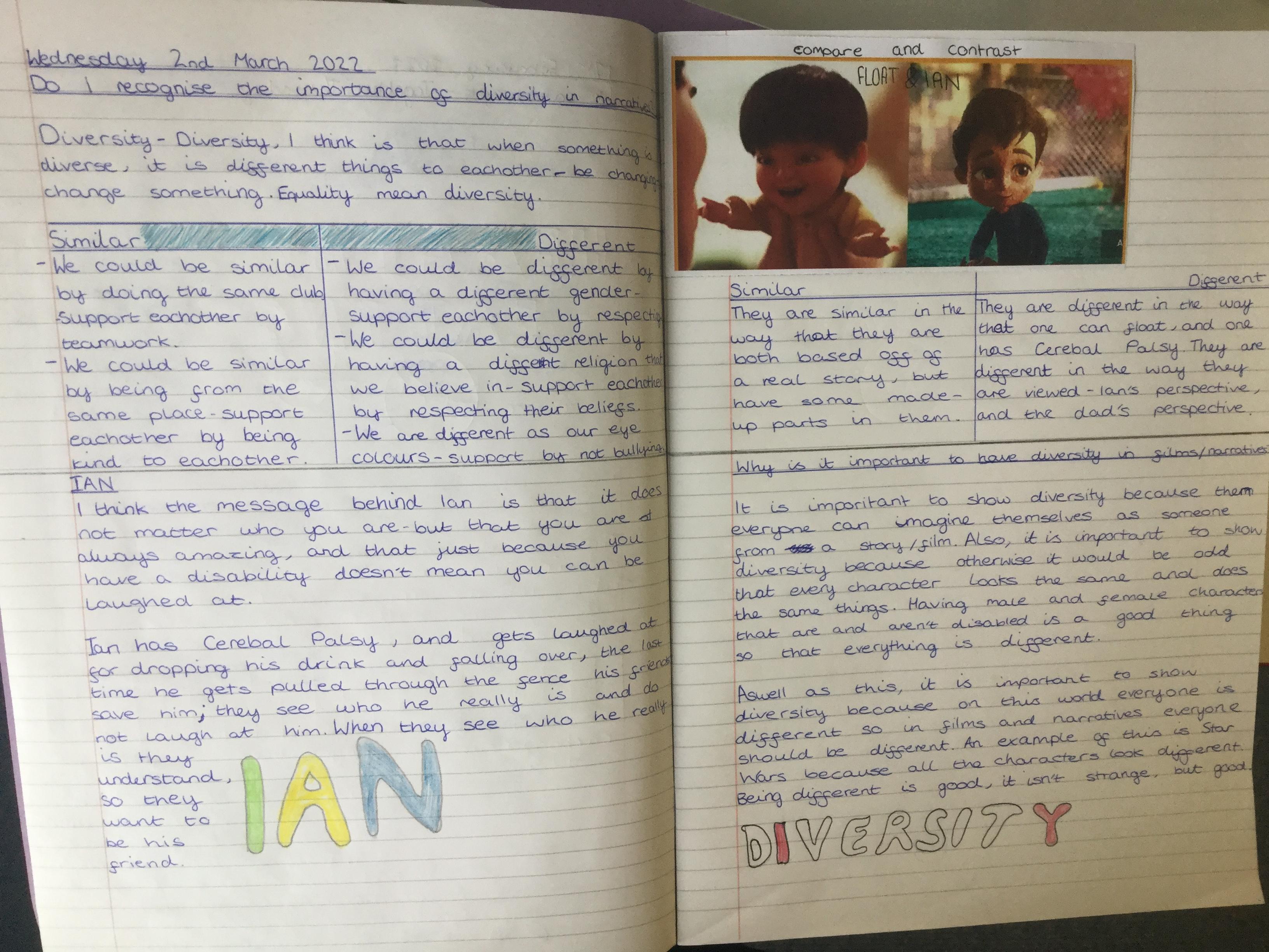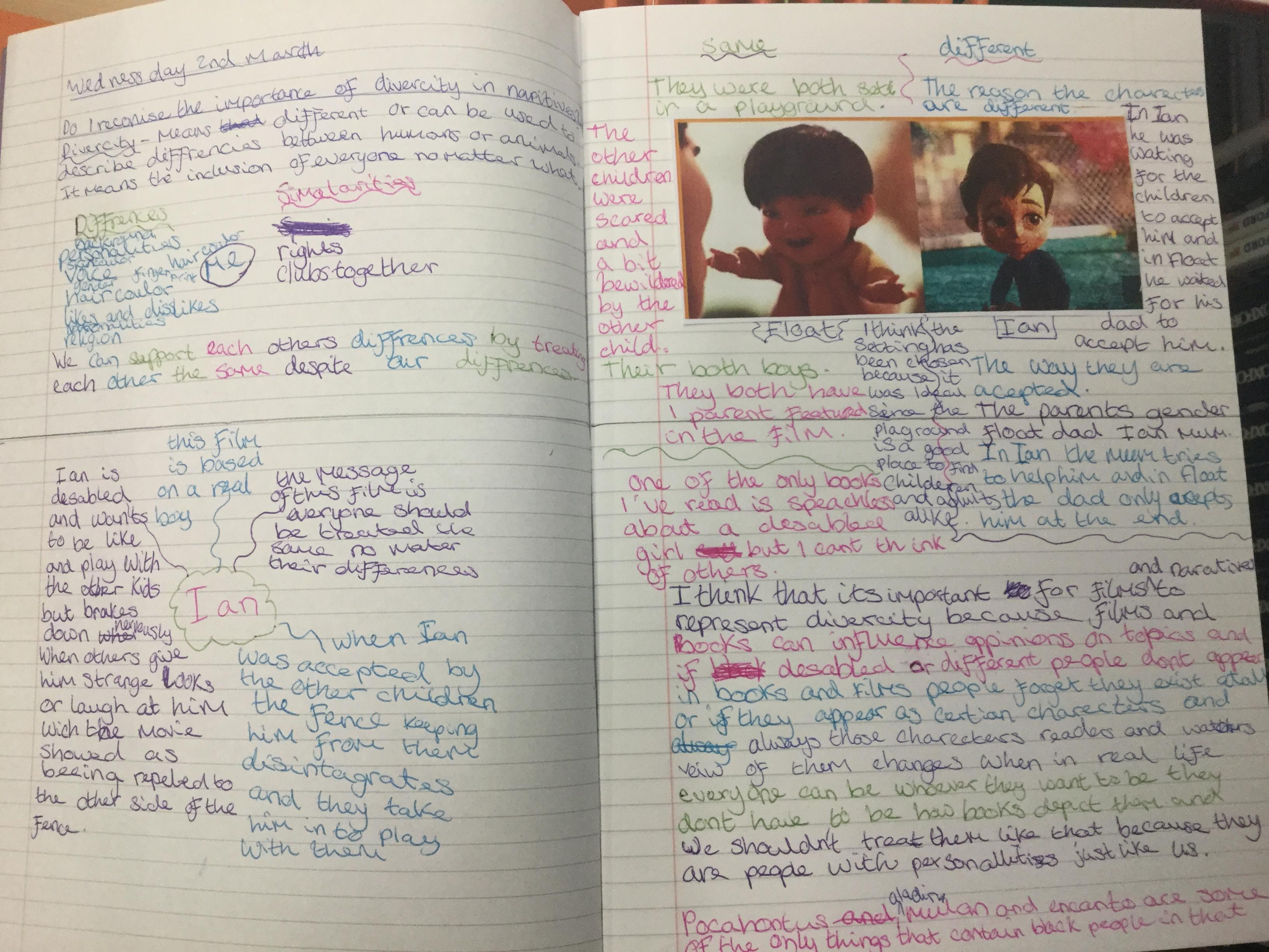 During a Let’s Think in English lesson the children watched, analysed and discussed the emotive short film ‘Ian’. They then watched another short film ‘Float’. We thought about what diversity means and how we are similar and different to others around them before unpicking the messages within the films and why diversity and representation is important within narratives.