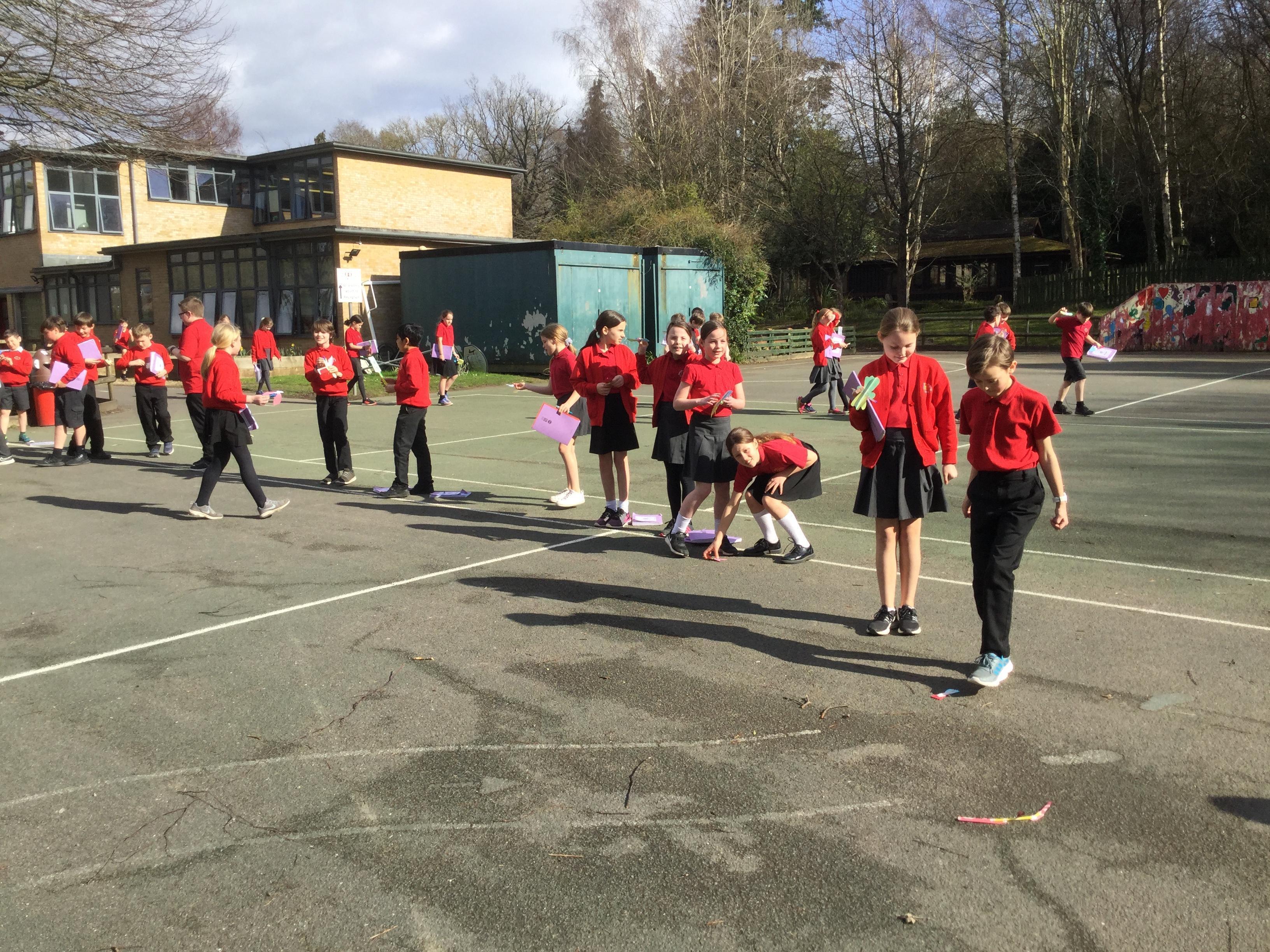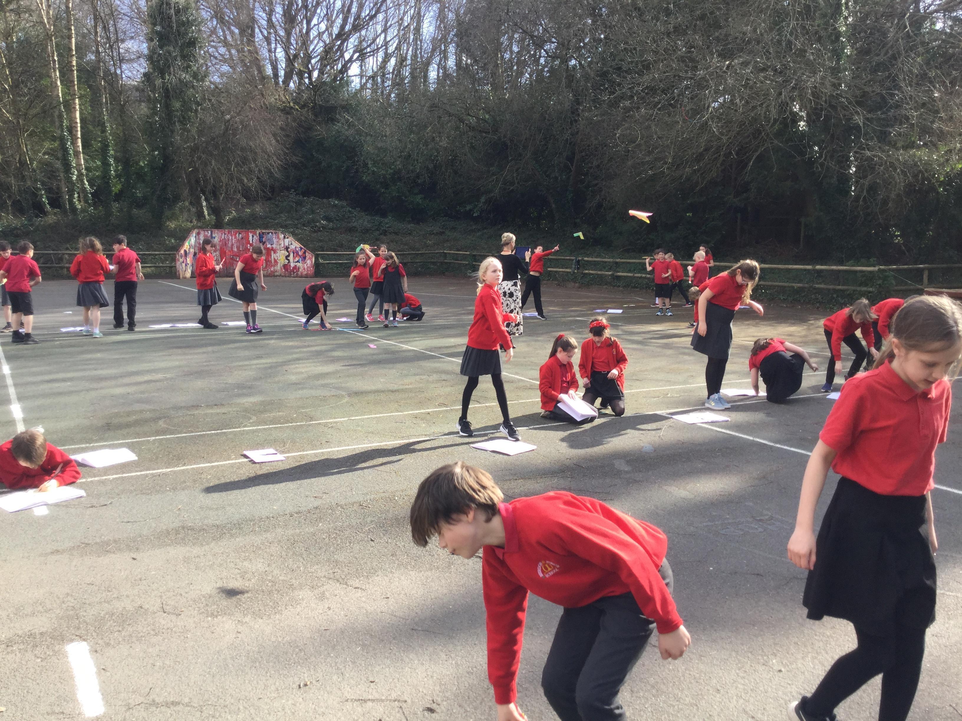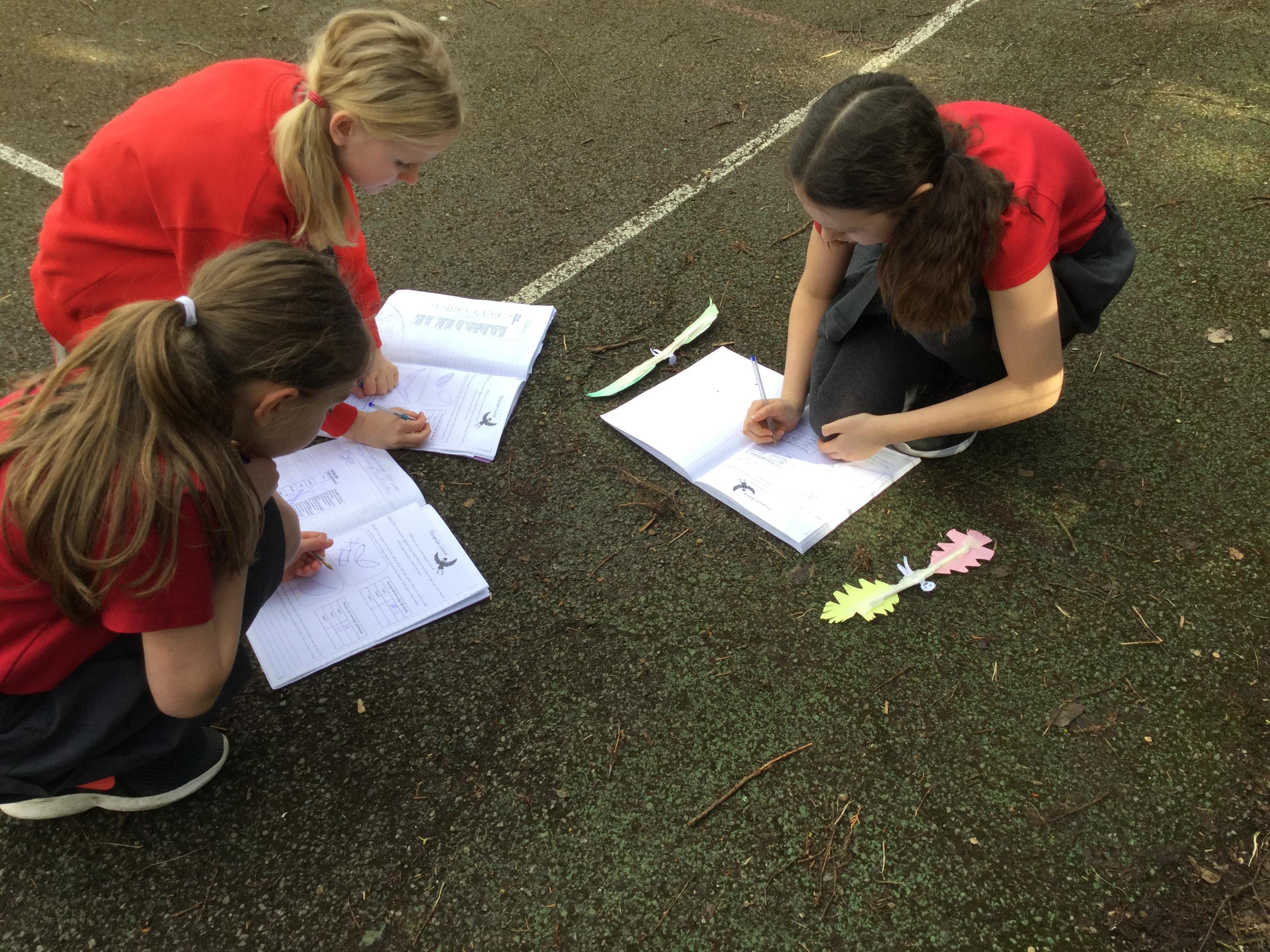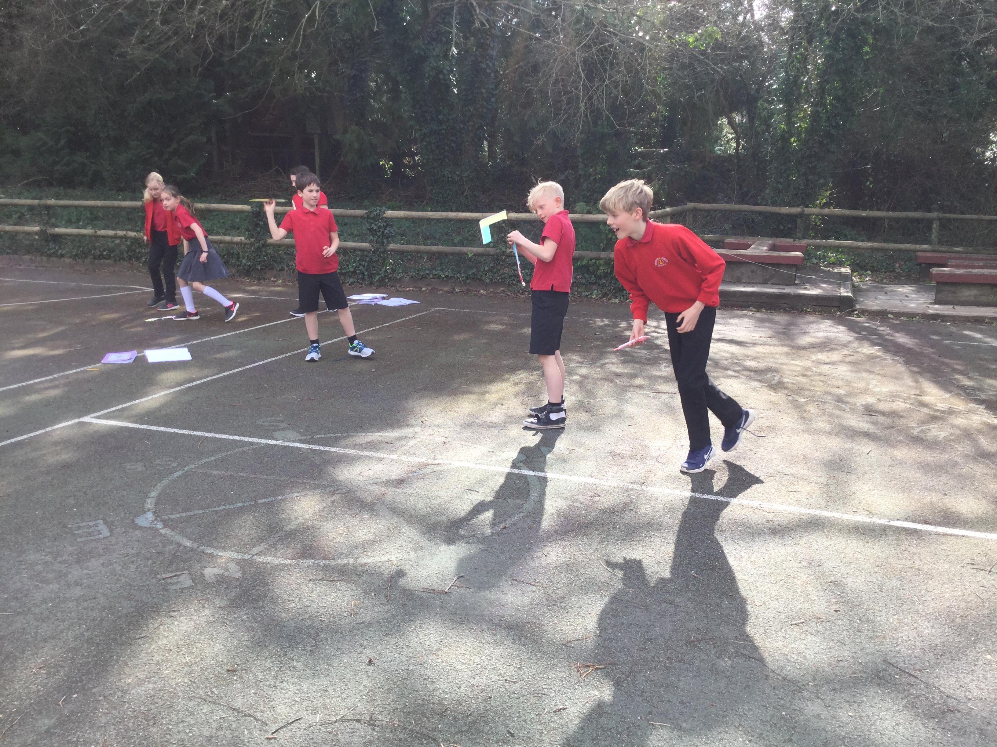 Once we had completed and made our wings, we went outside to test fly them and measure how far they travelled. Here are some photographs of our investigations!