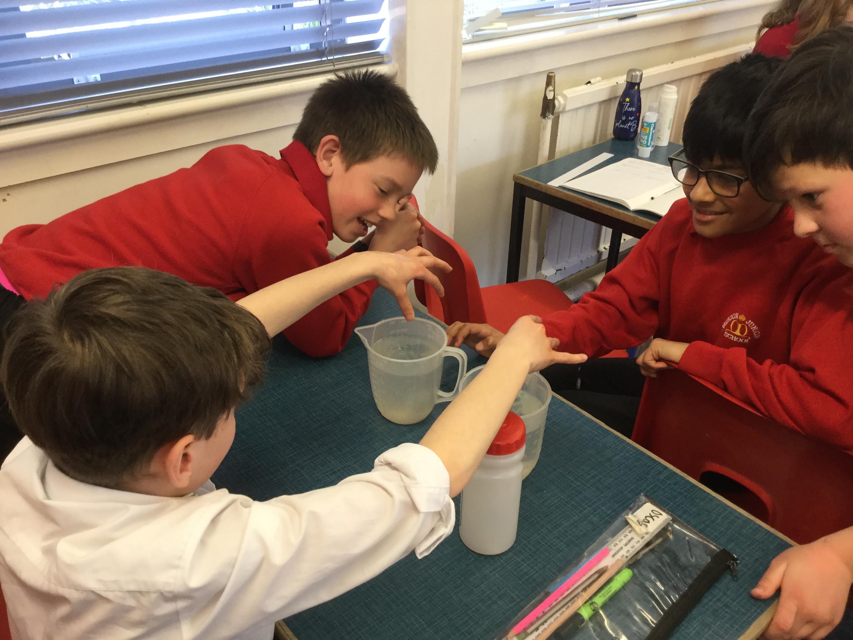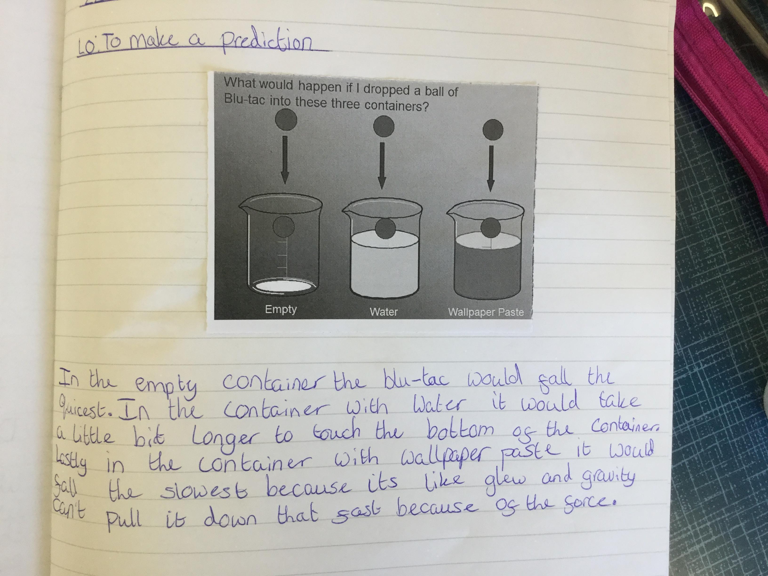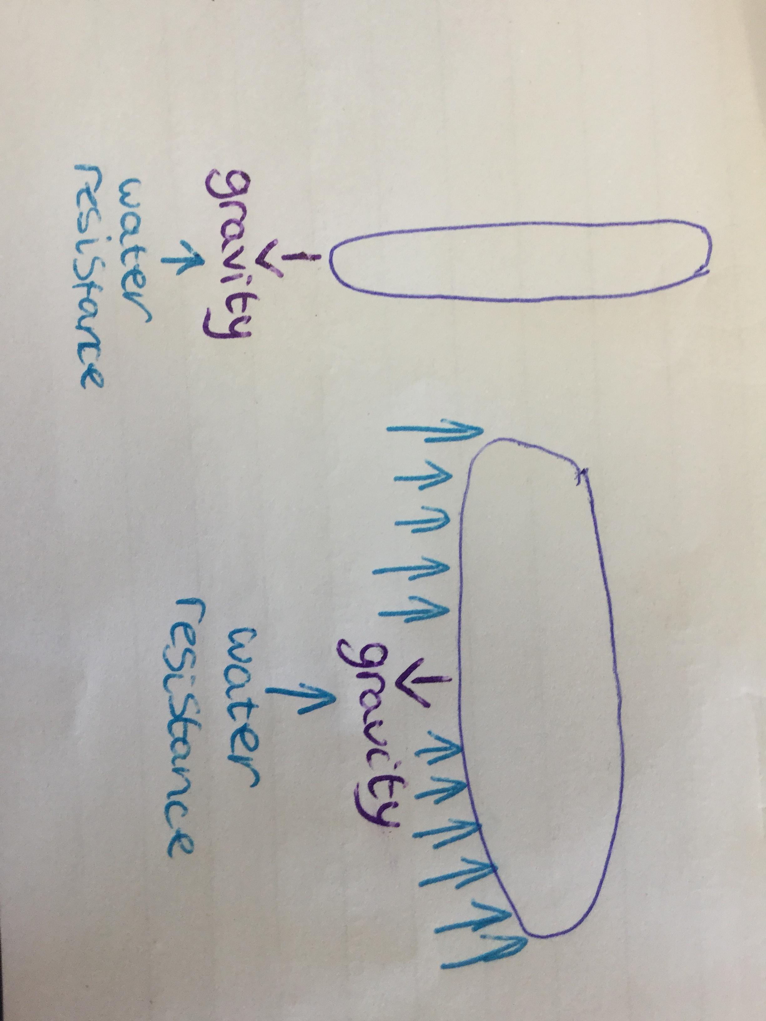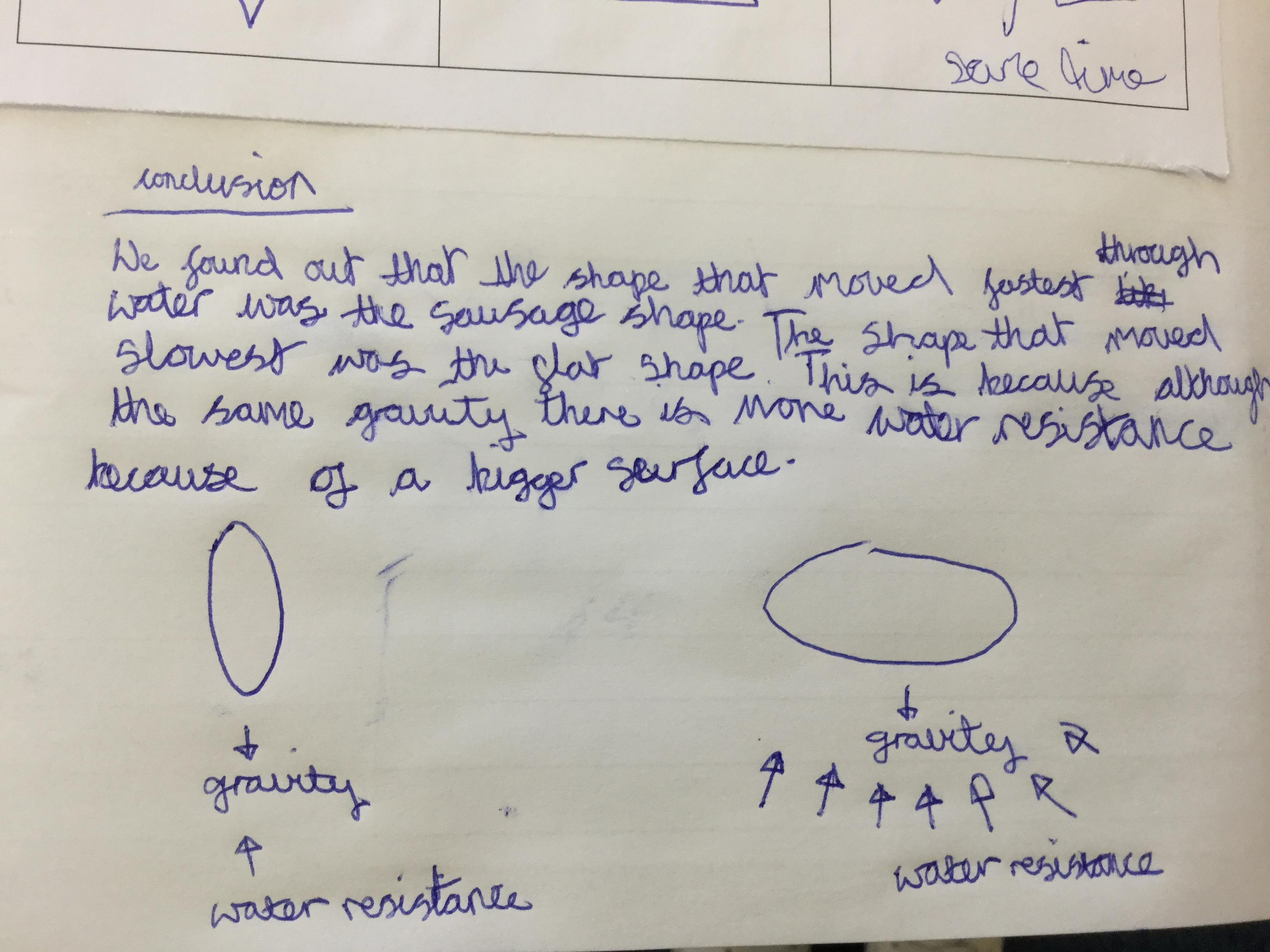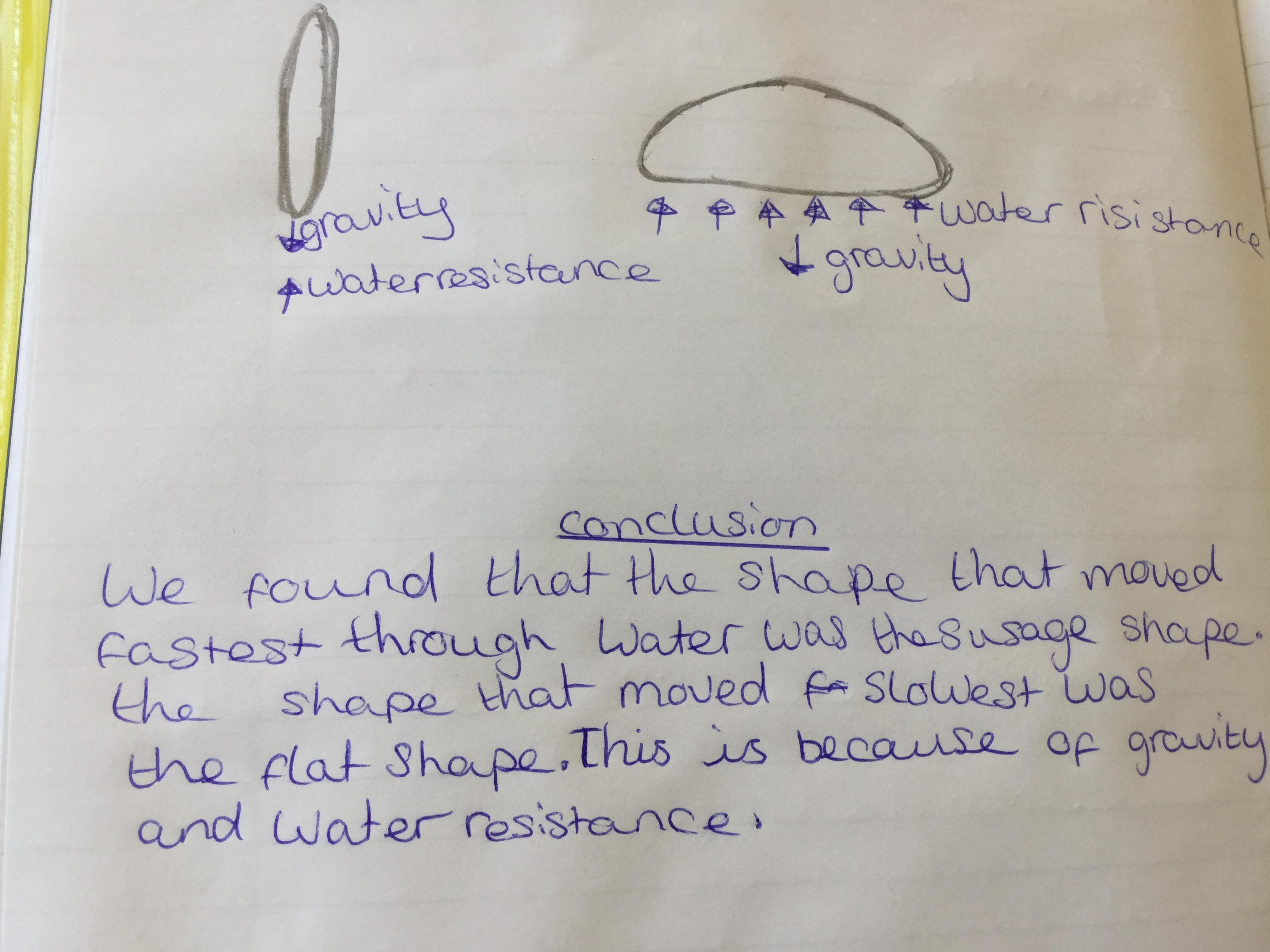 We discussed why it is hard to walk through water!why fish are the shape they are, why boats are the shape they are and decided there is a force In water that pushes against you. We call this water resistance. We then planned and carried out a science investigation to investigate whether the shape of a blob of brutal affects the speed it travels through water. Using our results, we made conclusions.