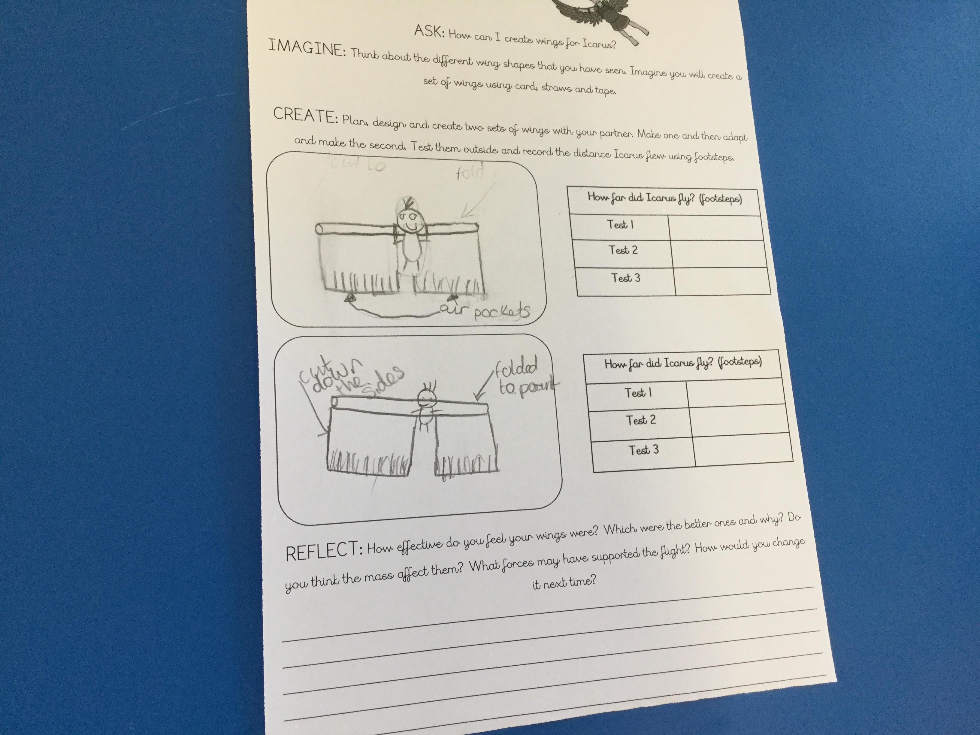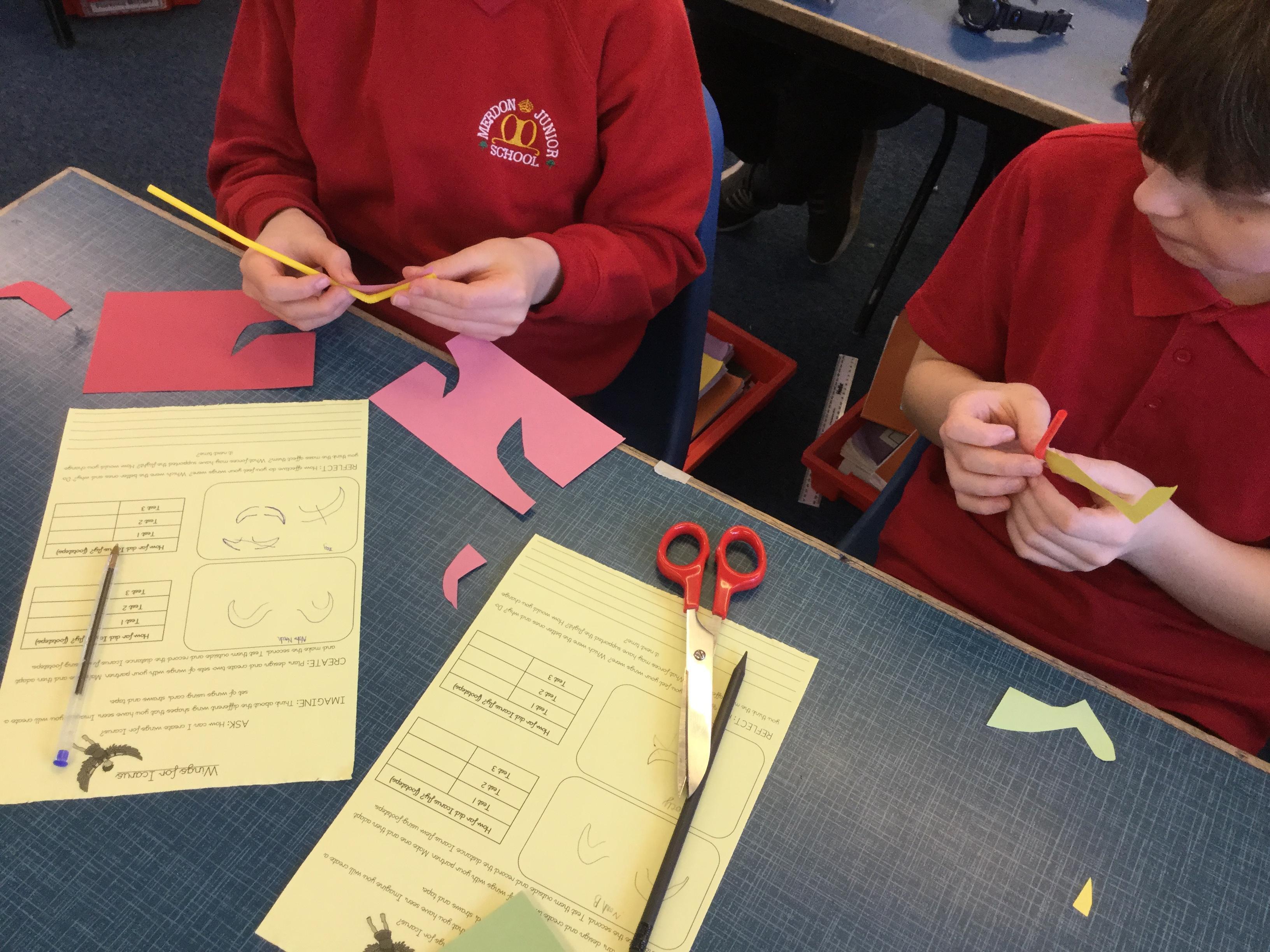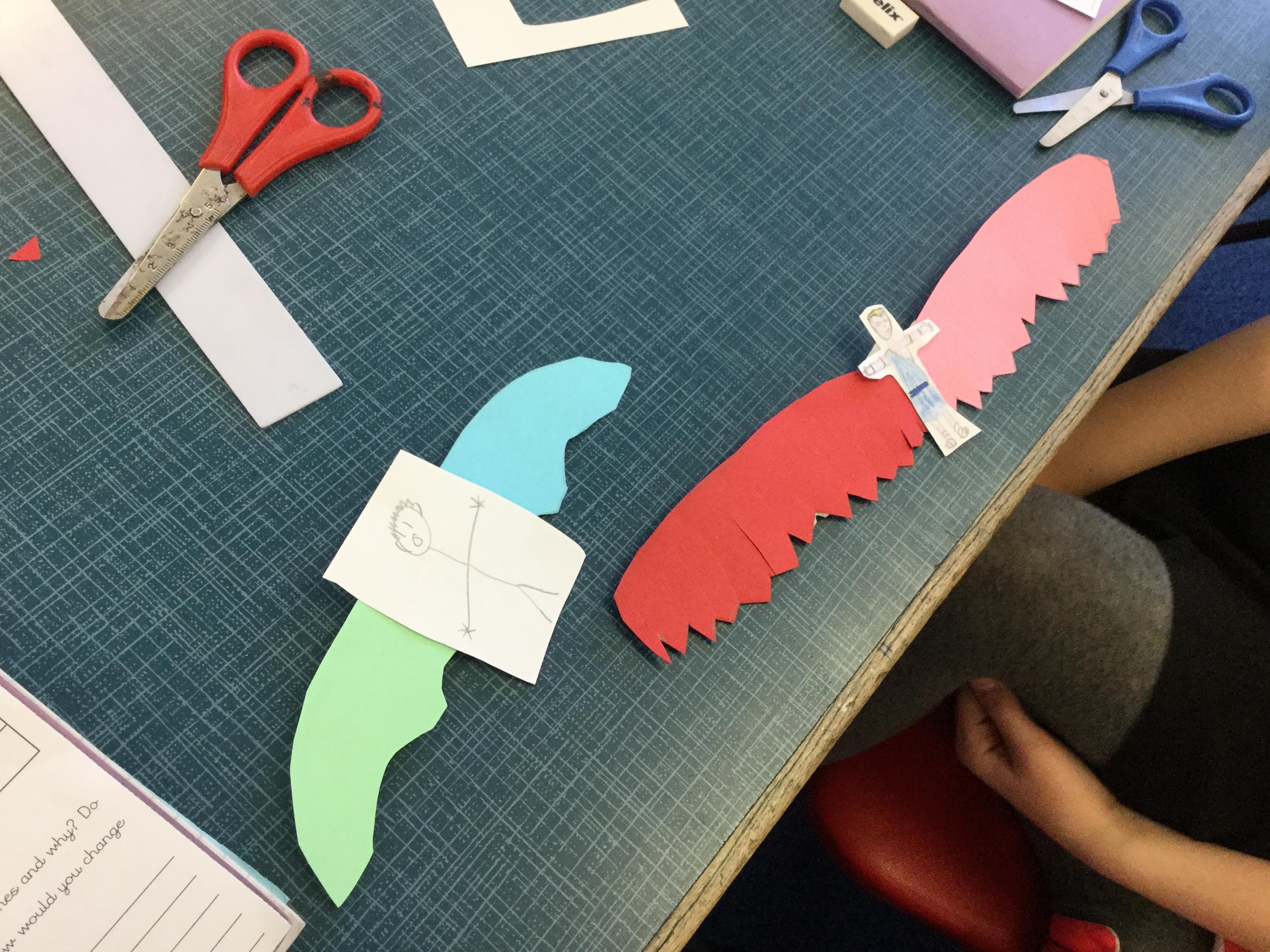 In English today, we read the story of Daedalus and Icarus. Icarus went too close the sun and the wax on his wings melted, resulting in him falling to his death.In pairs, we made pairs of wings using a limited set of resources. We investigated different shapes and designs.