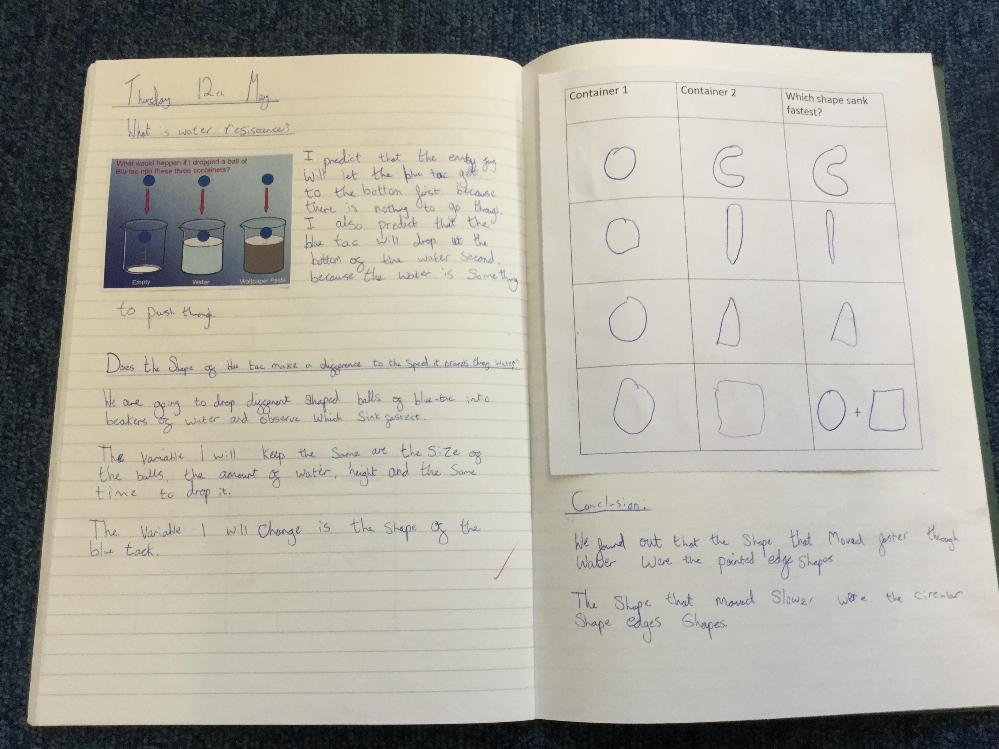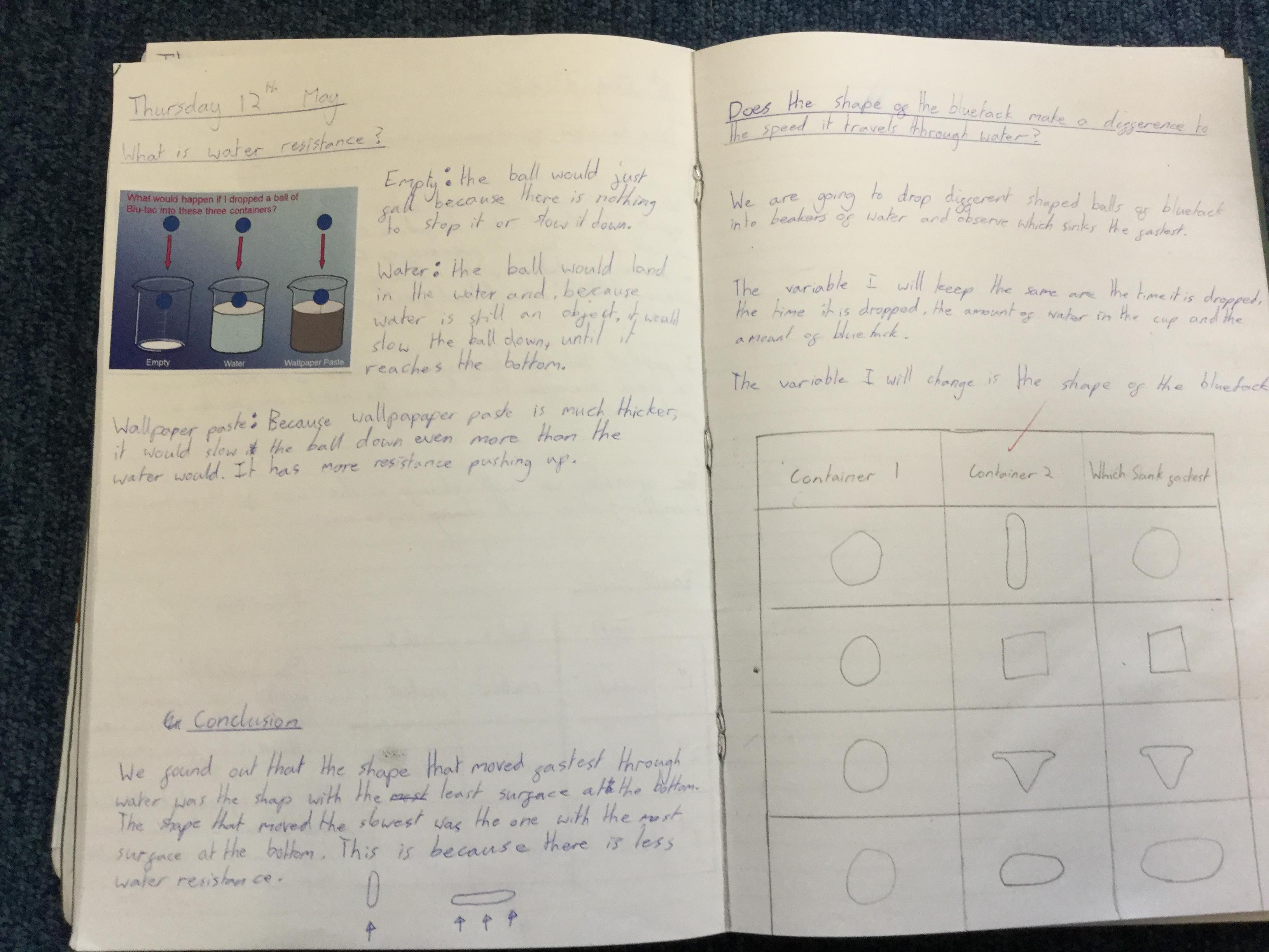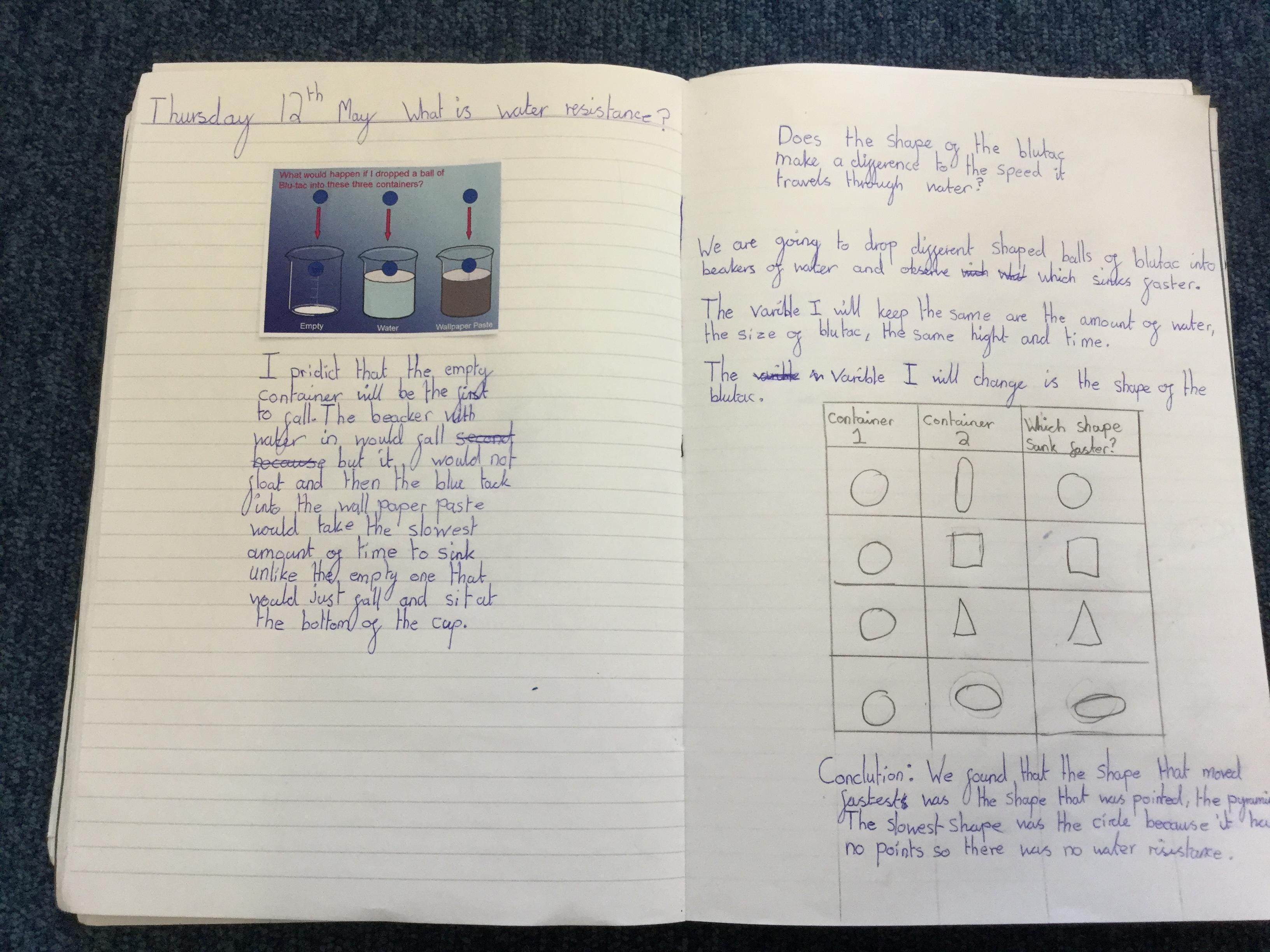 Today we investigated water resistance by dropping different shaped balls of blu tac into water to see what happens. We had to consider how to make a fair test by considering what variables we would keep the same and what we would change. We recorded our results and the drew our conclusions.