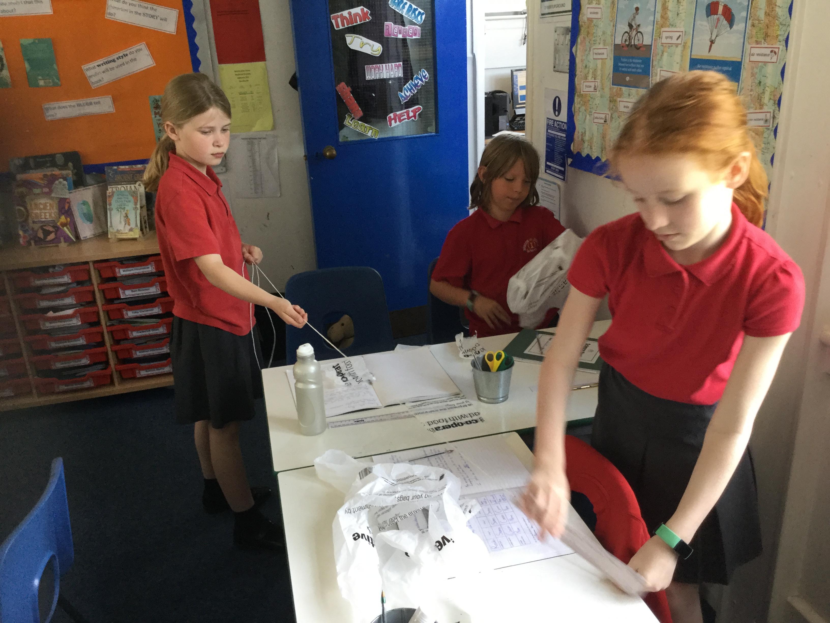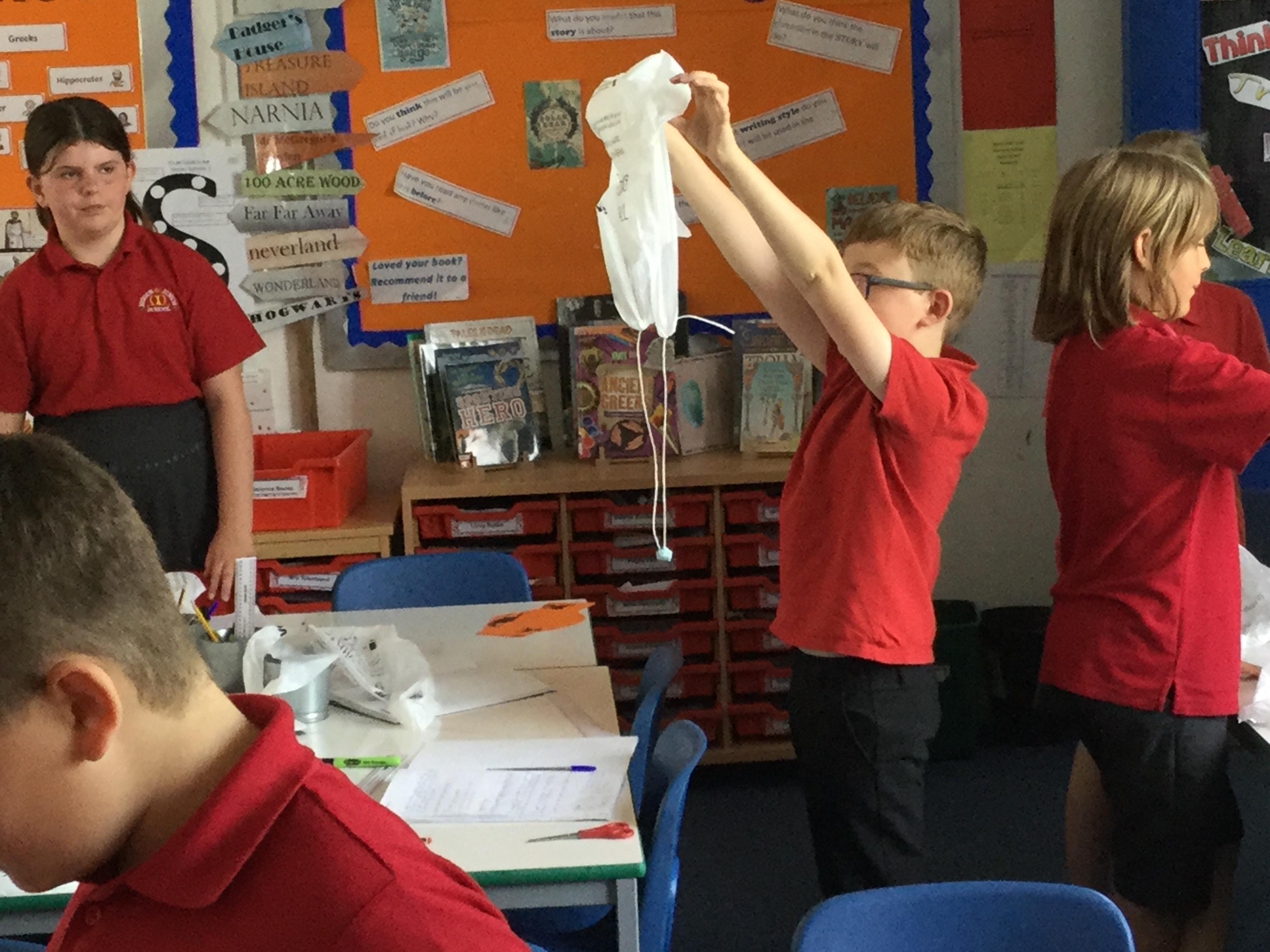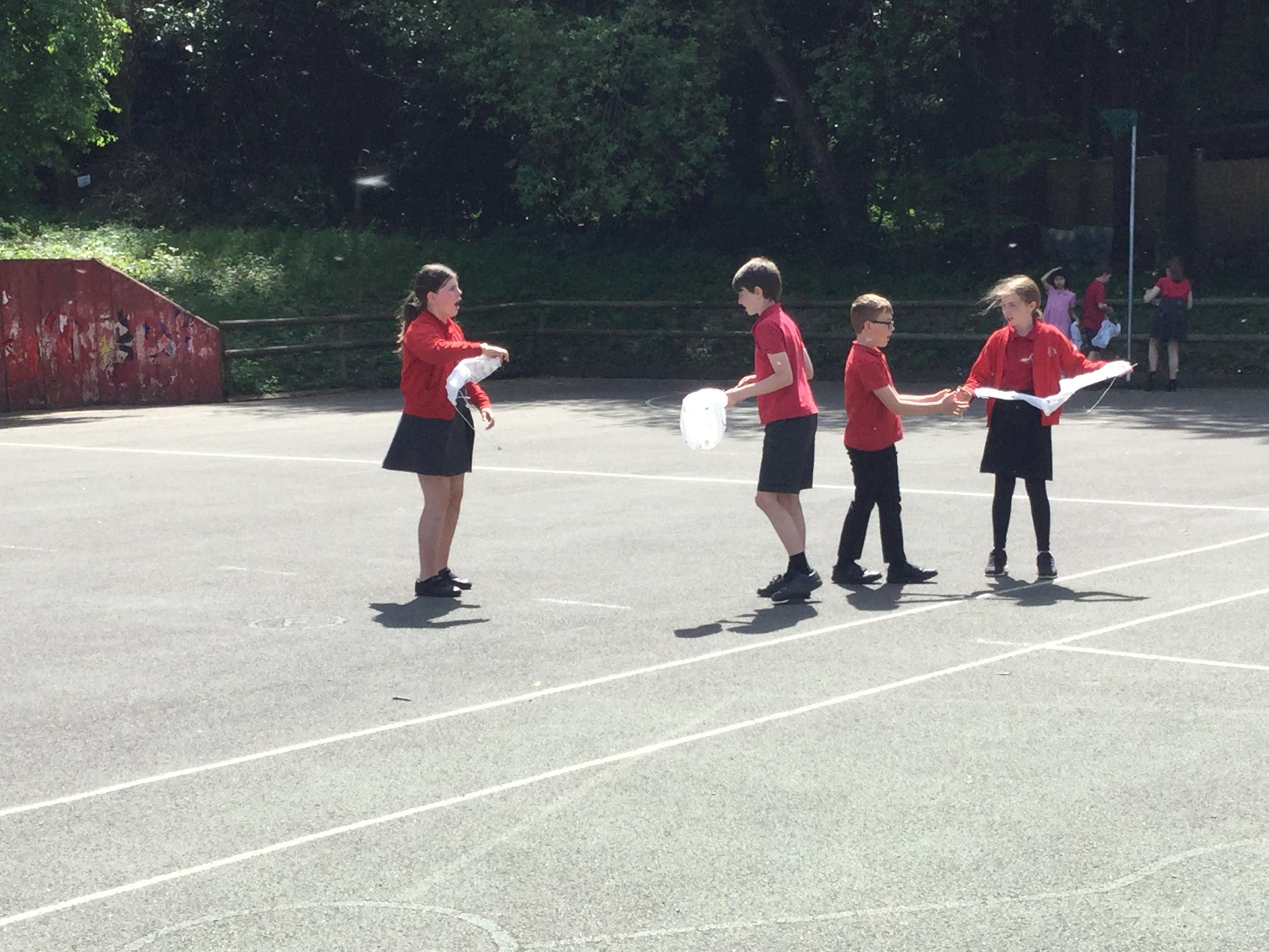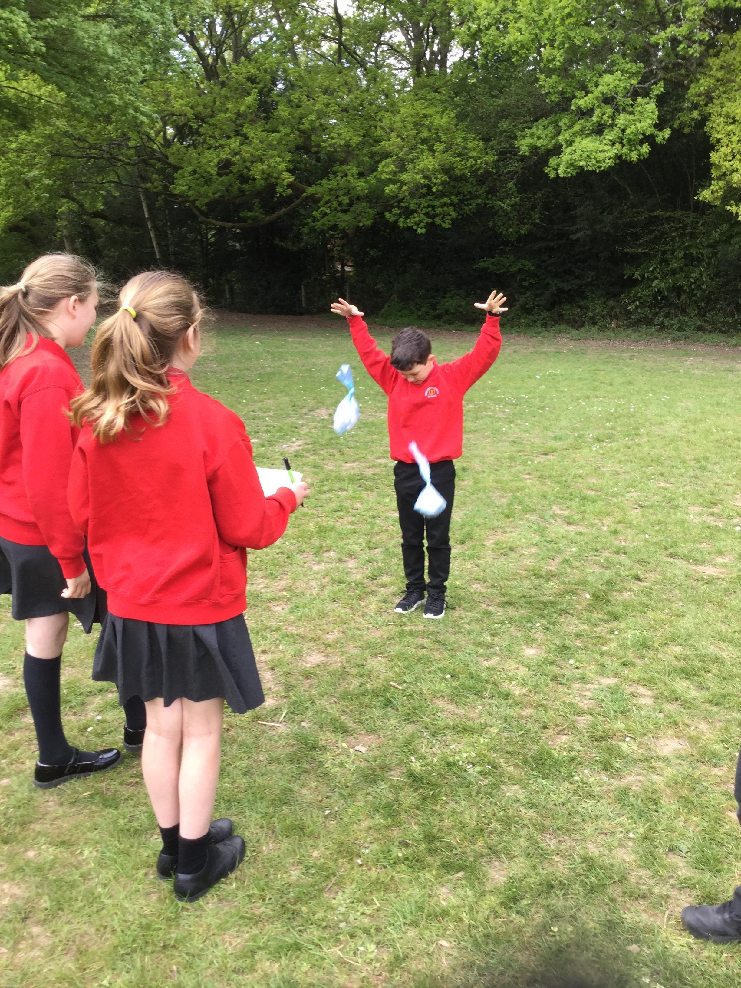 Today we explored air resistance and how it can slow moving objects.  We investigated whether the size of a parachute would make a difference to the amount of time it stayed in the air.  Plastic bags were used to make three different sized parachutes then we headed outside to observe what happened when they were dropped!