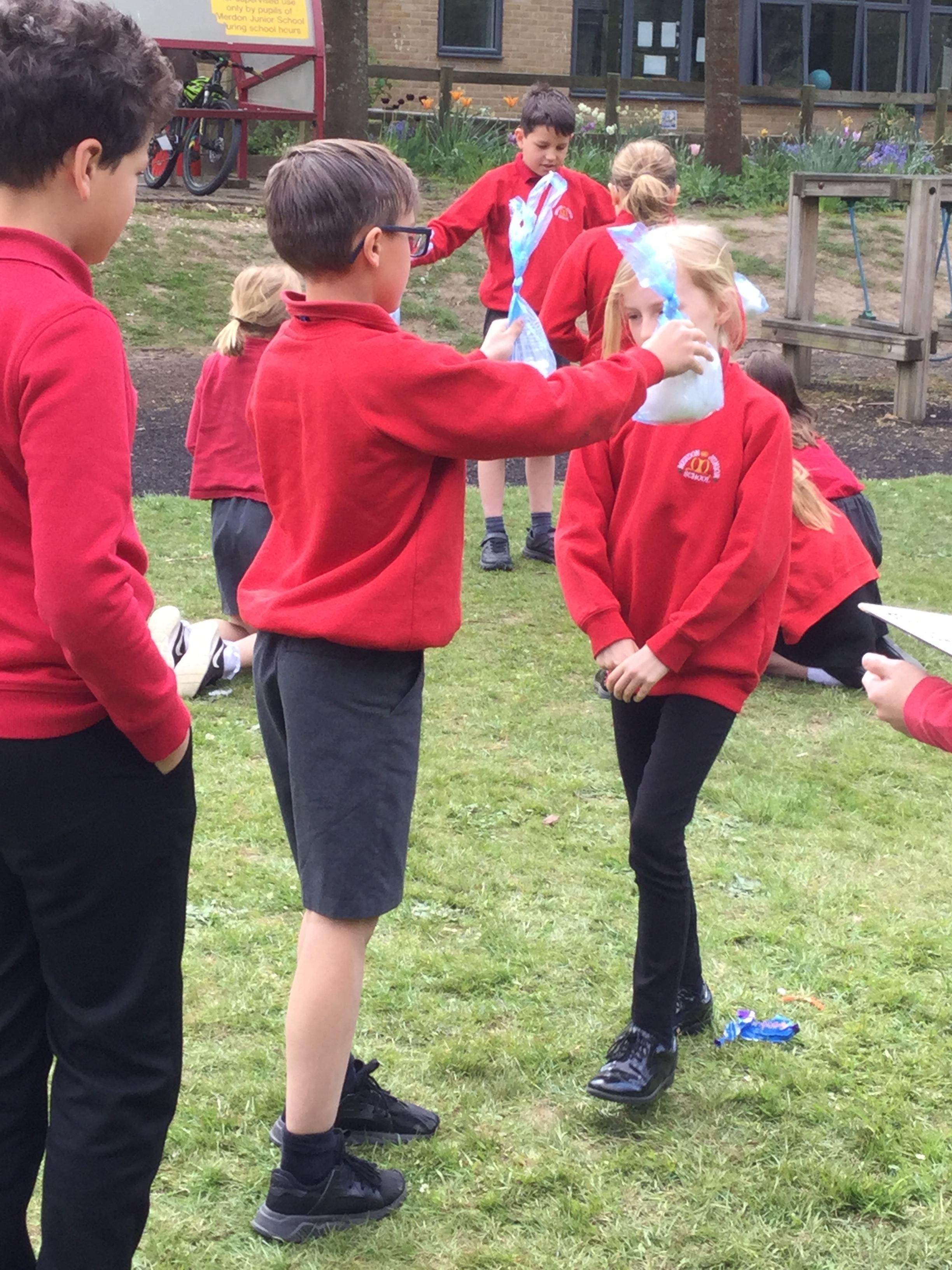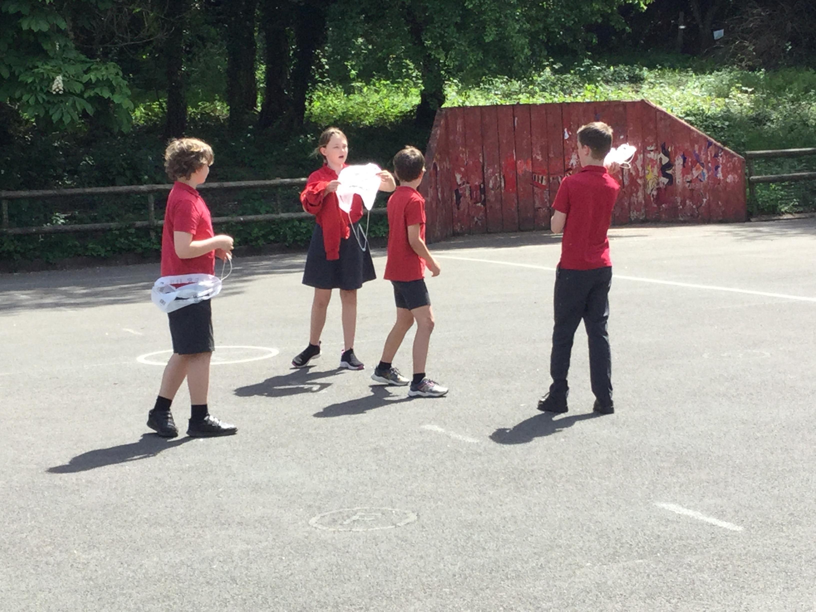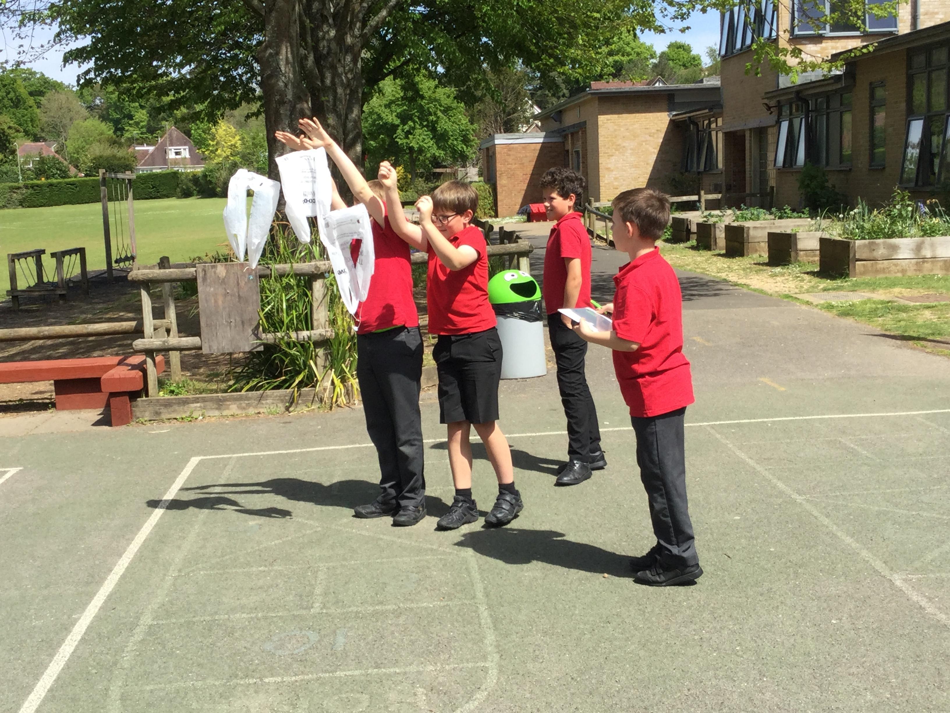 Today we explored air resistance and how it can slow moving objects.  We investigated whether the size of a parachute would make a difference to the amount of time it stayed in the air.  Plastic bags were used to make three different sized parachutes then we headed outside to observe what happened when they were dropped!