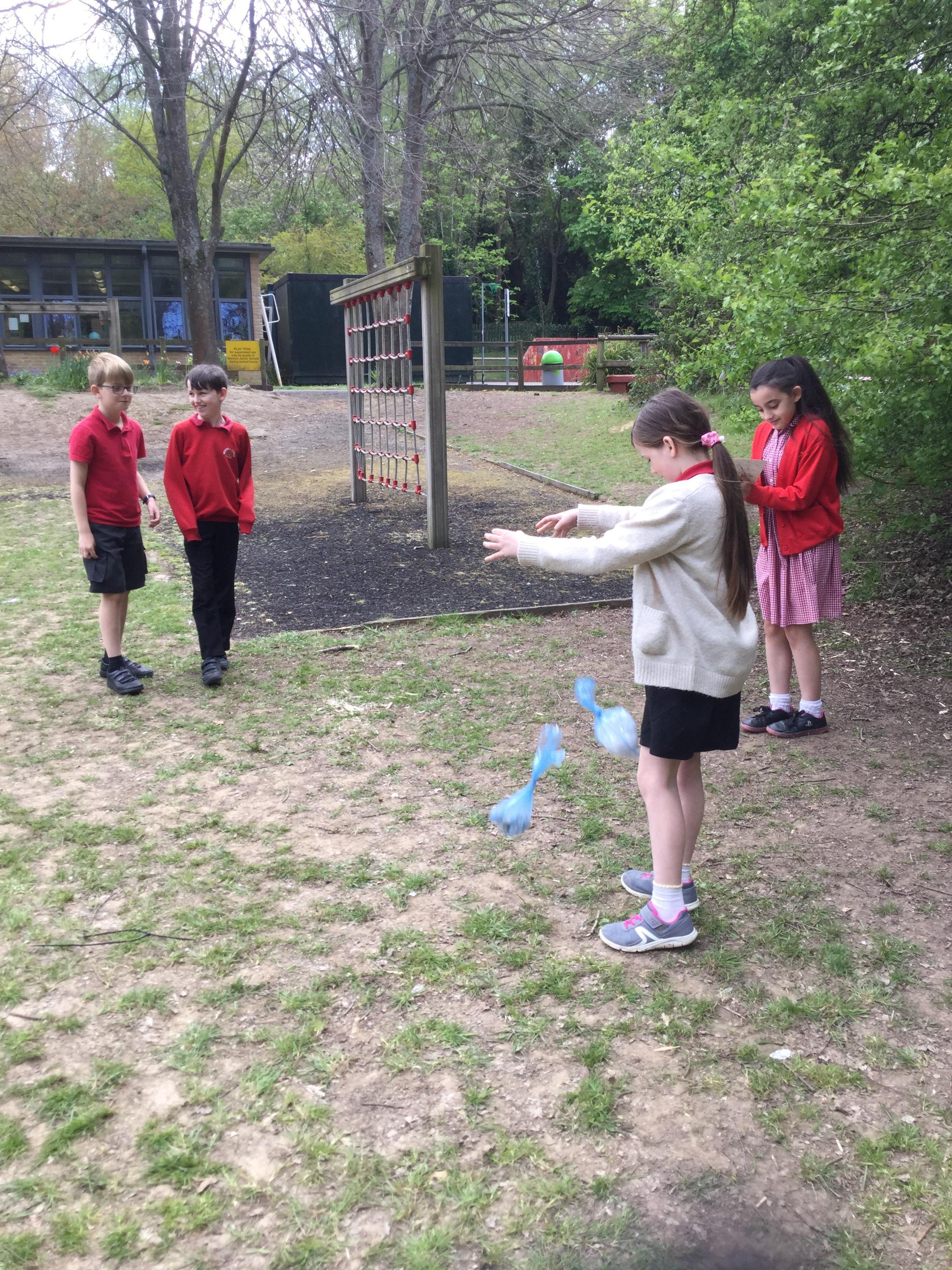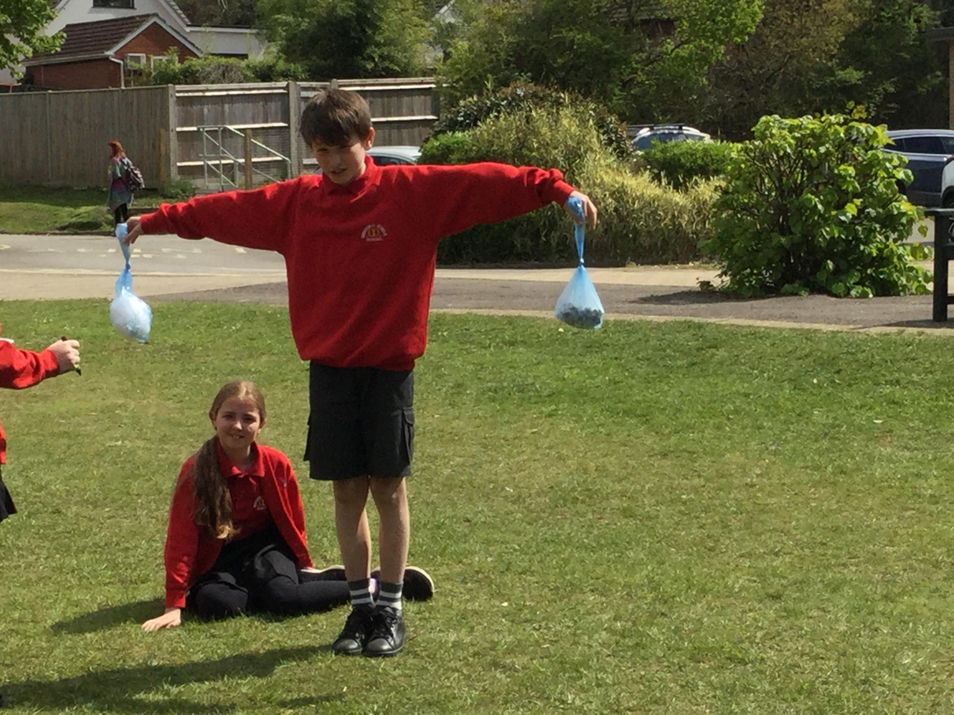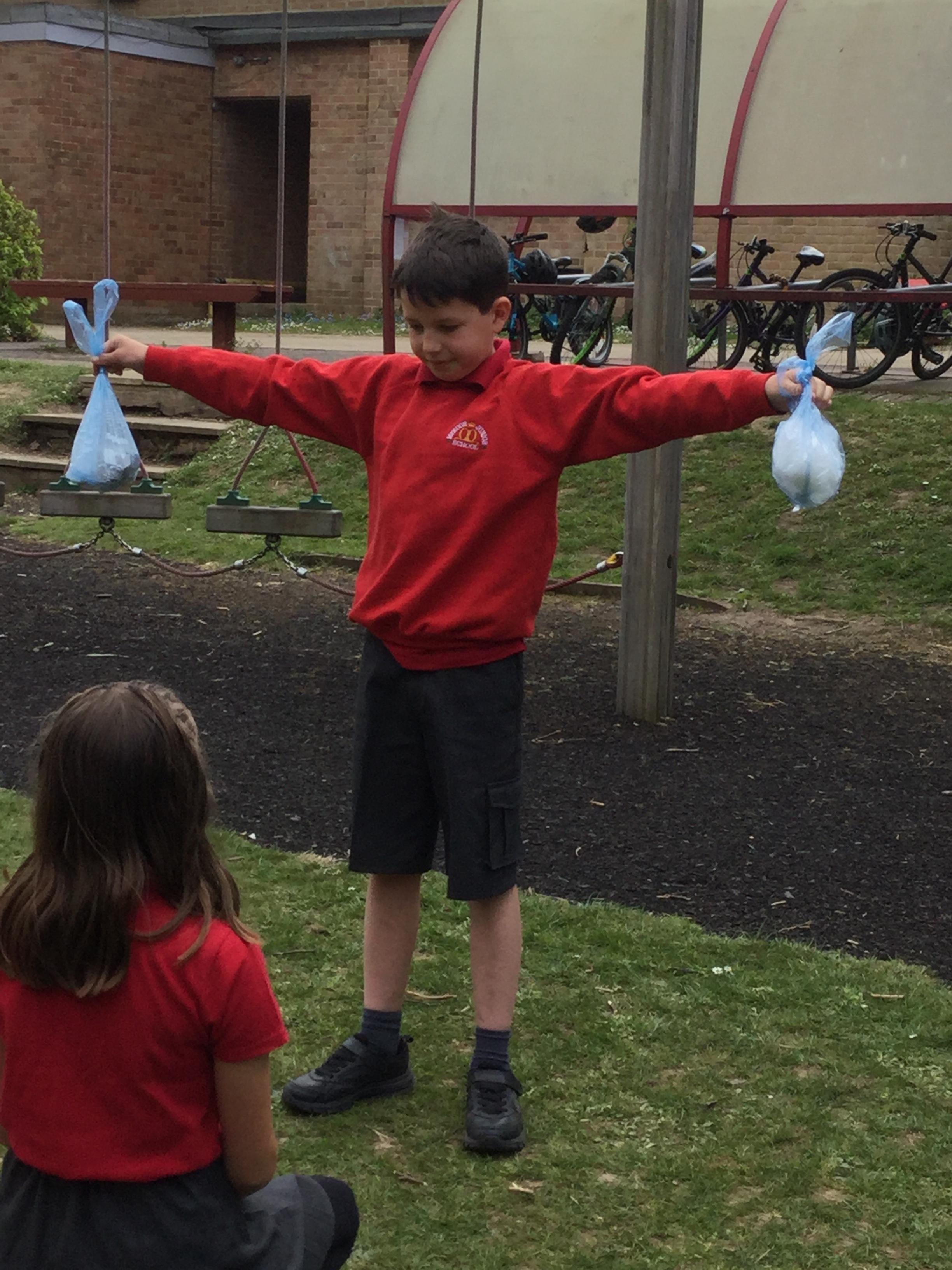Using bags of stones and bags of cotton wool, the children carried out a fair test to see if they could answer the question.  Our results were mixed!  We discovered that gravity has the same pull toward the centre of the earth regardless of weight, however in some of our investigations the stones hit the ground first.  We concluded that our results were changed by the wind, which we could not control.