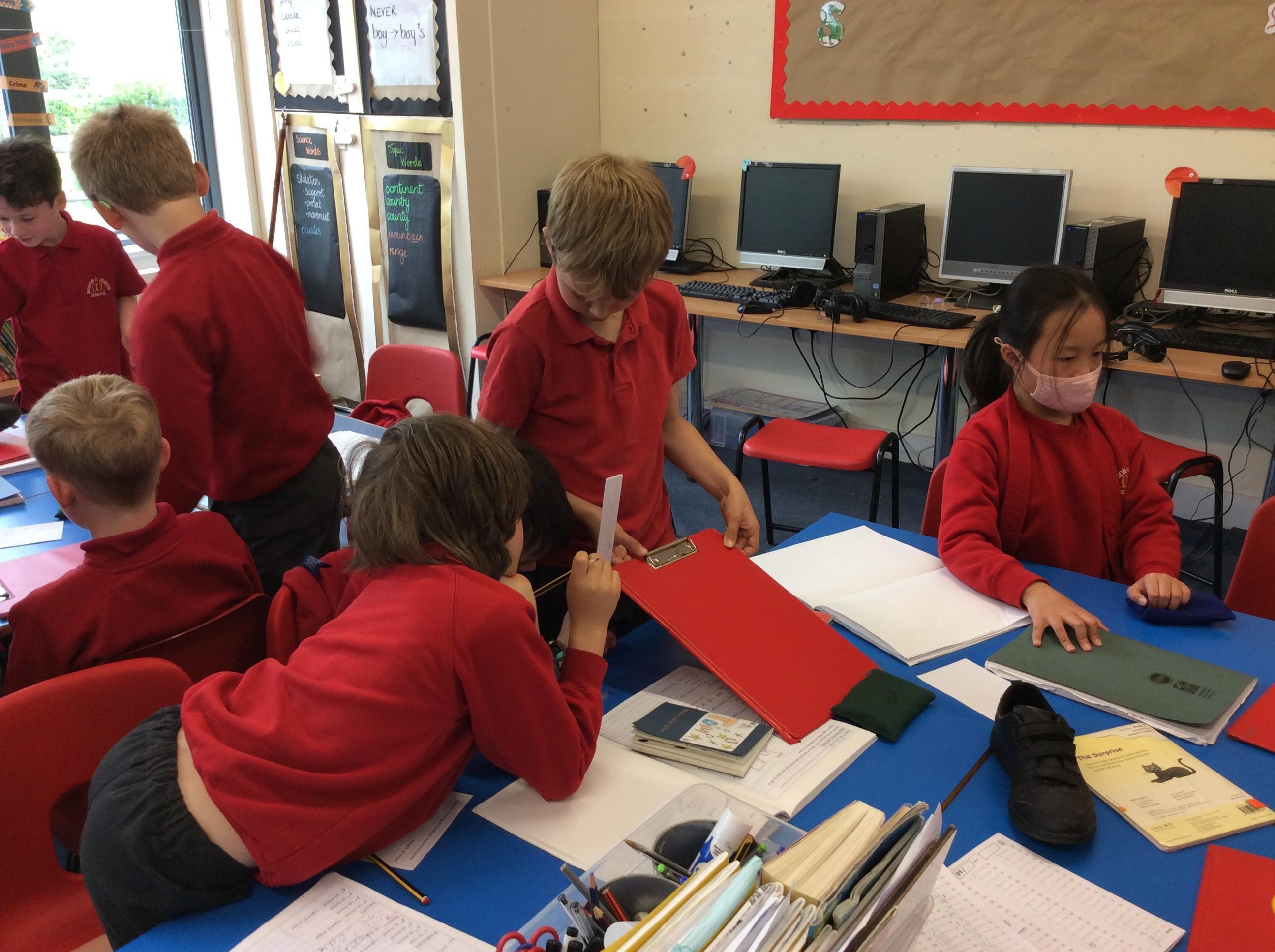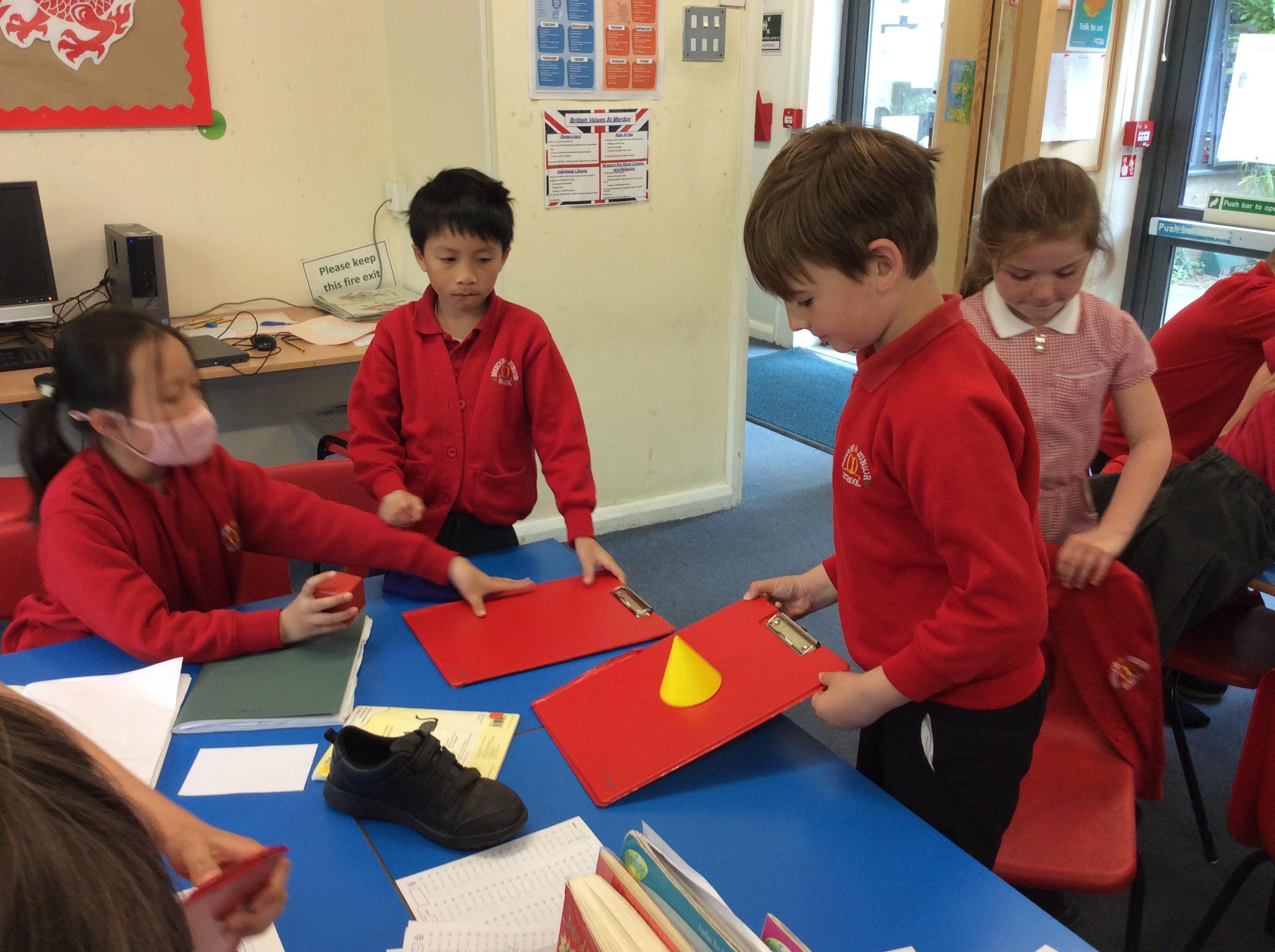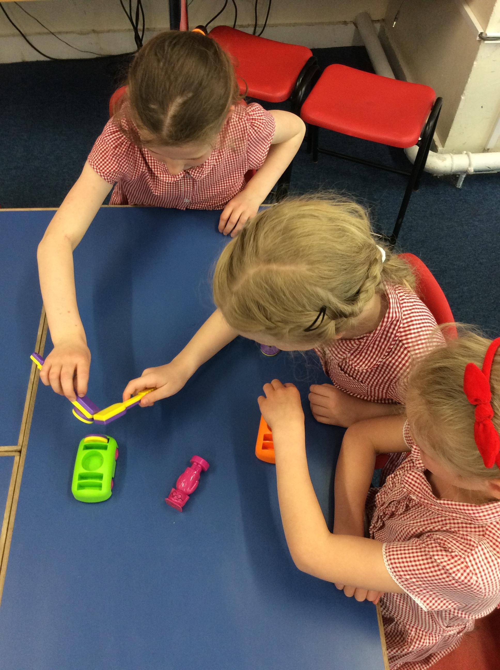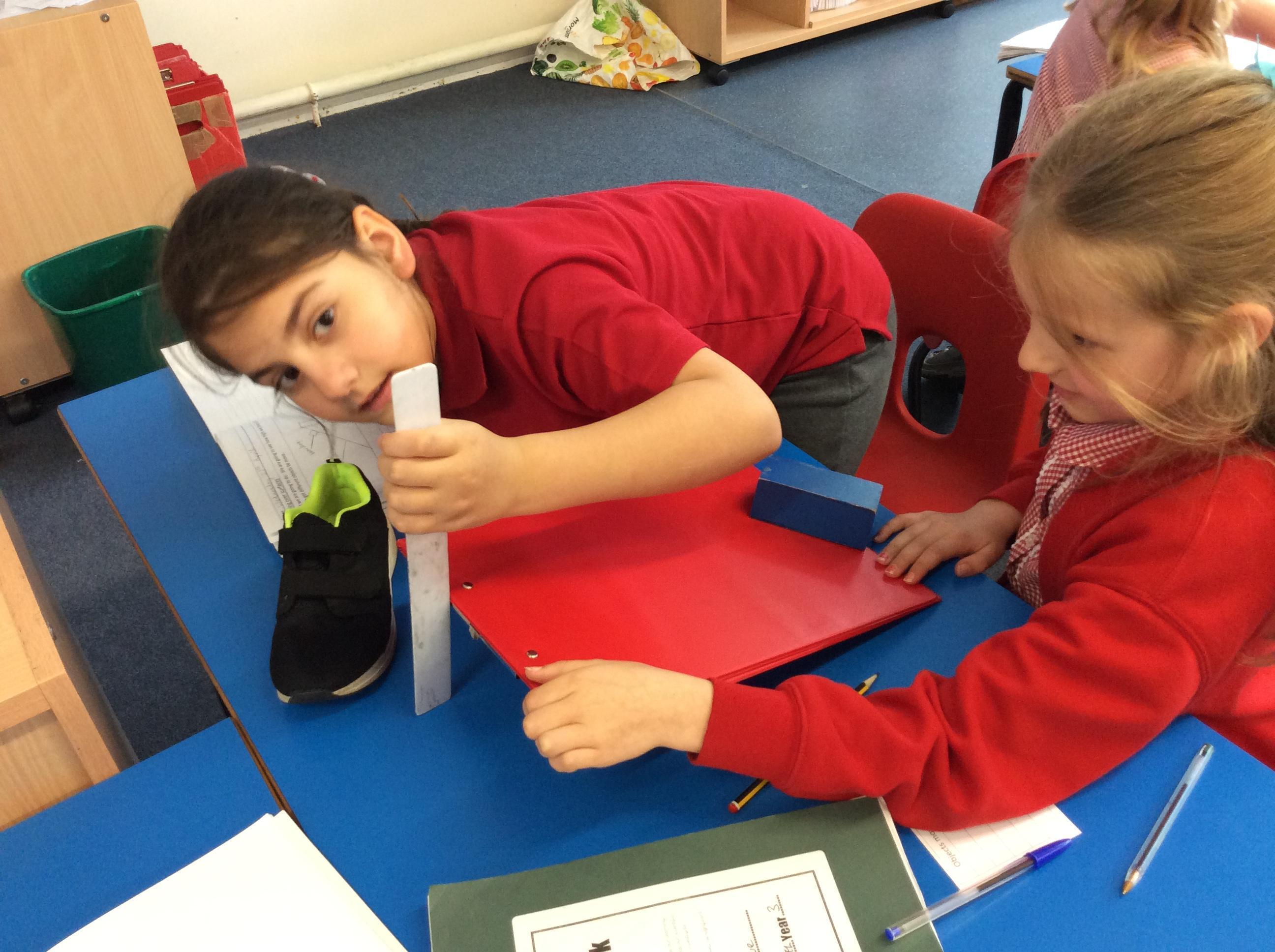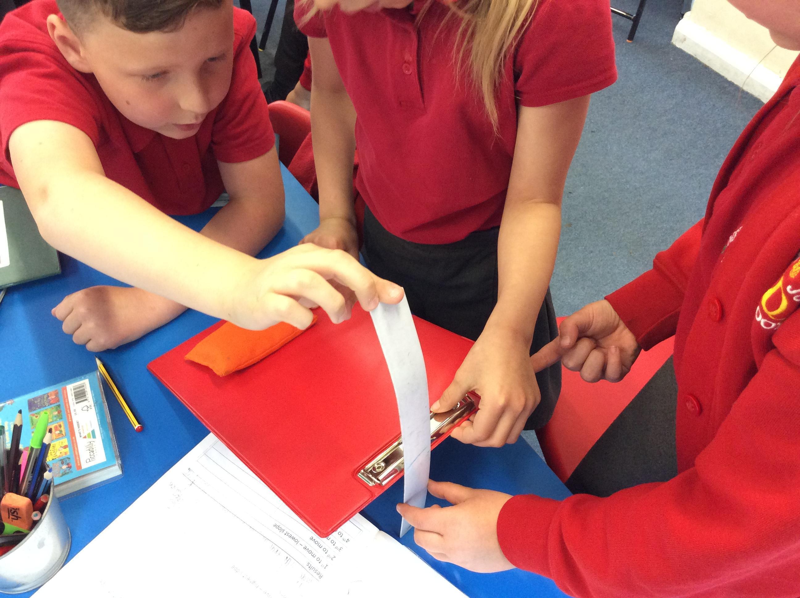 We explored how different objects moved on a slope.  We found that smoother objects moved on a lower slope and grippier objects needed a steeper slope.  We learnt about FRICTION.
