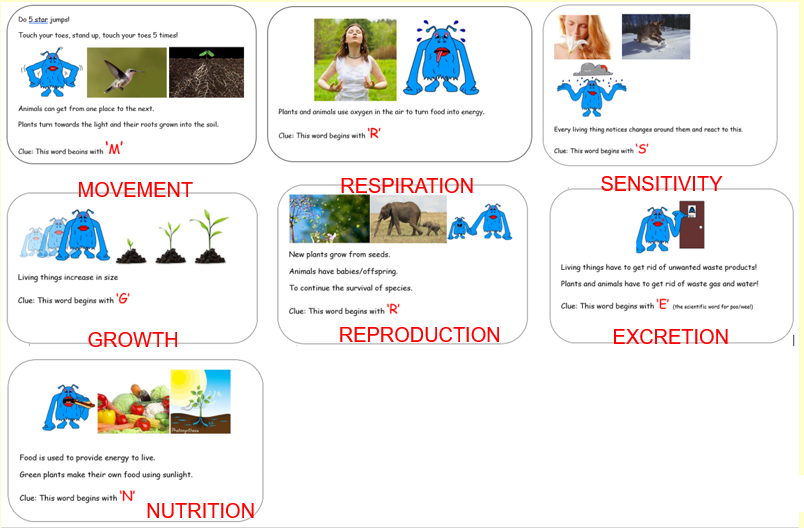 To start our topic, we had fun completing a treasure hunt with clues to discover the 7 essential life processes that every living thing carries out.  We learnt some fabulous scientific vocabulary along the way!