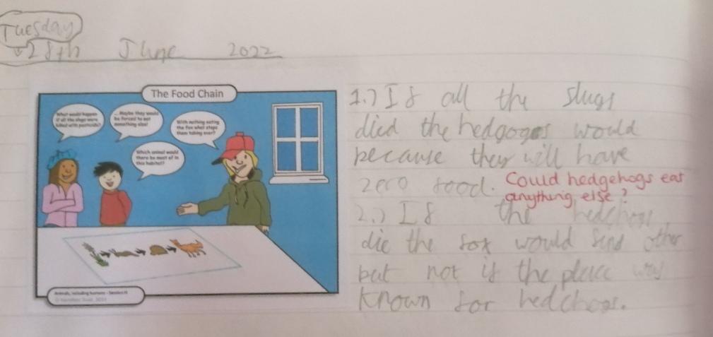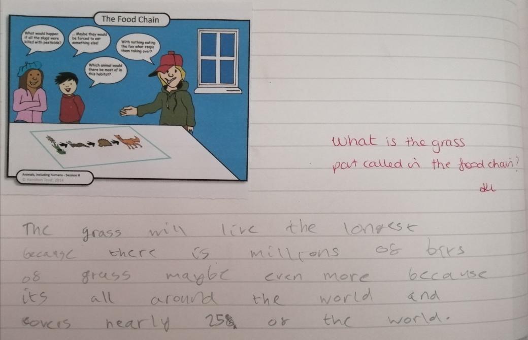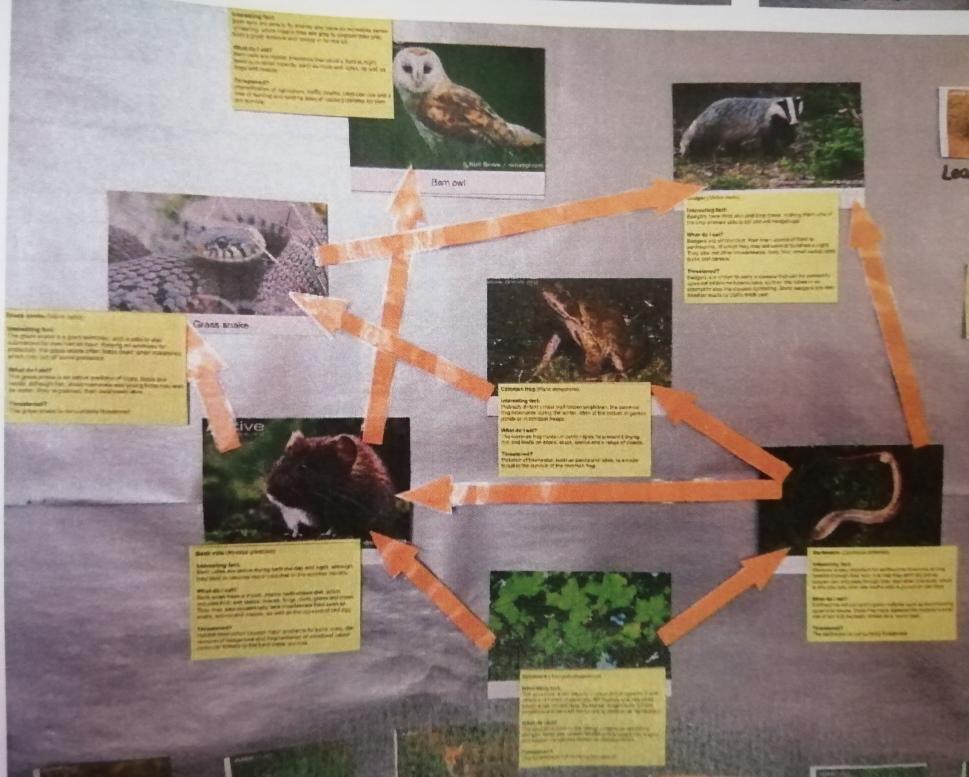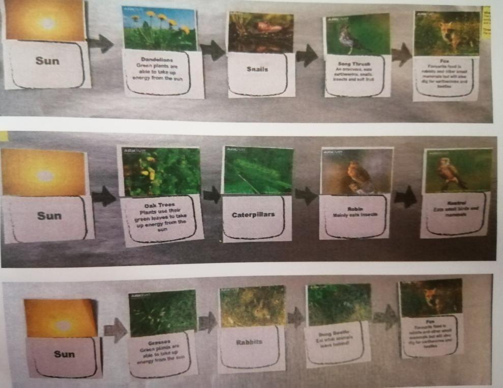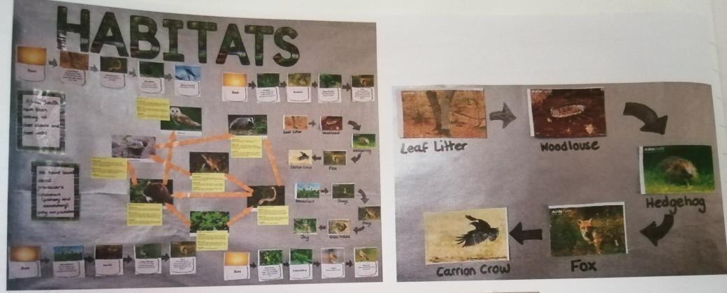 In our next lesson we worked together to firstly create food chains and then food webs.  We used these for a display on our 'Working Wall' for Habitats.