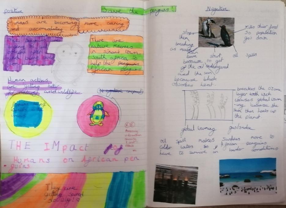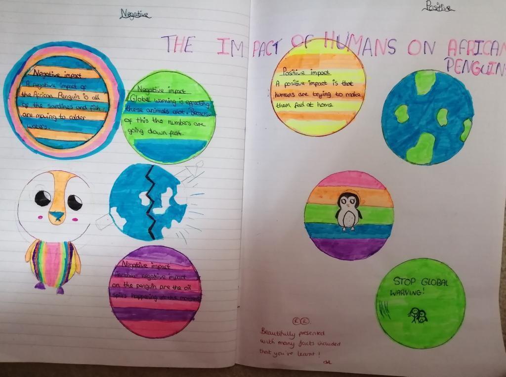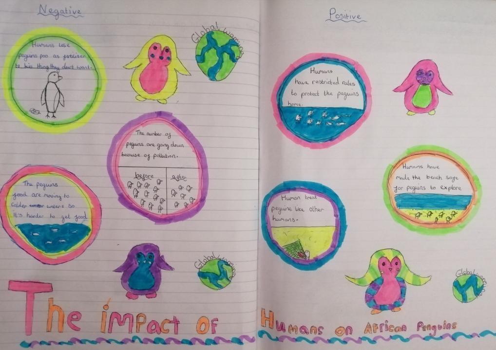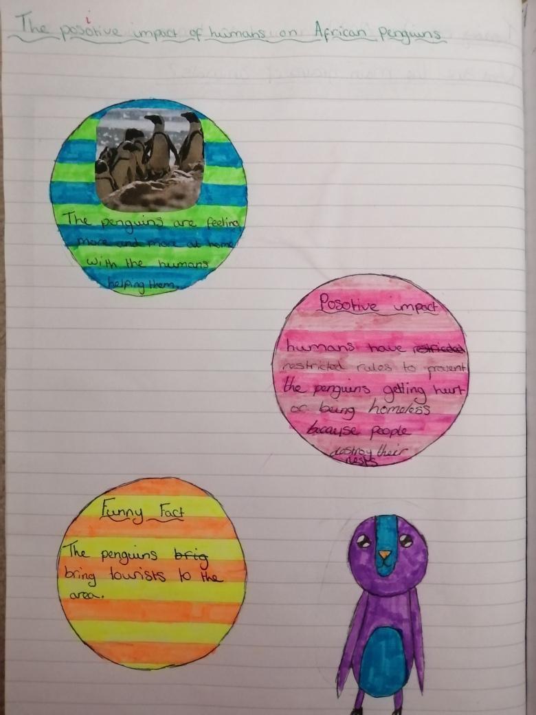 Finally to end this unit of work we identified that environments can change and that this can sometimes pose dangers to living things.  We chose to learn about South African Penguins as they are an endangered species which are affected by the impact of environmental dangers.  We gained information from reading and from a video clip and presented our work in a creative way, looking at both the positive and negative impact of humans and the environment.