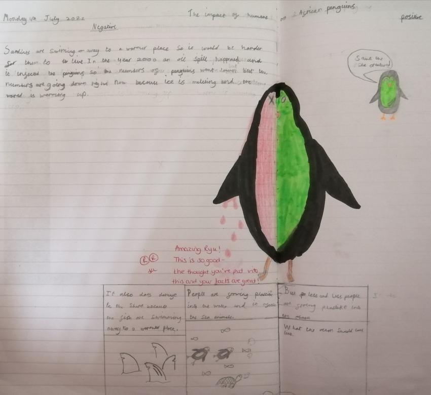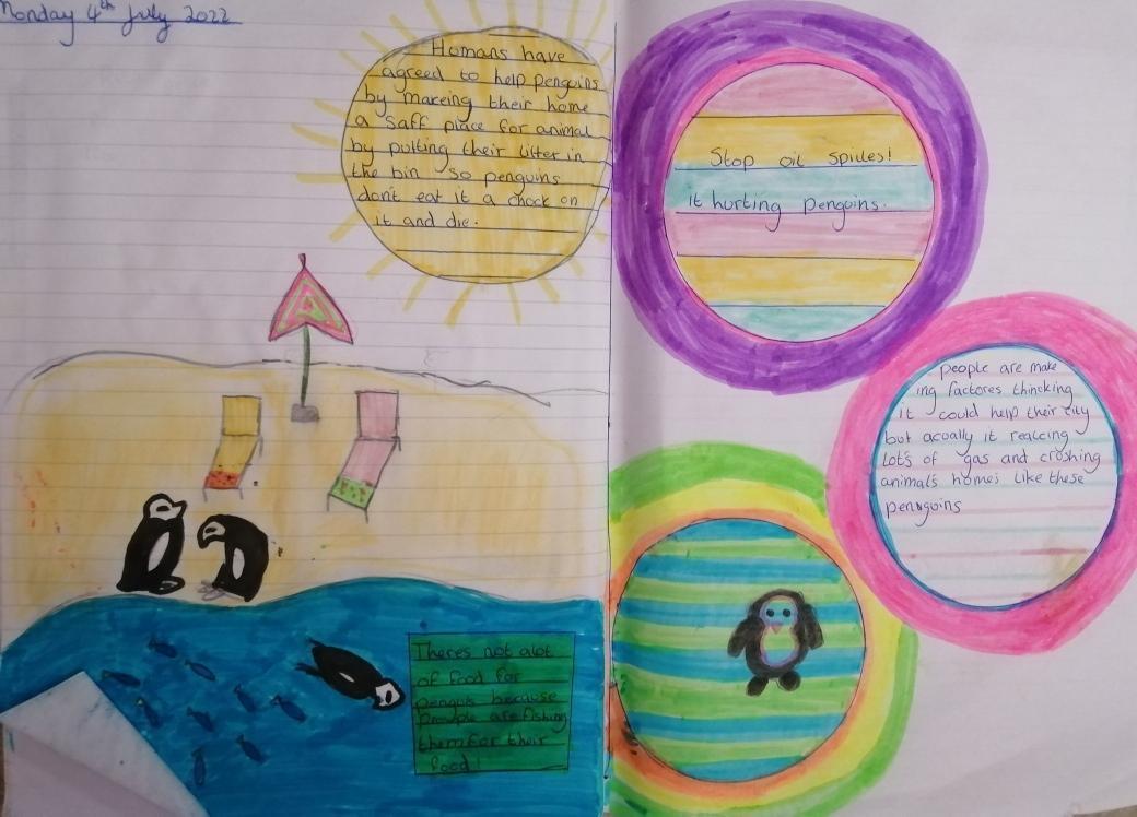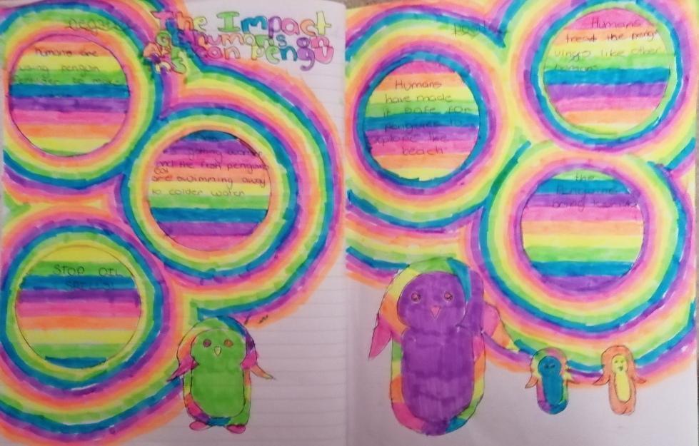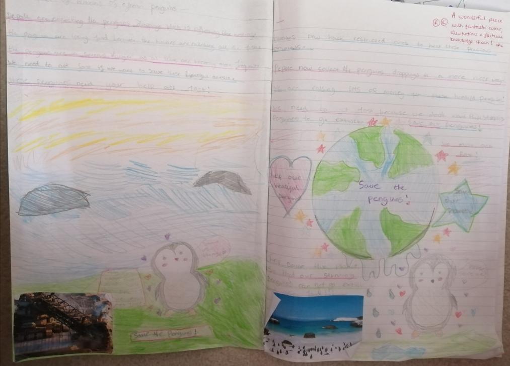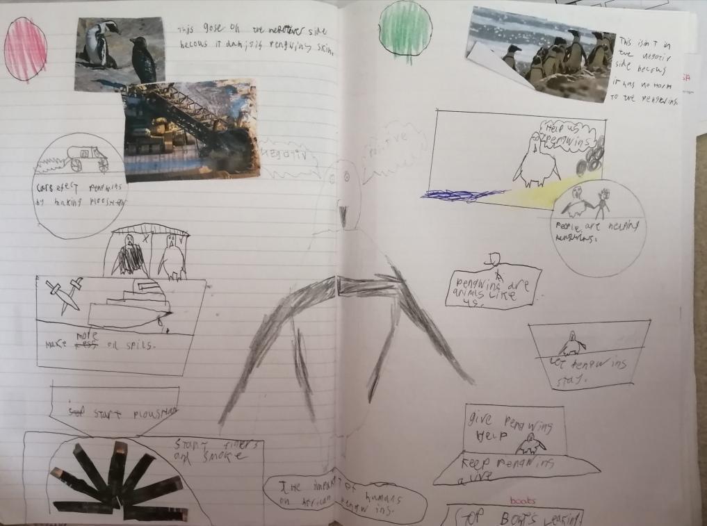 Finally to end this unit of work we identified that environments can change and that this can sometimes pose dangers to living things.  We chose to learn about South African Penguins as they are an endangered species which are affected by the impact of environmental dangers.  We gained information from reading and from a video clip and presented our work in a creative way, looking at both the positive and negative impact of humans and the environment.