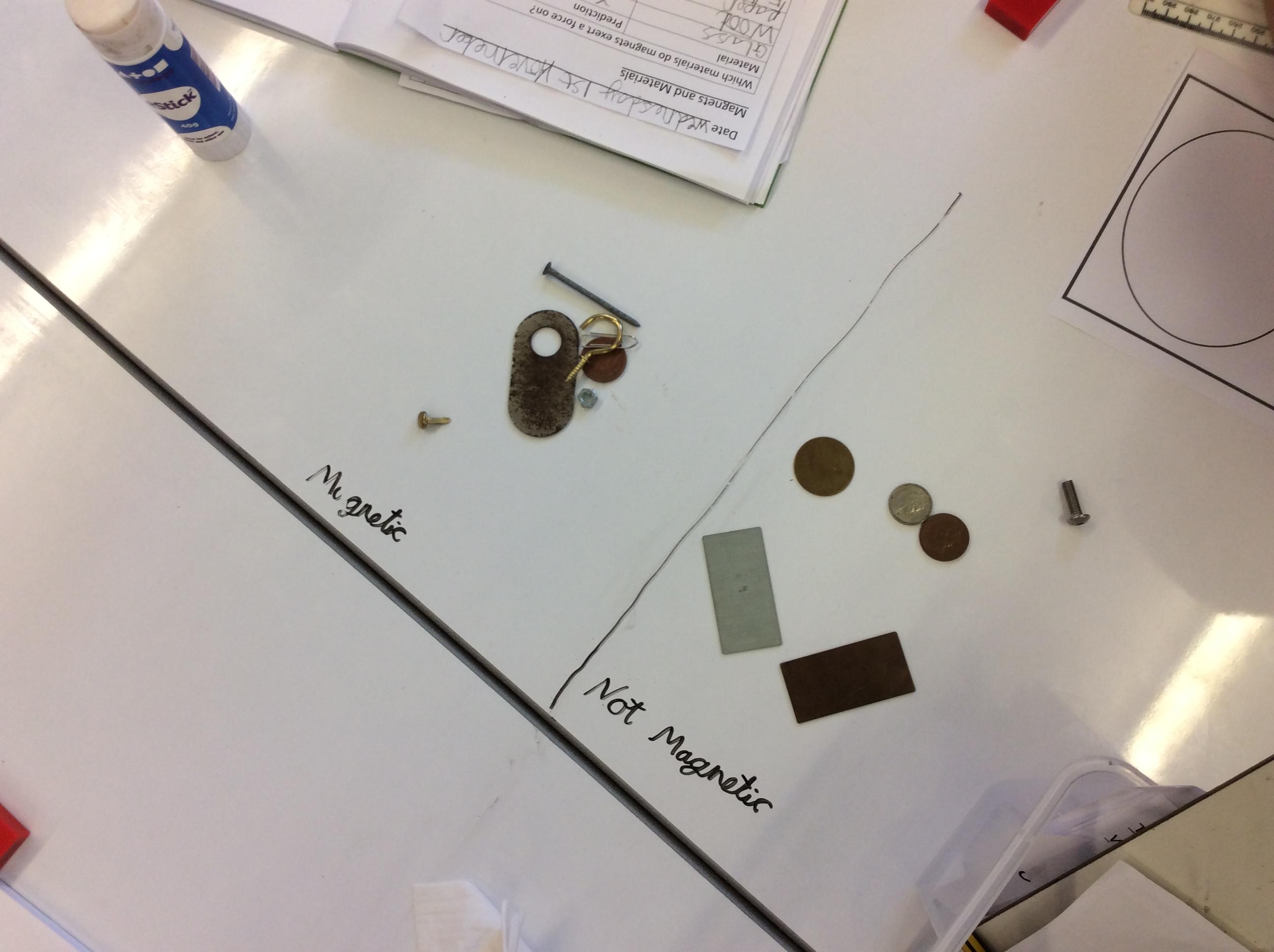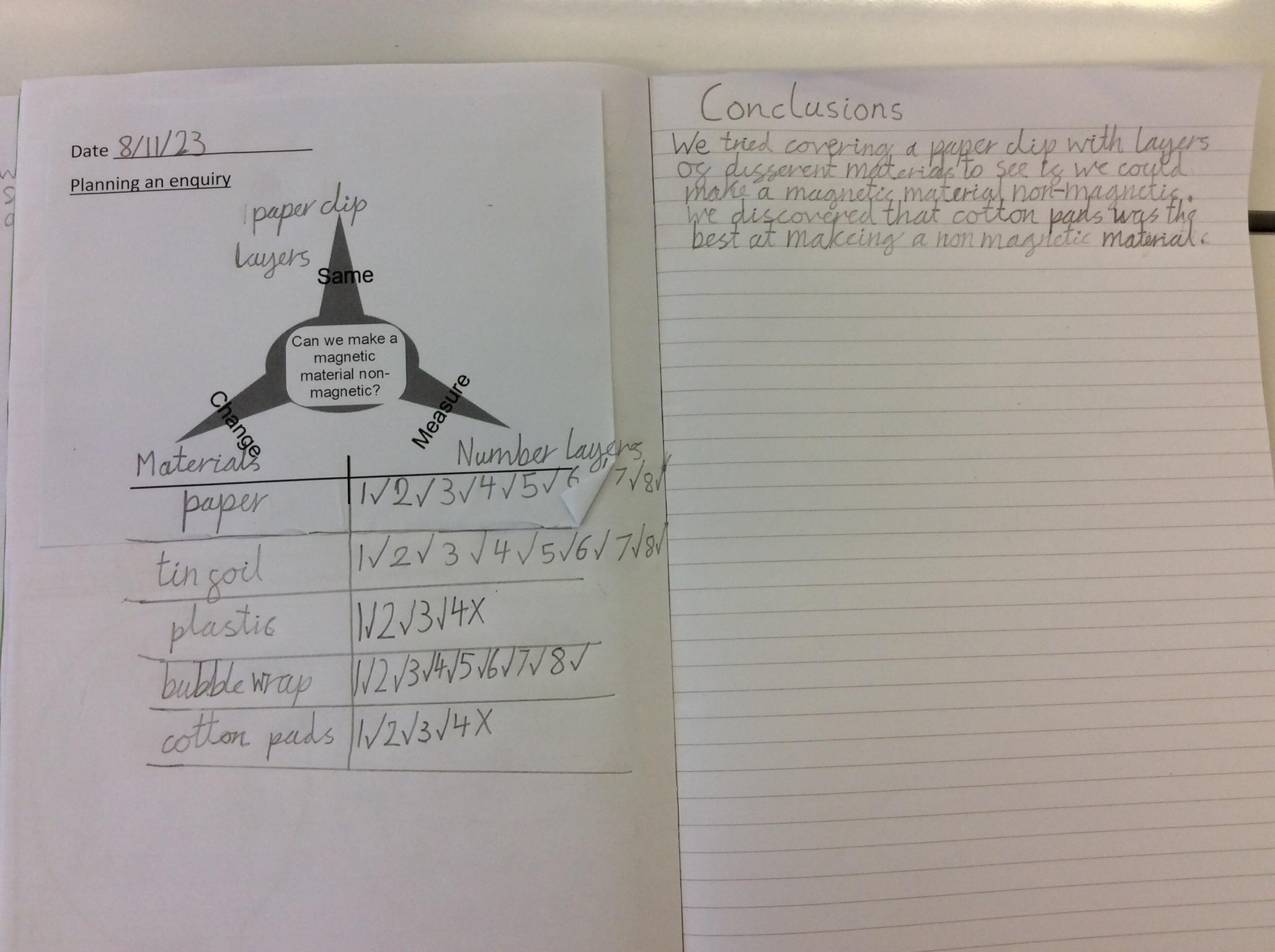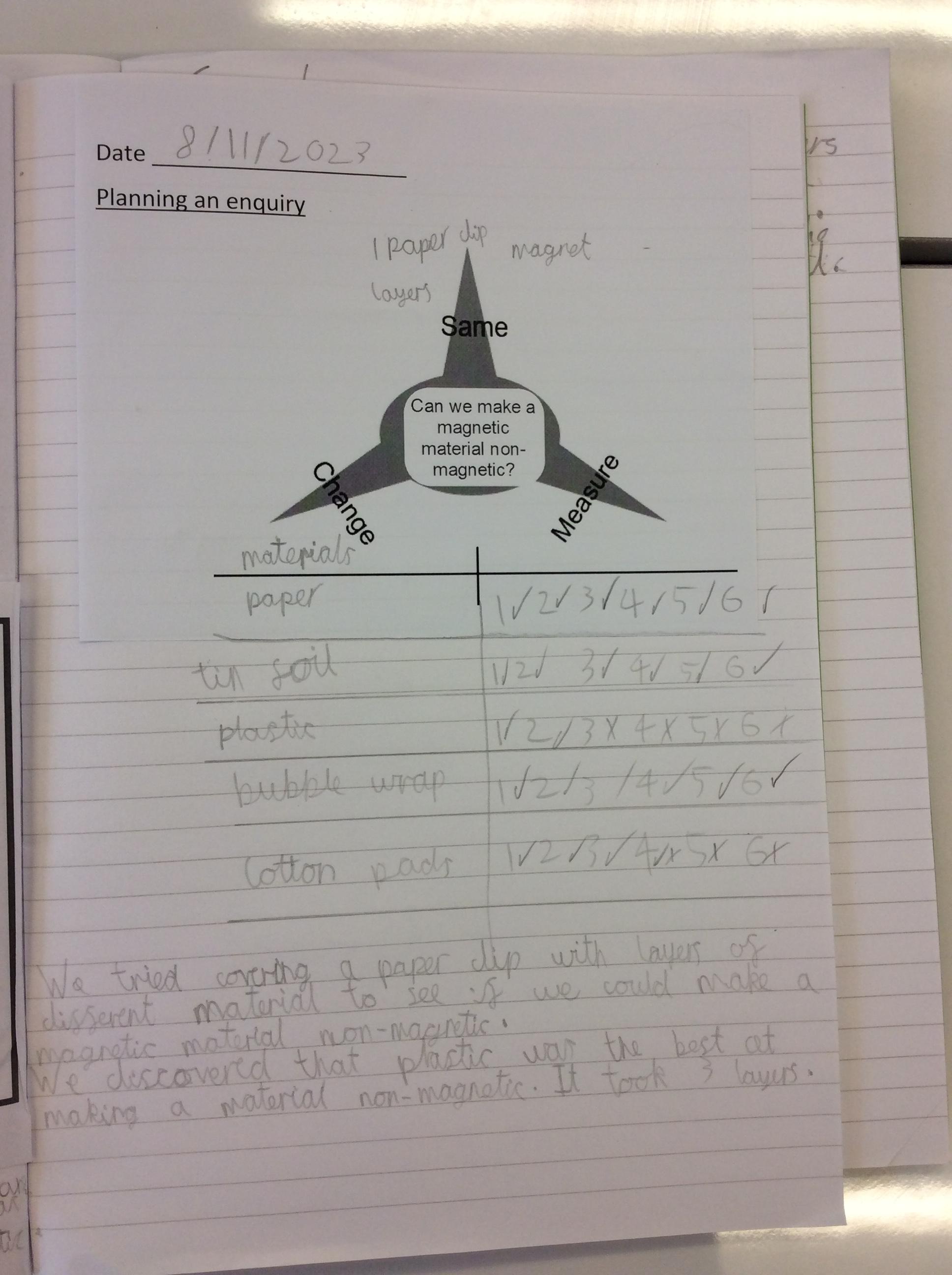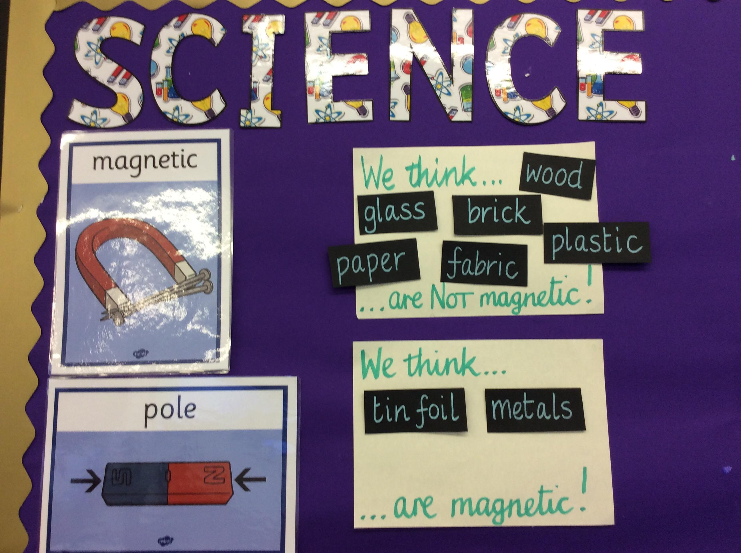 This week, we have been working on our enquiry skills.  We used our planning map and discussed as a class what we were going to do.  We were trying to find out which of a selection of materials would be best at stopping a paper clip being attracted to a magnet.