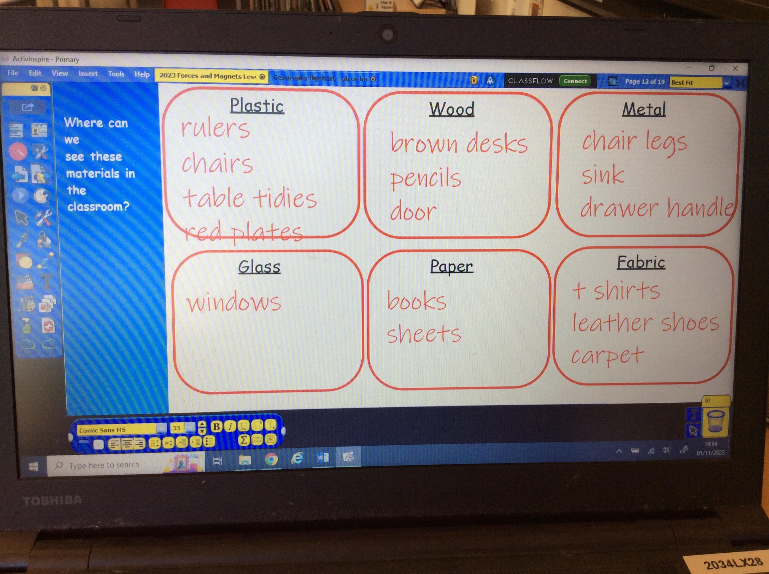 We thought about all the different materials we learnt in year 2 and tried to spot things in the classroom made of them.