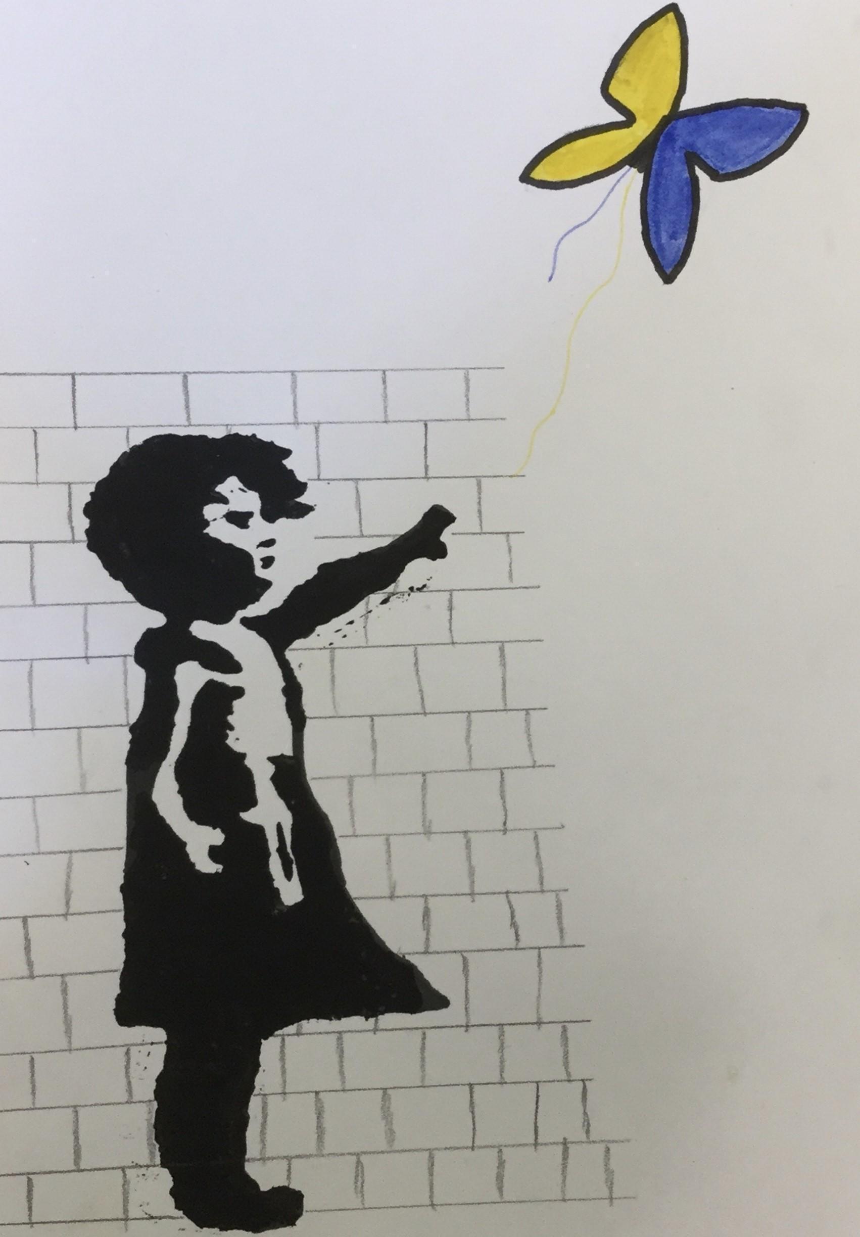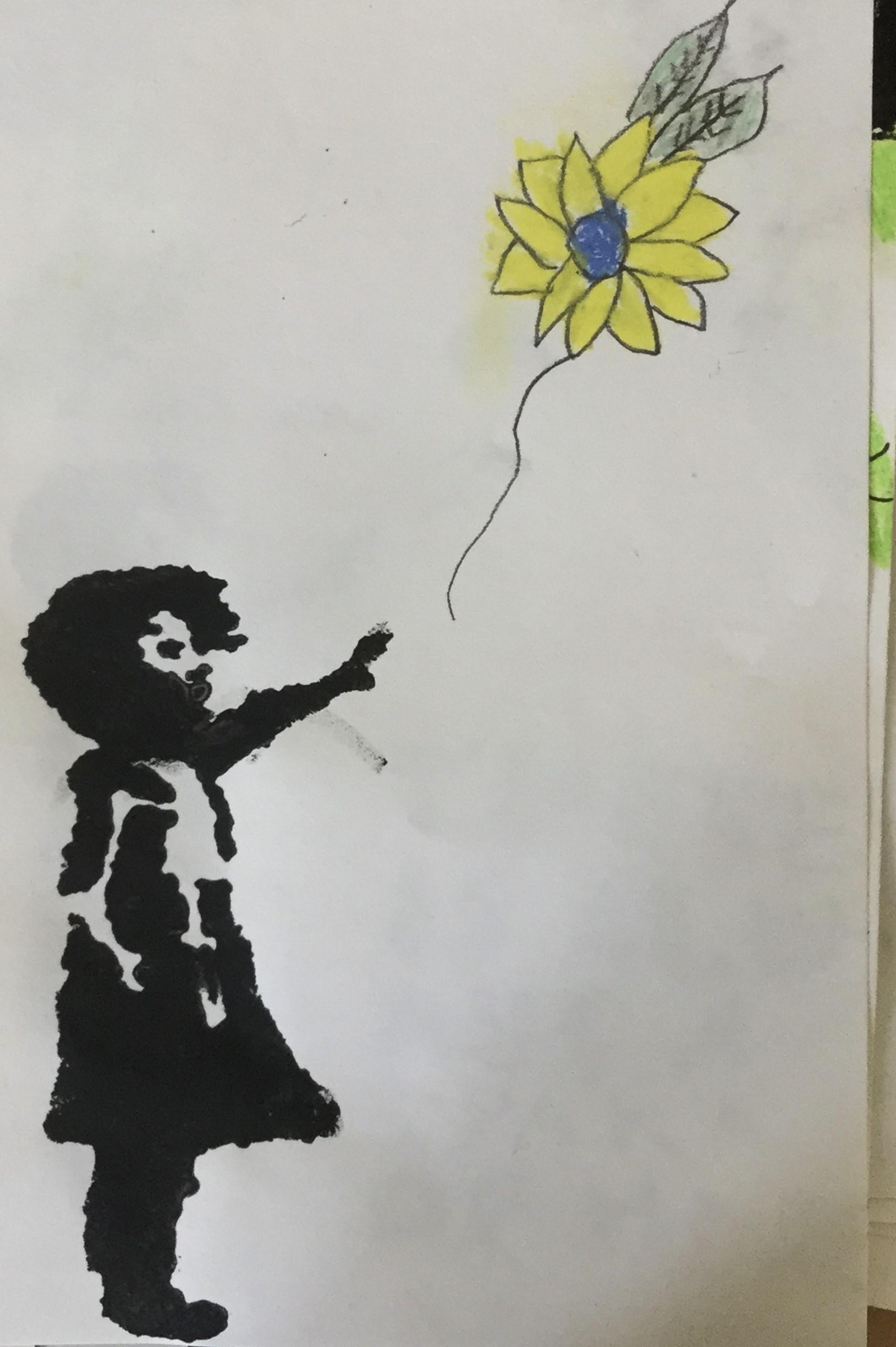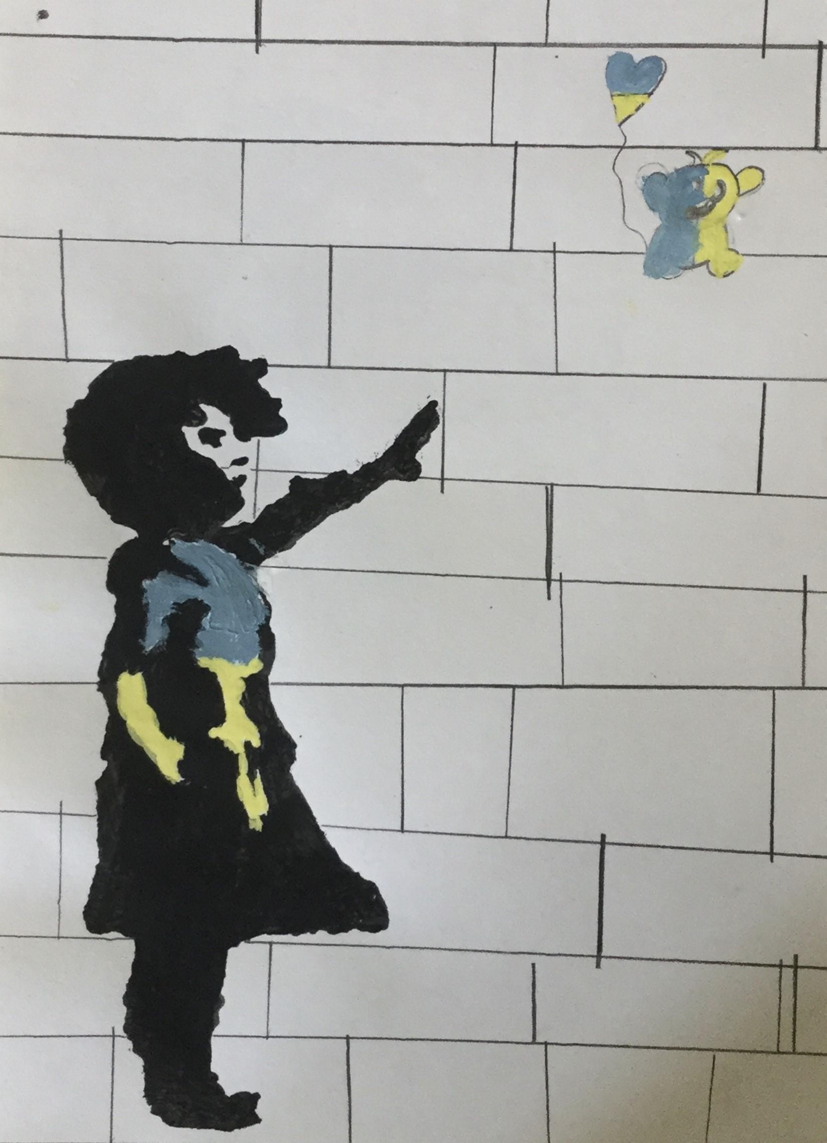 Our artwork for this week was inspired by 'Banksy' and his graffiti stencil art.  We experimented with this in the lead up to Seeking Sanctuary Week.  Some children used stencils for the girl, some children sketched their own.  All of the objects represented hope, peace, freedom and love.  The Ukrainian flag colours of blue and yellow were represented in the objects sketched.