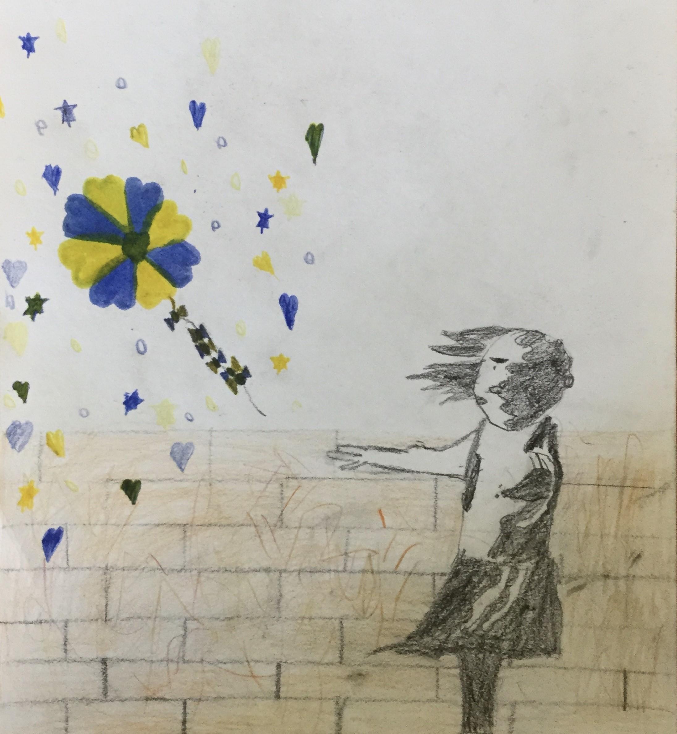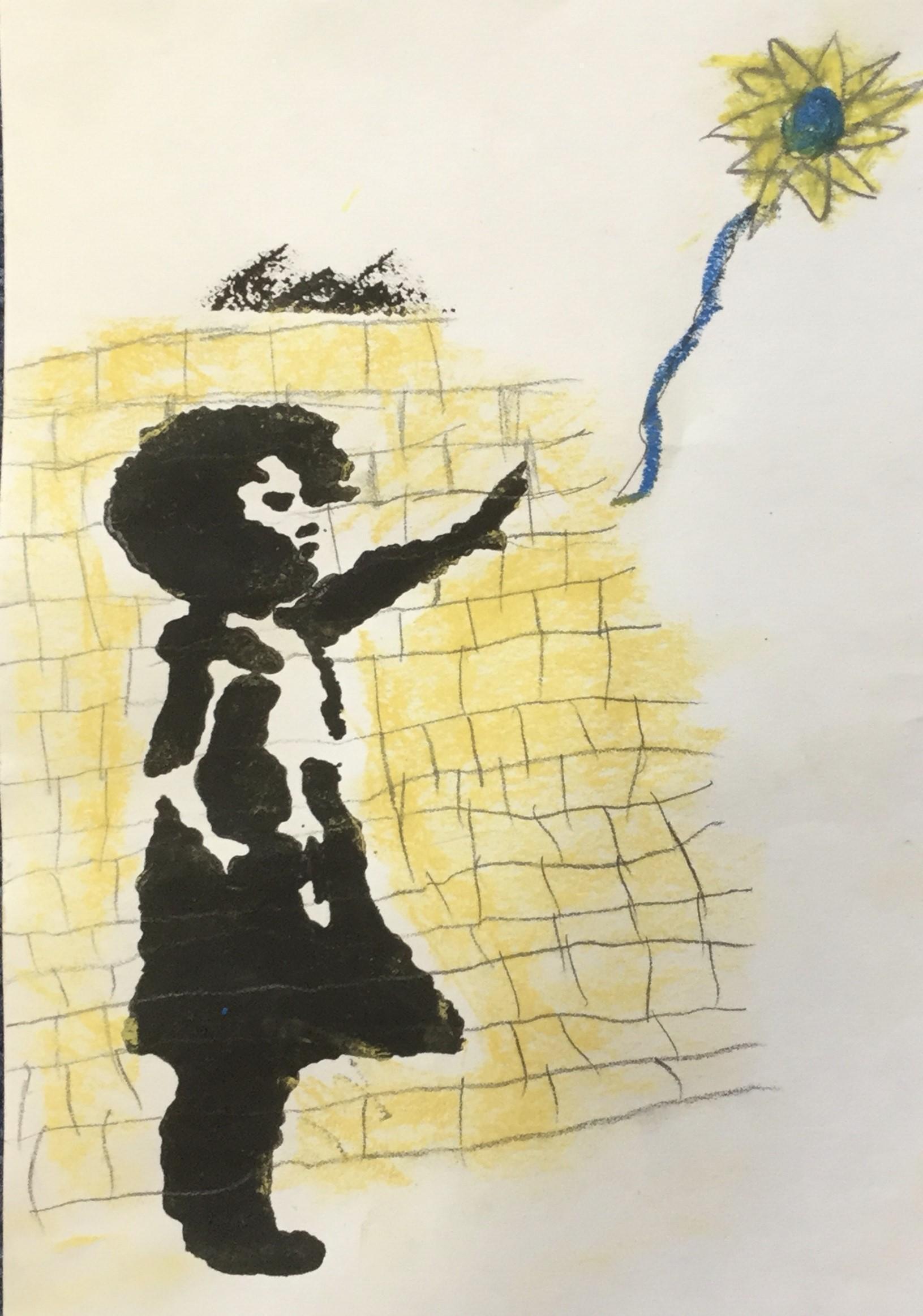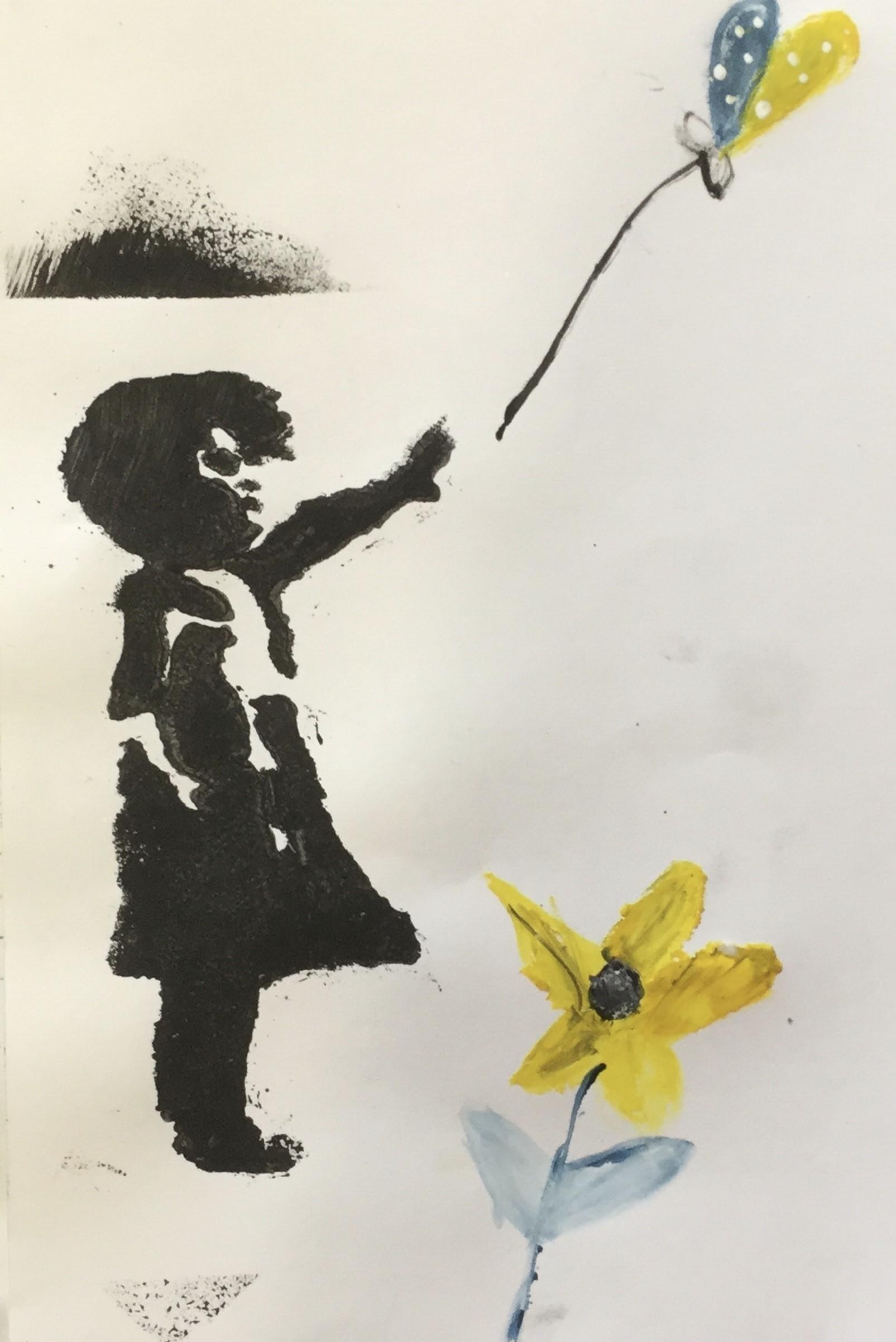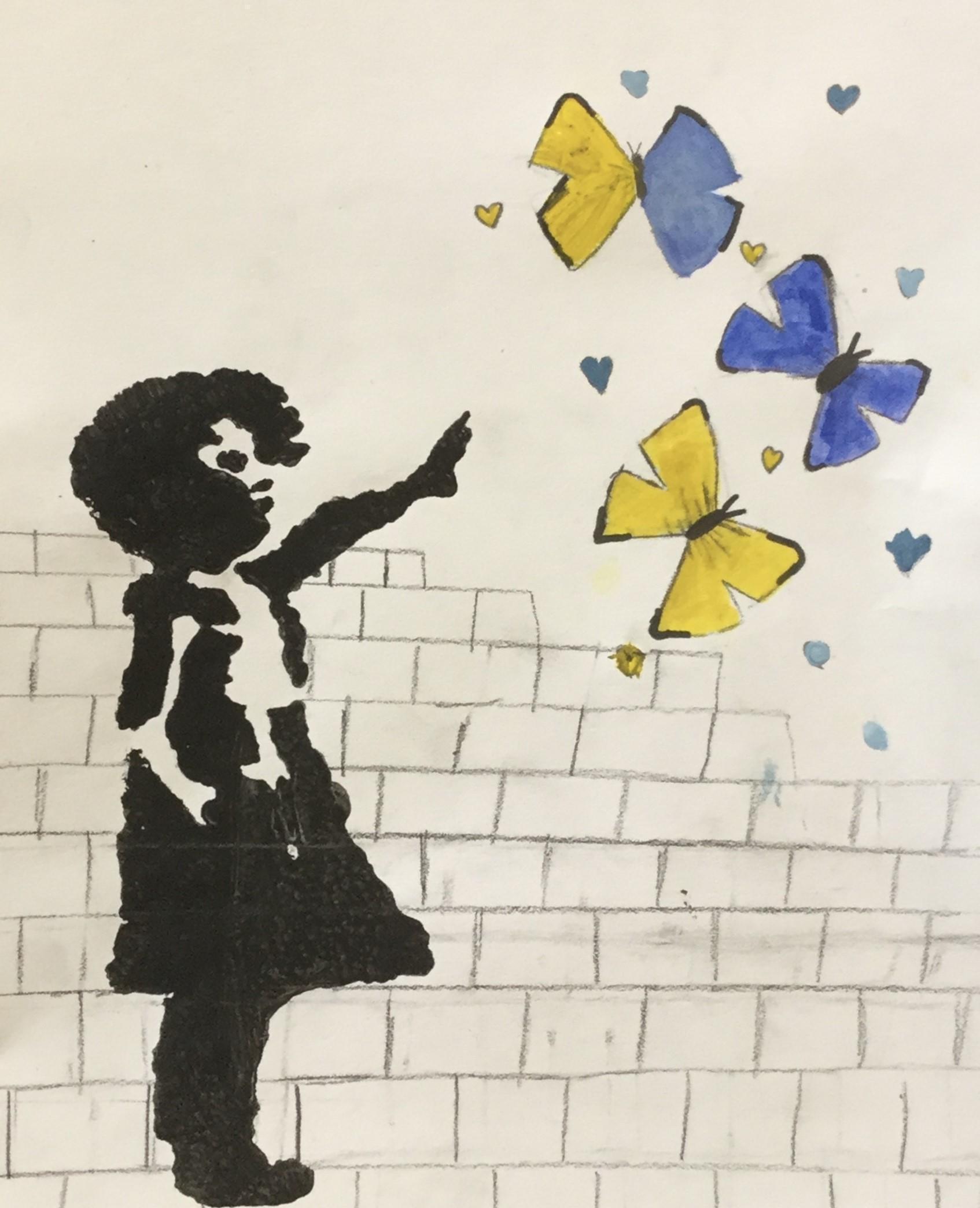 Our artwork for this week was inspired by 'Banksy' and his graffiti stencil art.  We experimented with this in the lead up to Seeking Sanctuary Week.  Some children used stencils for the girl, some children sketched their own.  All of the objects represented hope, peace, freedom and love.  The Ukrainian flag colours of blue and yellow were represented in the objects sketched.