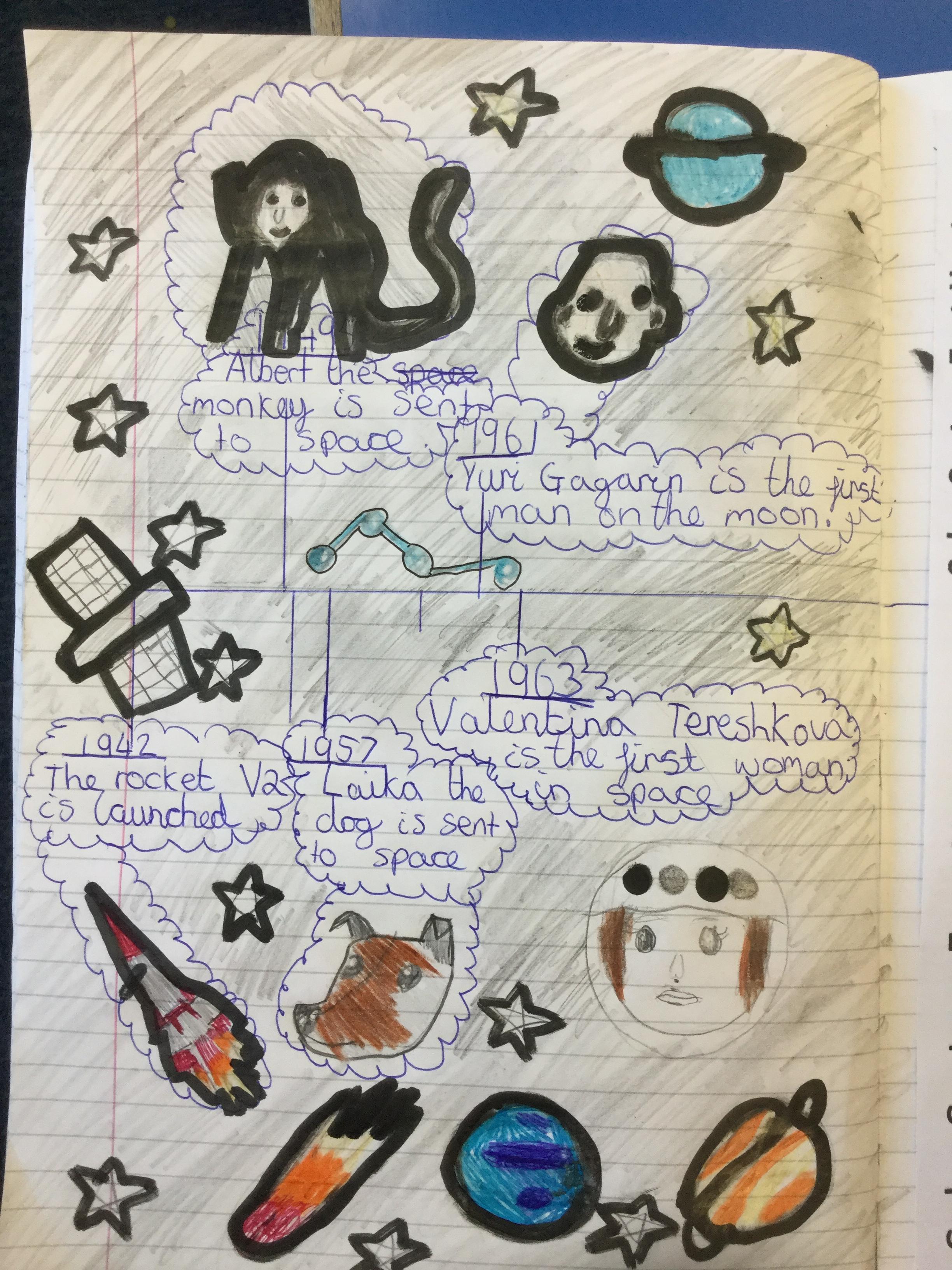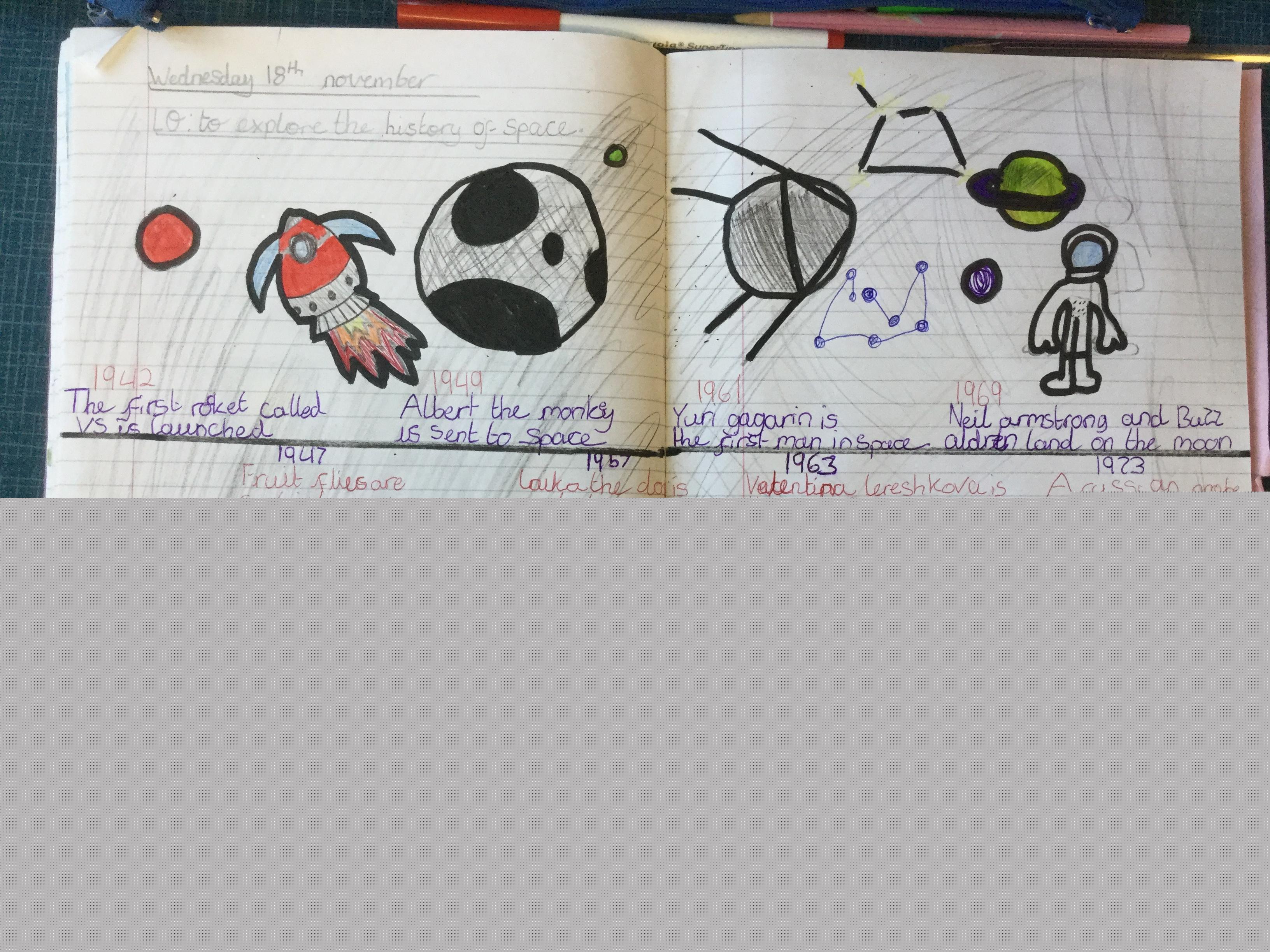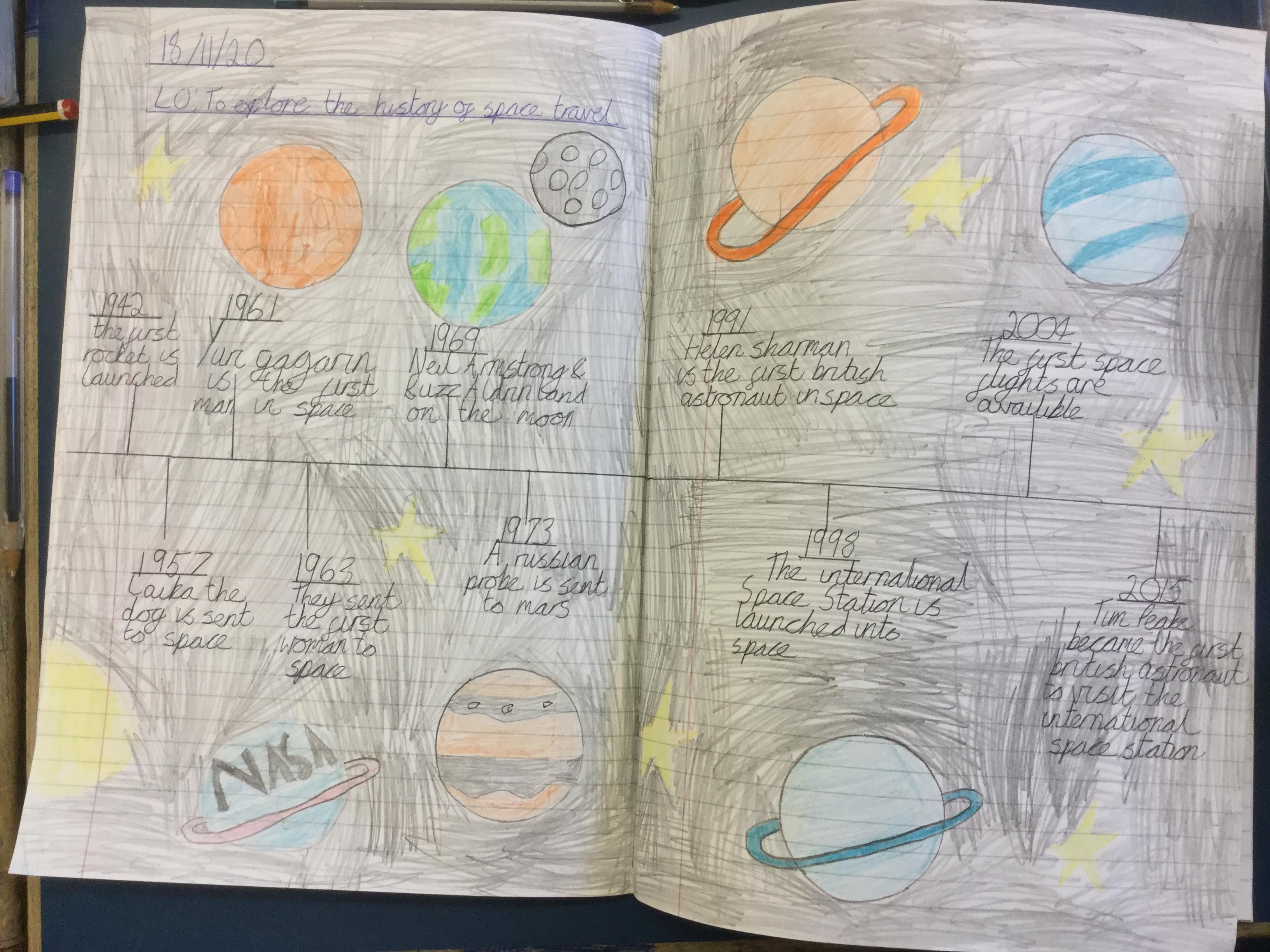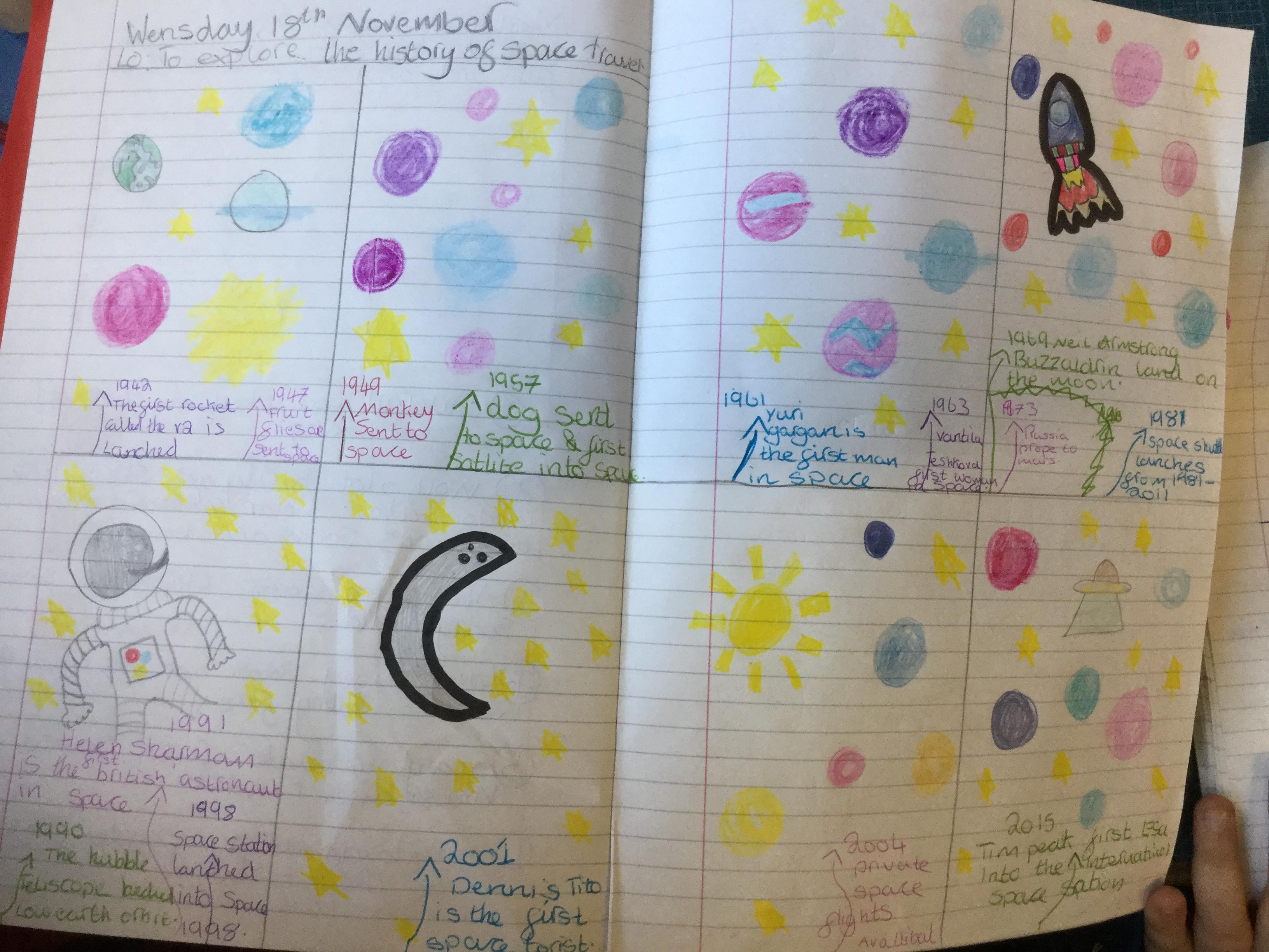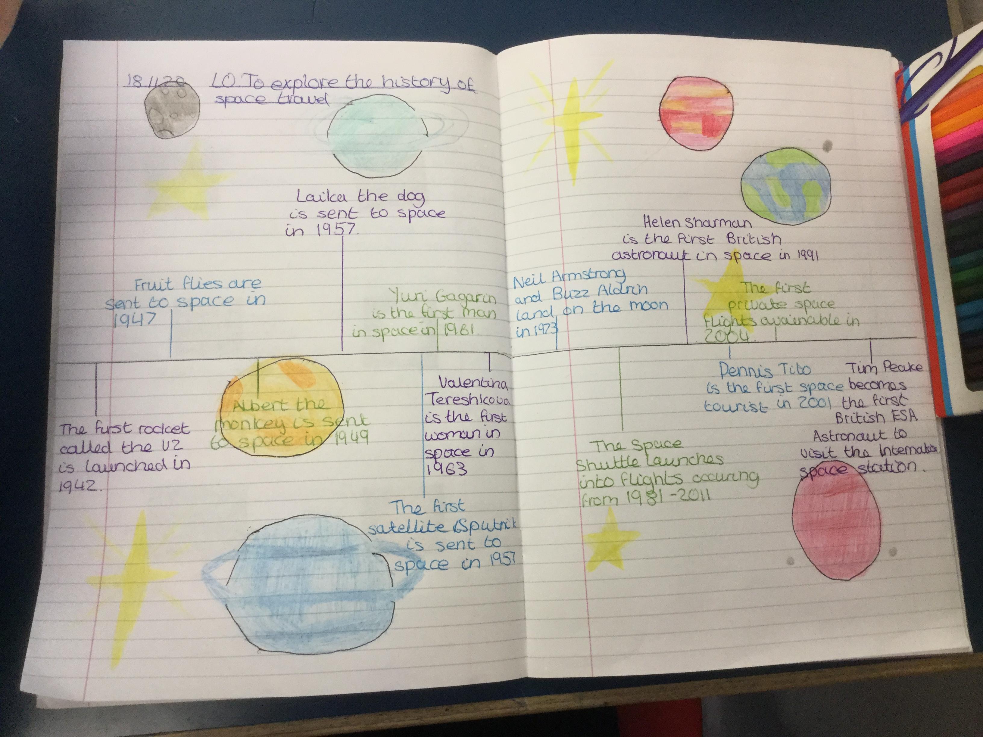 Today the children learnt about the history of space travel, discussing and ordering key events. The children then created their own timelines of events in any way they wished. The year groups efforts were amazing, books looking brilliant! Take a look at all their hard work.