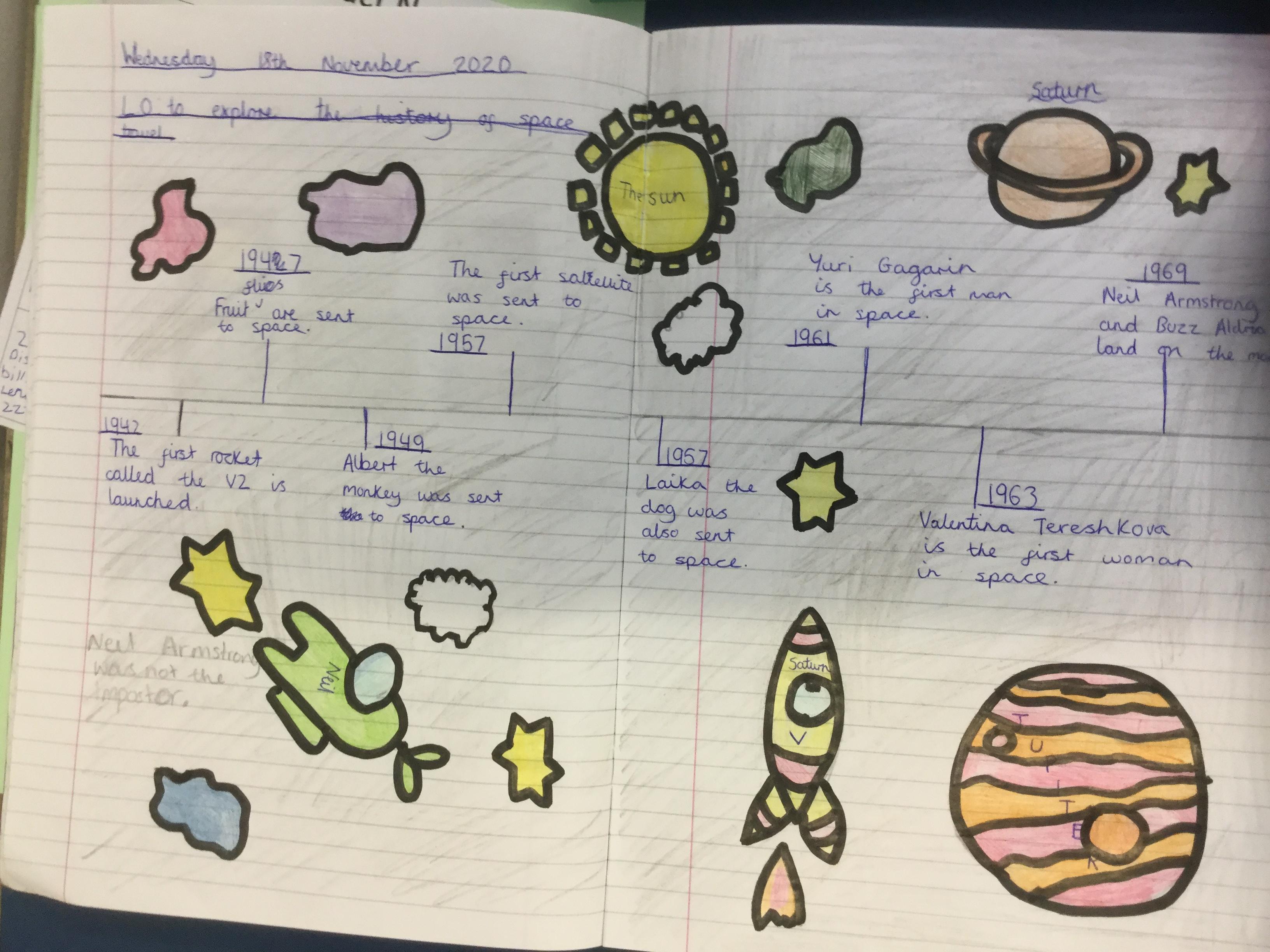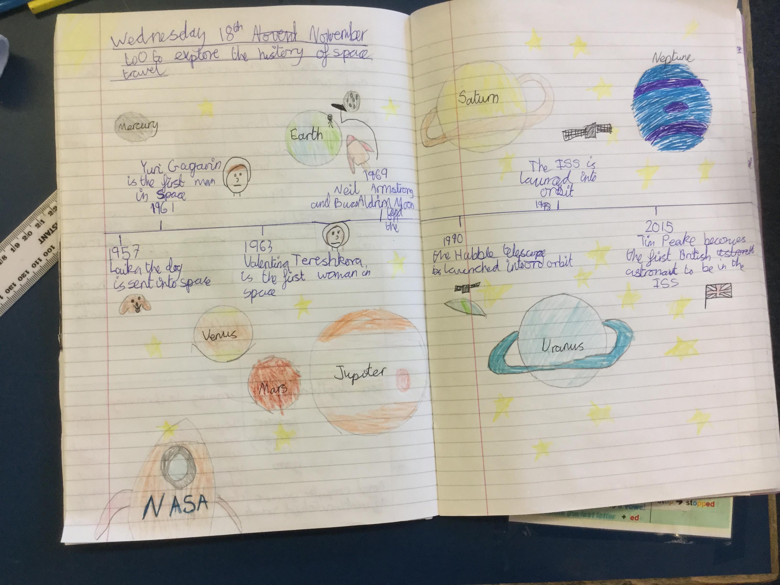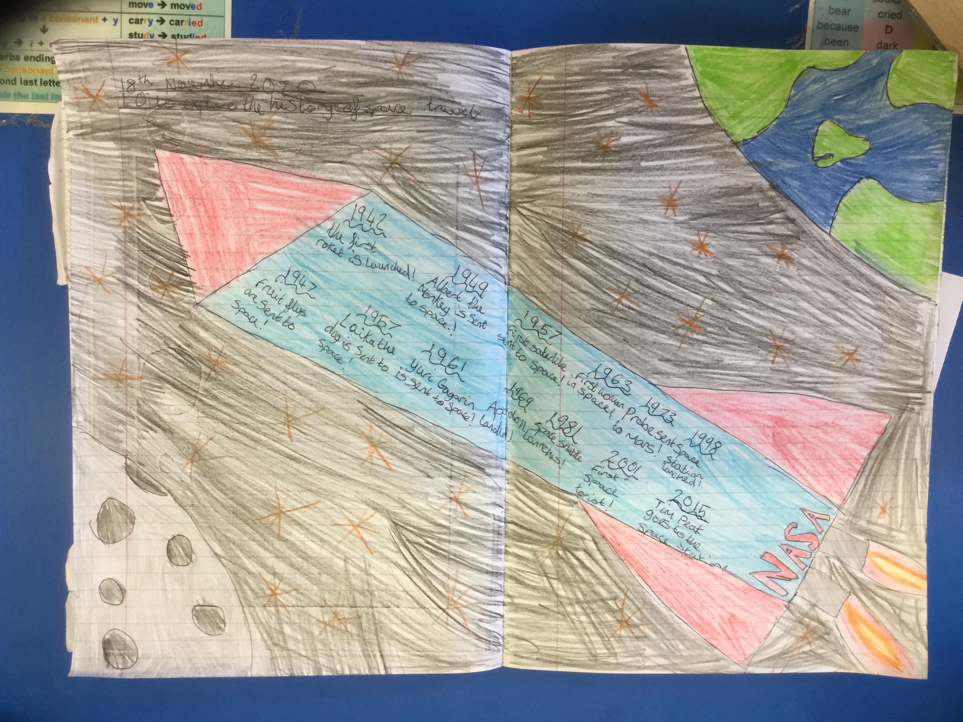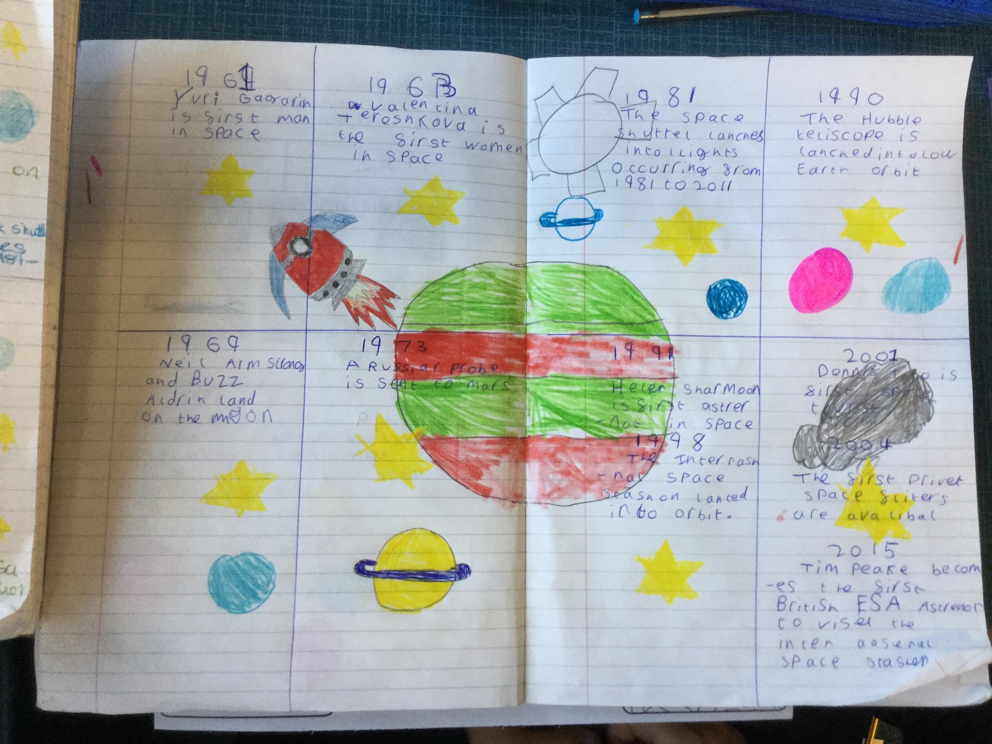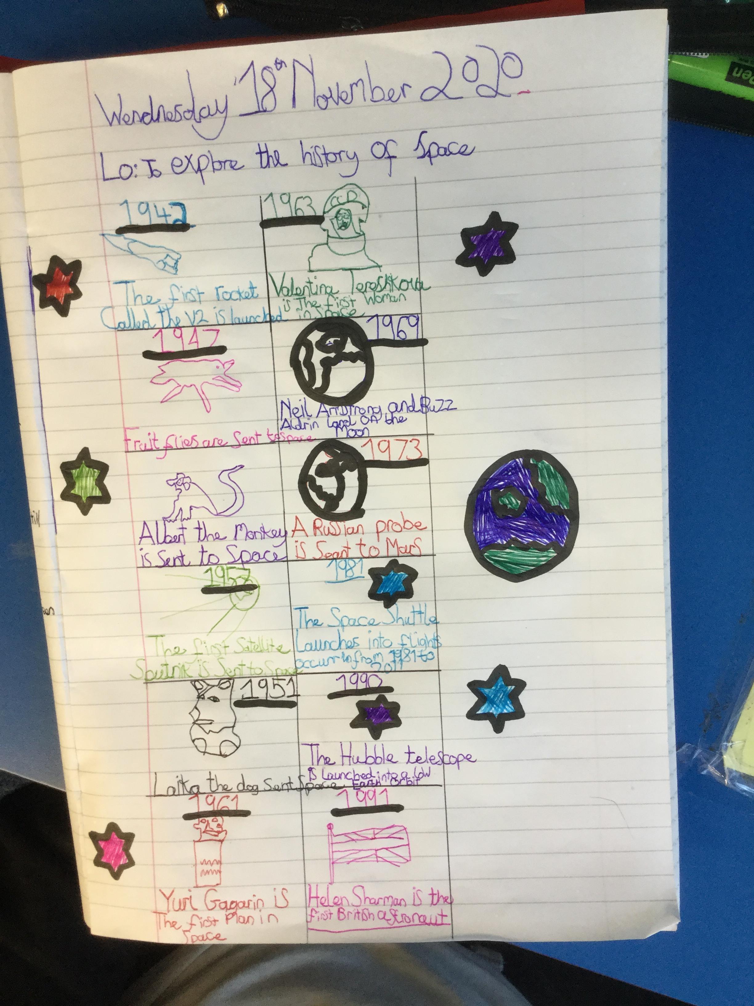 Today the children learnt about the history of space travel, discussing and ordering key events. The children then created their own timelines of events in any way they wished. The year groups efforts were amazing, books looking brilliant! Take a look at all their hard work.