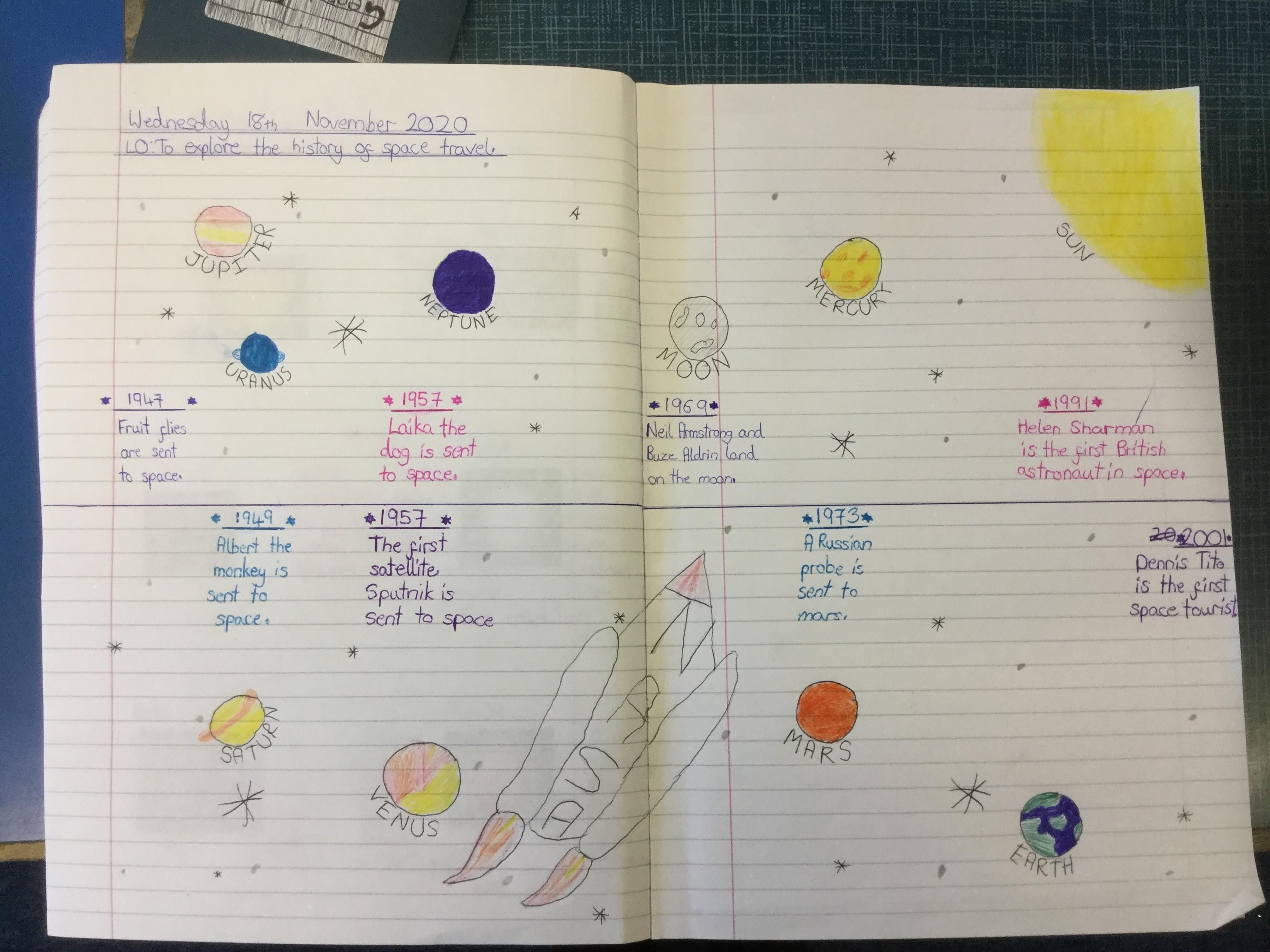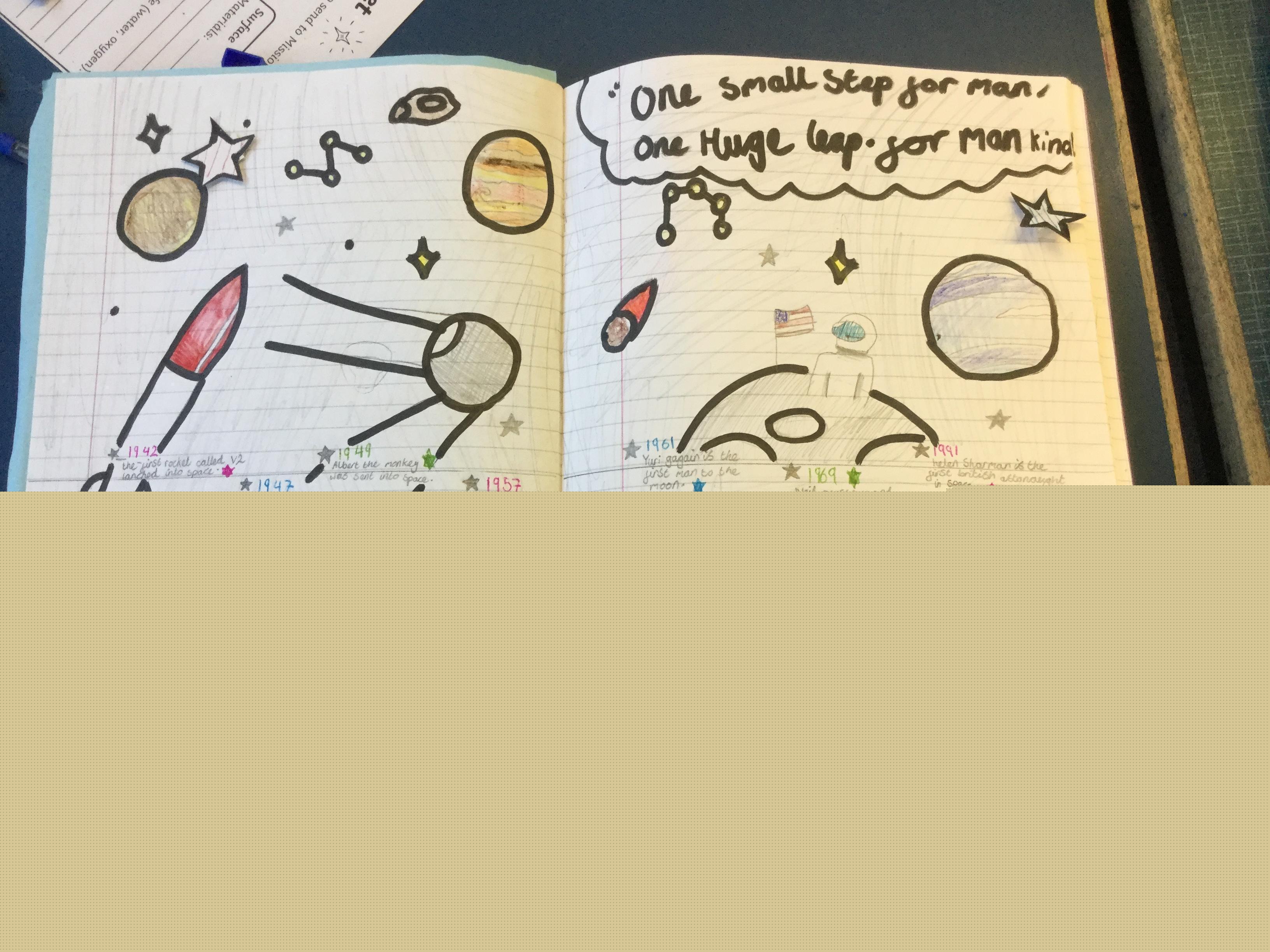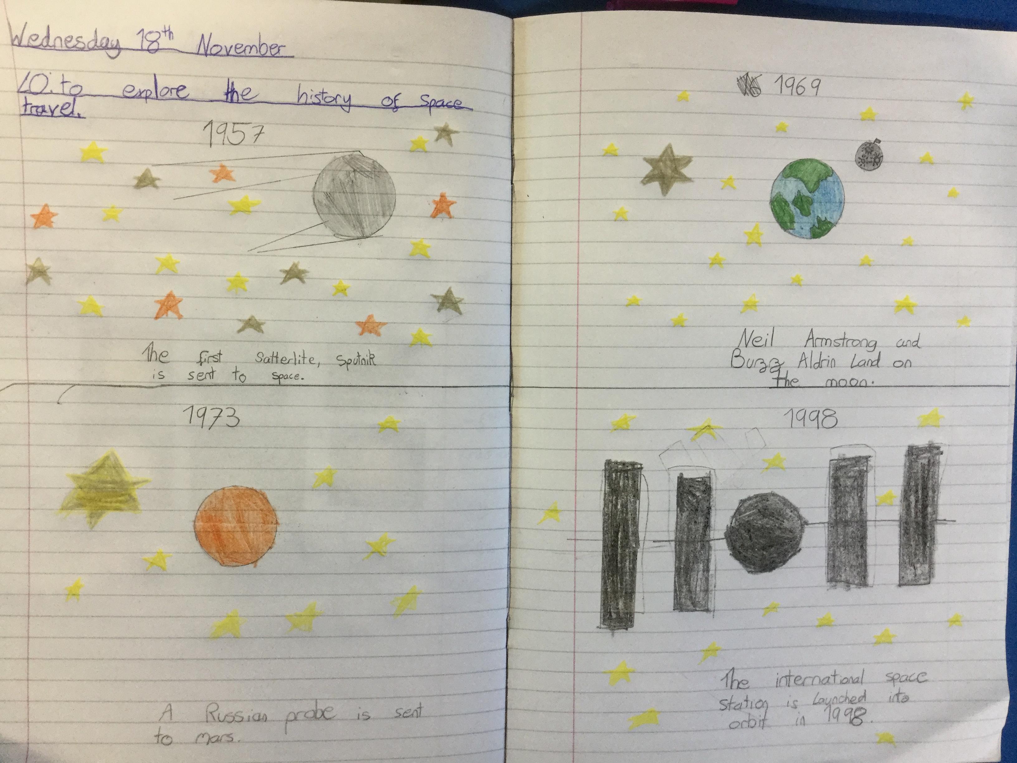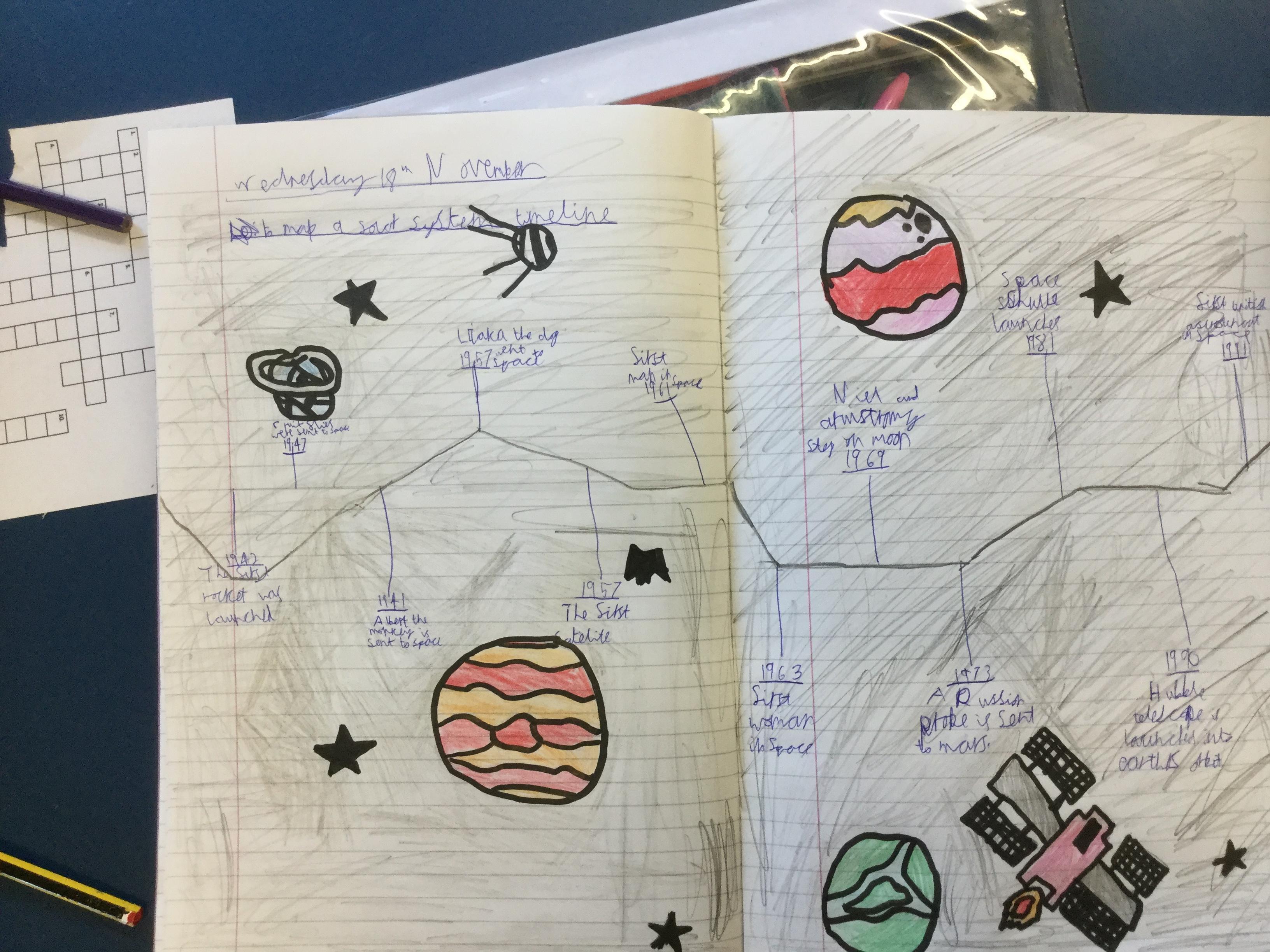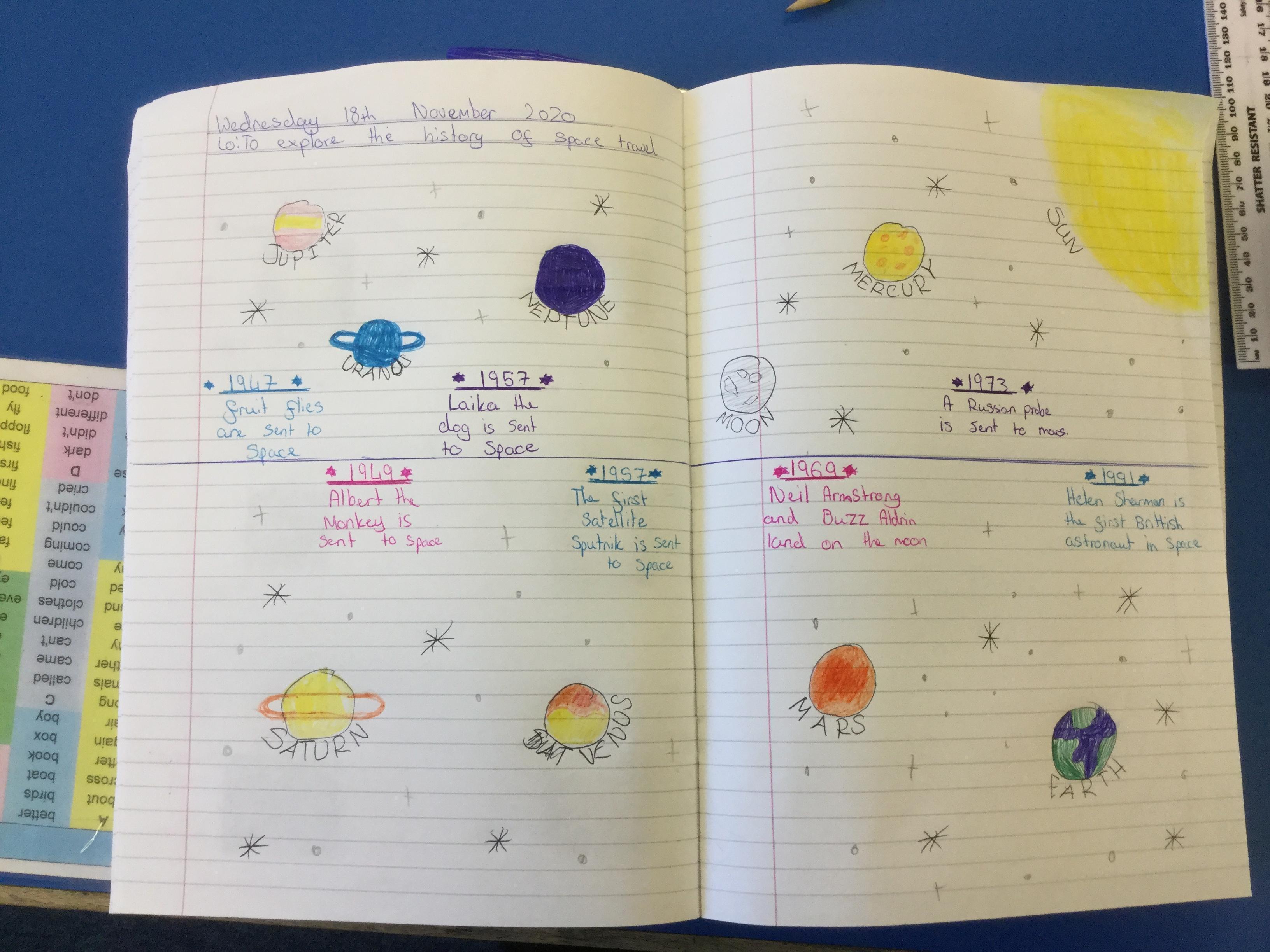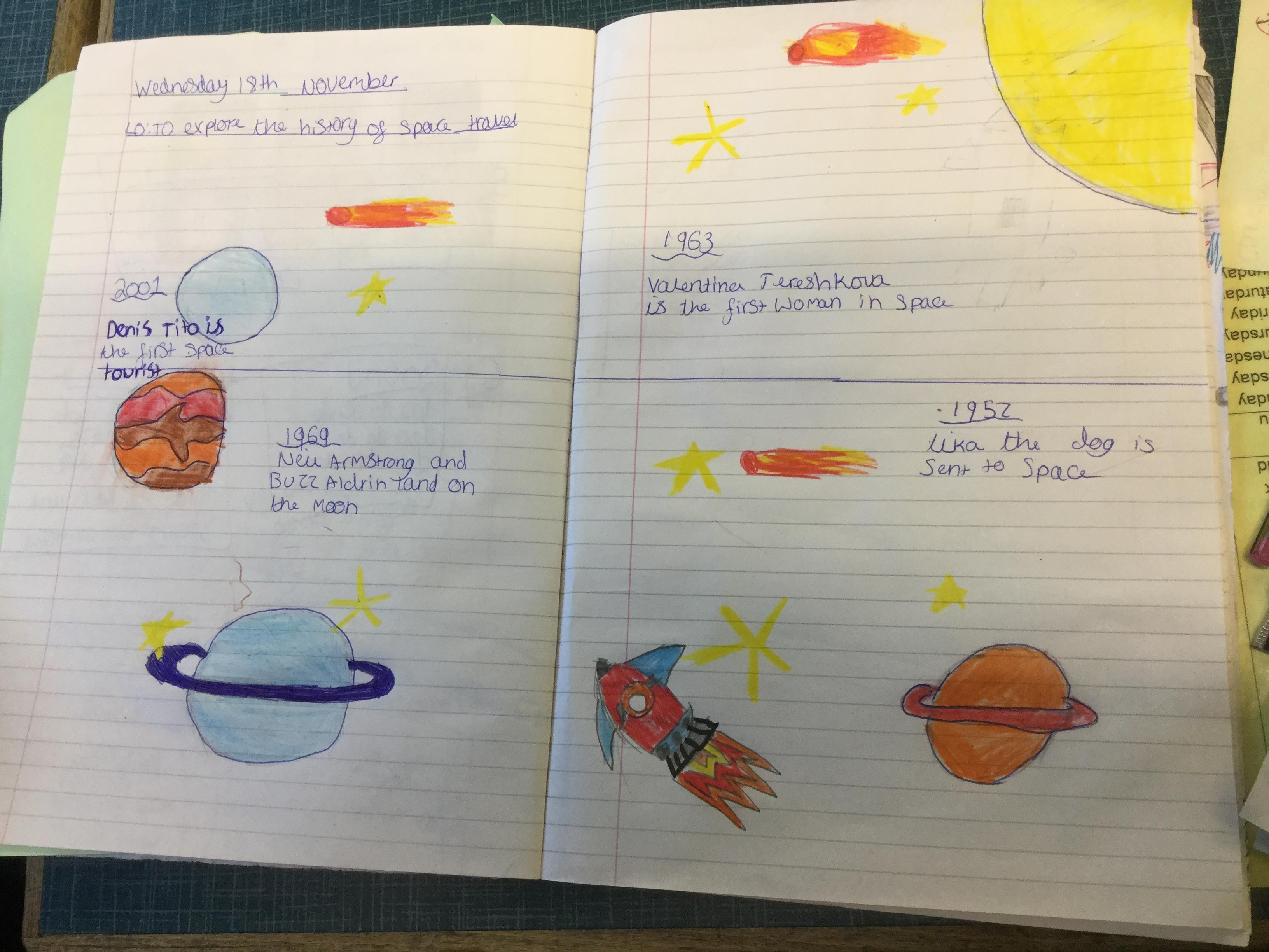 Today the children learnt about the history of space travel, discussing and ordering key events. The children then created their own timelines of events in any way they wished. The year groups efforts were amazing, books looking brilliant! Take a look at all their hard work.
