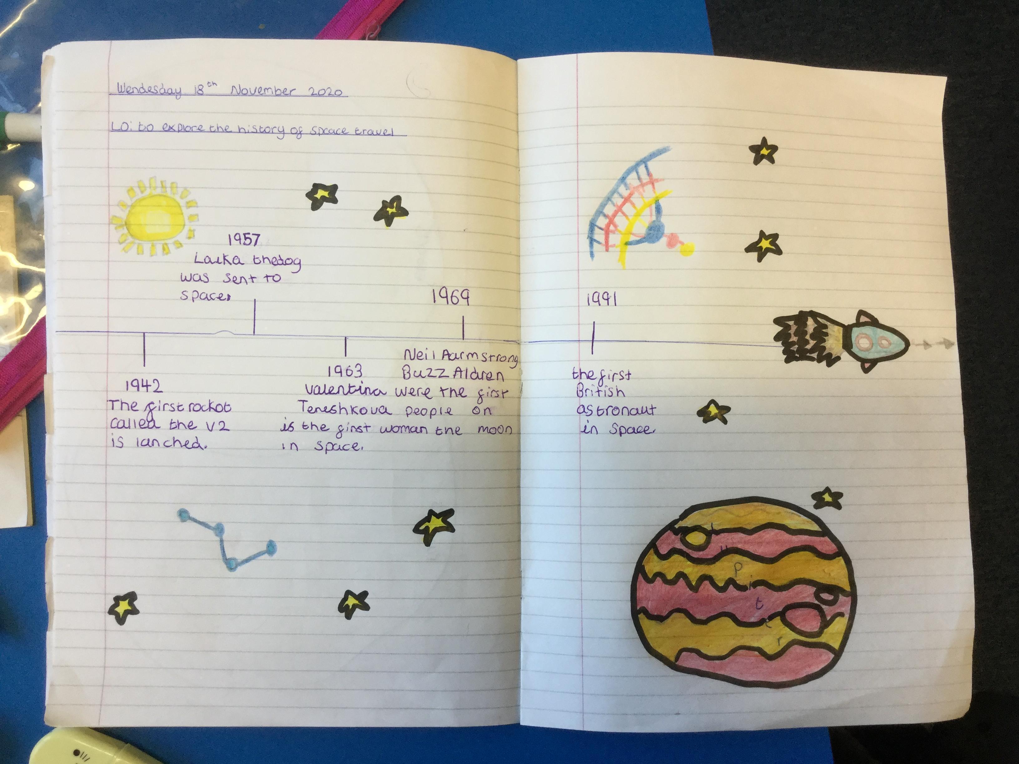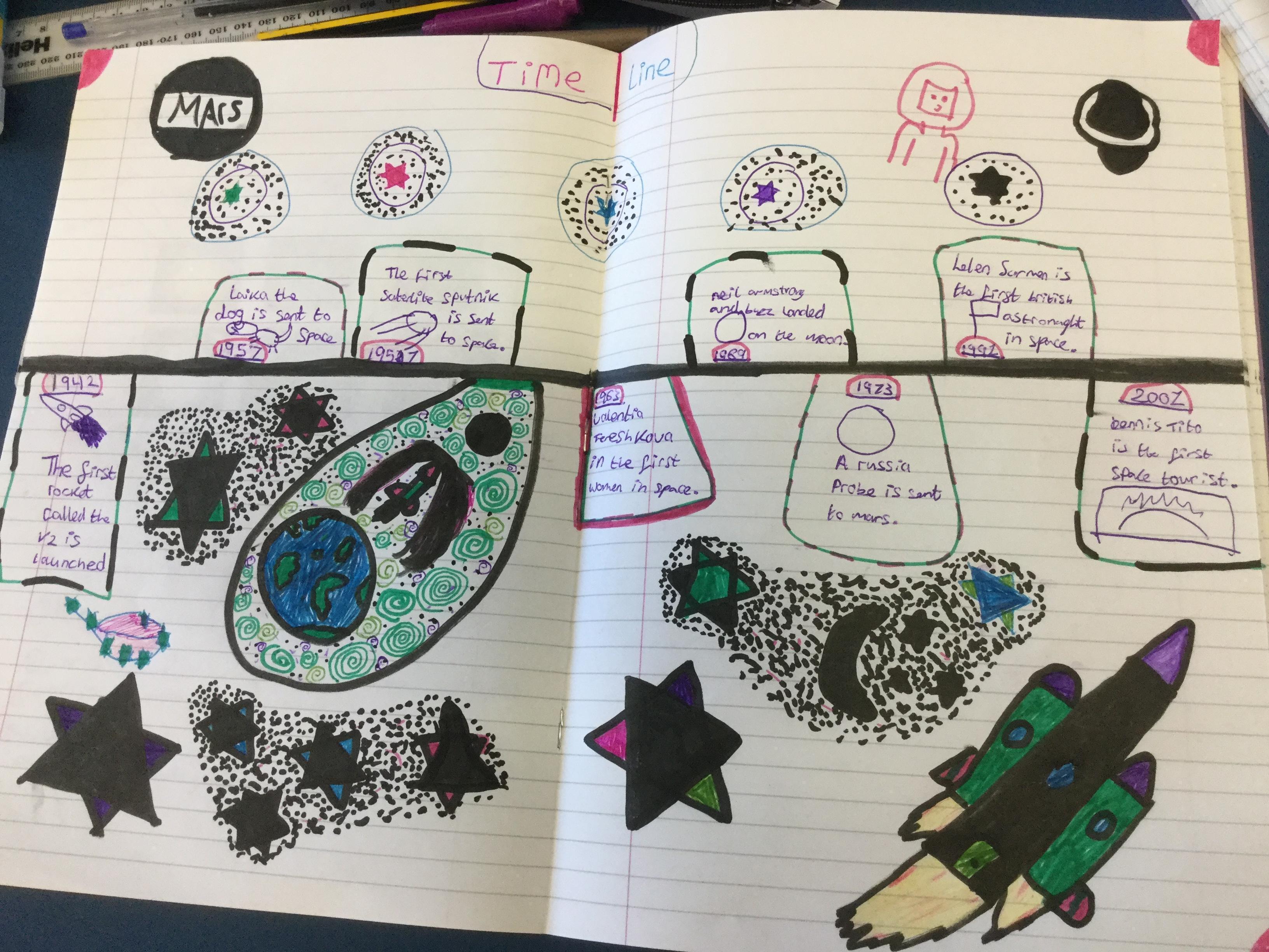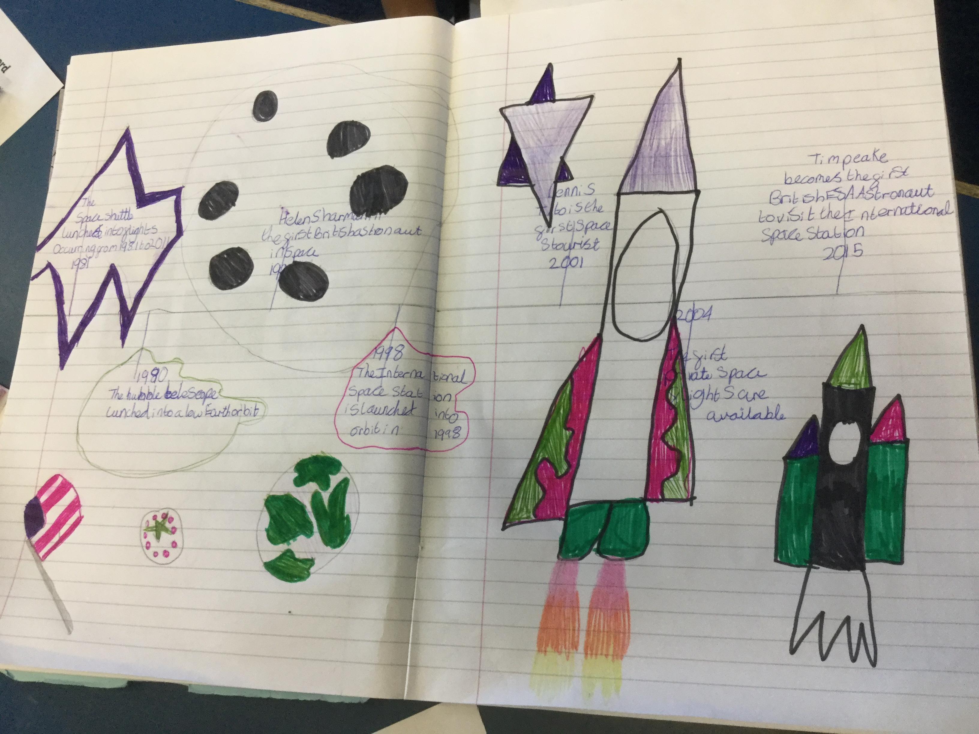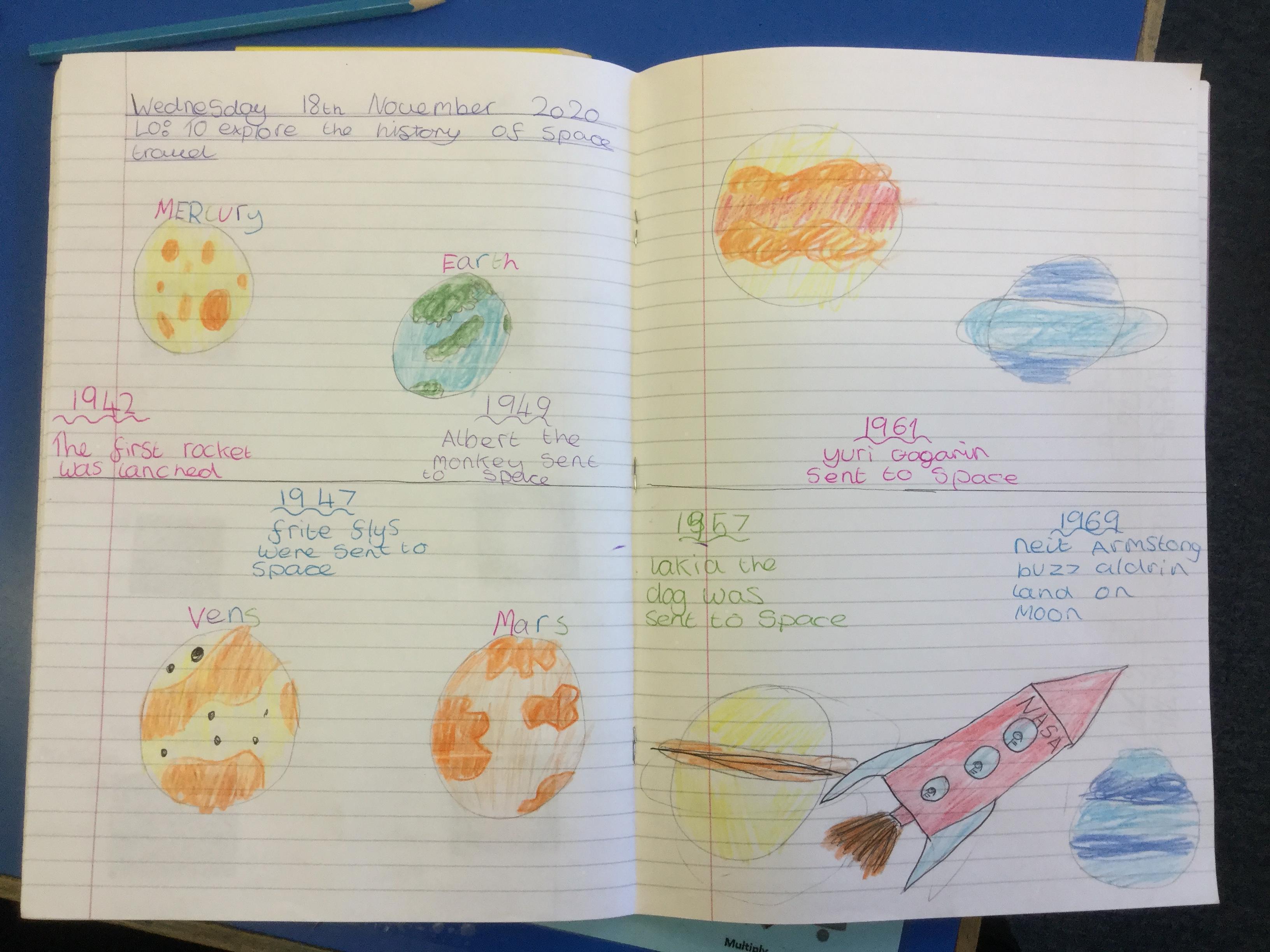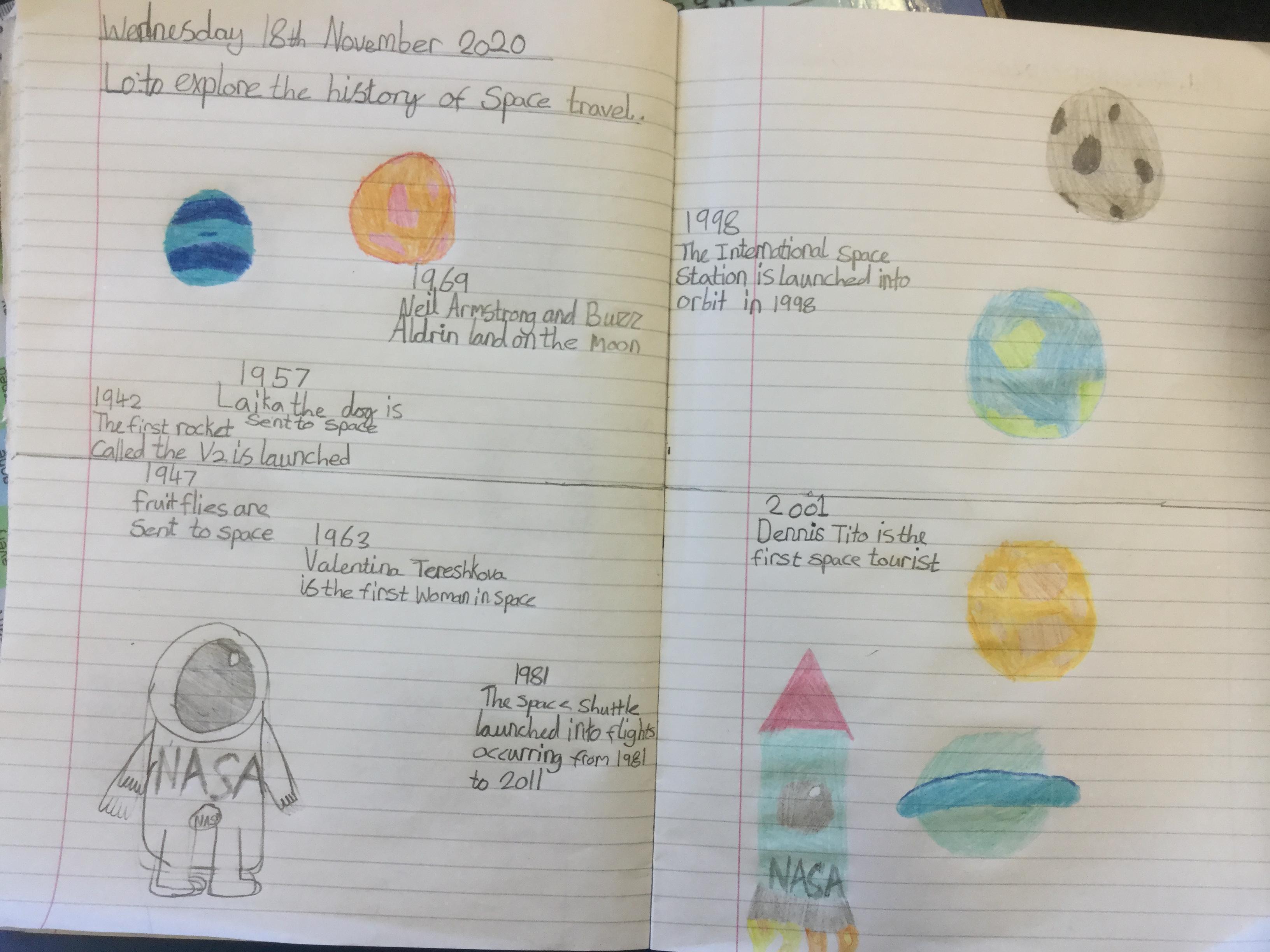 Today the children learnt about the history of space travel, discussing and ordering key events. The children then created their own timelines of events in any way they wished. The year groups efforts were amazing, books looking brilliant! Take a look at all their hard work.