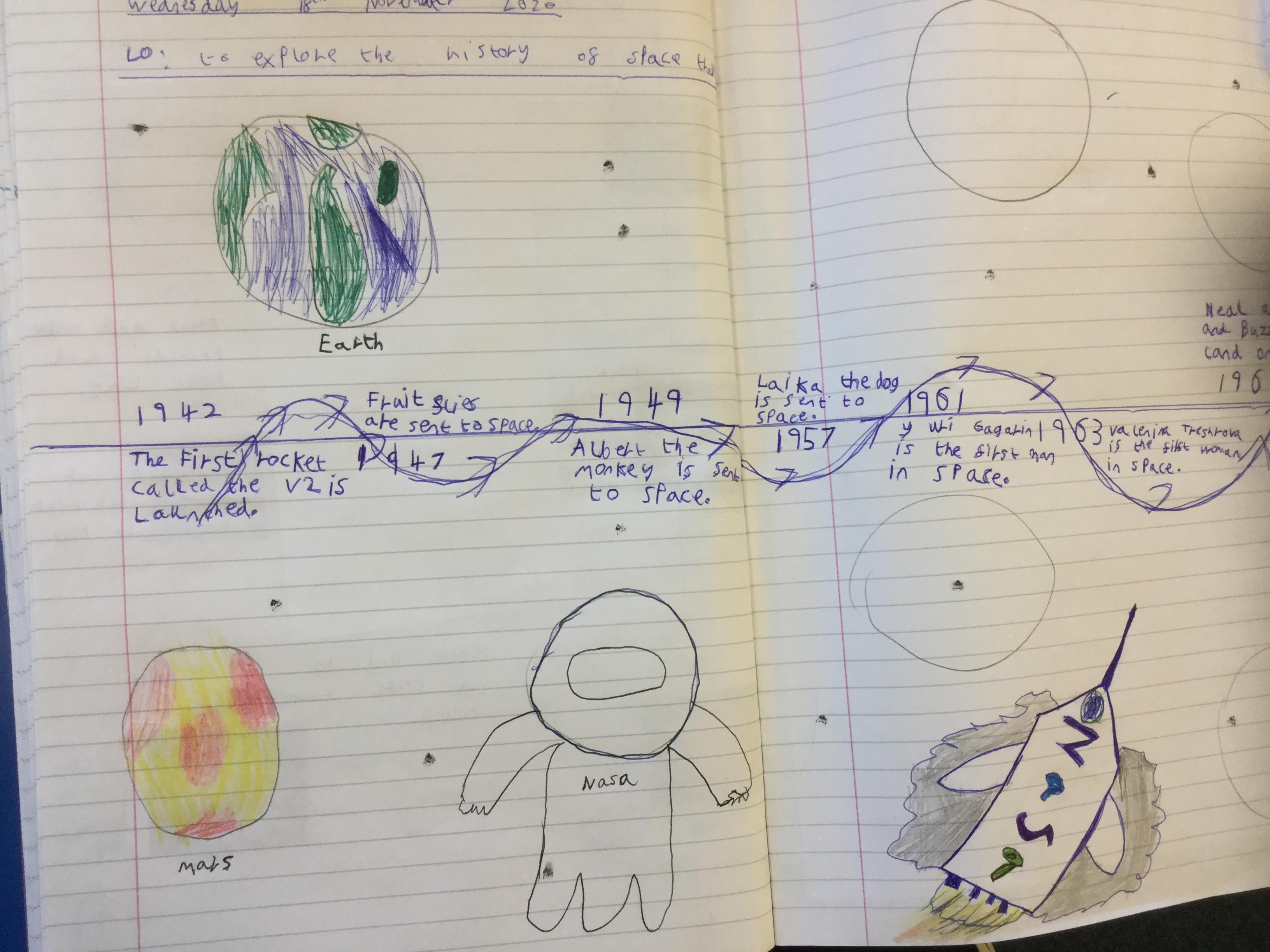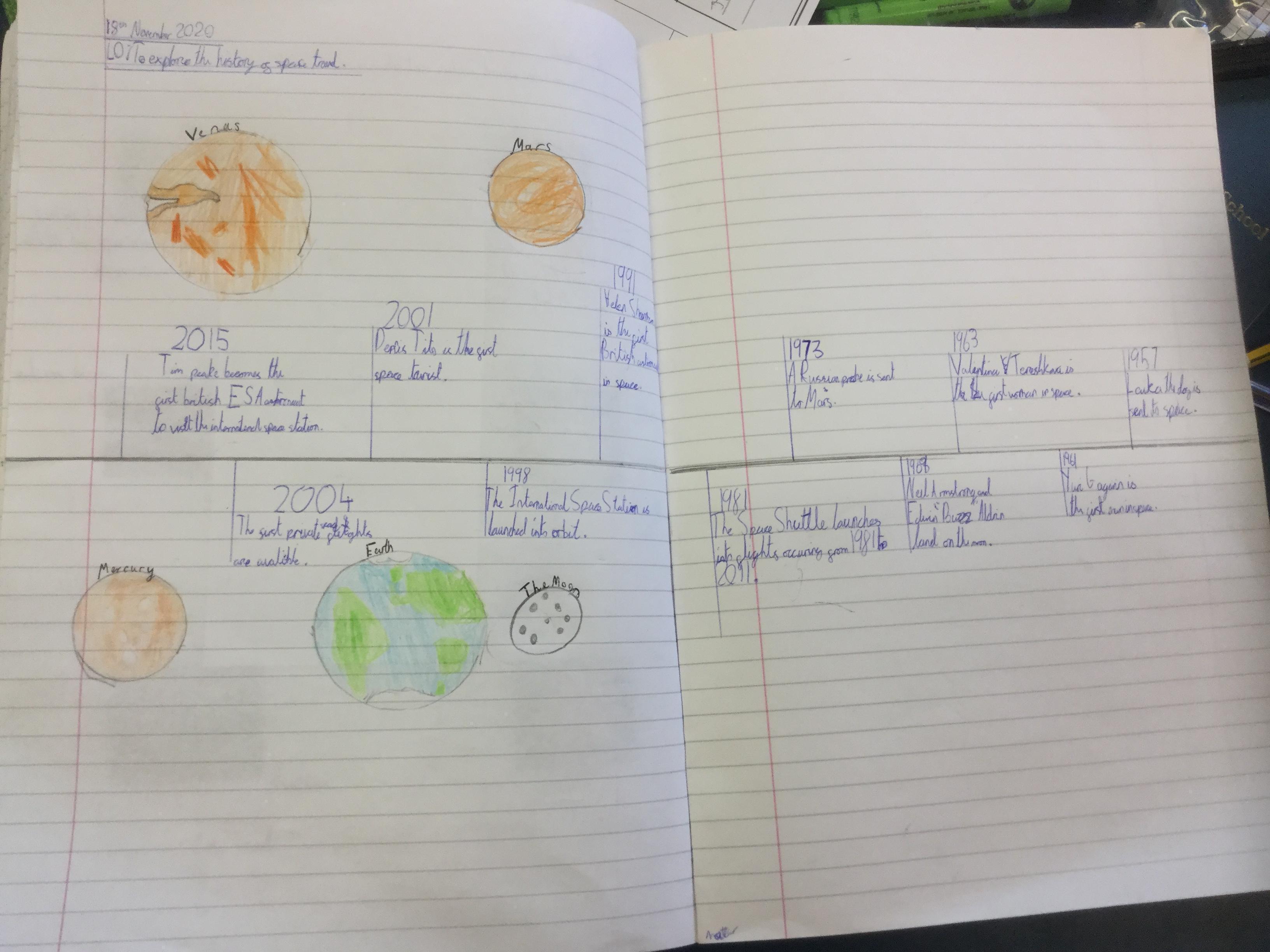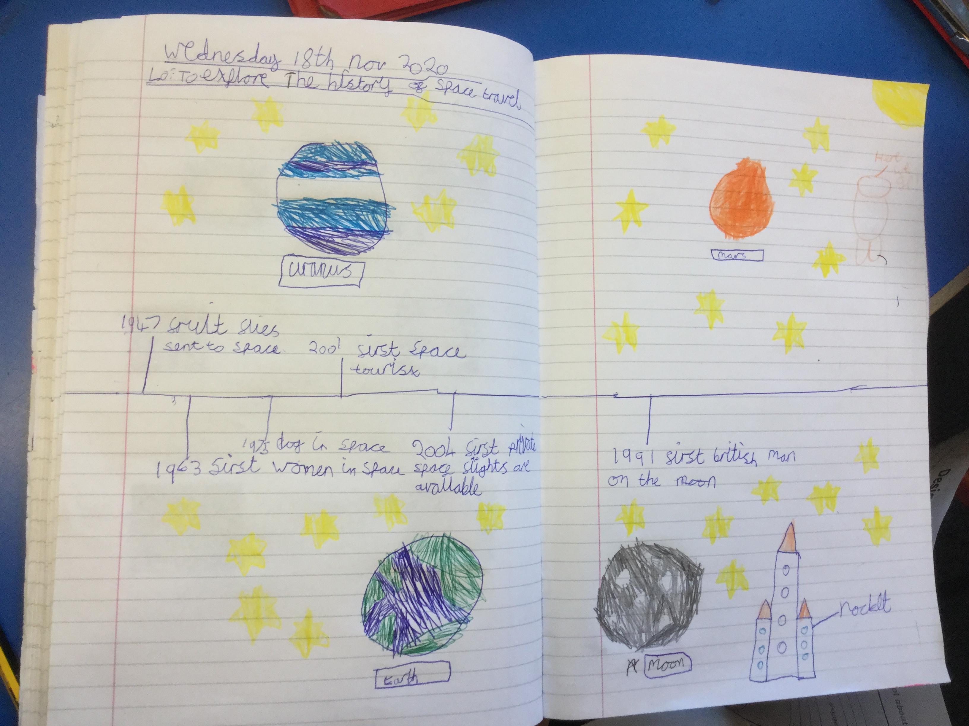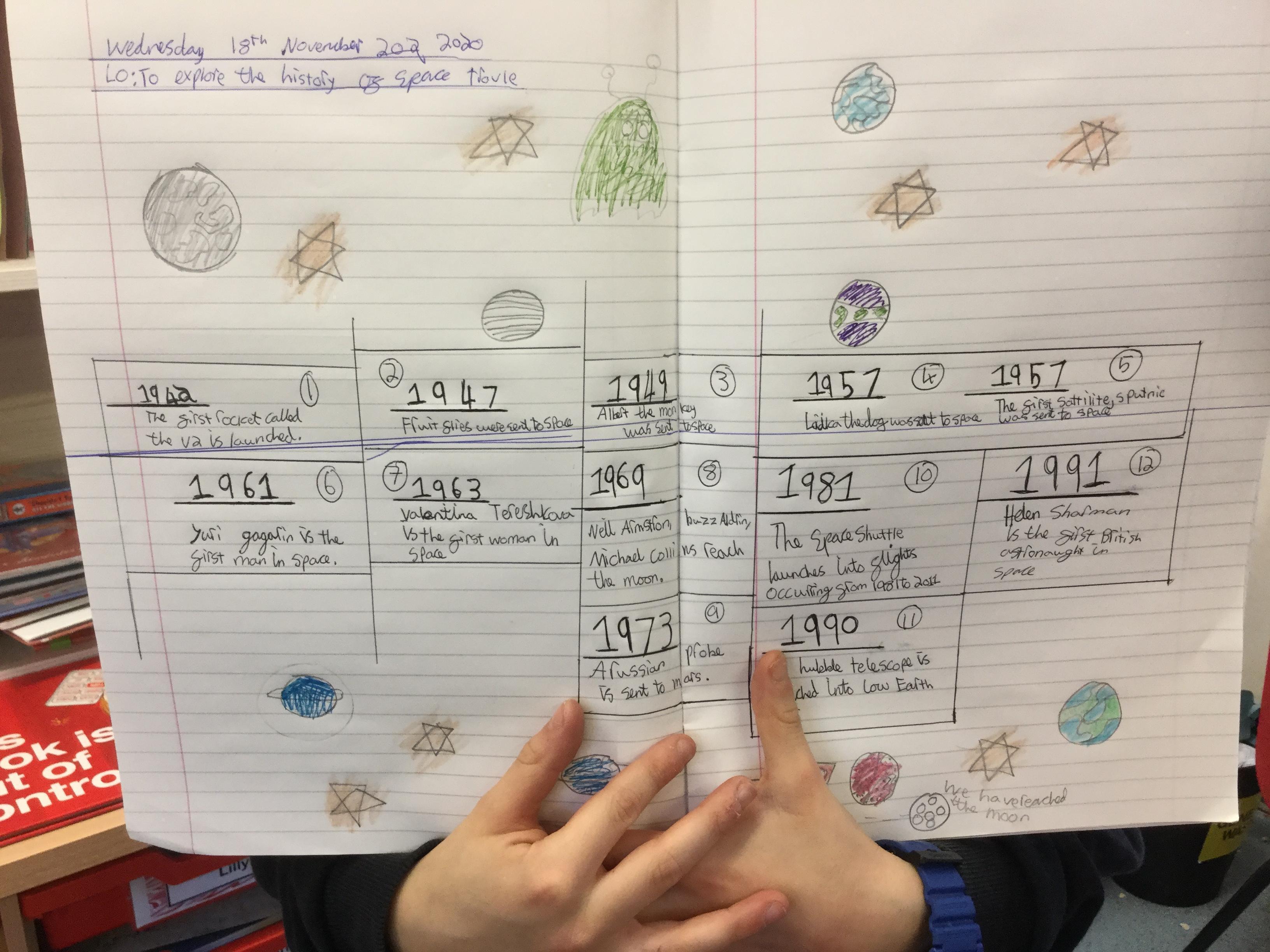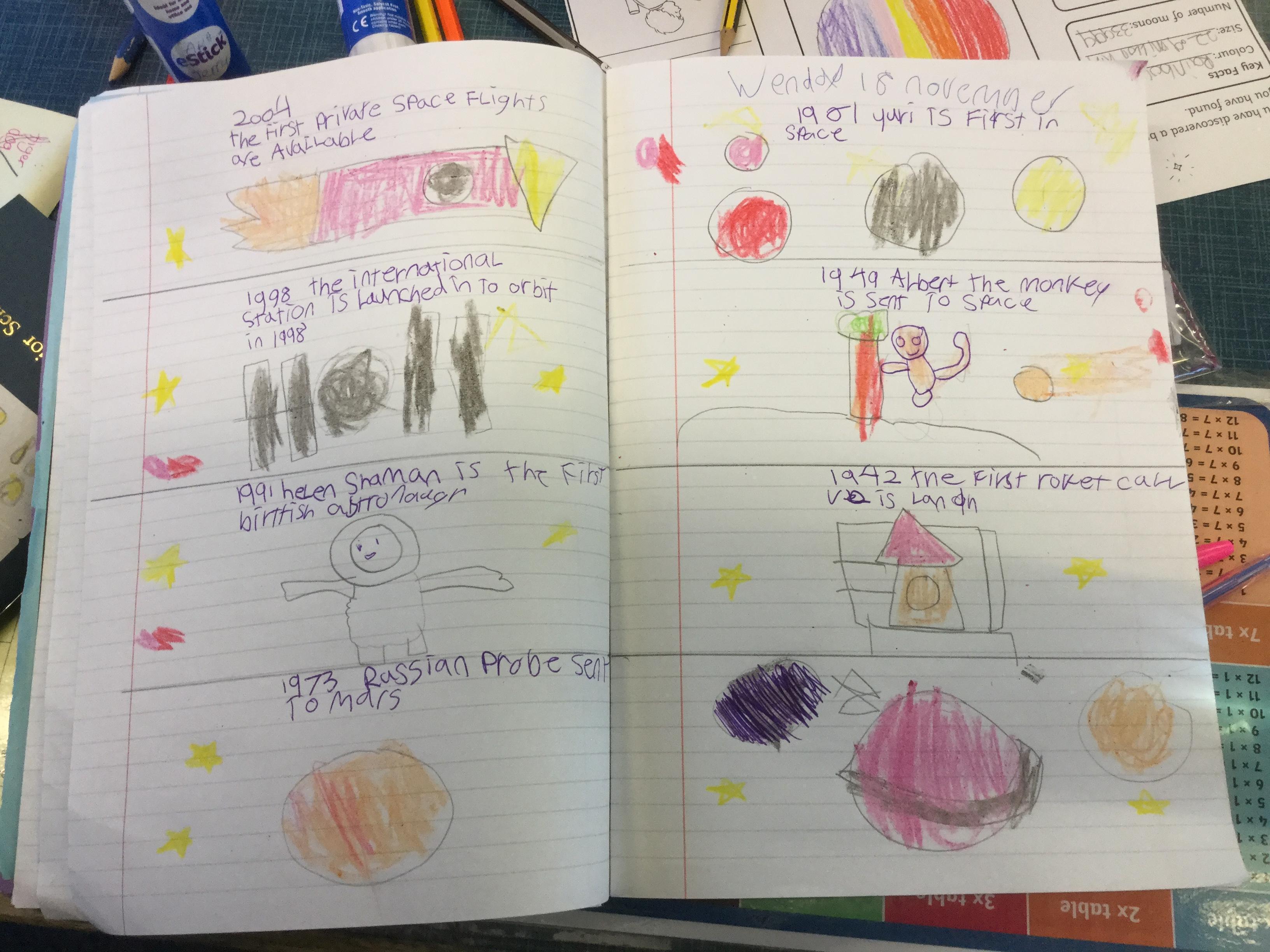 Today the children learnt about the history of space travel, discussing and ordering key events. The children then created their own timelines of events in any way they wished. The year groups efforts were amazing, books looking brilliant! Take a look at all their hard work.
