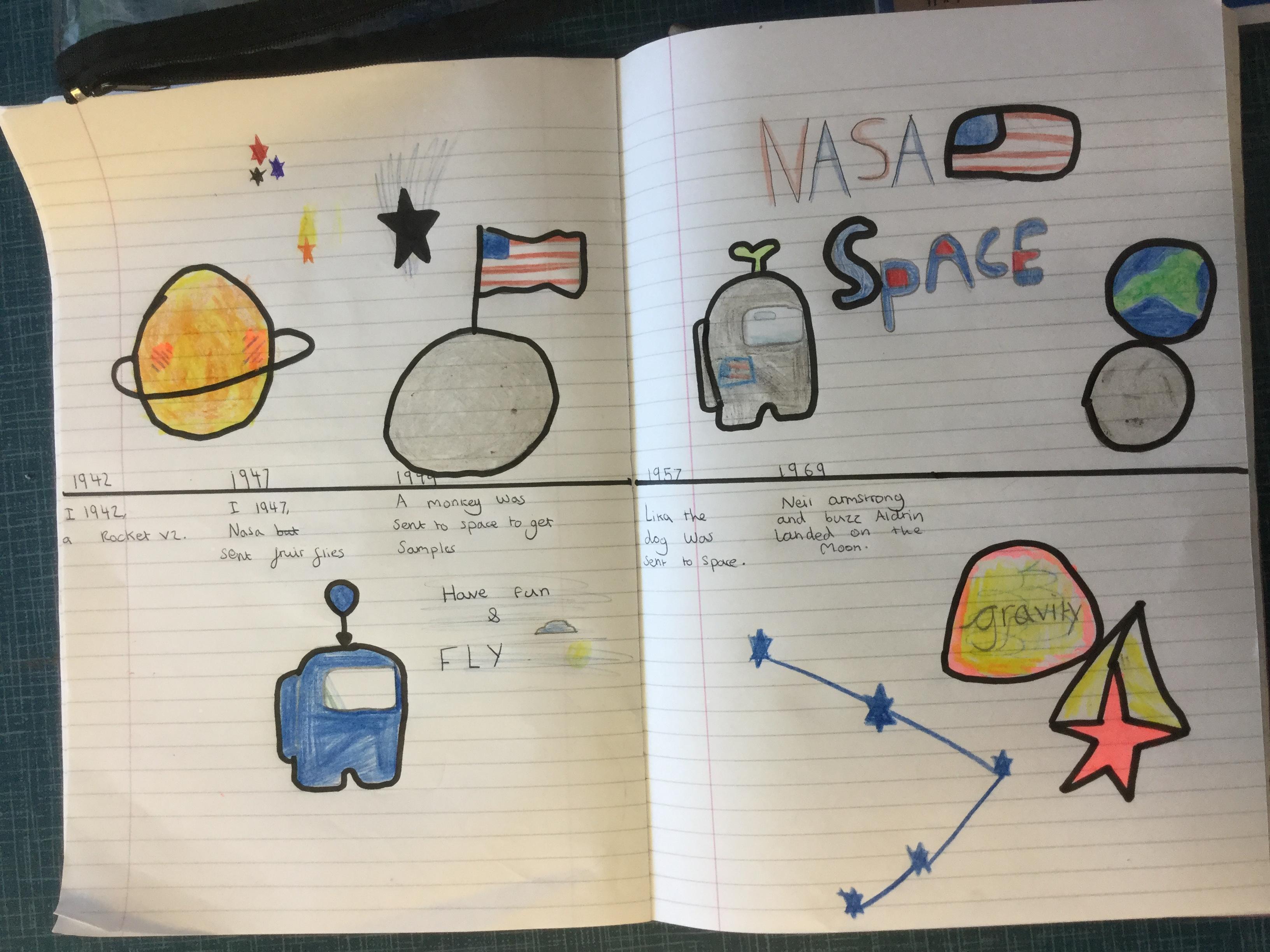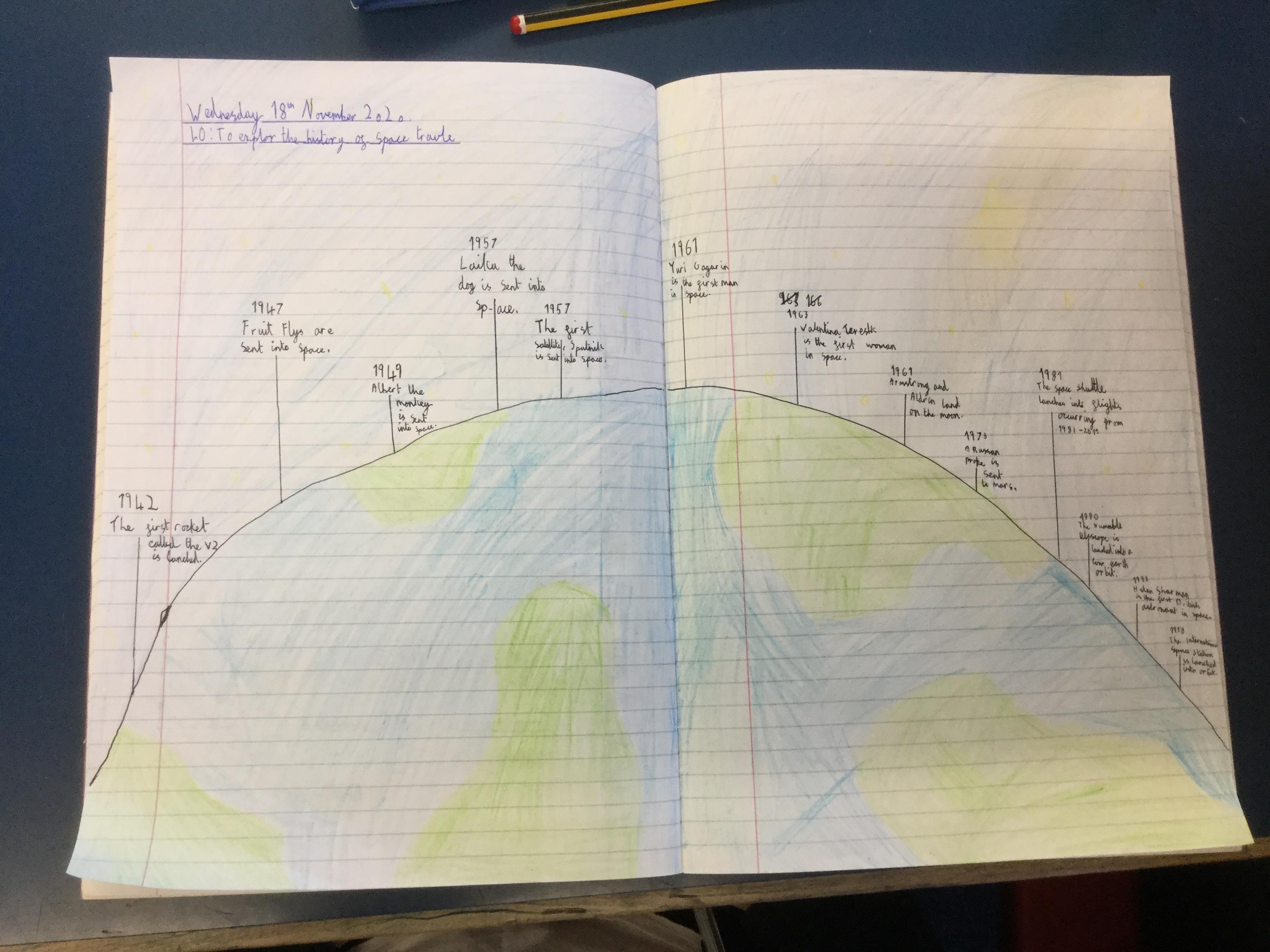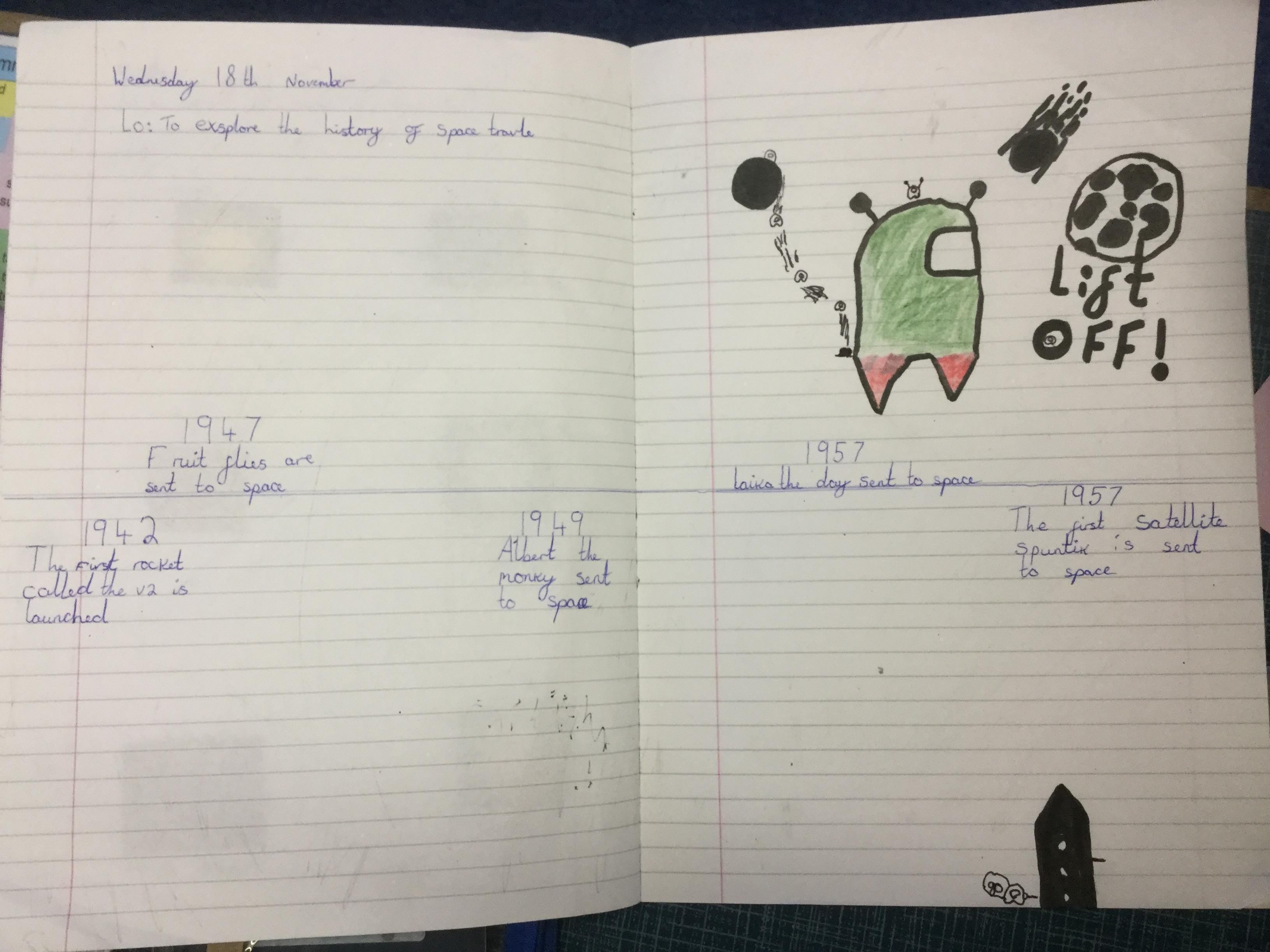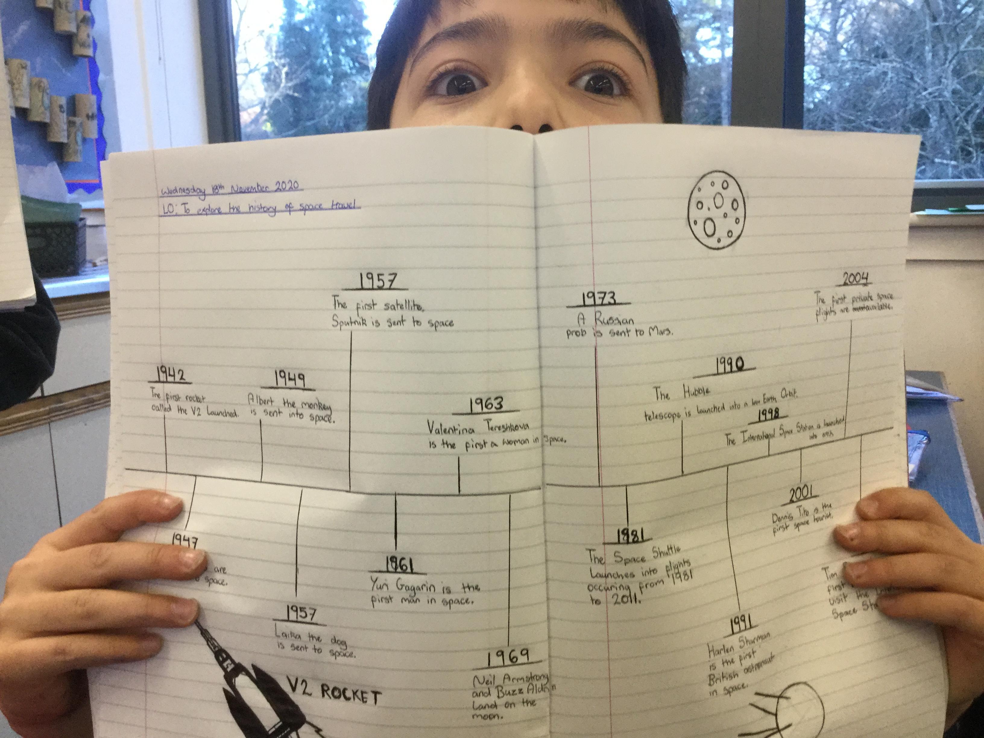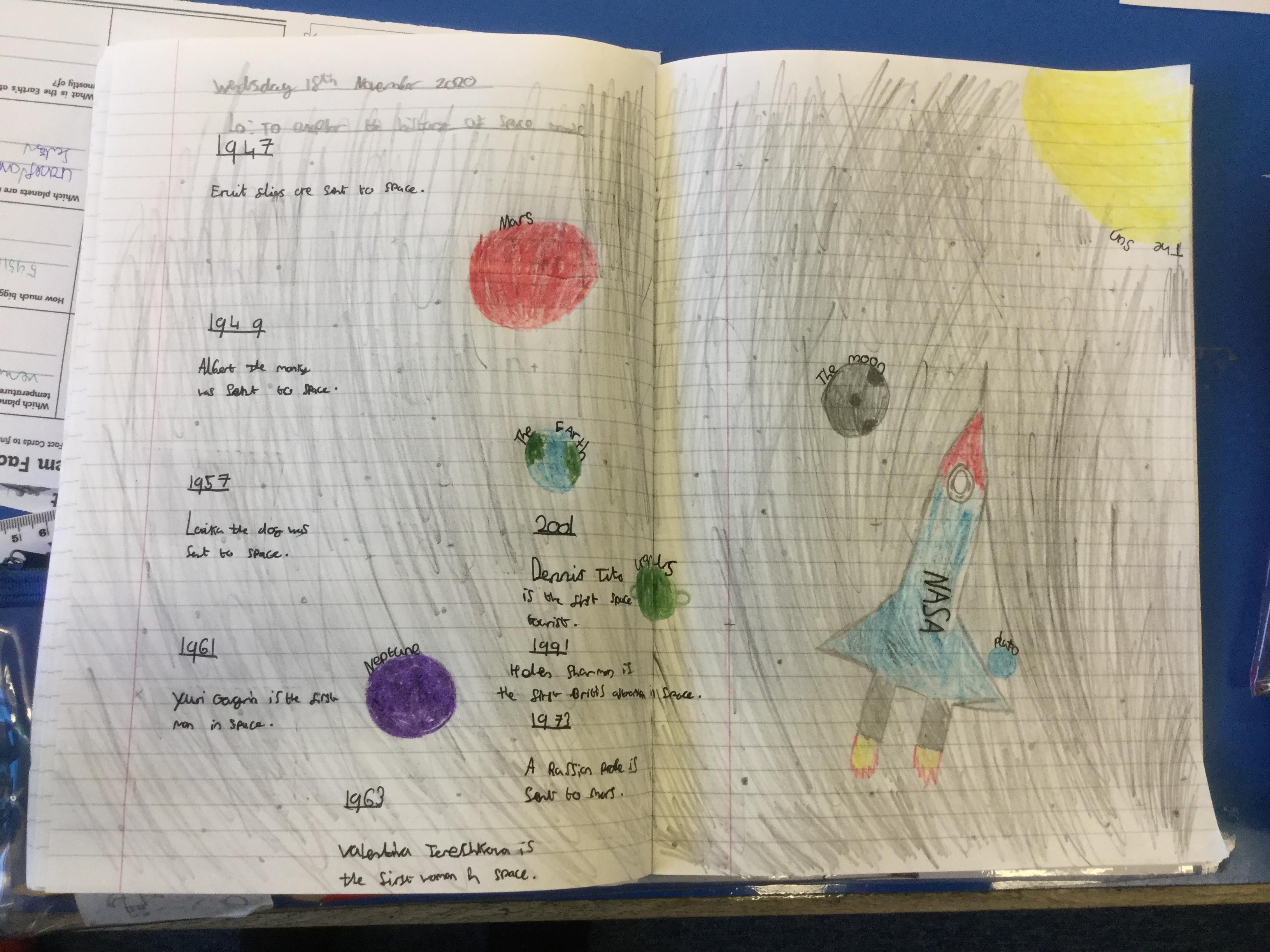 Today the children learnt about the history of space travel, discussing and ordering key events. The children then created their own timelines of events in any way they wished. The year groups efforts were amazing, books looking brilliant! Take a look at all their hard work.