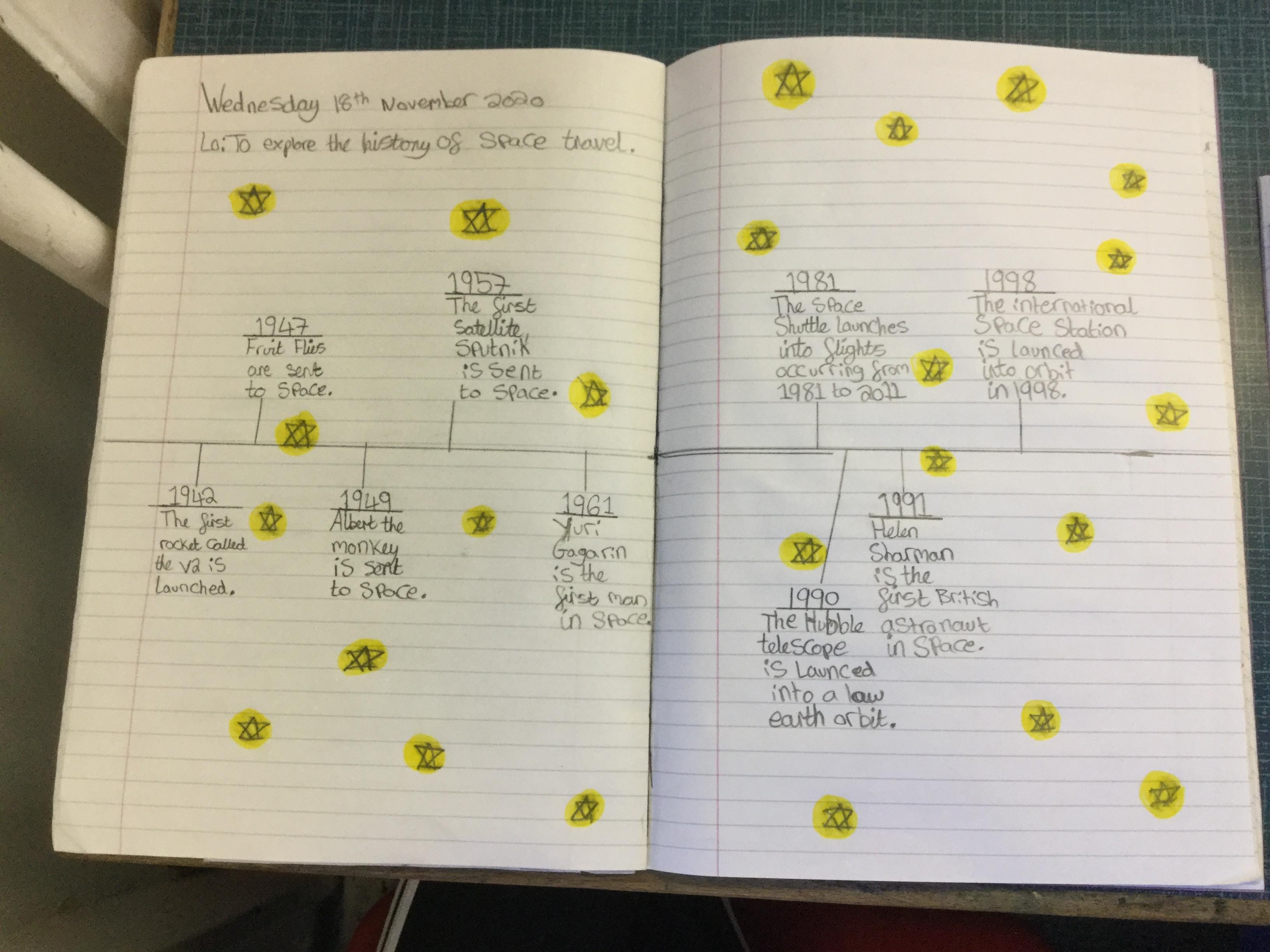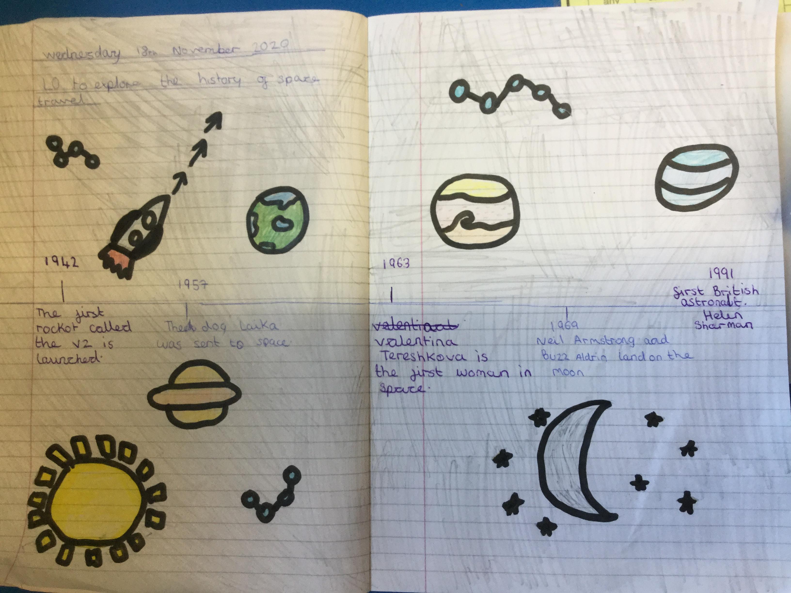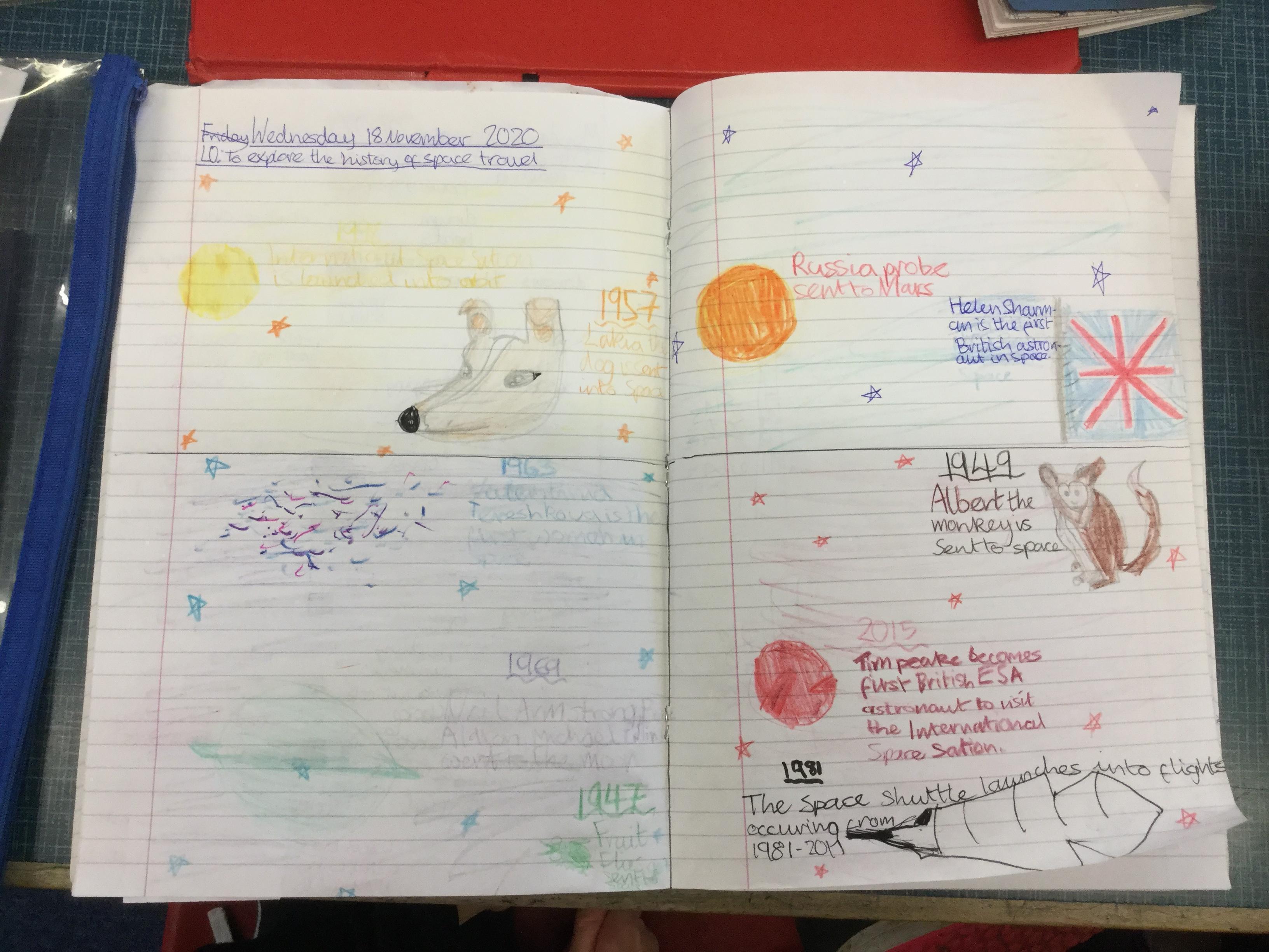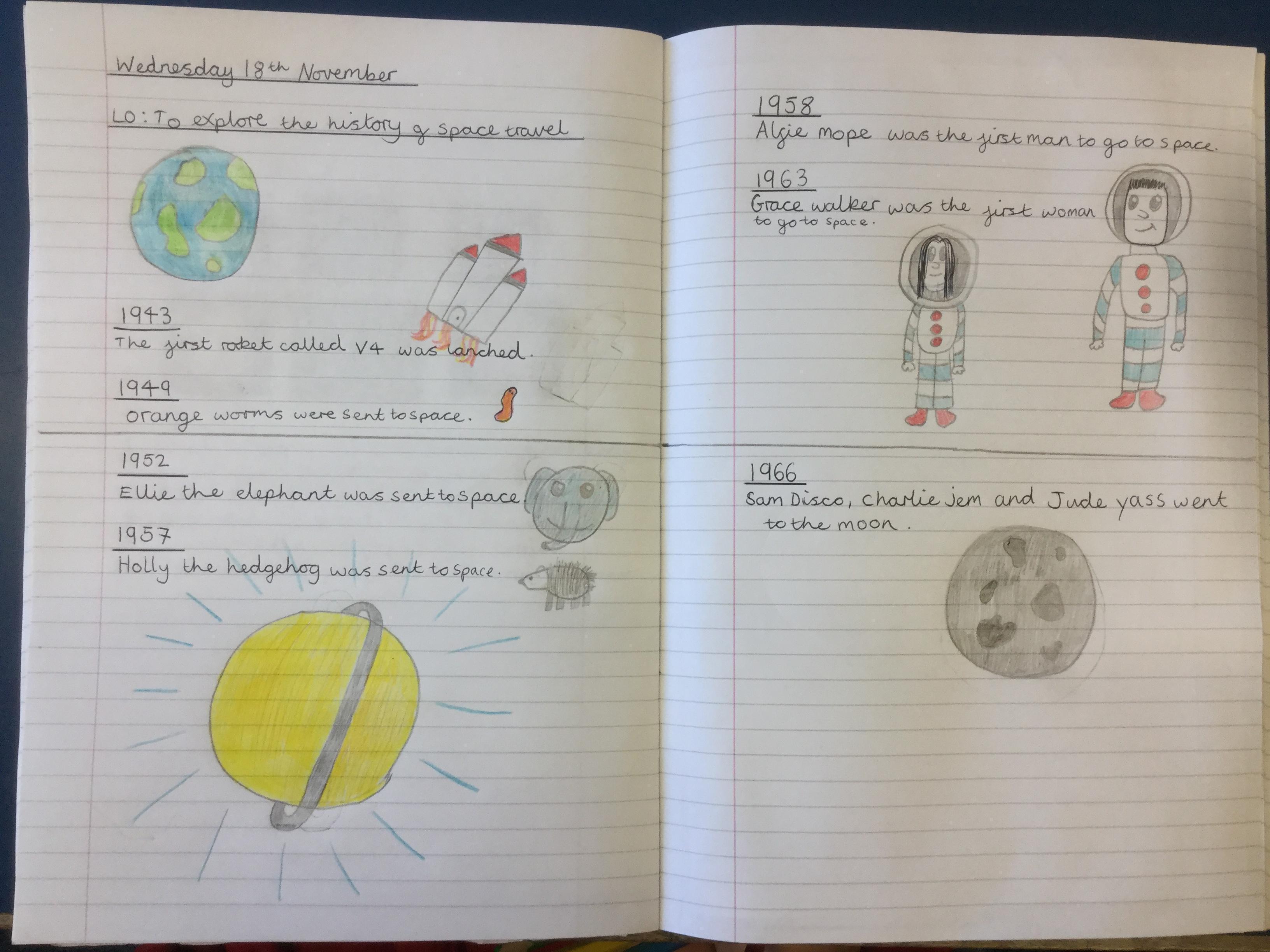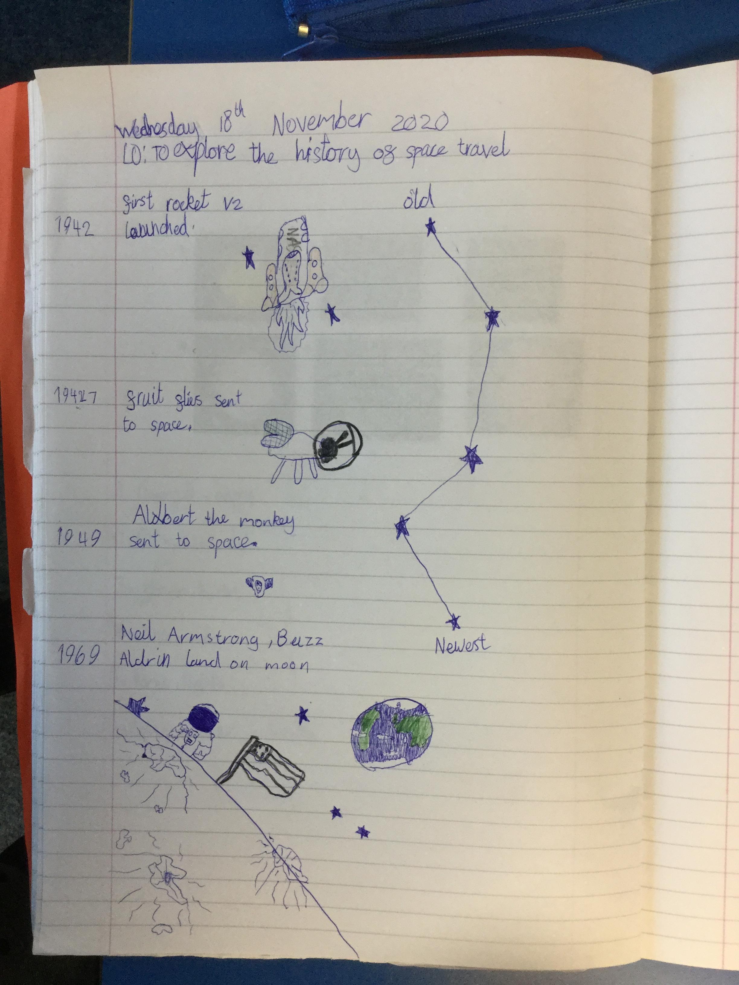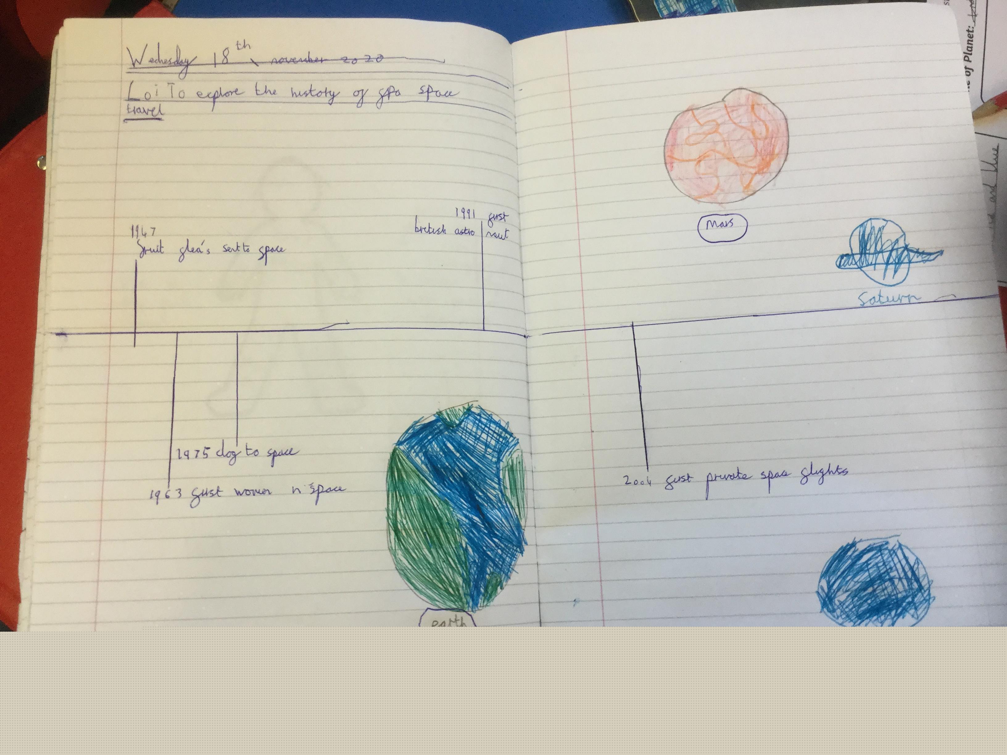Today the children learnt about the history of space travel, discussing and ordering key events. The children then created their own timelines of events in any way they wished. The year groups efforts were amazing, books looking brilliant! Take a look at all their hard work.
