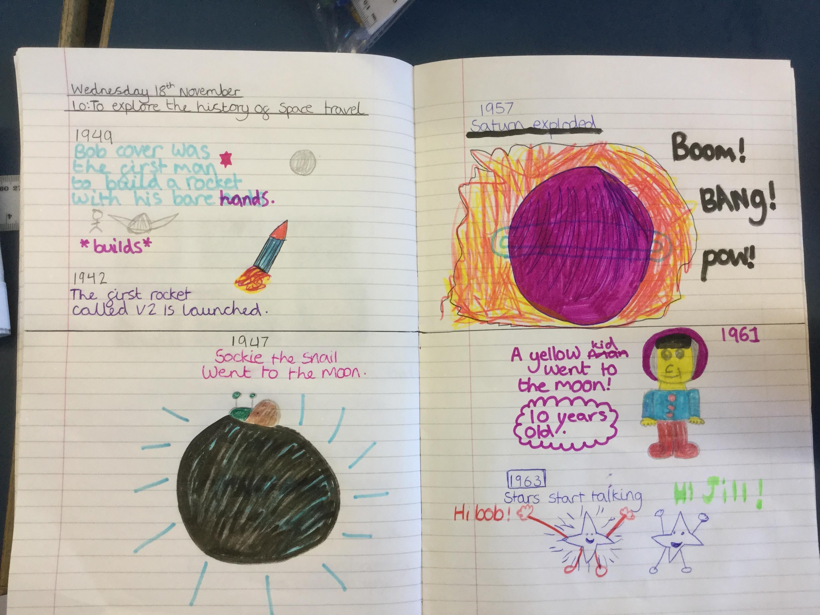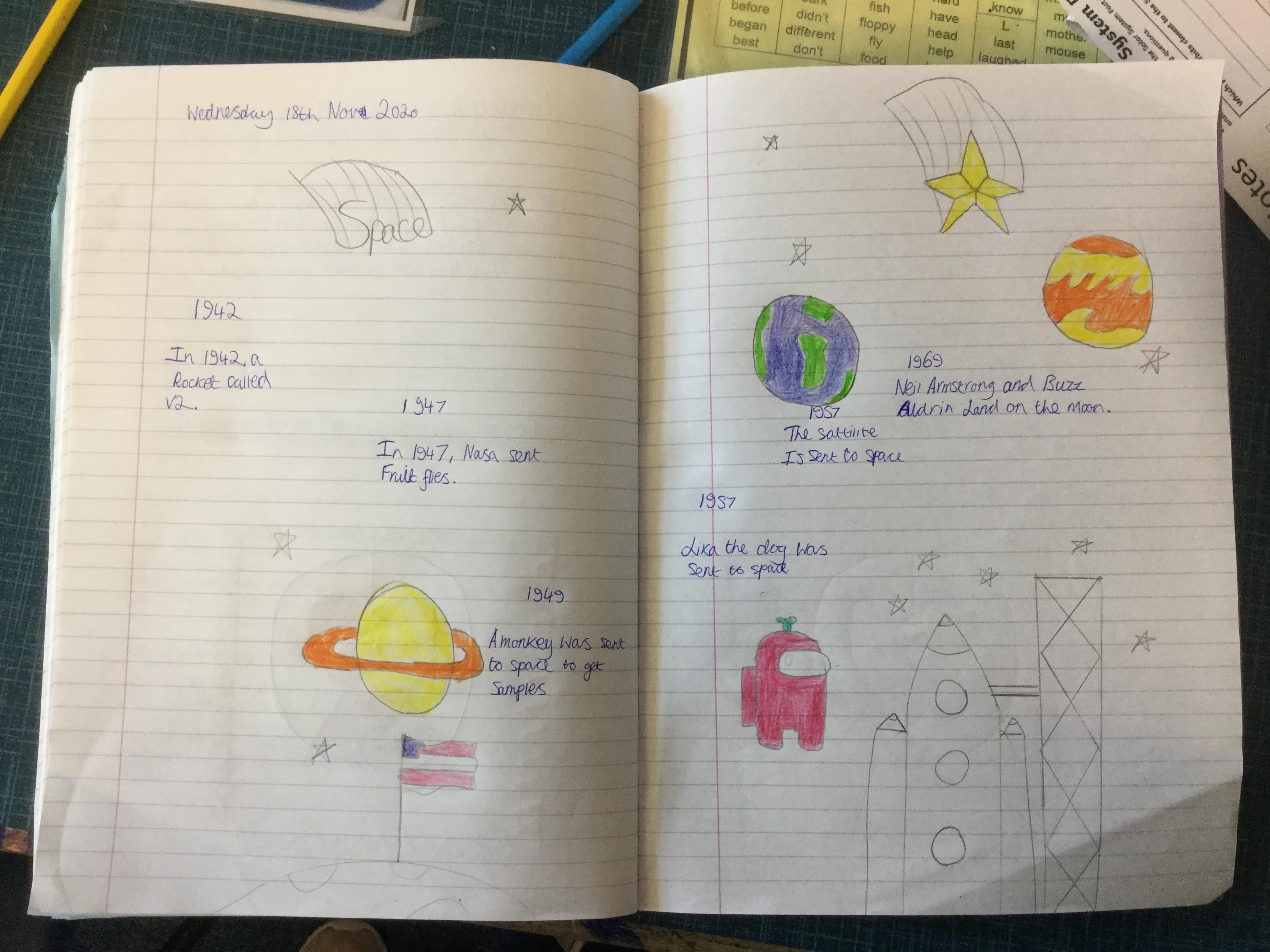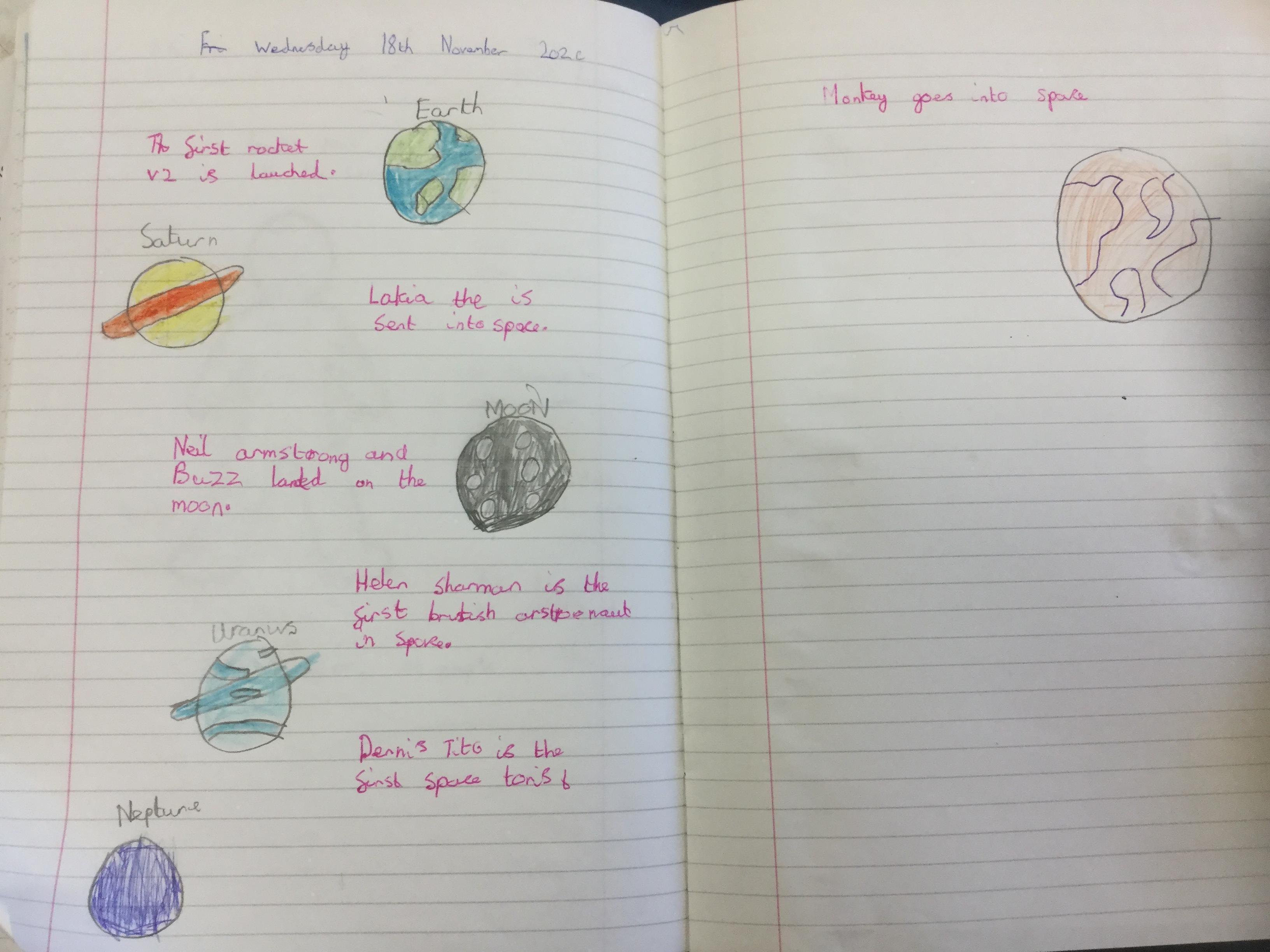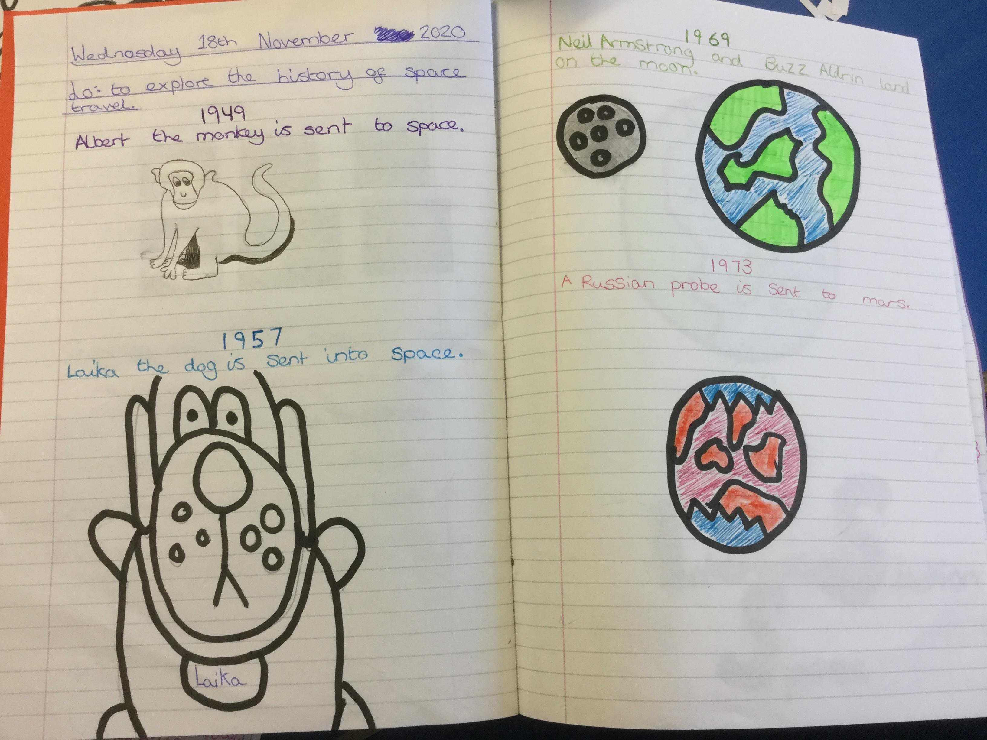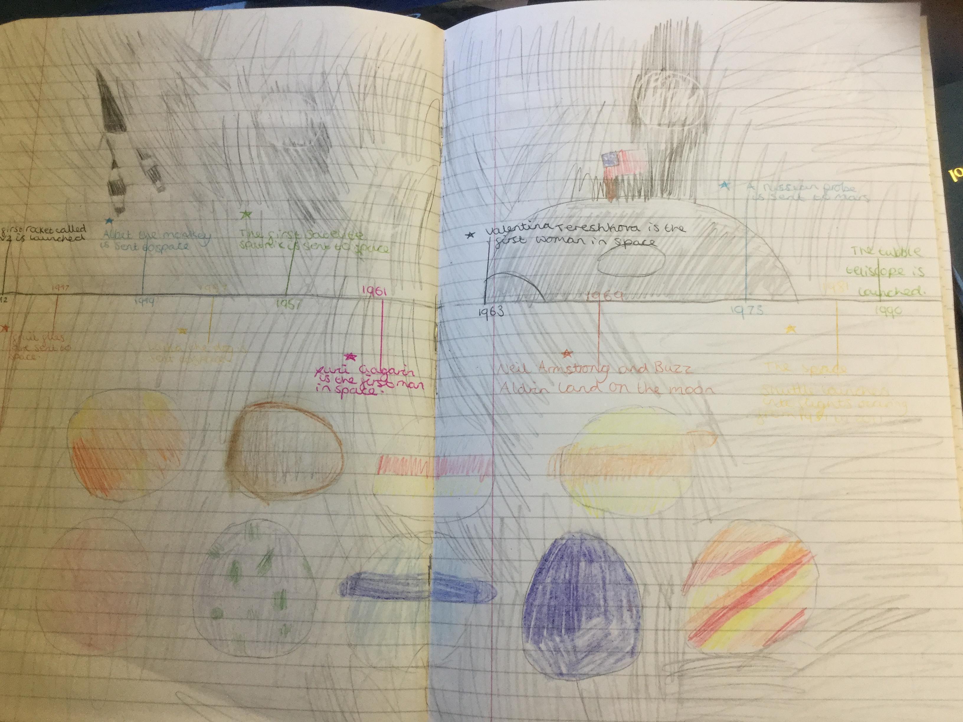 Today the children learnt about the history of space travel, discussing and ordering key events. The children then created their own timelines of events in any way they wished. The year groups efforts were amazing, books looking brilliant! Take a look at all their hard work.