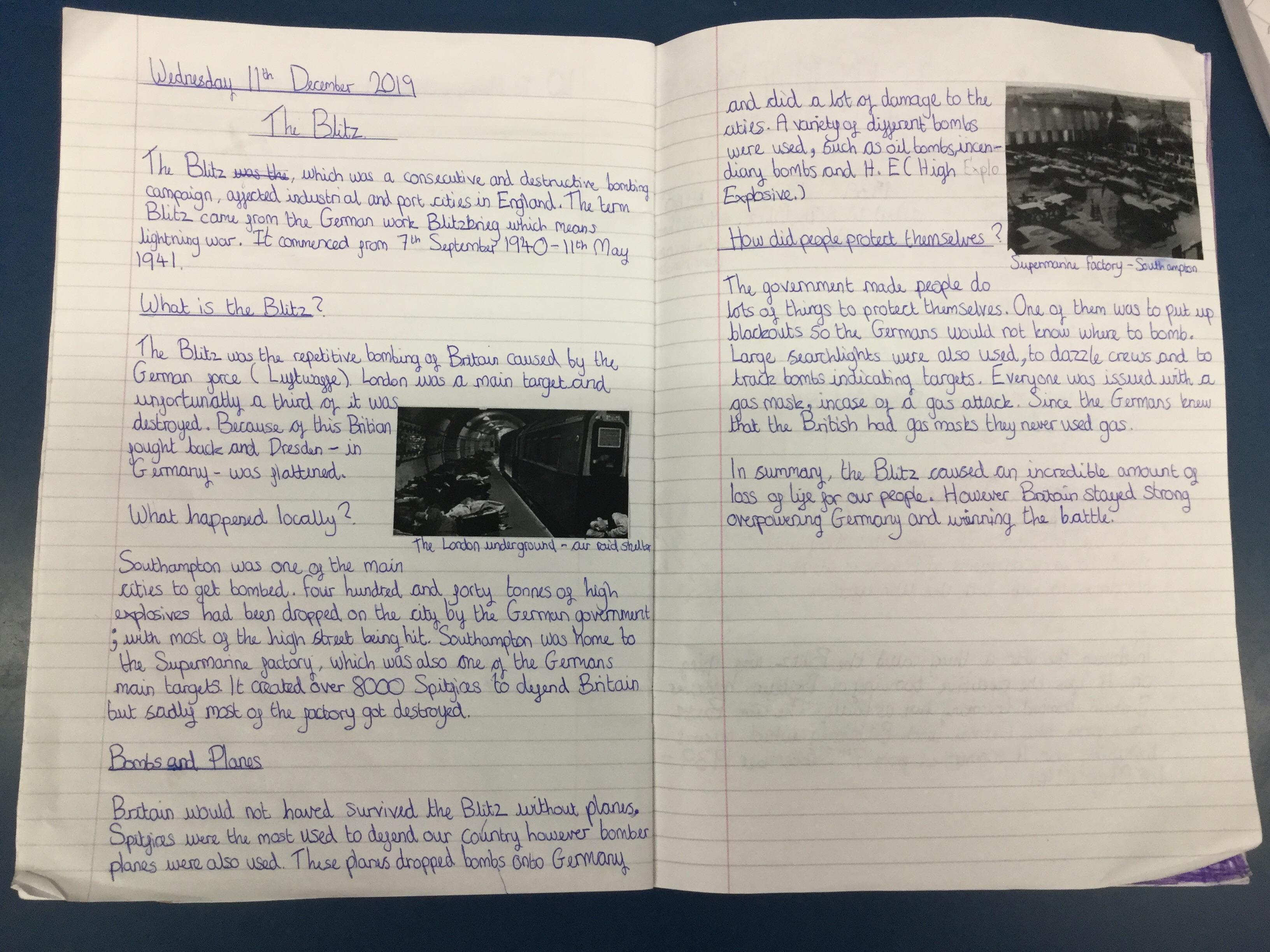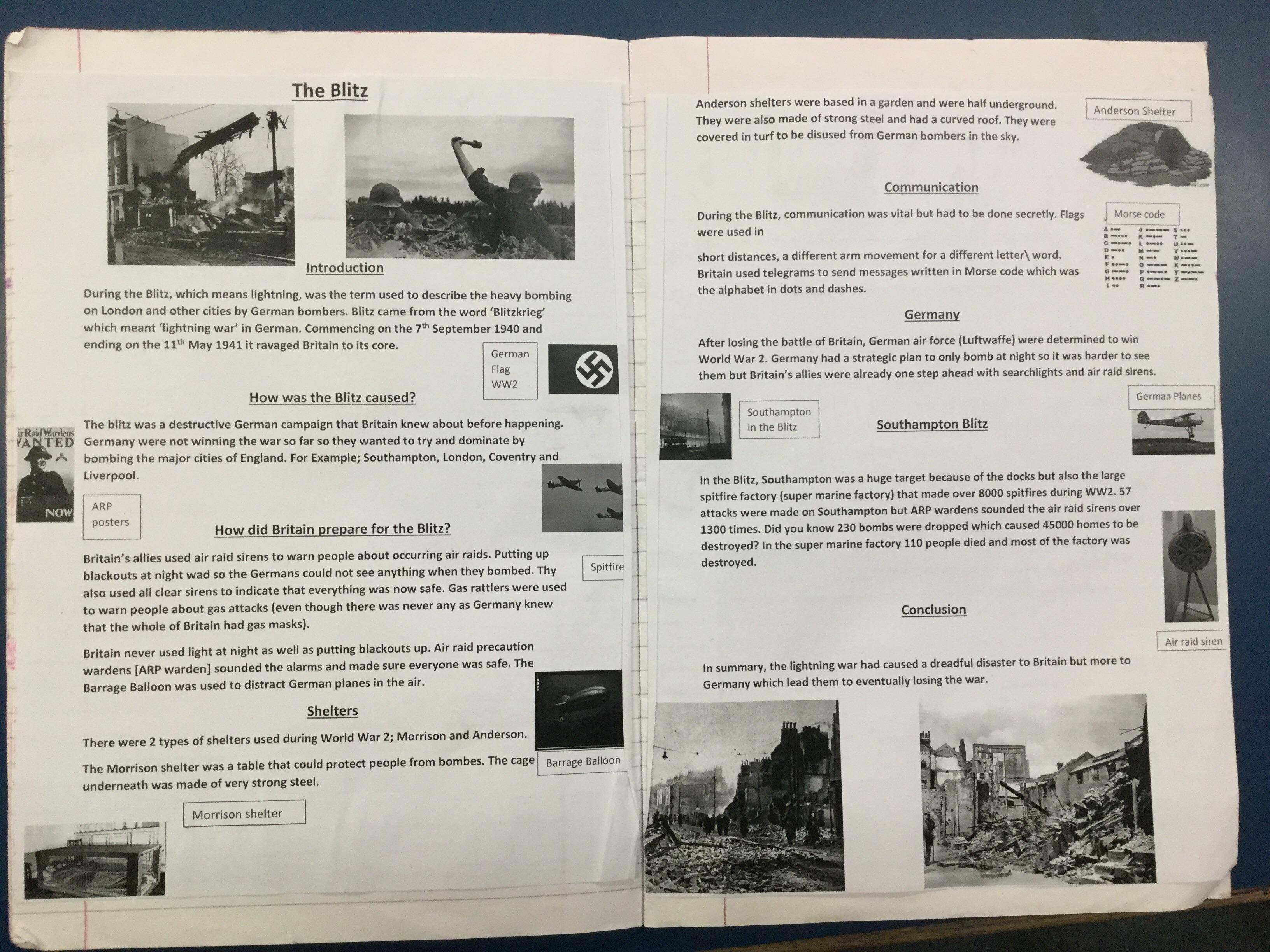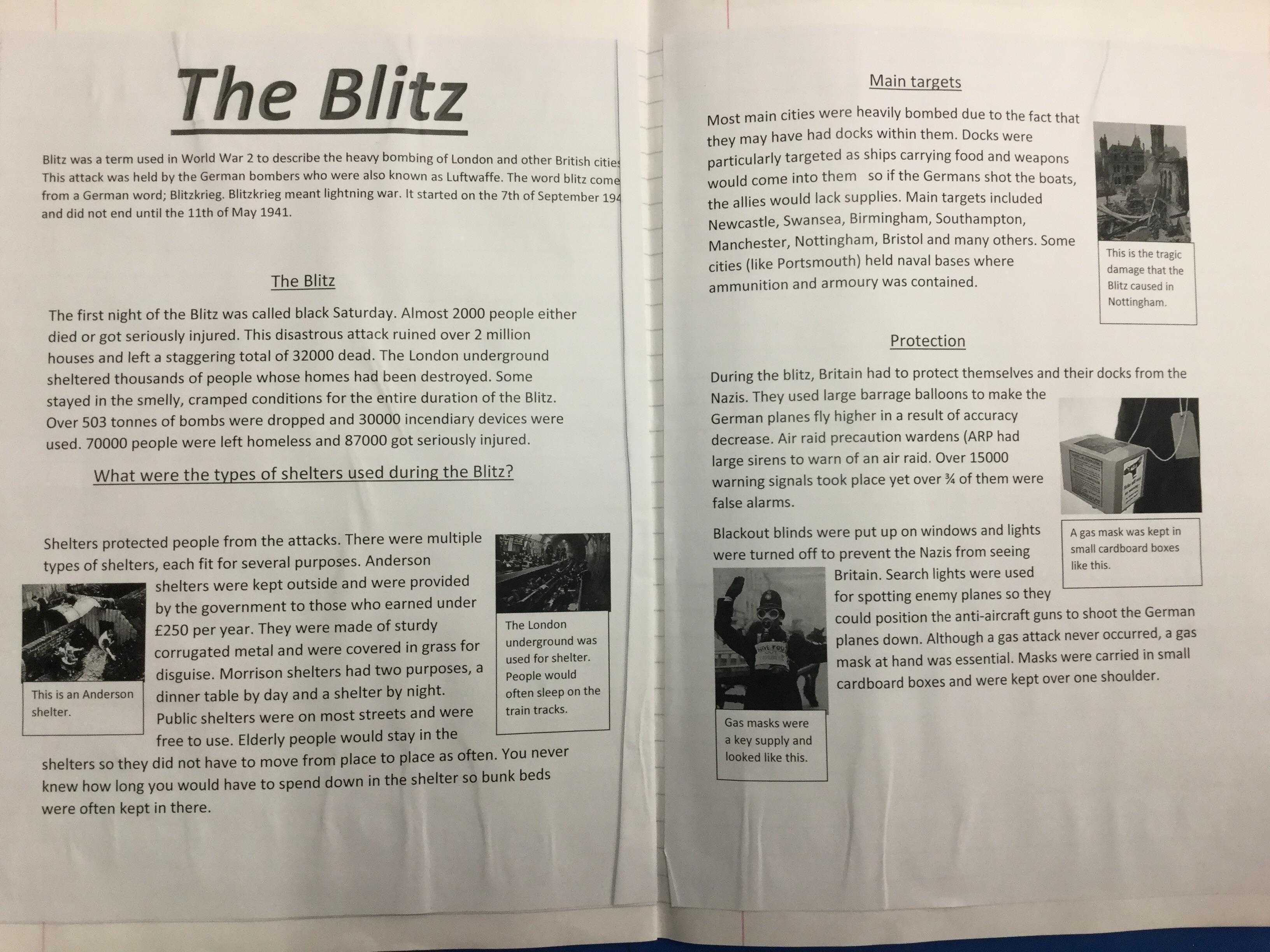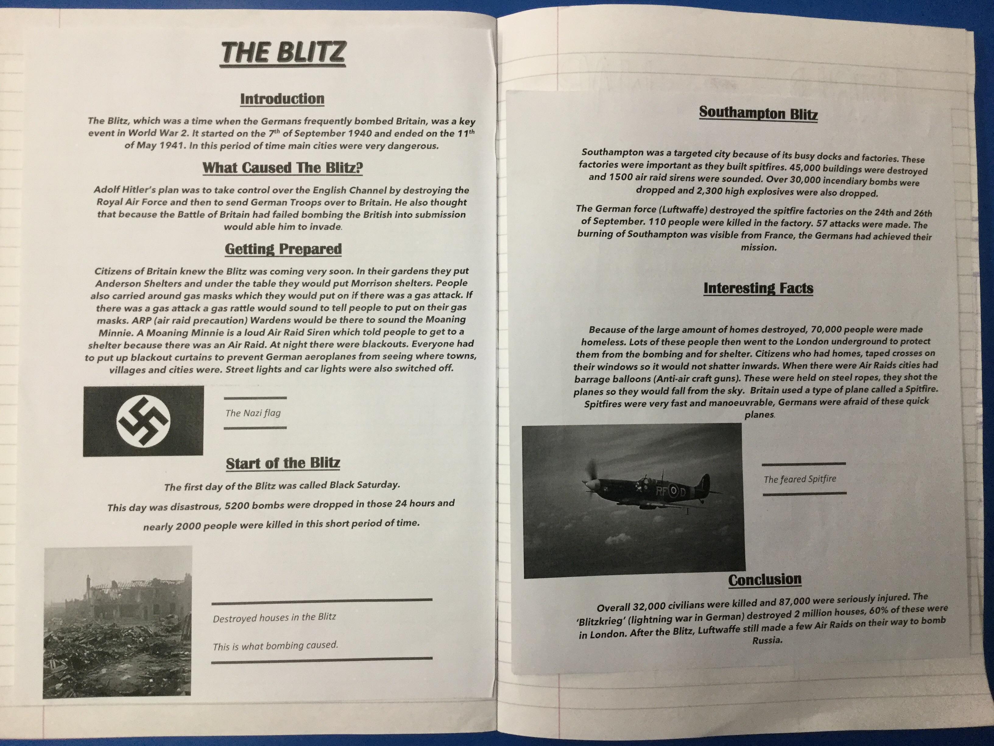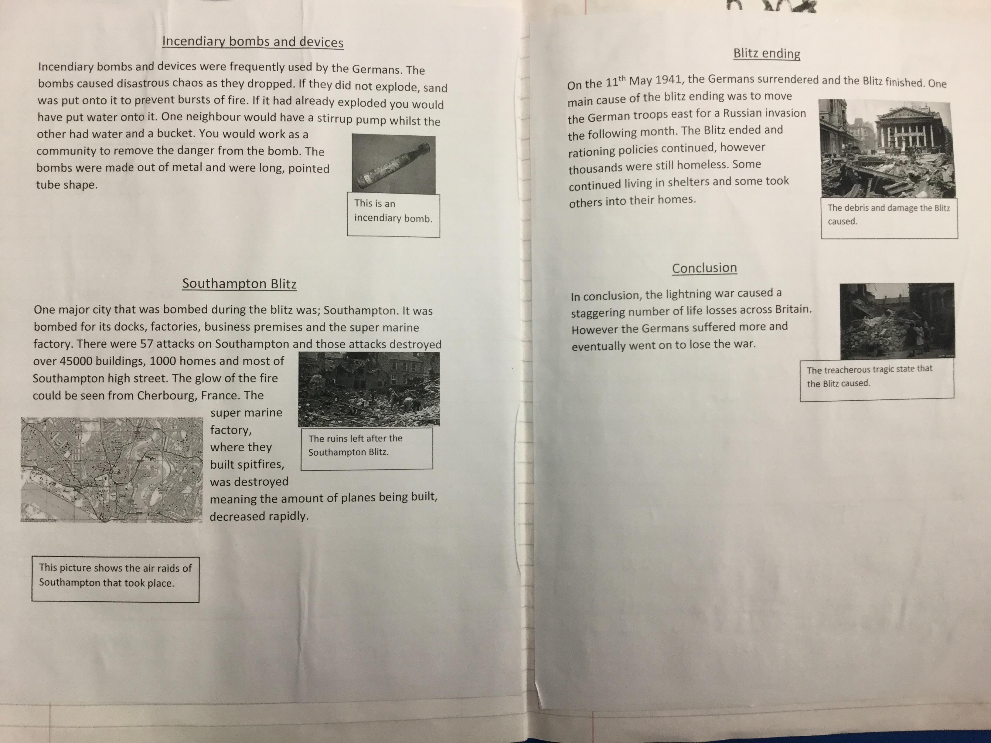 The children, using knowledge gained from Hooke Court, The Tank Musuem, and Fort Nelson as well as independent and guided research produced non chronological reports on the effects of the Blitz on Britain. They also research how the Blitz impacted the local community.