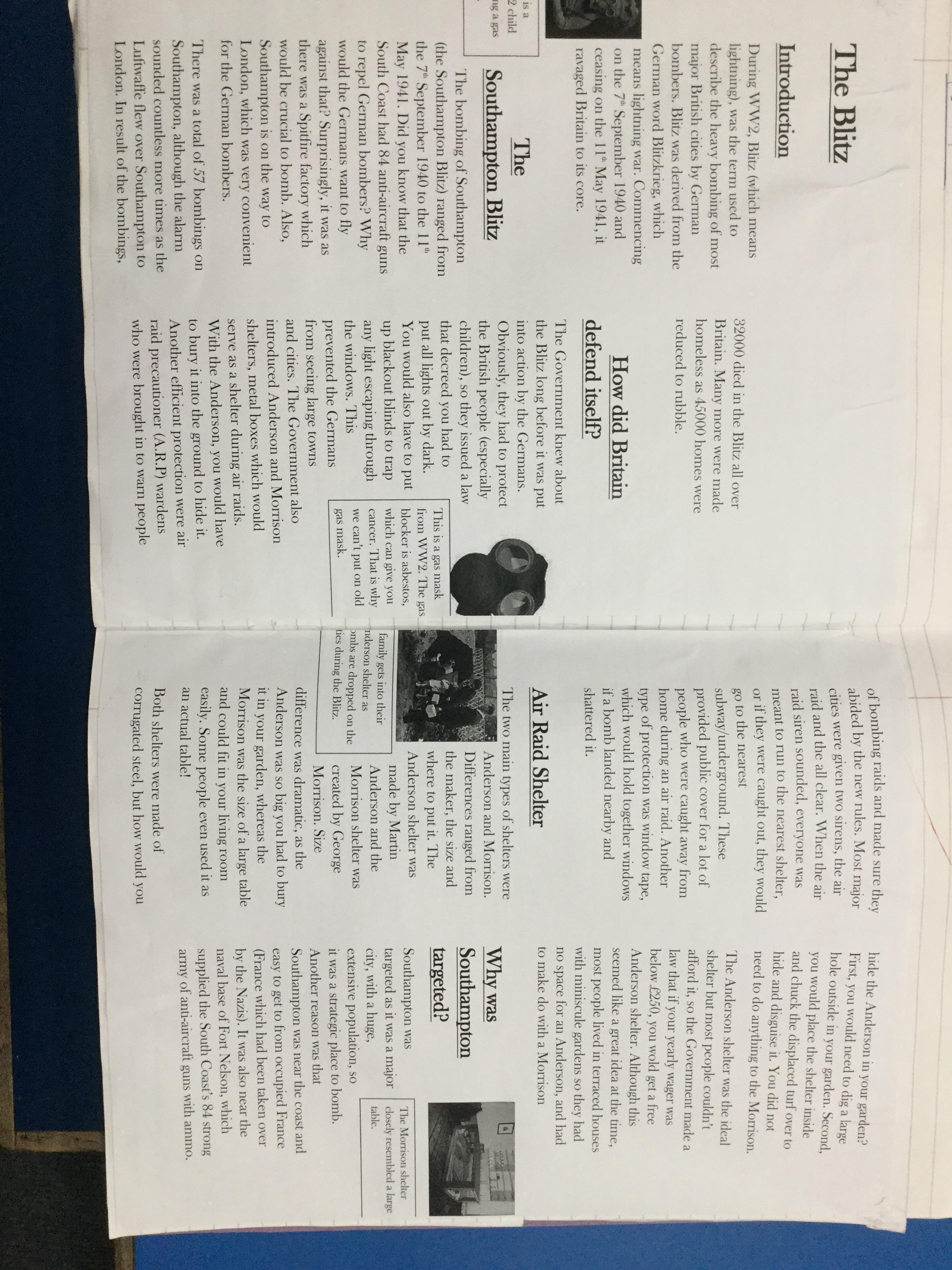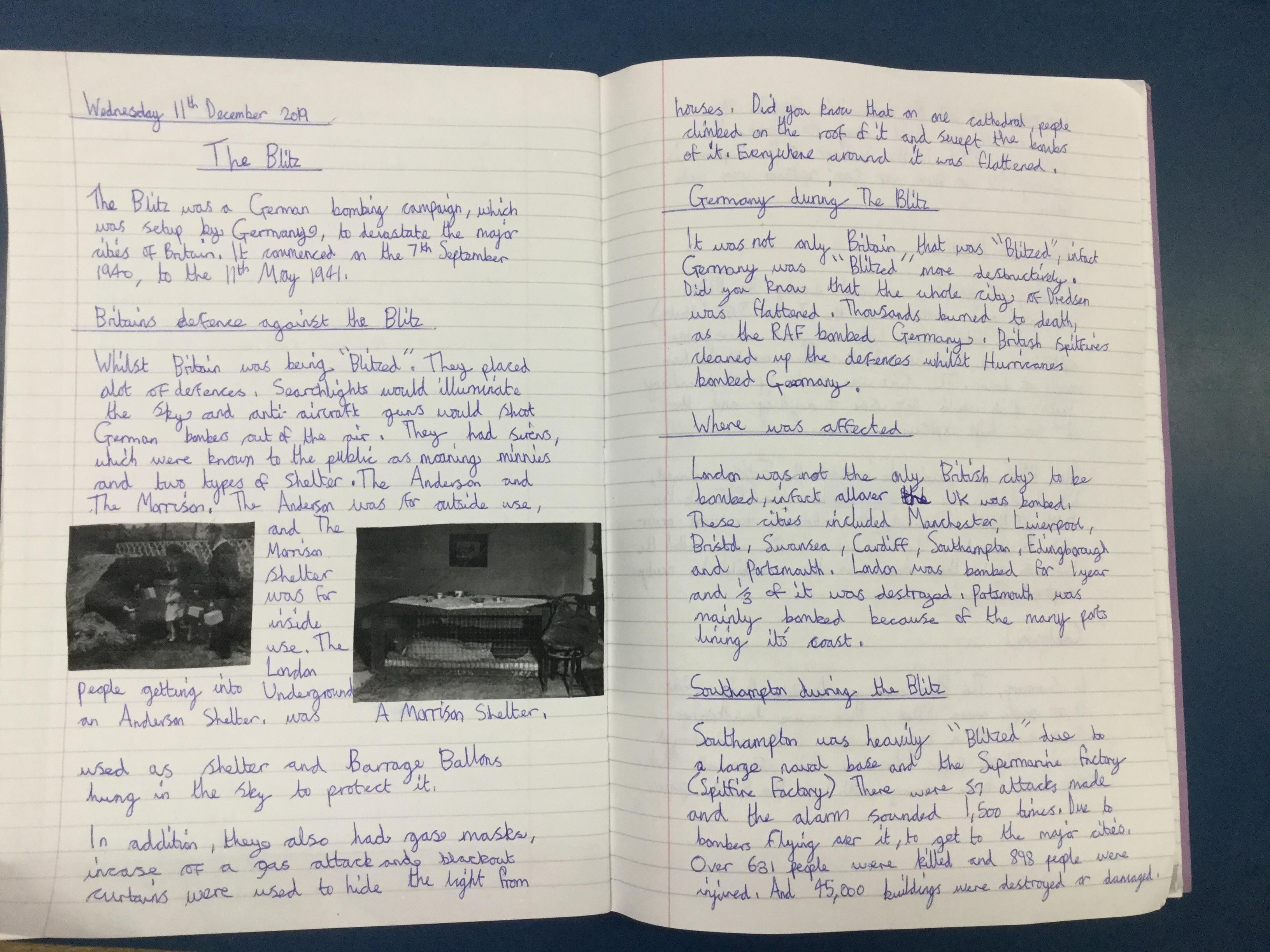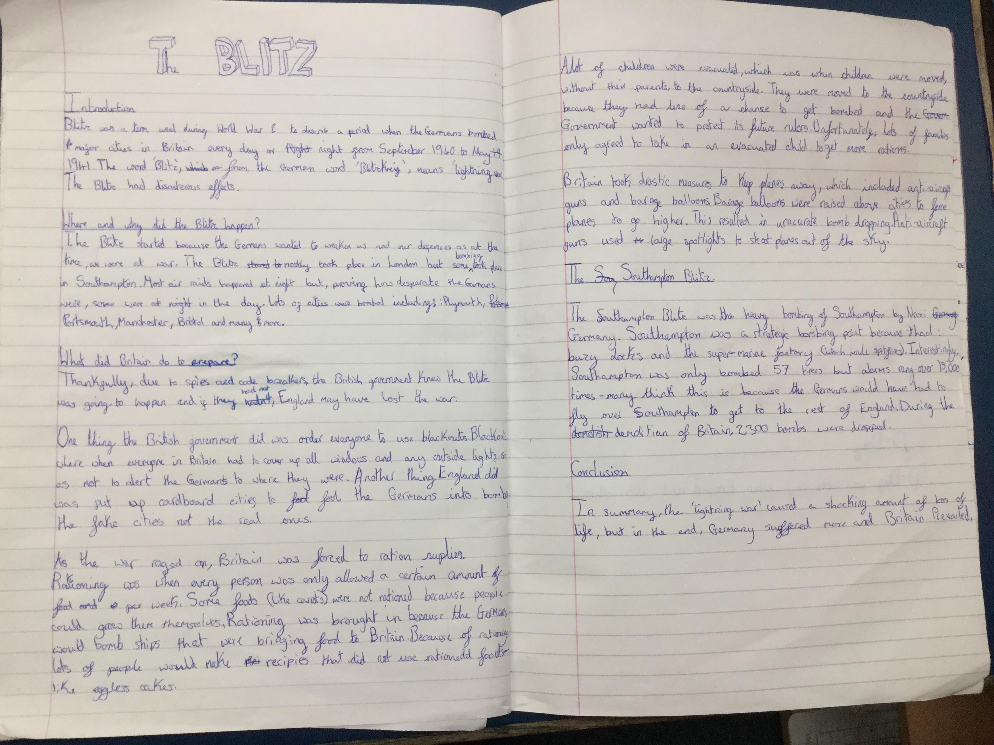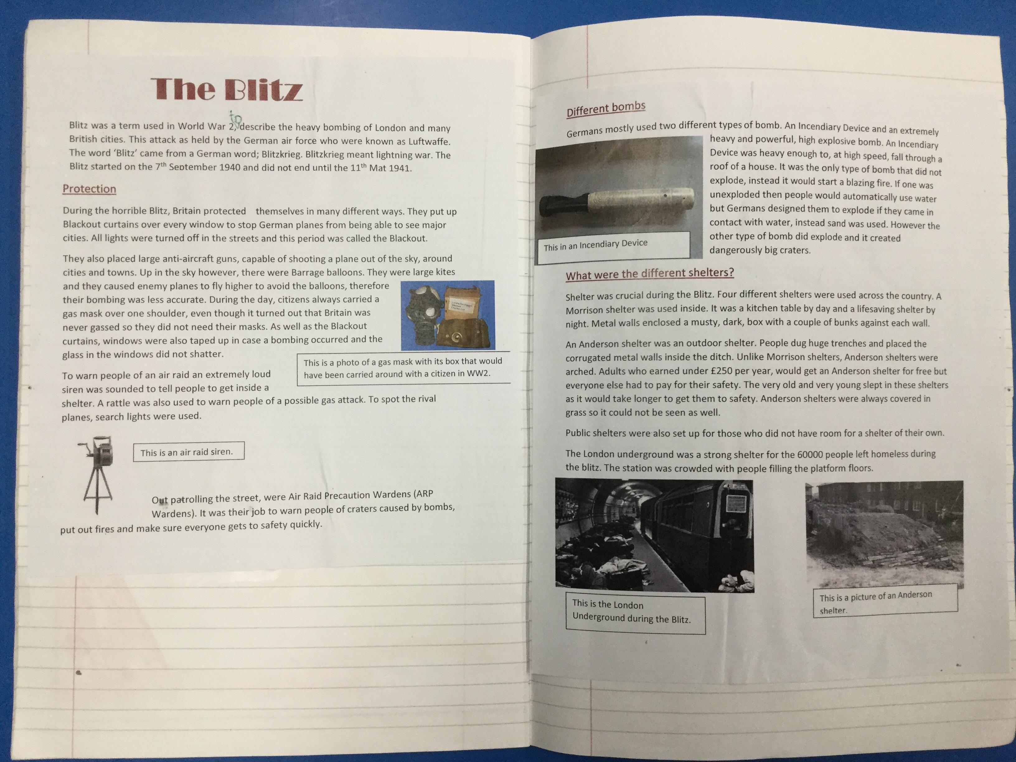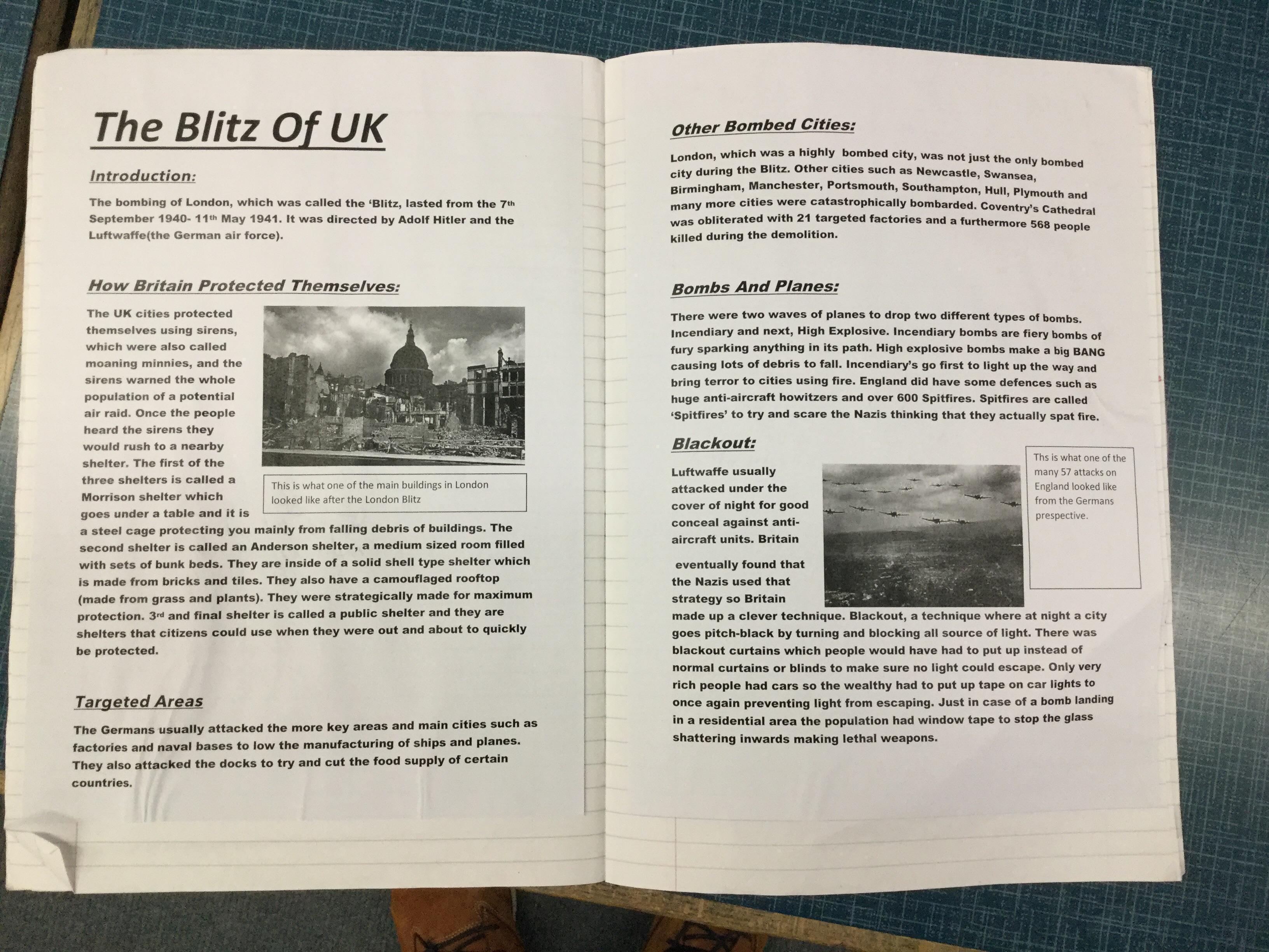 The children, using knowledge gained from Hooke Court, The Tank Musuem, and Fort Nelson as well as independent and guided research produced non chronological reports on the effects of the Blitz on Britain. They also research how the Blitz impacted the local community.