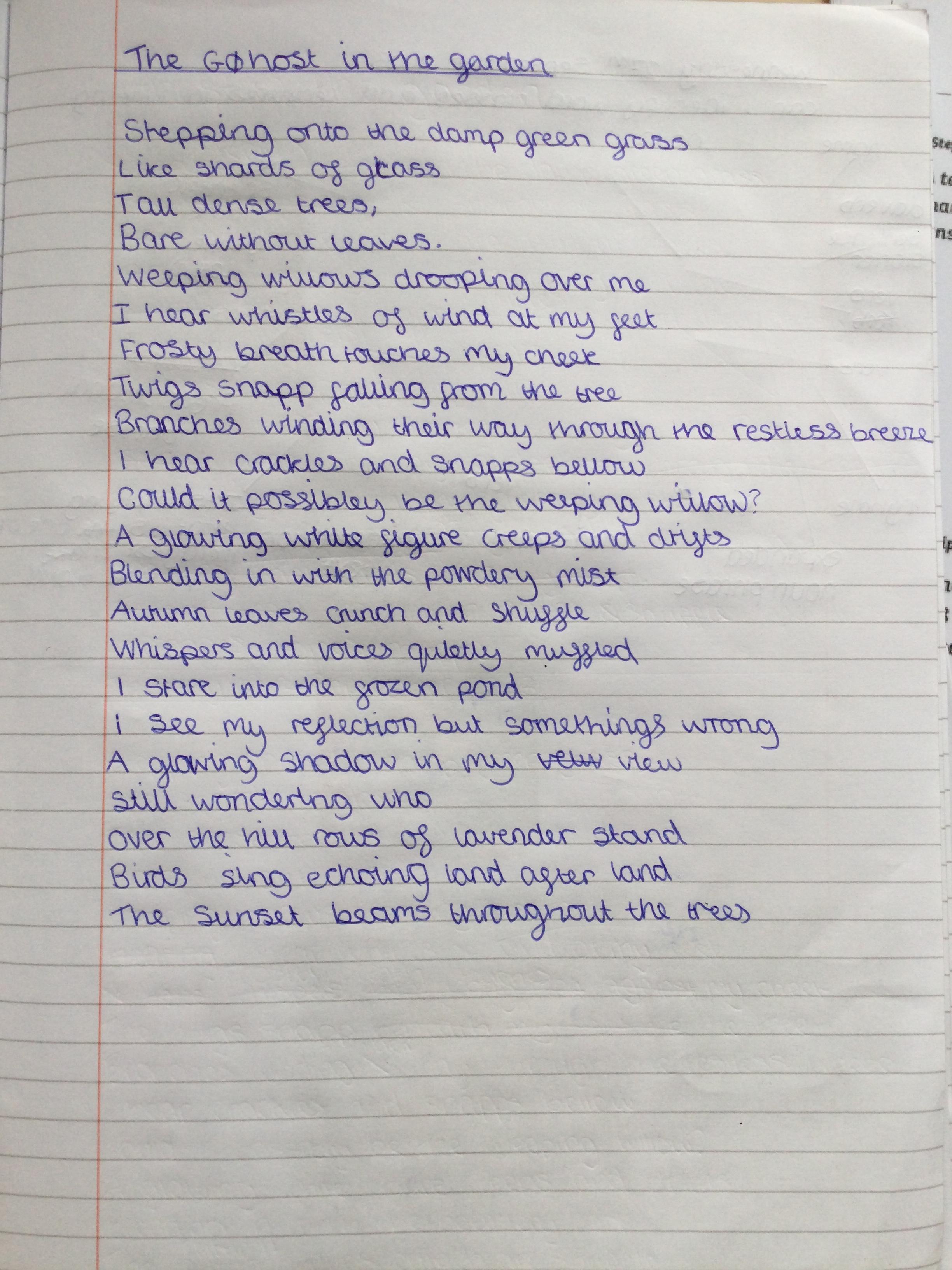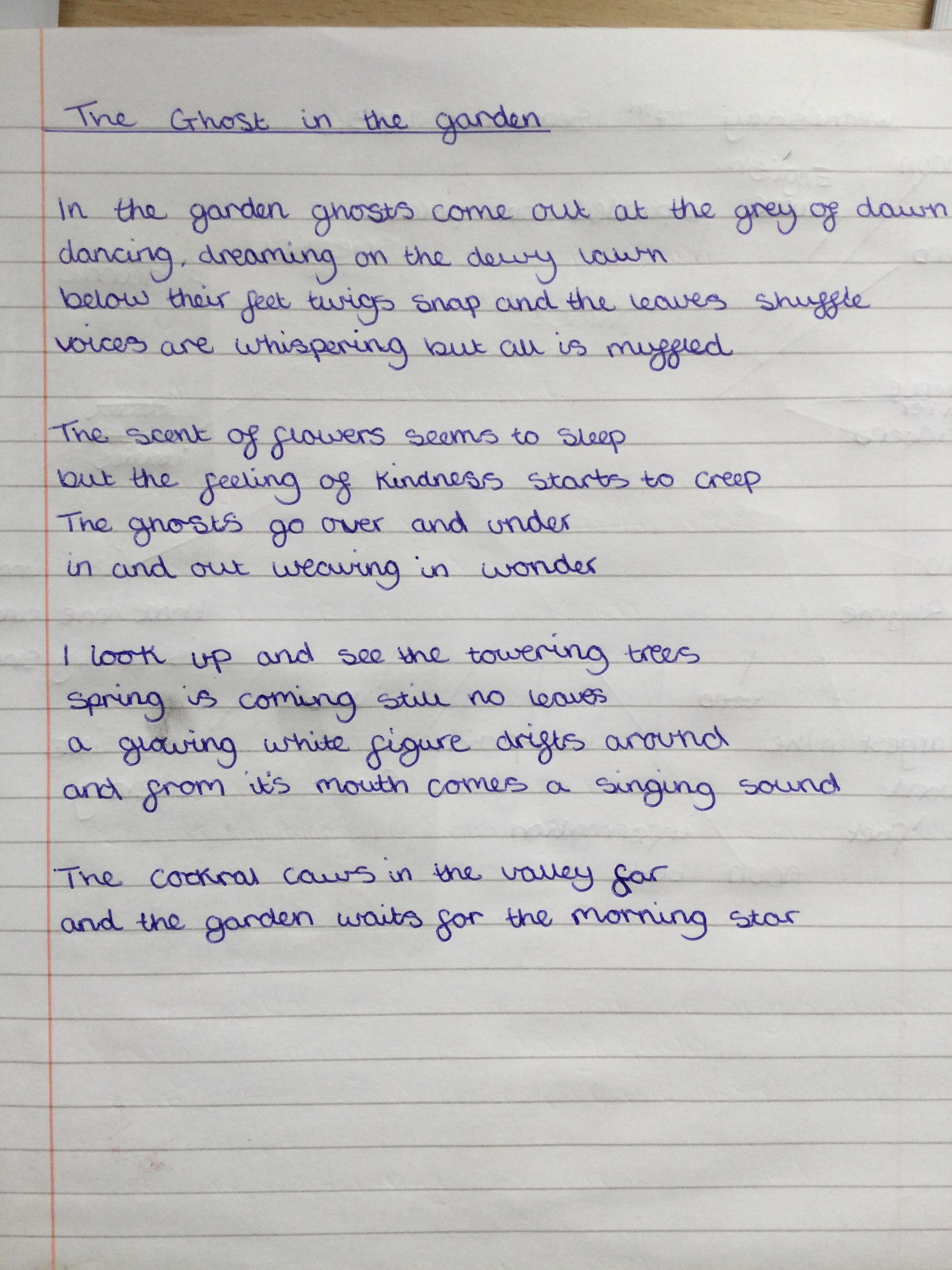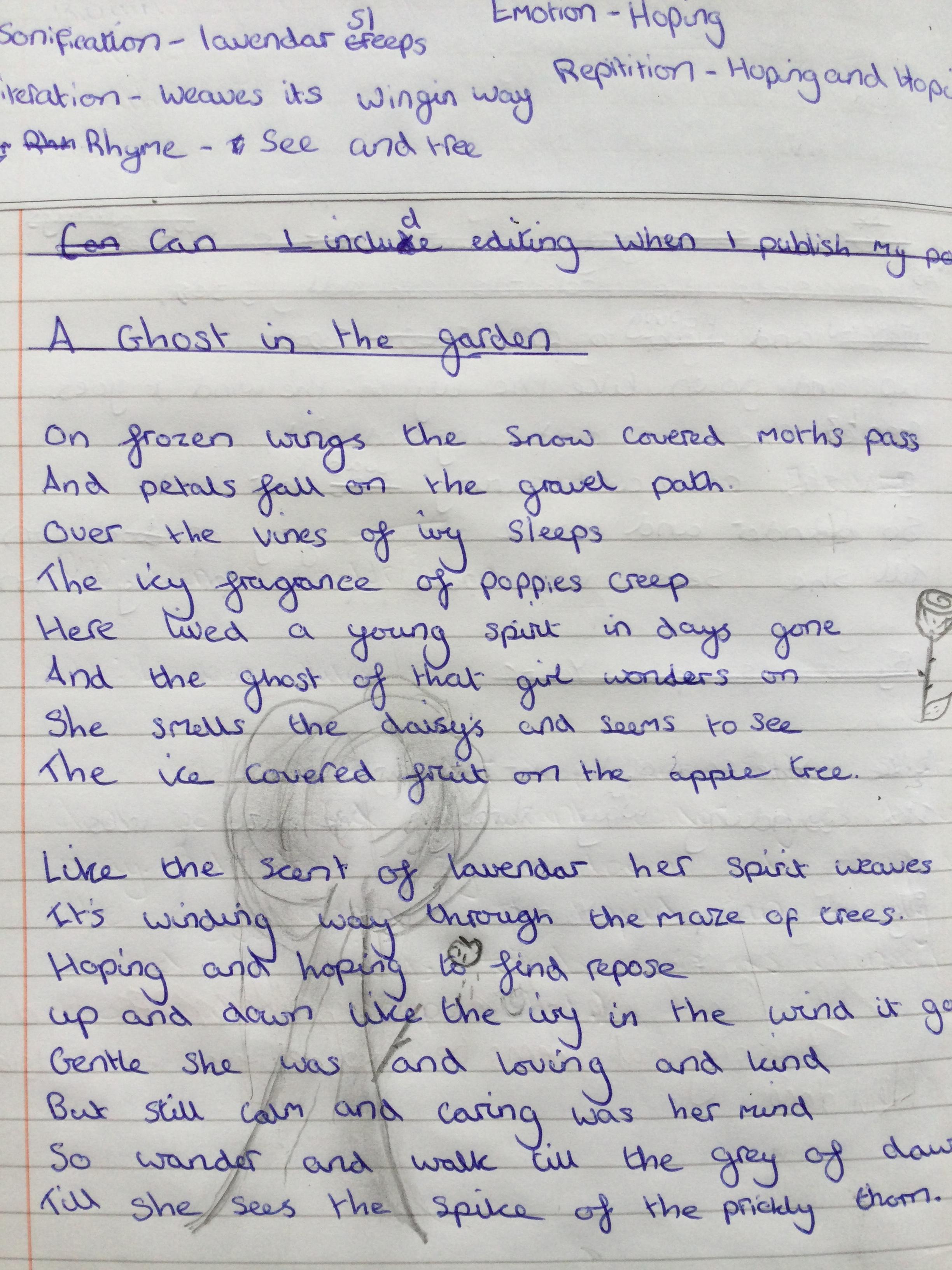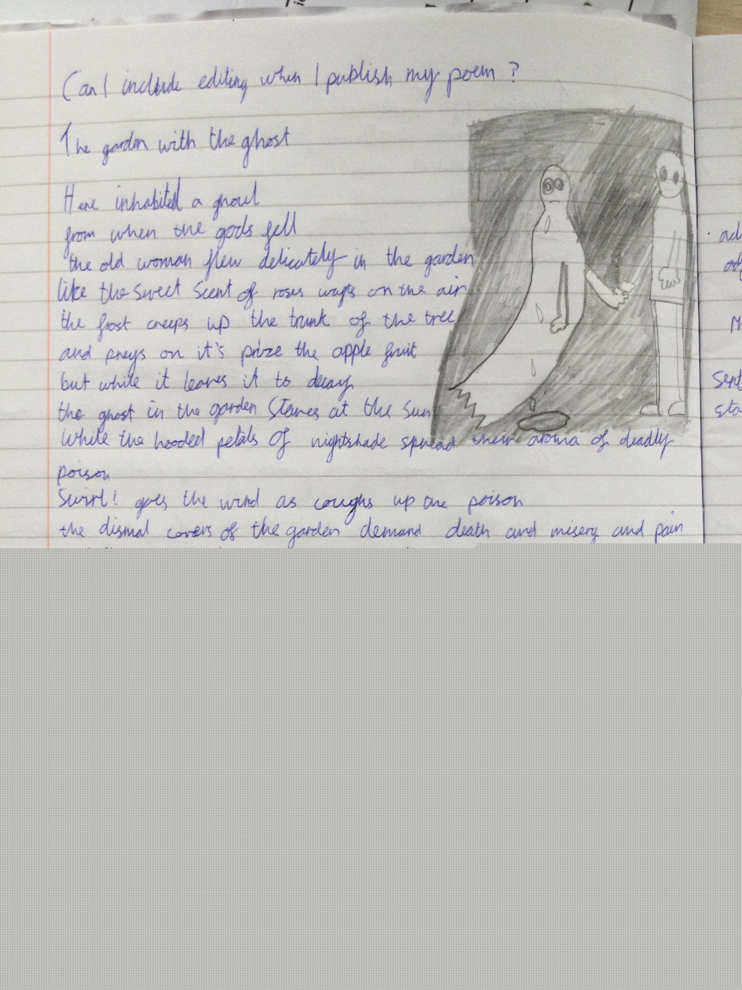 We analysed and unpicked two poems: A Ghost in the Garden and A Garden at Night before going onto innovating and imitating them to create our own. After editing, we published and illustrated our poems in the style of Chris Riddell’s ‘Poems to live your life by’