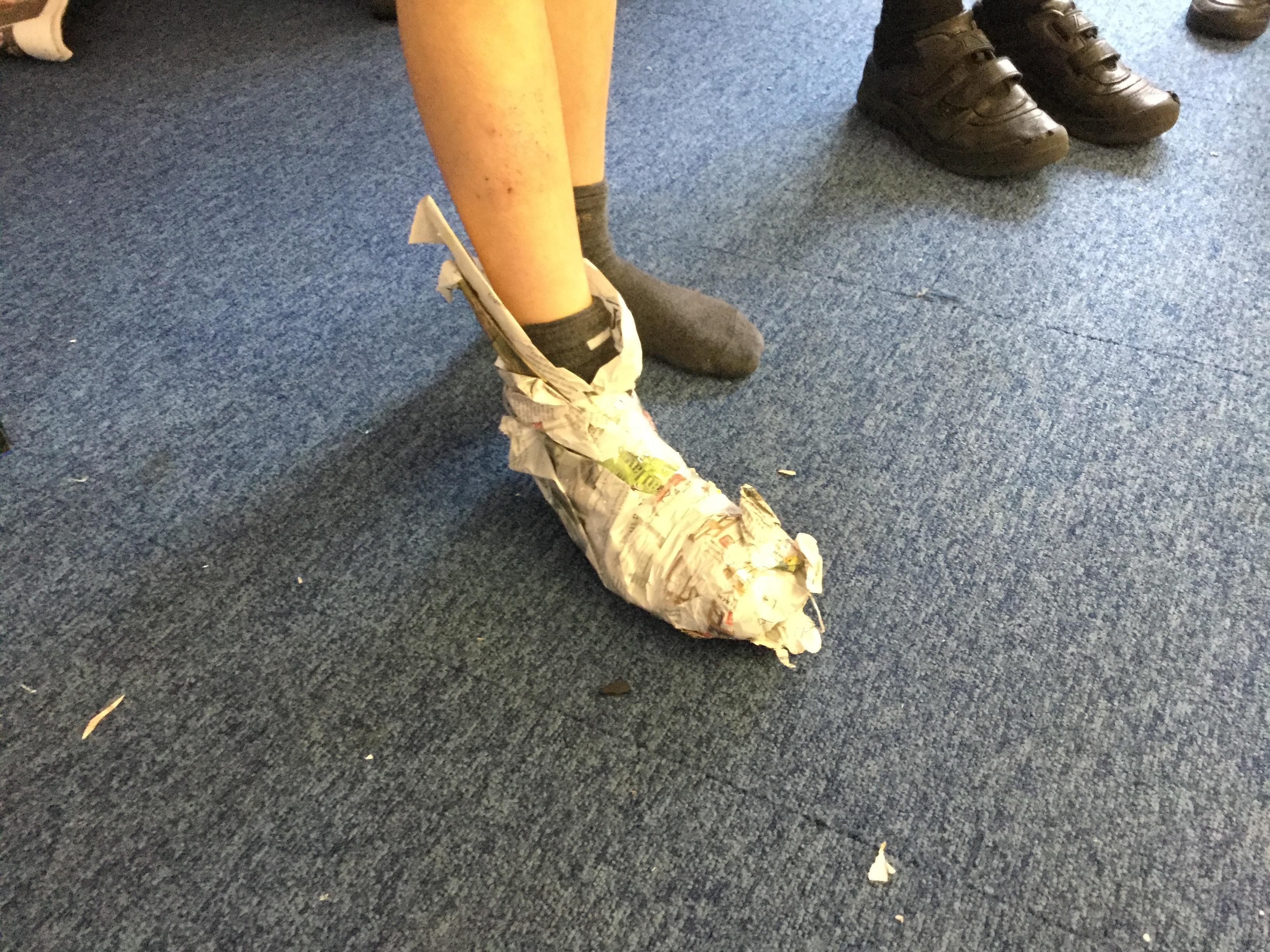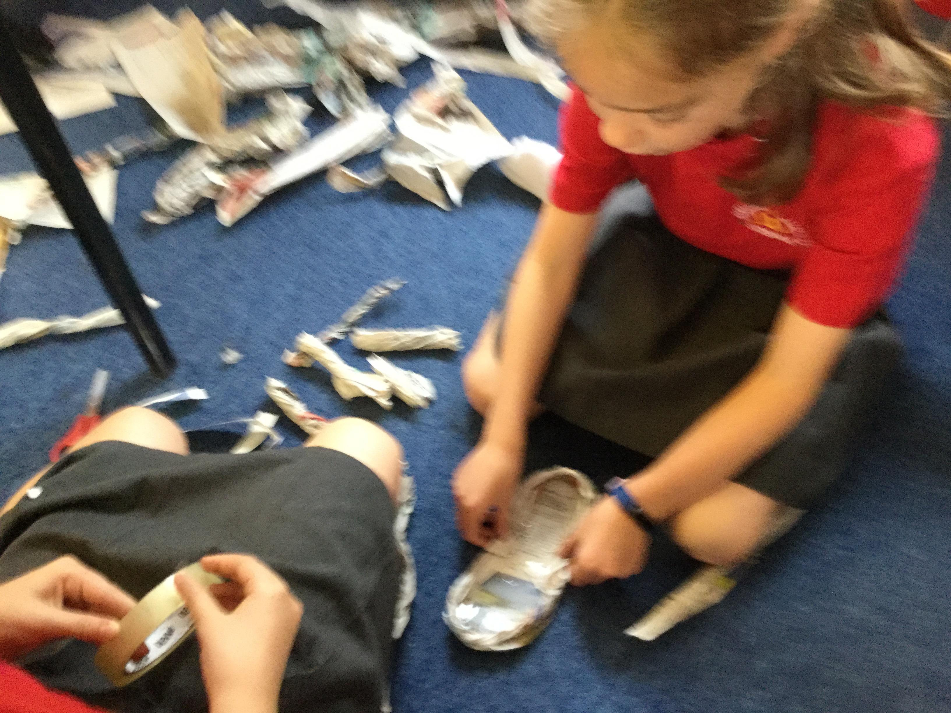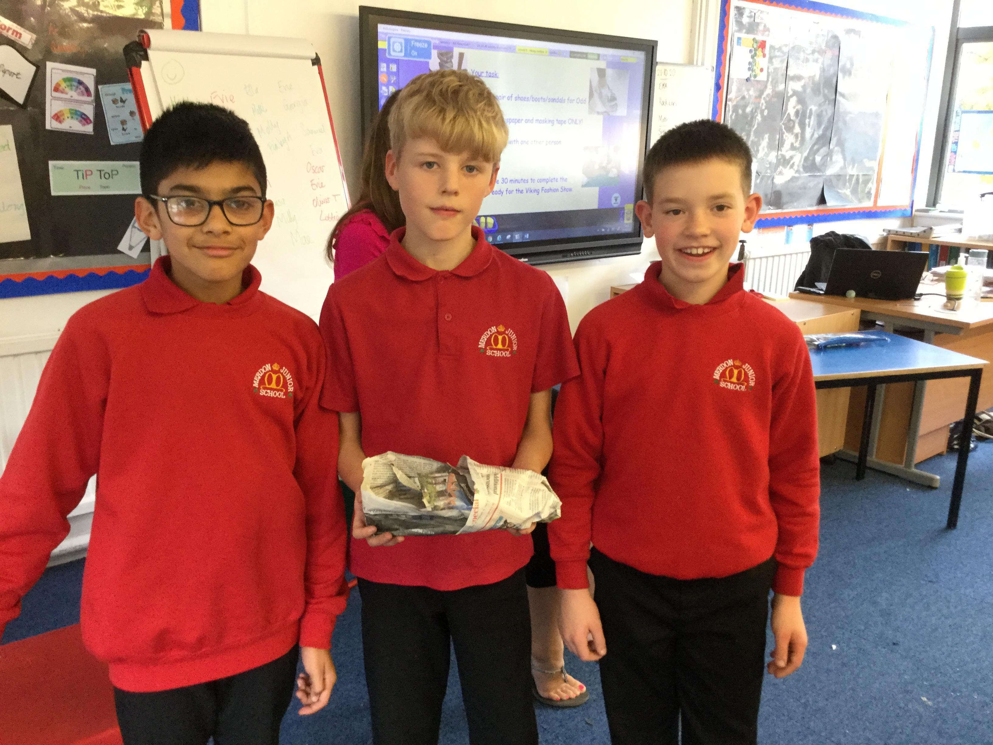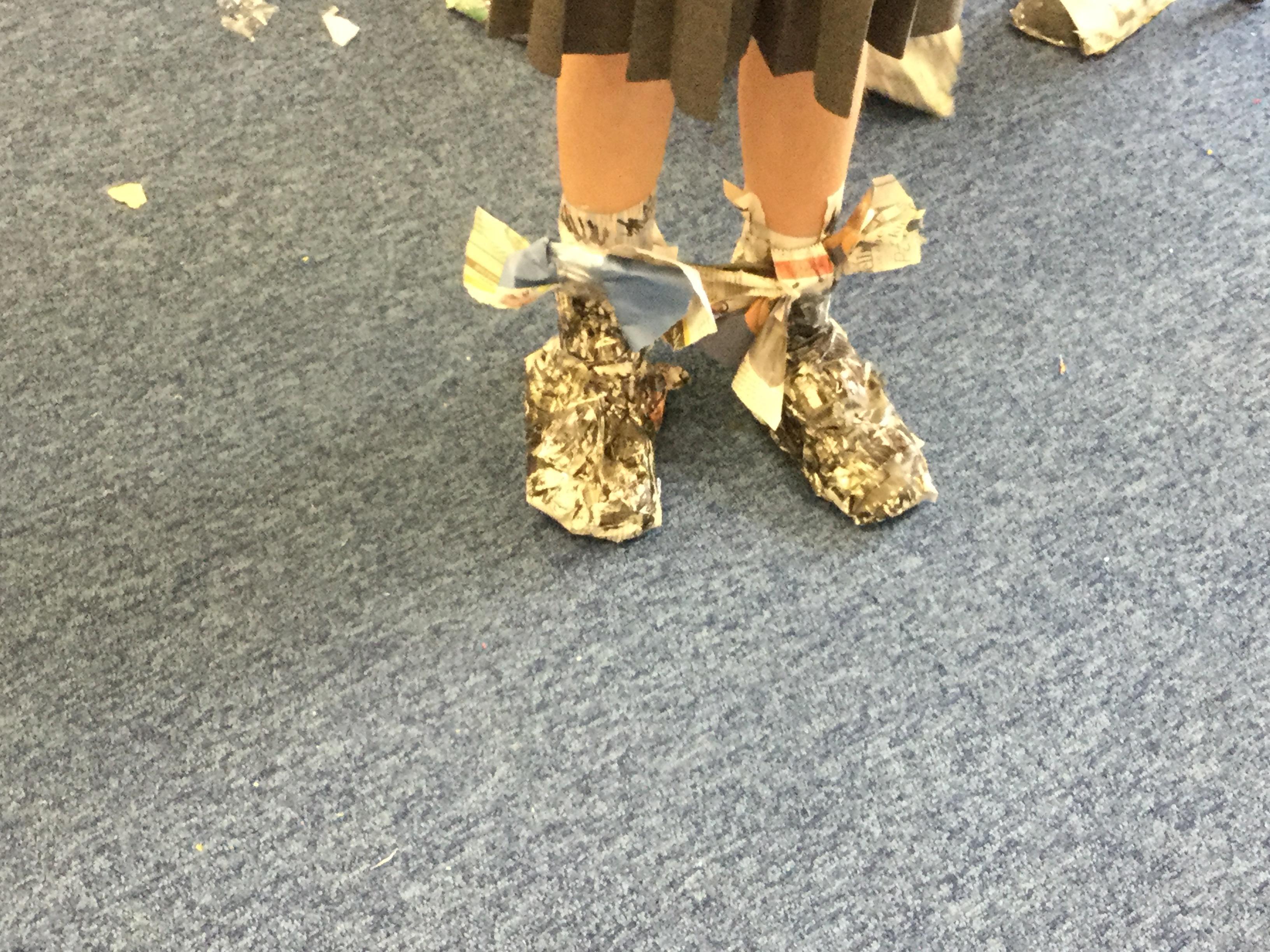 Today we carried out research into what the Vikings used to wear. The children then went into groups and designed a Viking shoe, knowing that the only resources they would have would be newspaper and sellotape!