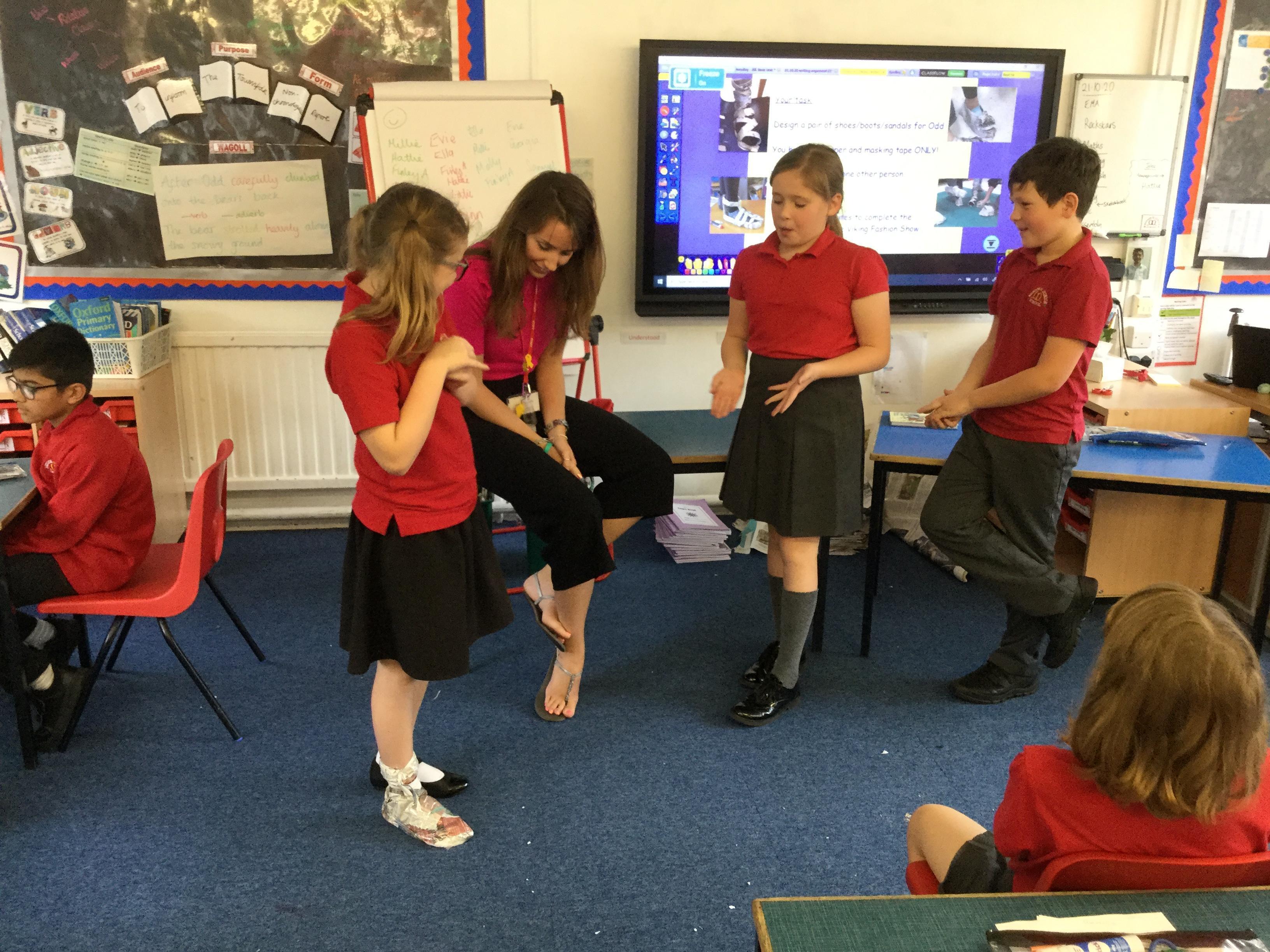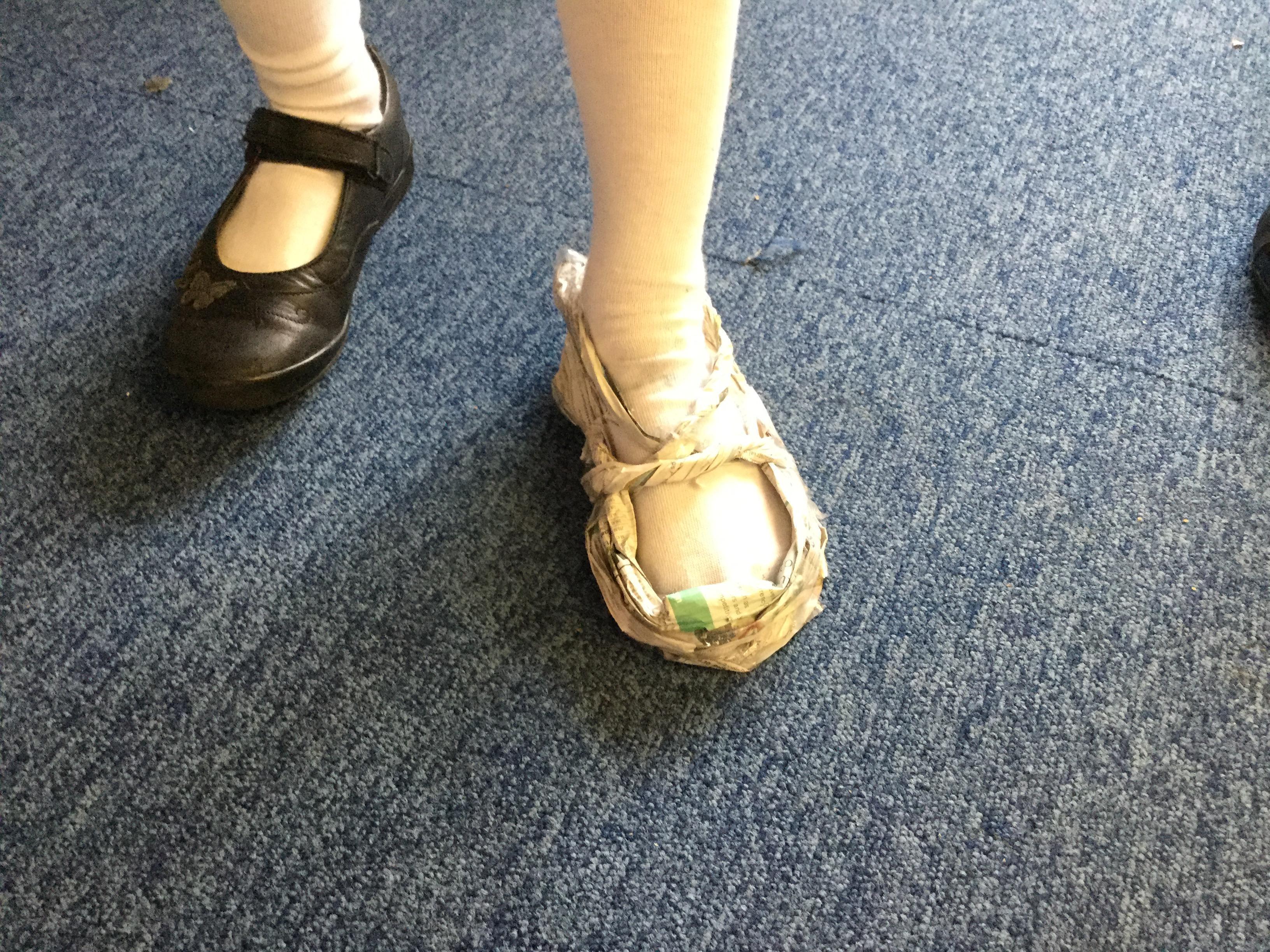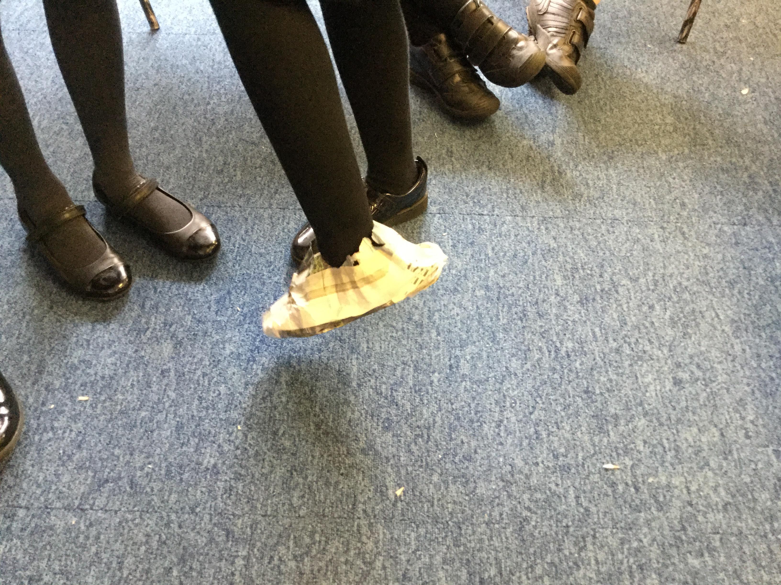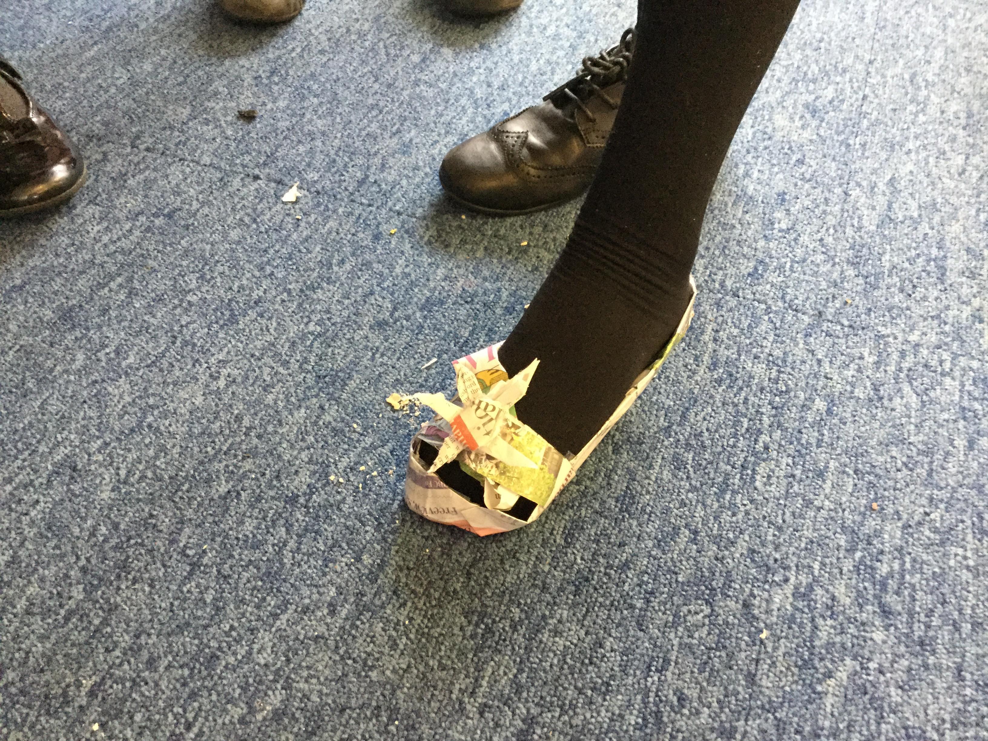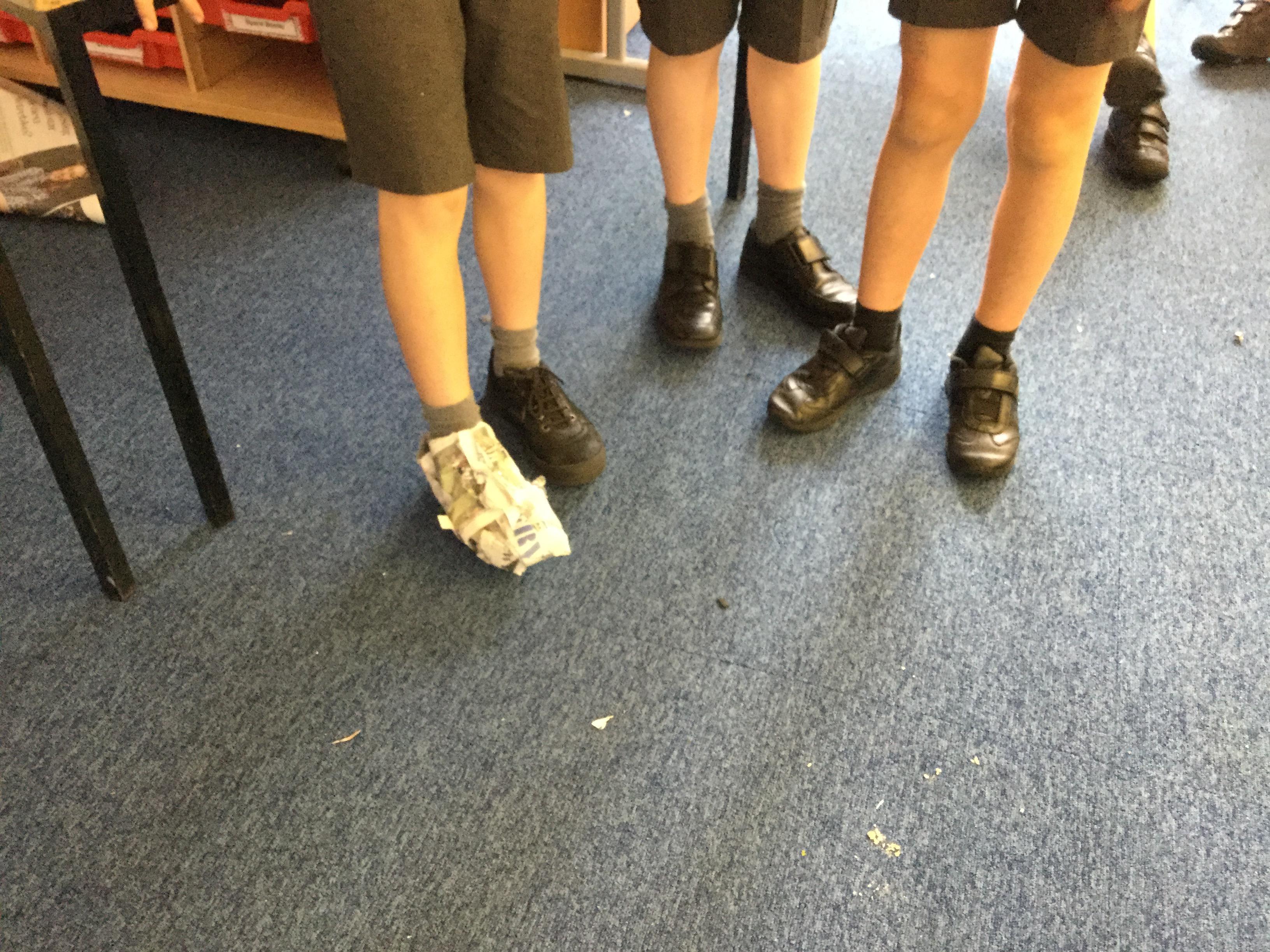 Today we carried out research into what the Vikings used to wear. The children then went into groups and designed a Viking shoe, knowing that the only resources they would have would be newspaper and sellotape!