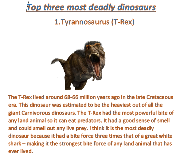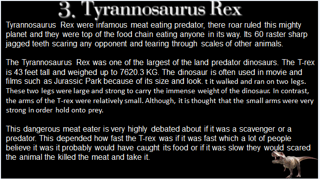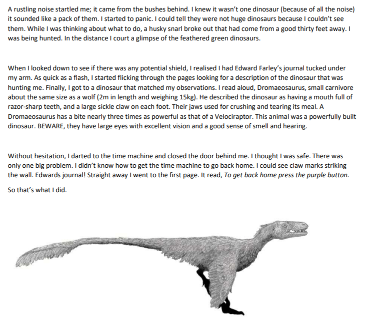 I hid in the bush because I had to get out of the path of the t-rex a meat-eating animal!!! STOMP STOMP! He went shaking me about like jelly. I have to tell you something, I had never been as scared as I was being passed by a t-rex.