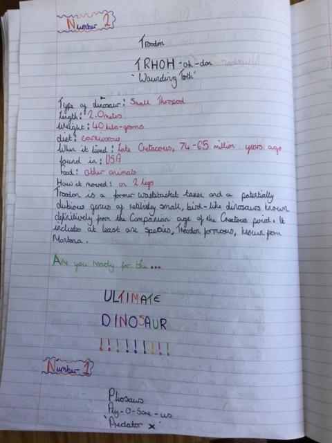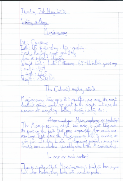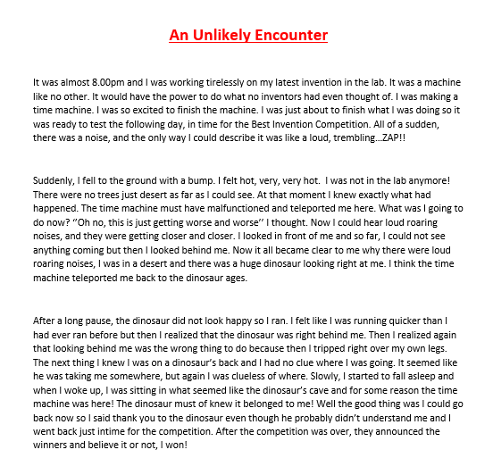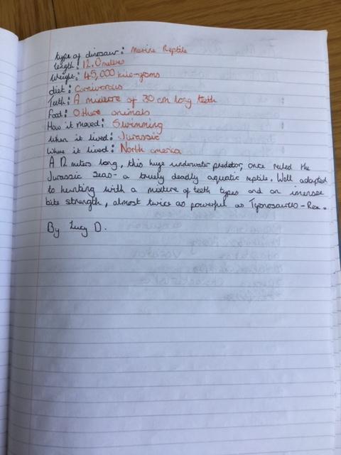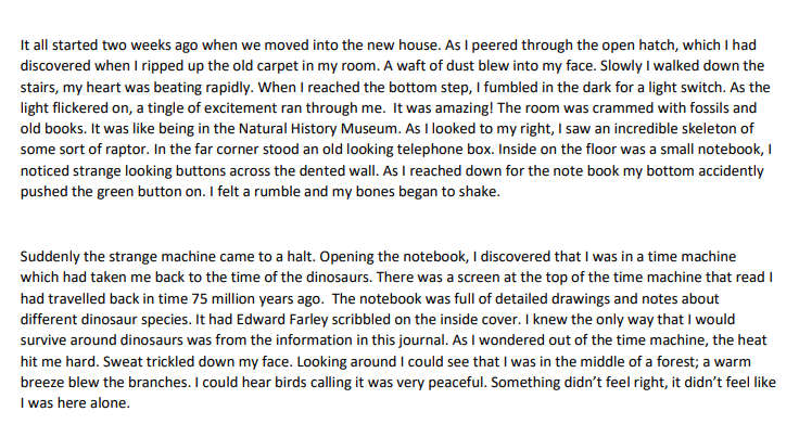 Wait - was that what I thought it was plodding slowly through the thick forested plains. I had always liked the idea of having a close encounter with a triceratops but I quickly changed my mind I was petrified. I stopped in my tracks then our eyes met. It felt like I was staring at two basketballs his eyes were so huge. Then I heard his feet scraping along the ground it was really loud like a truck on the motorway. At last it stopped and I gently approached the mighty creature. As I got closer up I could see properly what it was - a triceratops with a one metre long frill and two huge horns. I didn’t know whether to turn around and run away or stare in awe of what was in front of me!