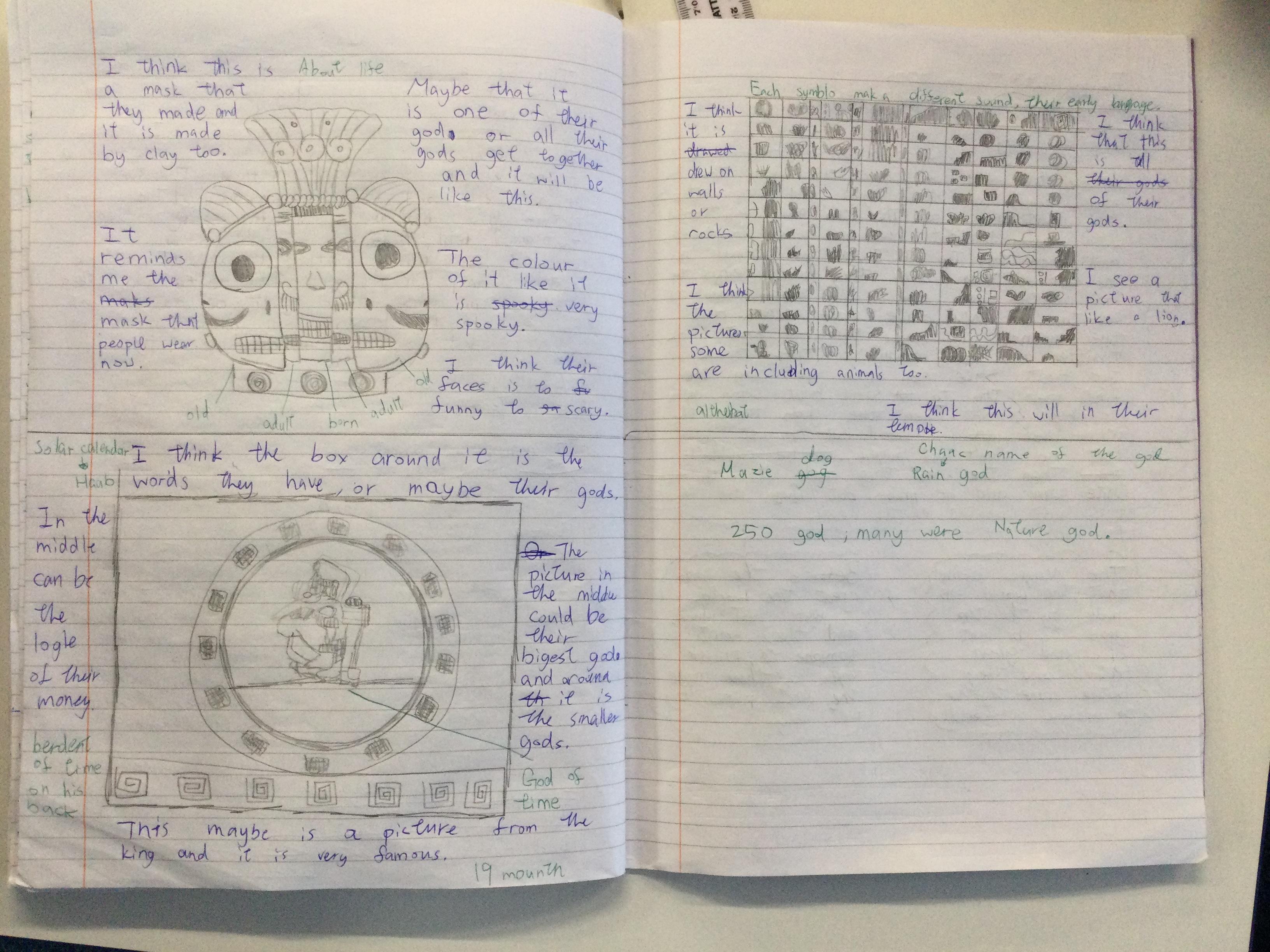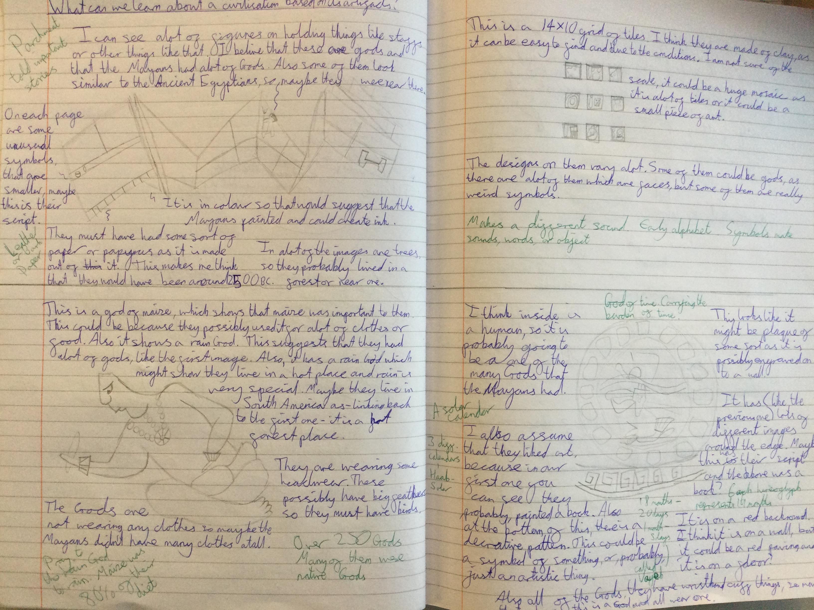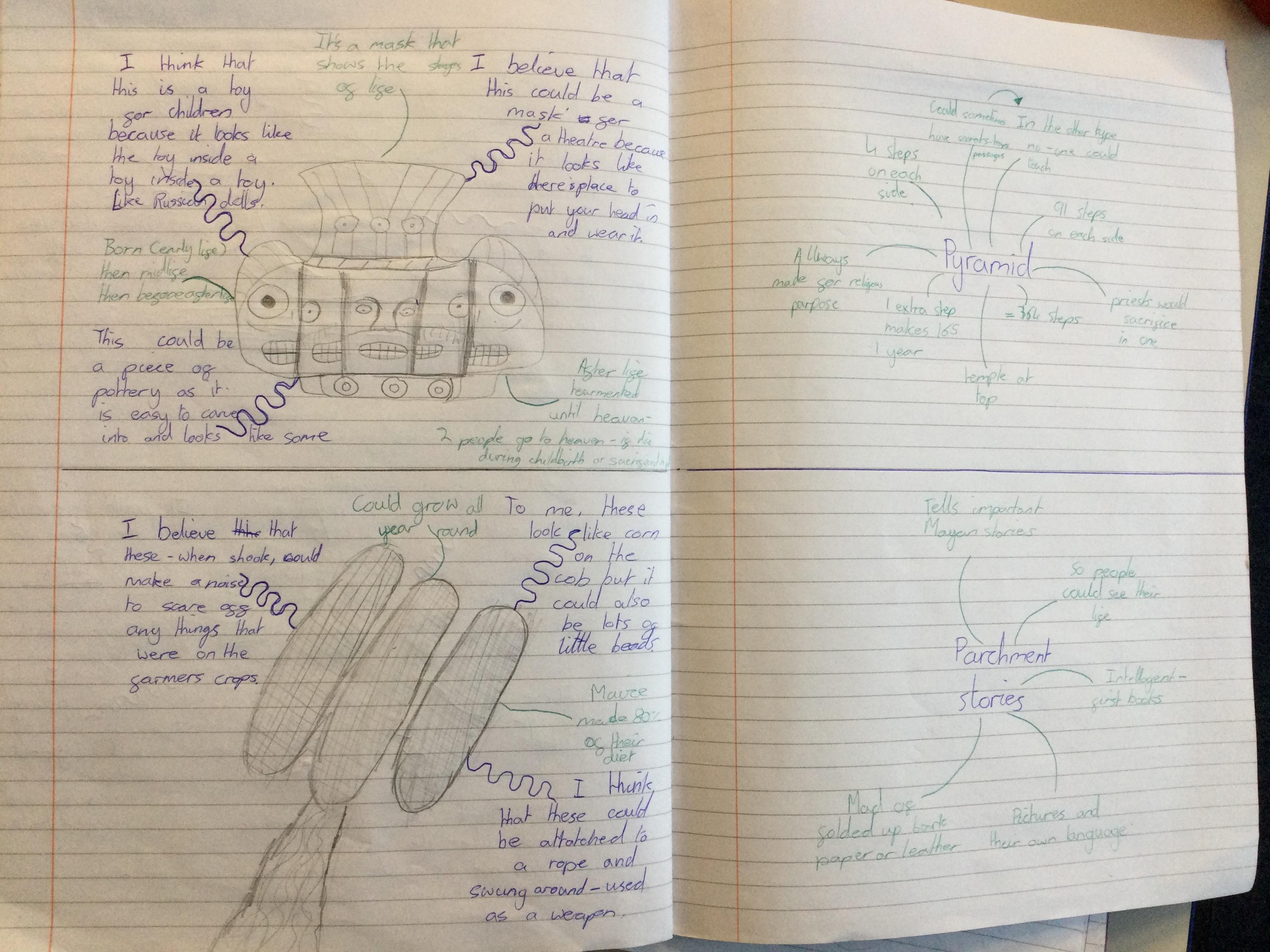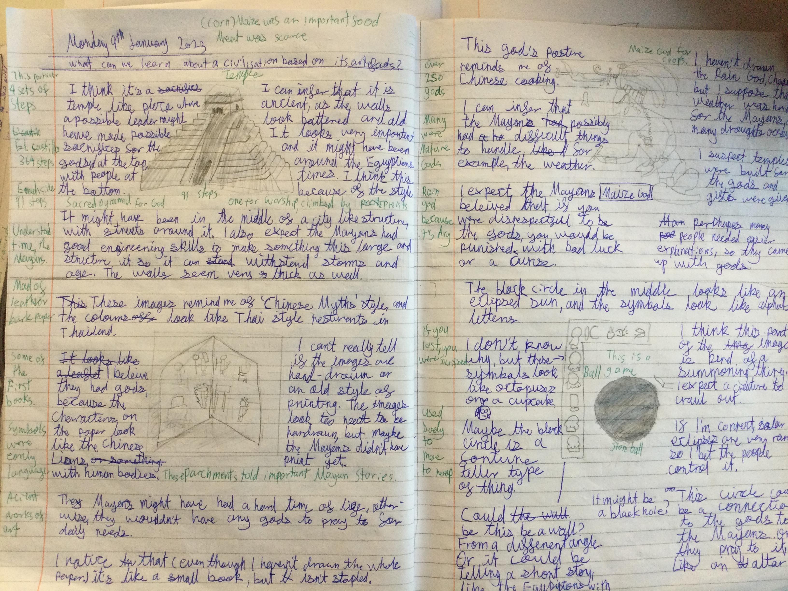 Before learning about why we study the Mayans and what makes them important, we acted as archeologists and tried to make inferences about the civilisation based on artefacts from that time. We discussed primary and secondary sources and created journal pages based on what we thought those artefacts were telling us about the Ancient Maya people.