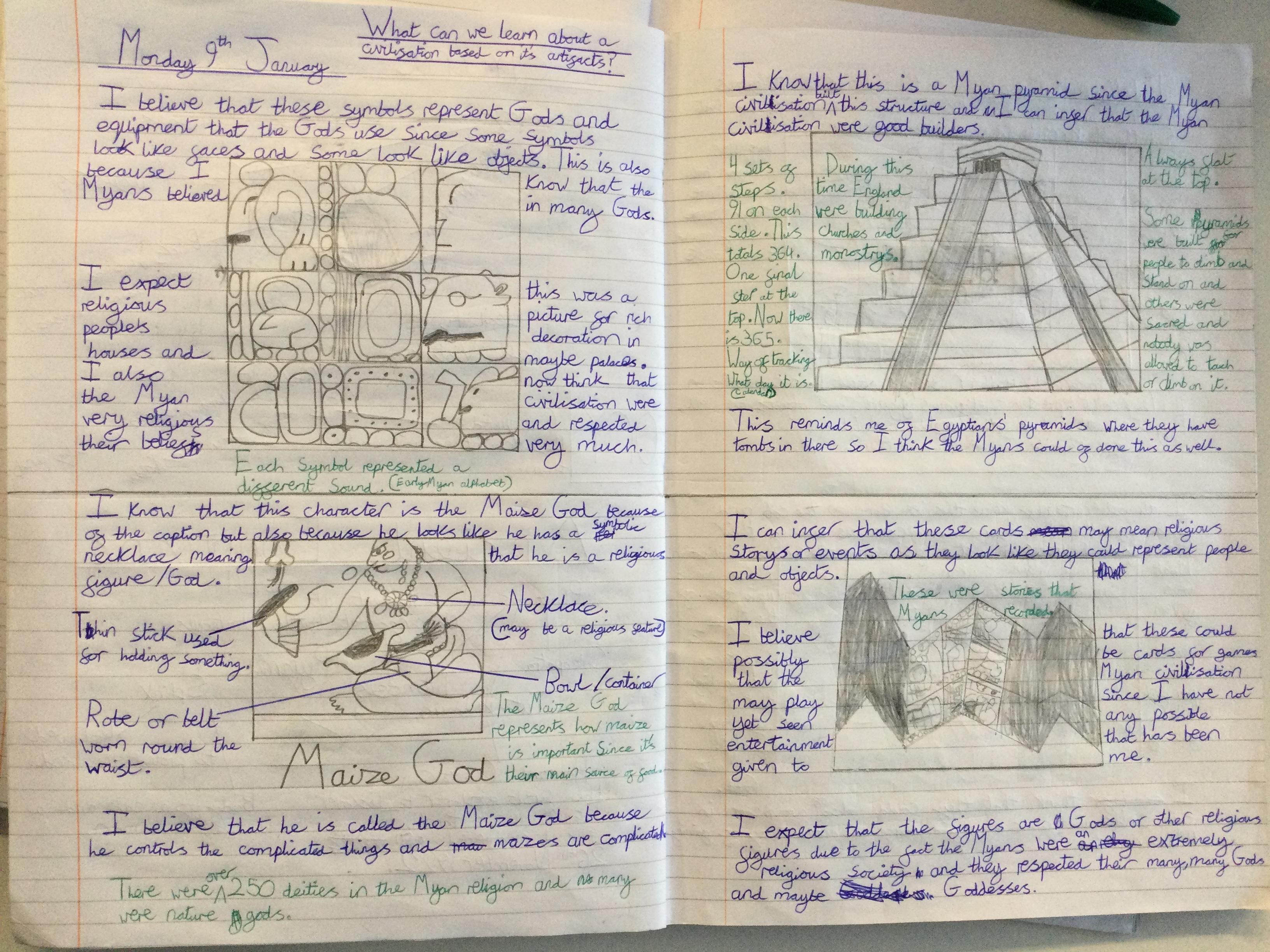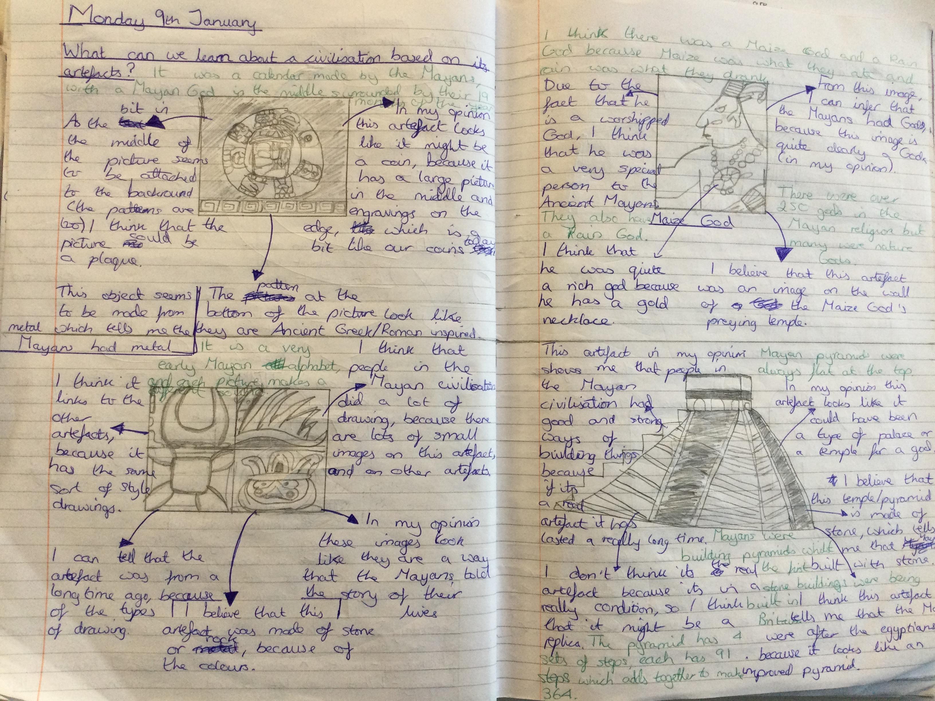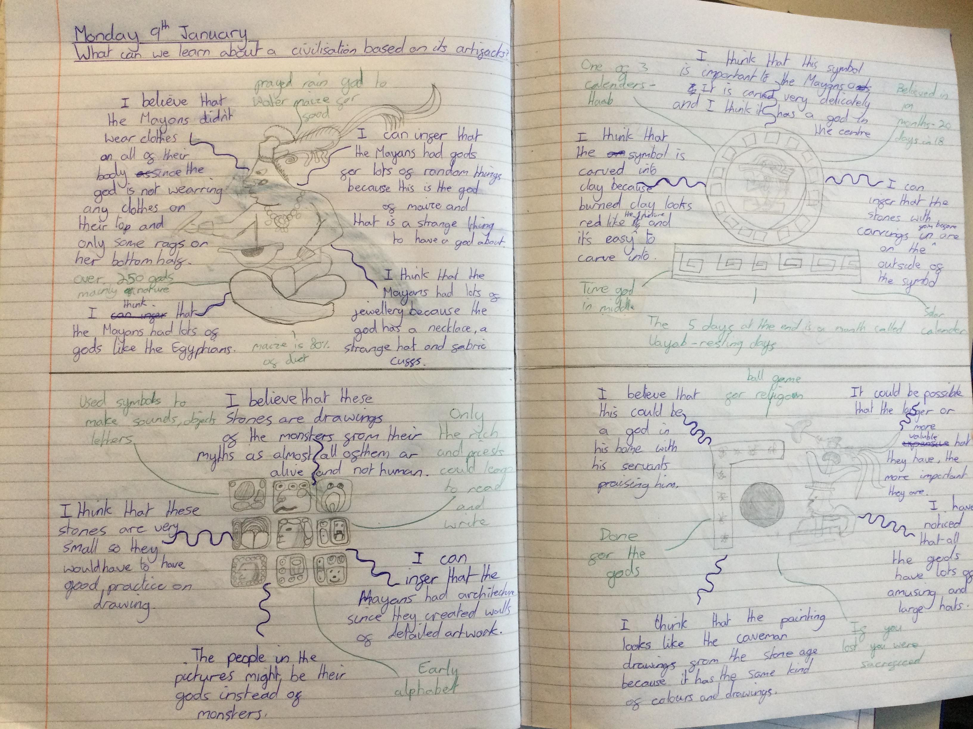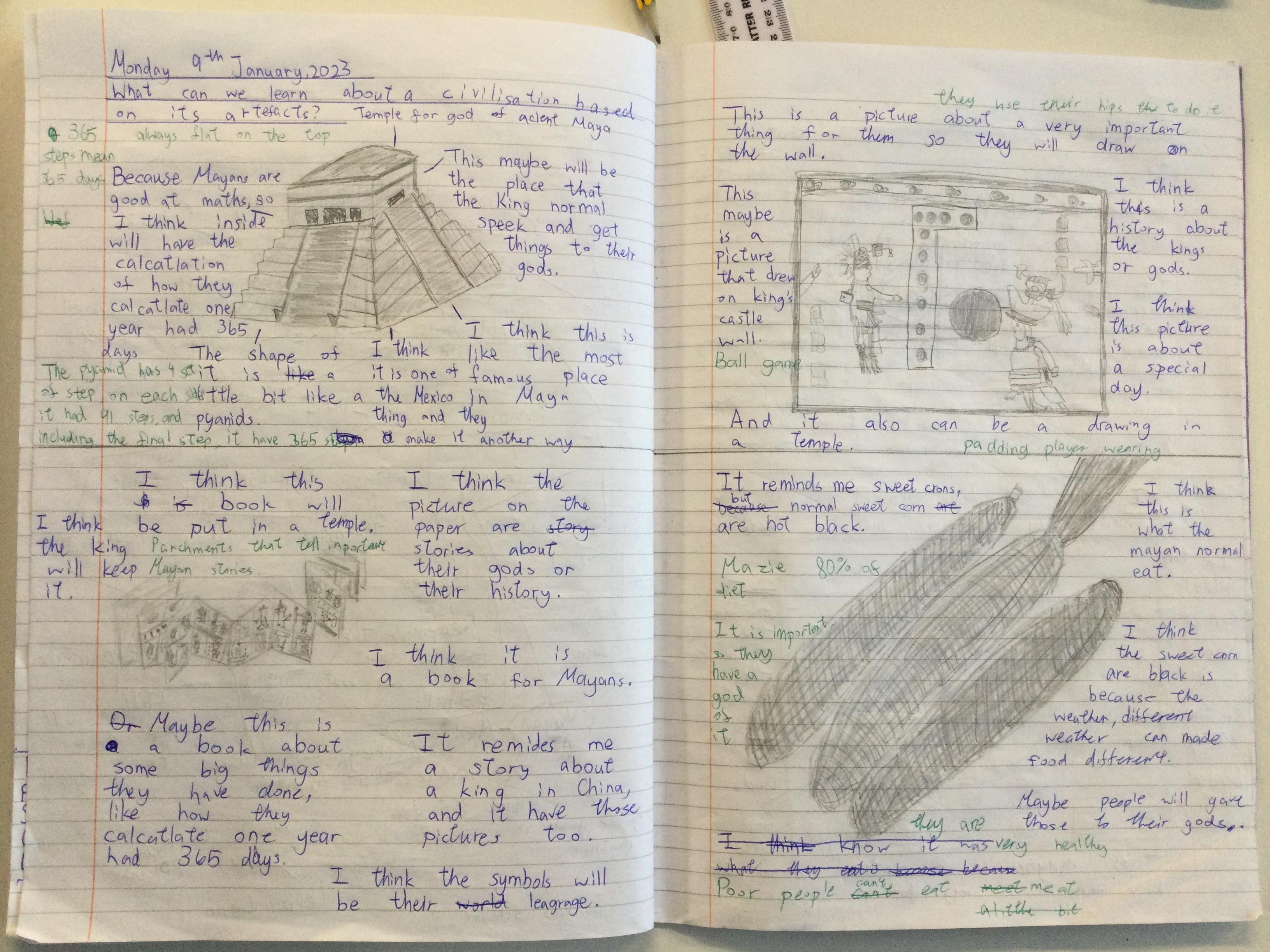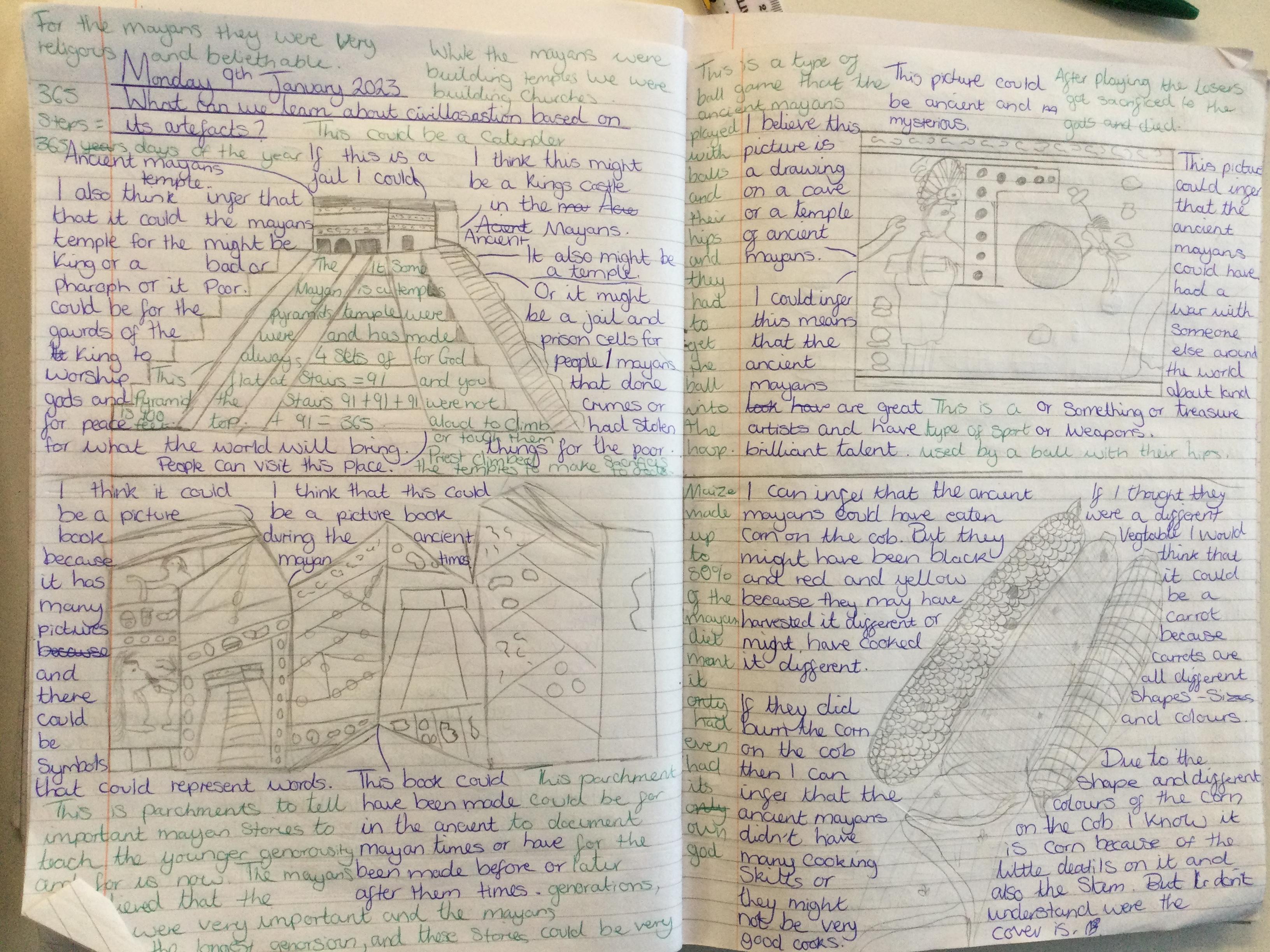 Before learning about why we study the Mayans and what makes them important, we acted as archeologists and tried to make inferences about the civilisation based on artefacts from that time. We discussed primary and secondary sources and created journal pages based on what we thought those artefacts were telling us about the Ancient Maya people.