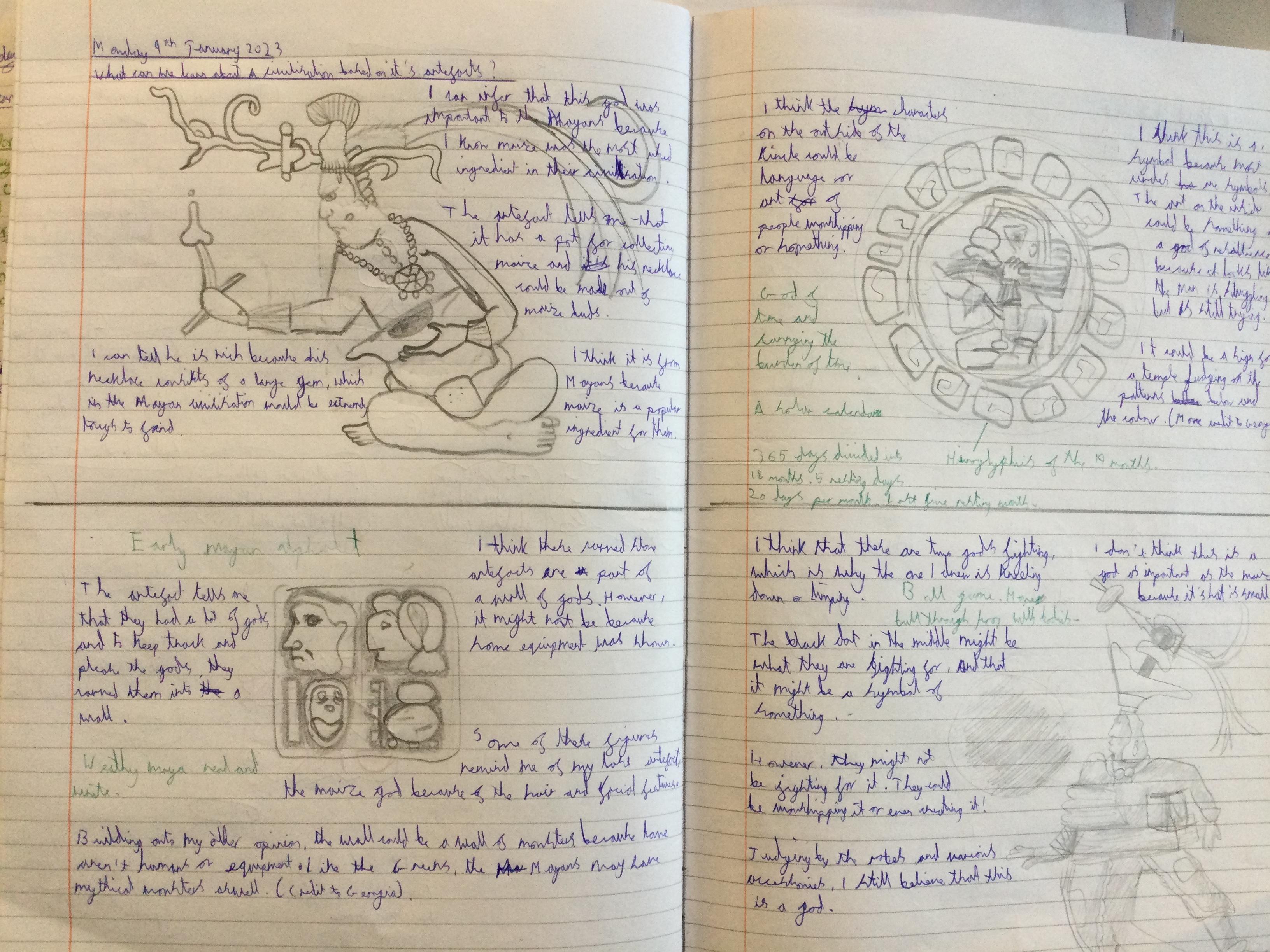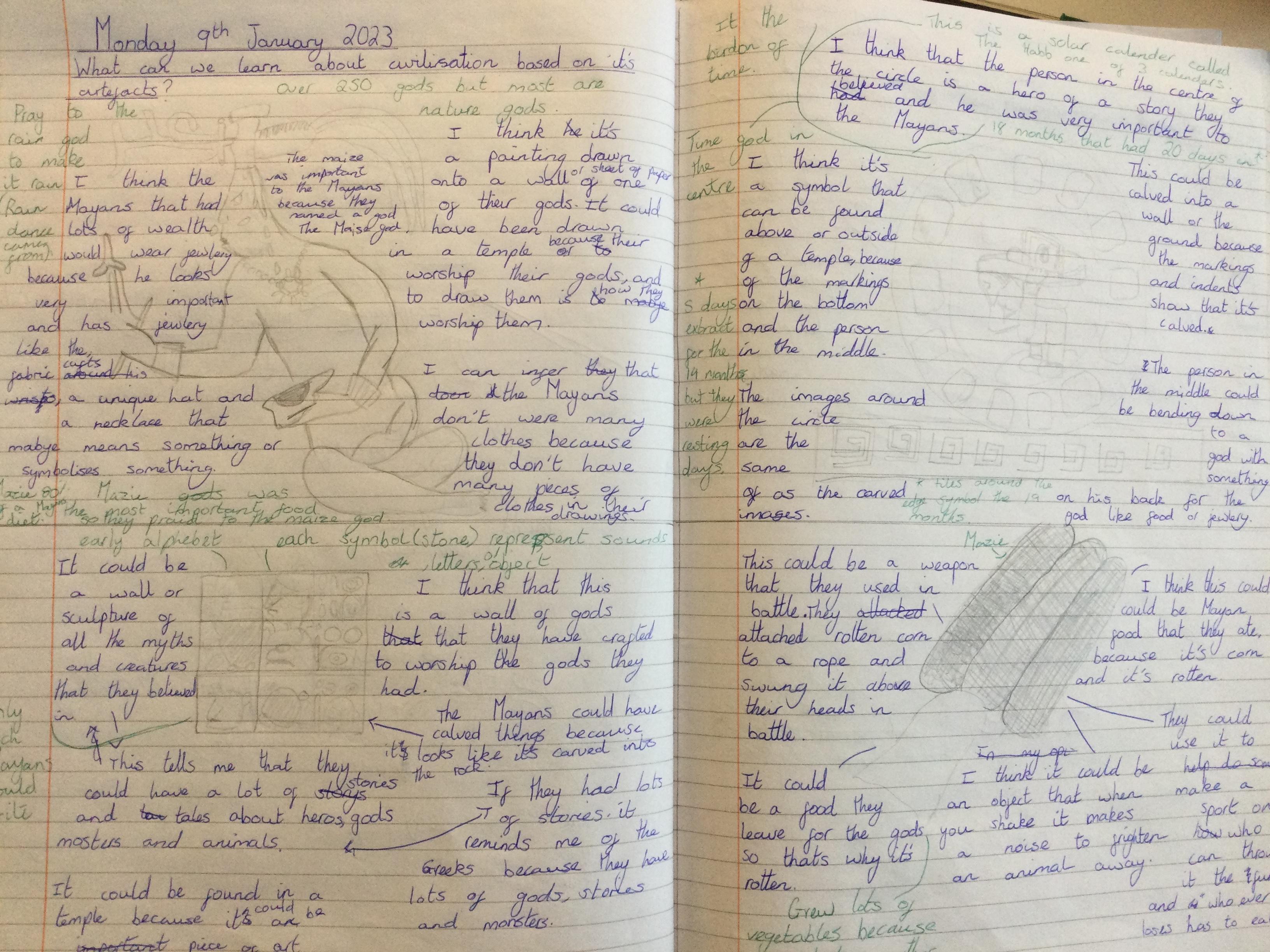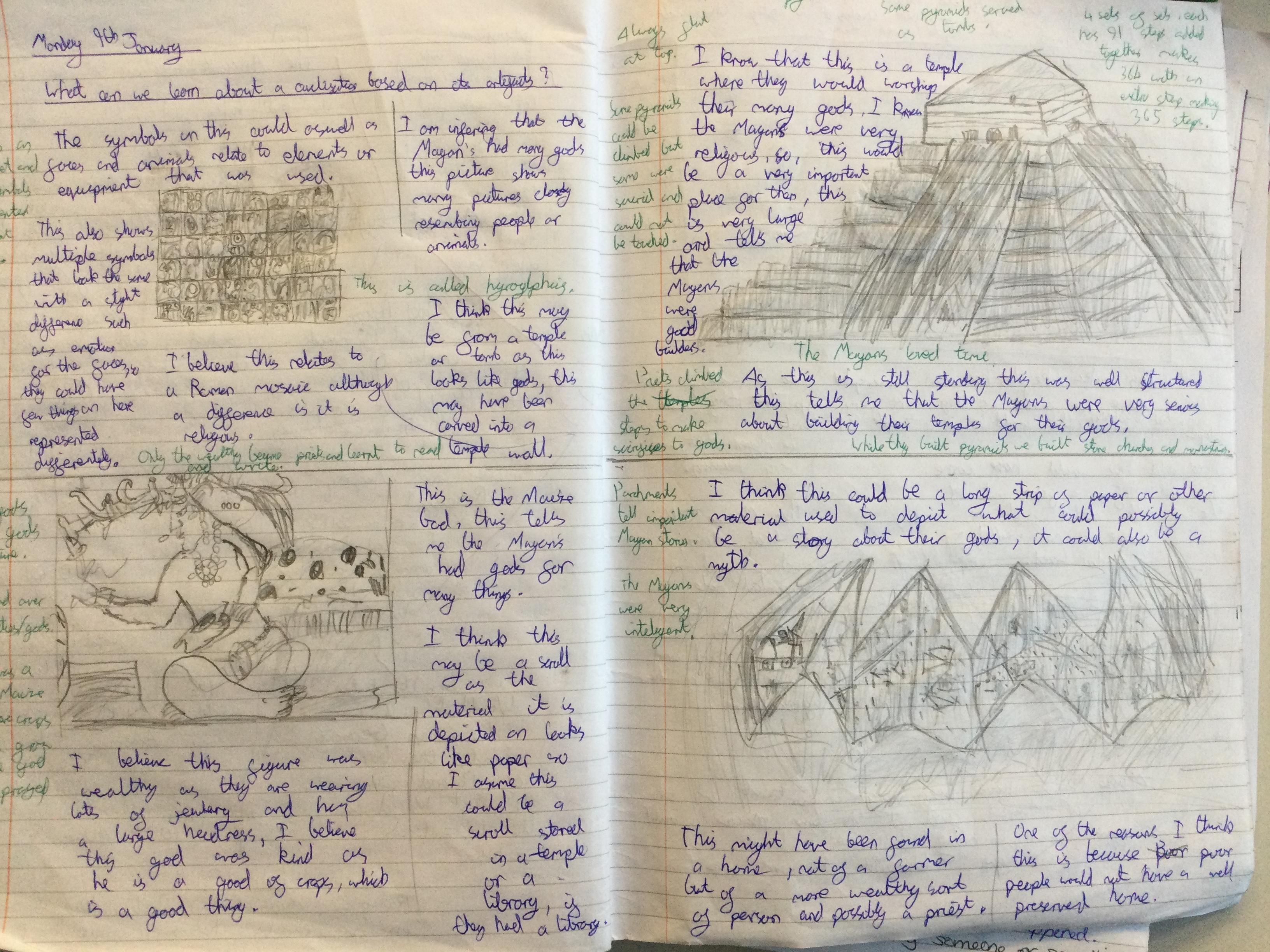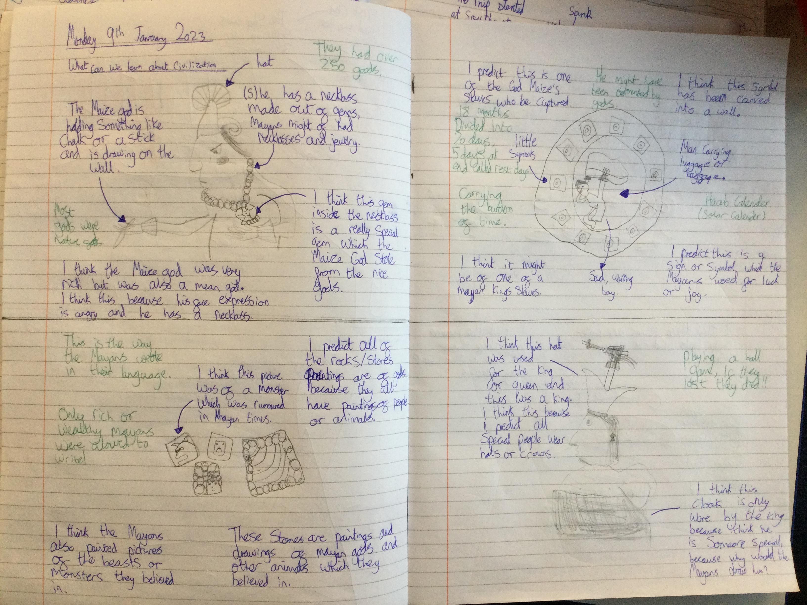 Before learning about why we study the Mayans and what makes them important, we acted as archeologists and tried to make inferences about the civilisation based on artefacts from that time. We discussed primary and secondary sources and created journal pages based on what we thought those artefacts were telling us about the Ancient Maya people.