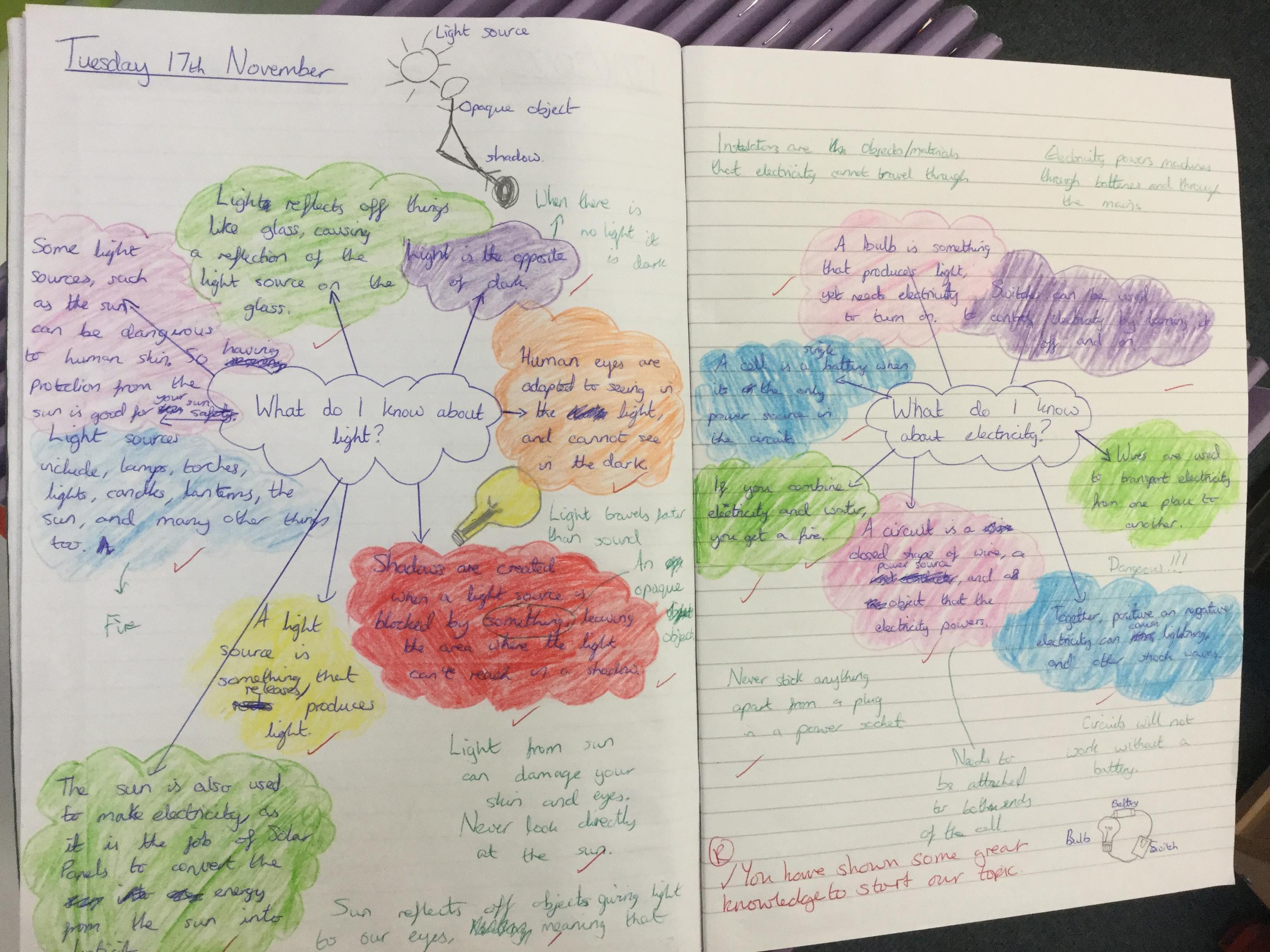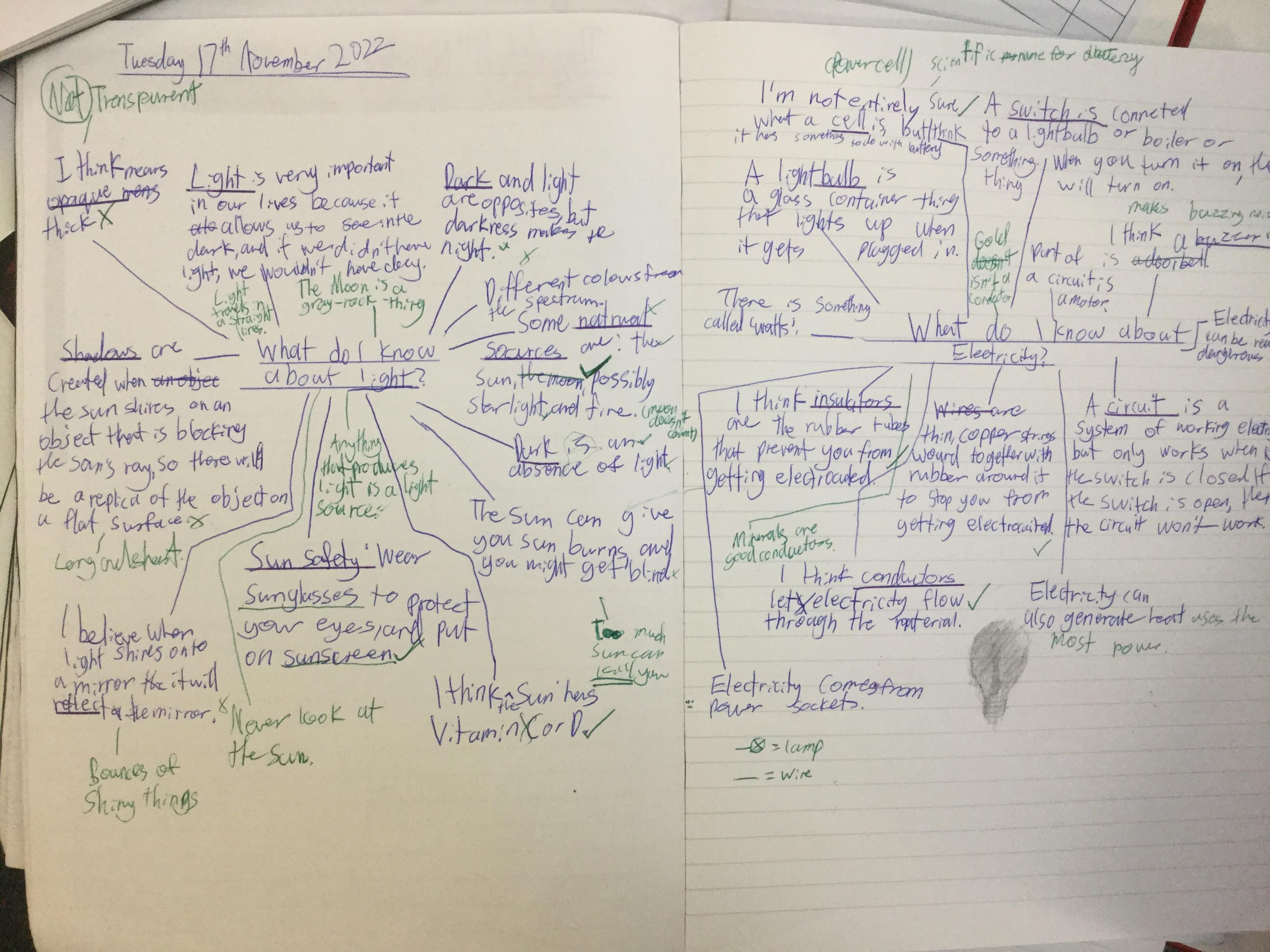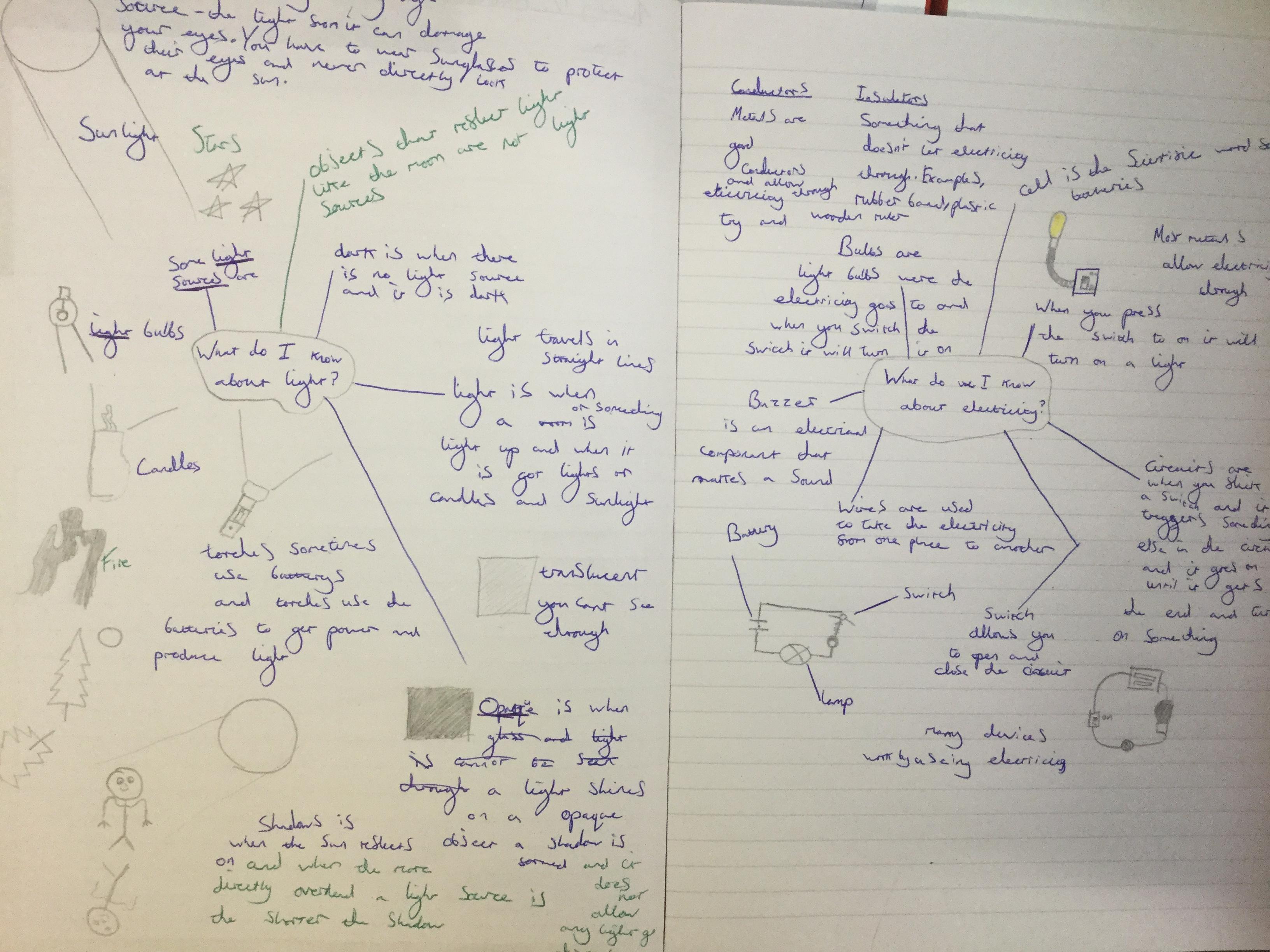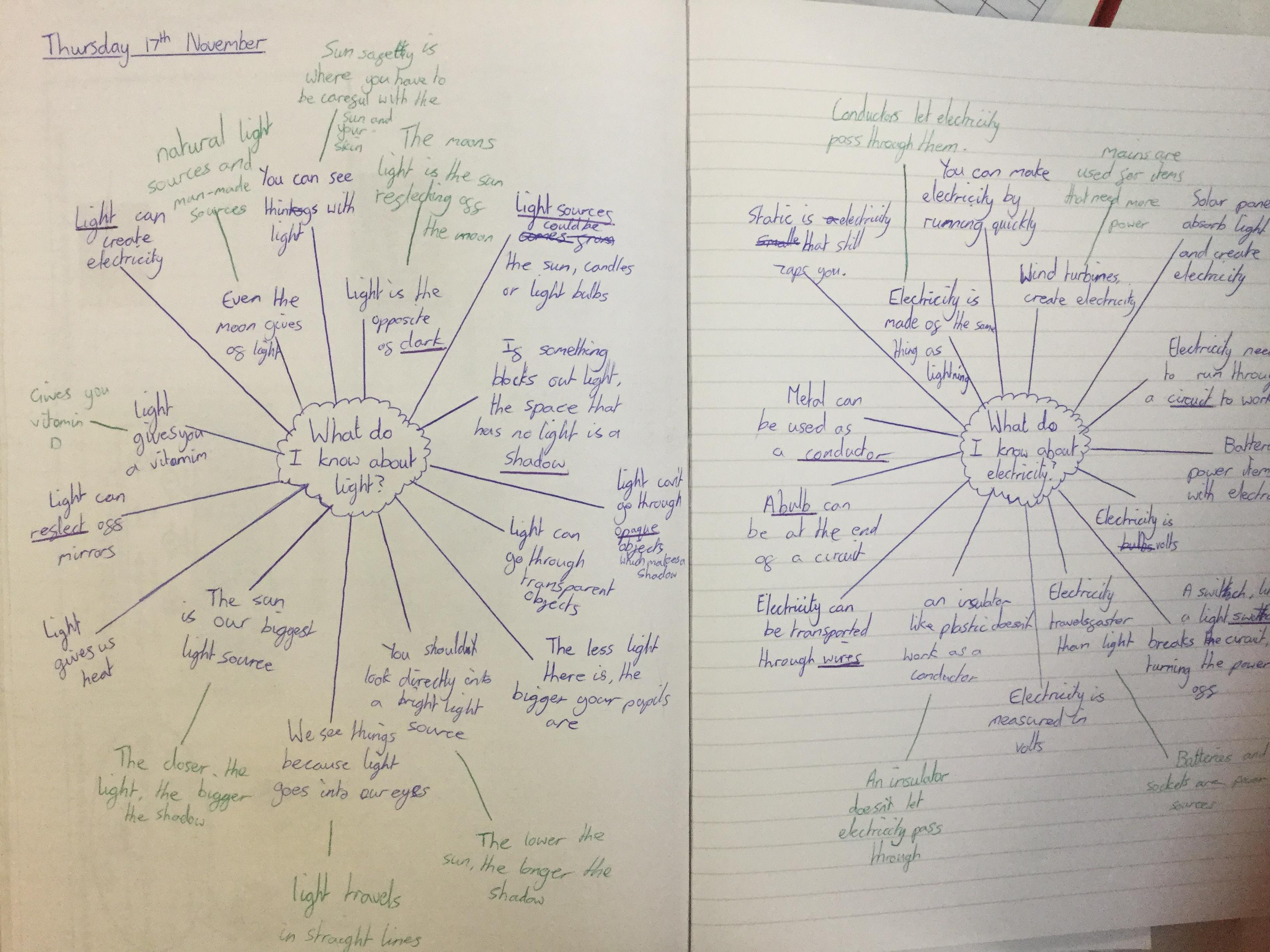 Thinking about our year 3 (light) and year 4 (electricity) we created mind maps of everything we could remember based upon some key vocabulary.